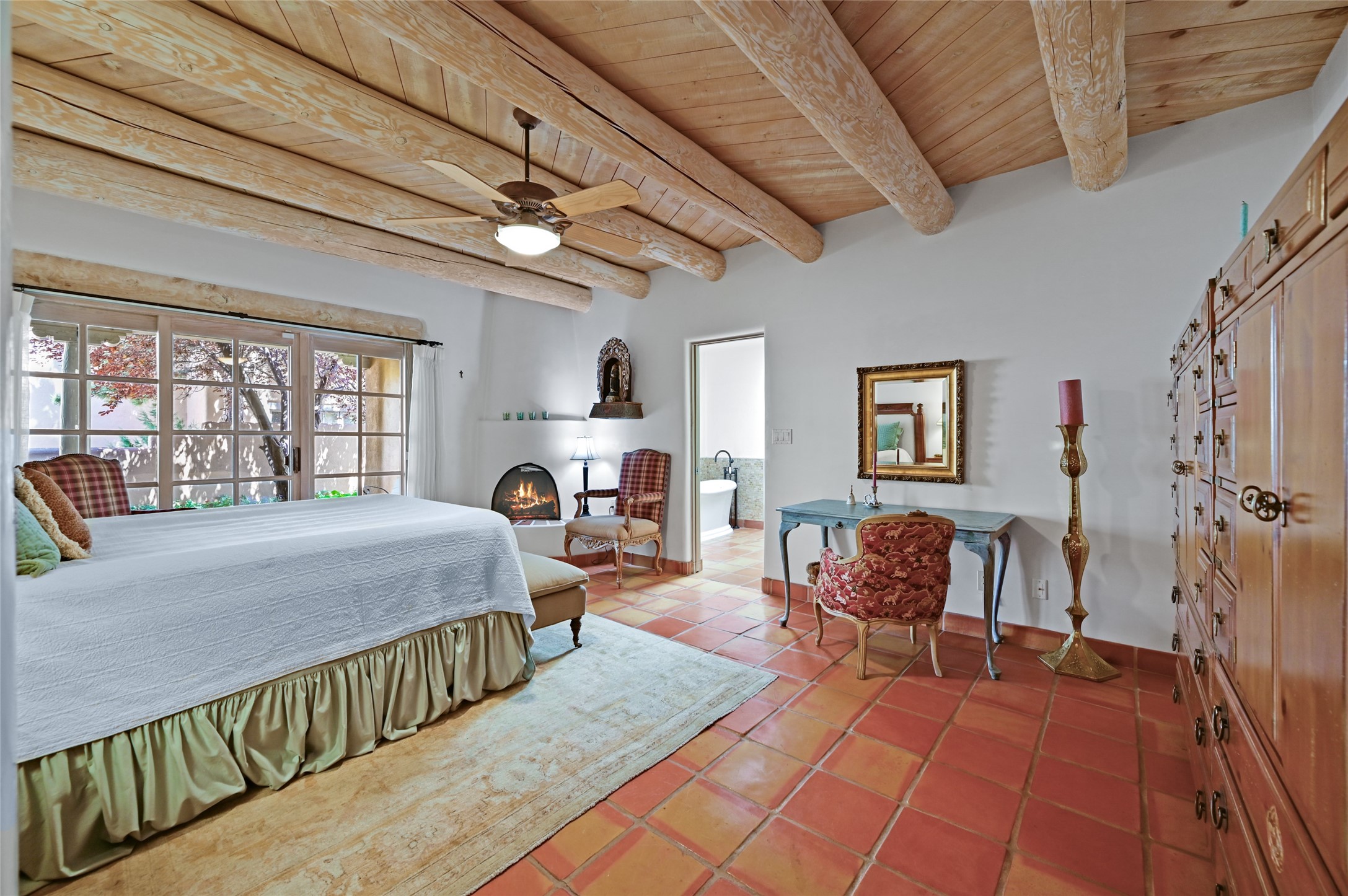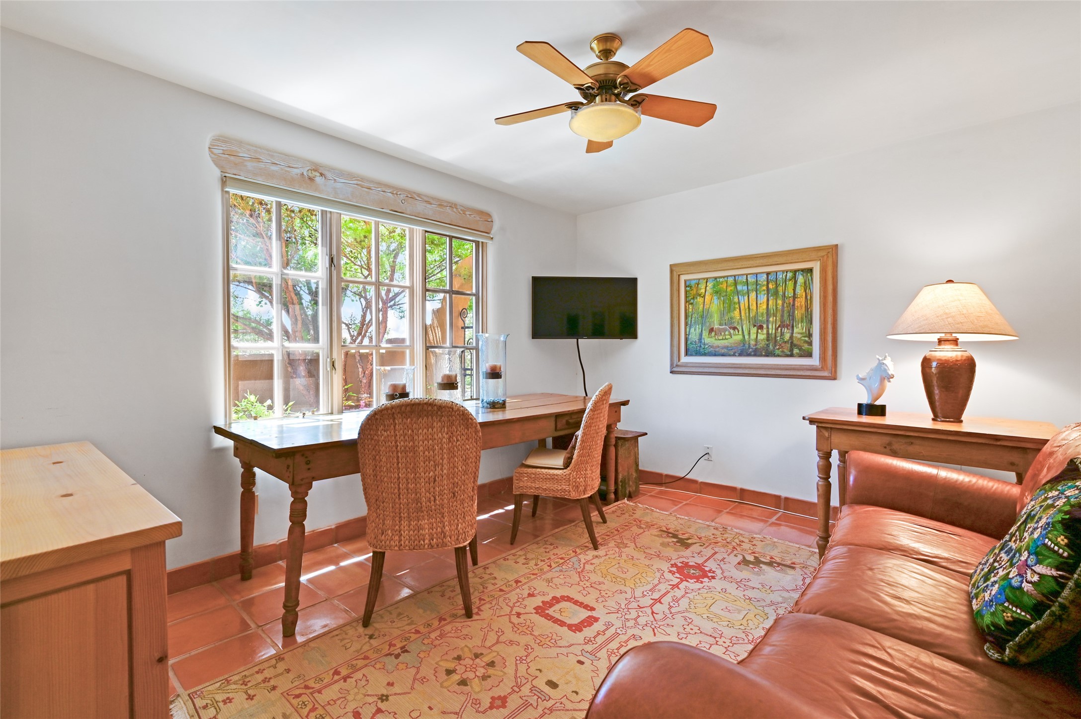Worried about the HOA dues? Seller will pay 1 years' worth of dues for Quail Run's perfect condo -- a classic Pion C floorplan with two bedrooms plus an office/den! Step inside to discover plaster walls, Saltillo tile floors, and a traditional Kiva fireplace that create a warm and inviting atmosphere. Skylights throughout bathe the home in natural light, while the single-level layout with no steps offers comfort and ease of living.The kitchen features updated stone counters, a stylish backsplash, and generous cabinetry for storage and organization. The primary suite is its own retreat with a Kiva fireplace and access to the back courtyard while the adjoining bath includes a newer modern bathtub for relaxing at day's end and a double vanity and larger closest.The living spaces open to a covered back patio, complete with a gentle fountain, brick detailing, vigas, lush landscaping and charming corbels -- a private sanctuary for relaxing or entertaining. A spacious two-car garage adds convenience and storage.Ownership at Quail Run includes access to exceptional amenities: 24-hour hosted security, state-of-the-art fitness facilities, a swimming pool, golf, pickleball, fitness classes, social gatherings, and its own restaurant!Come see why this special home in Quail Run offers the perfect blend of Santa Fe style and resort living.