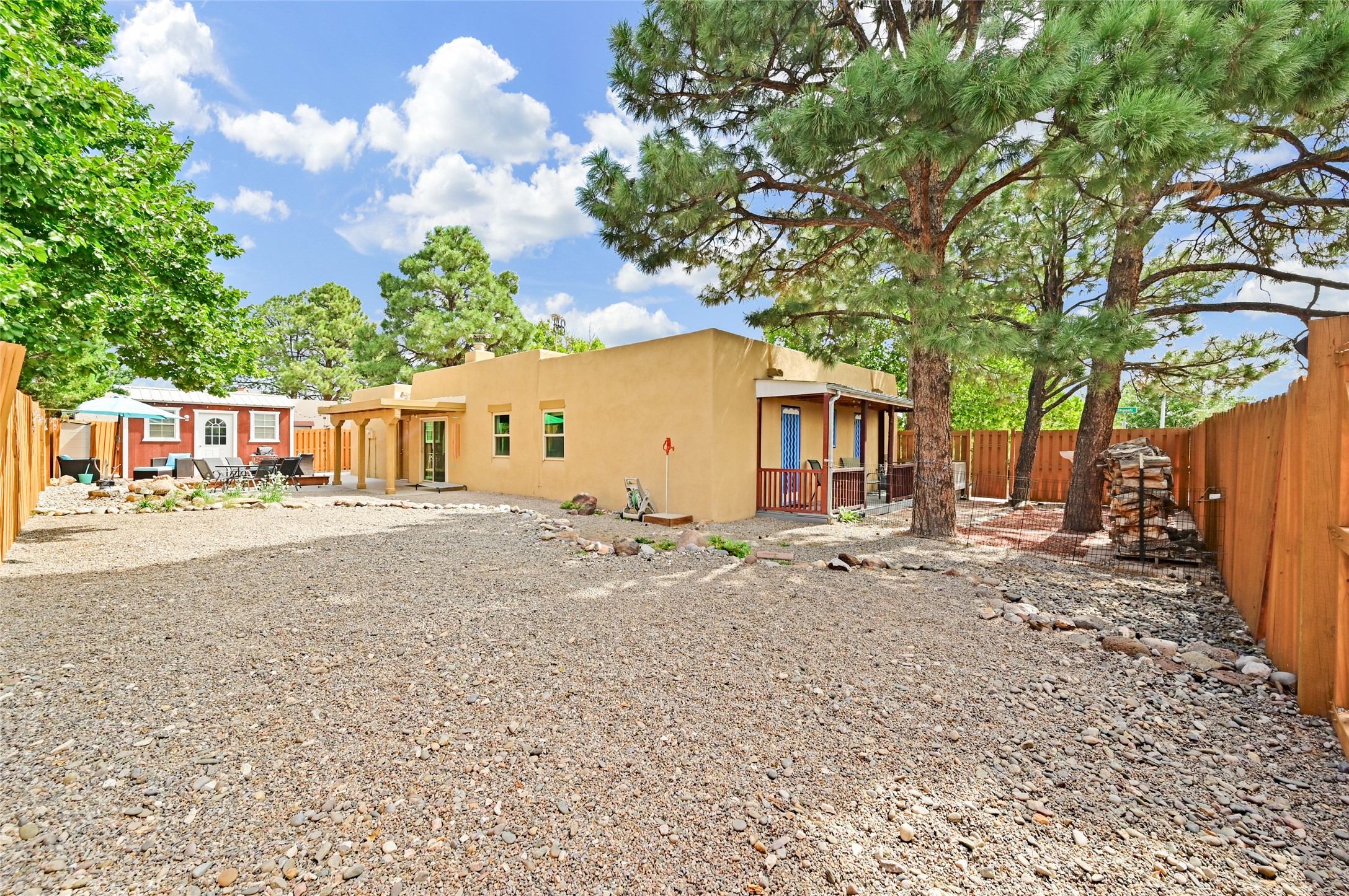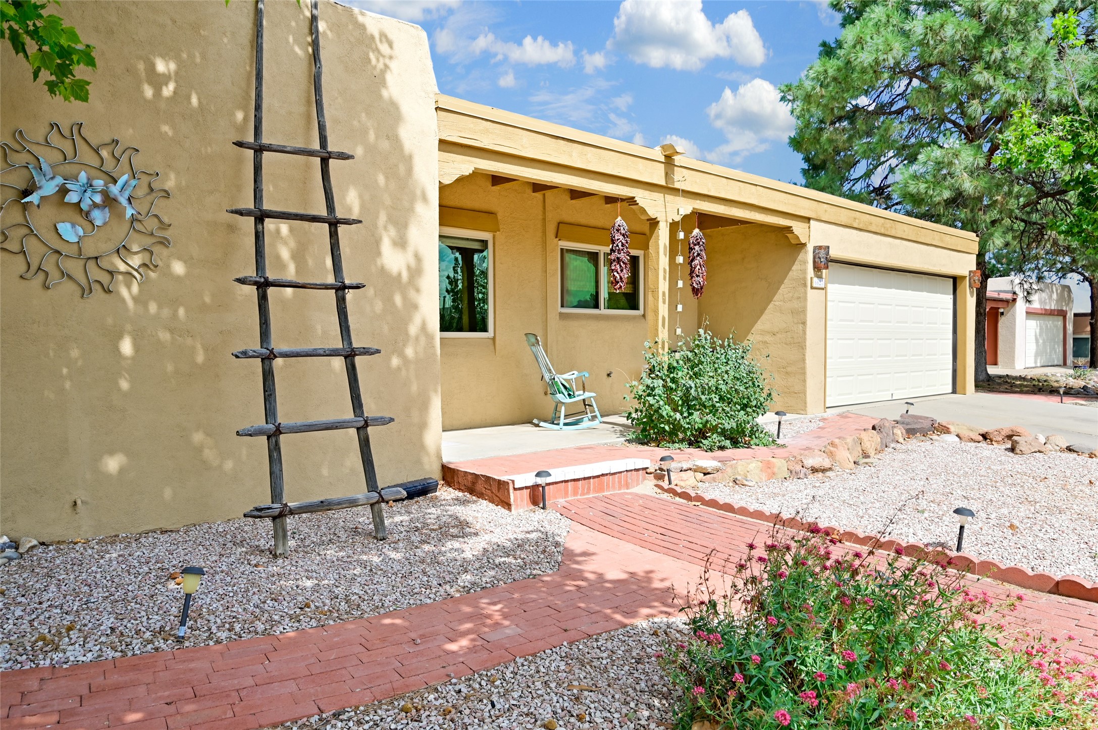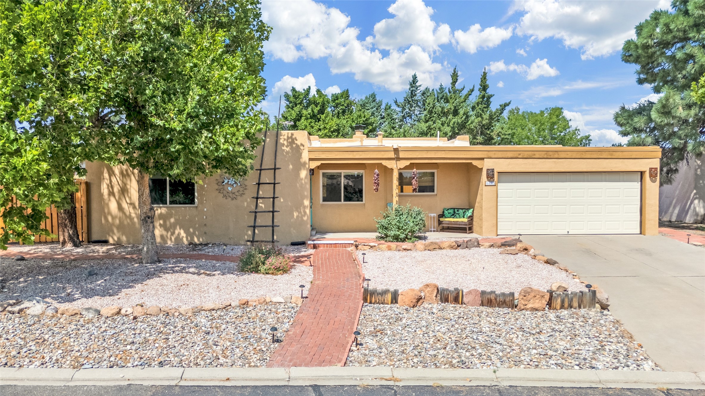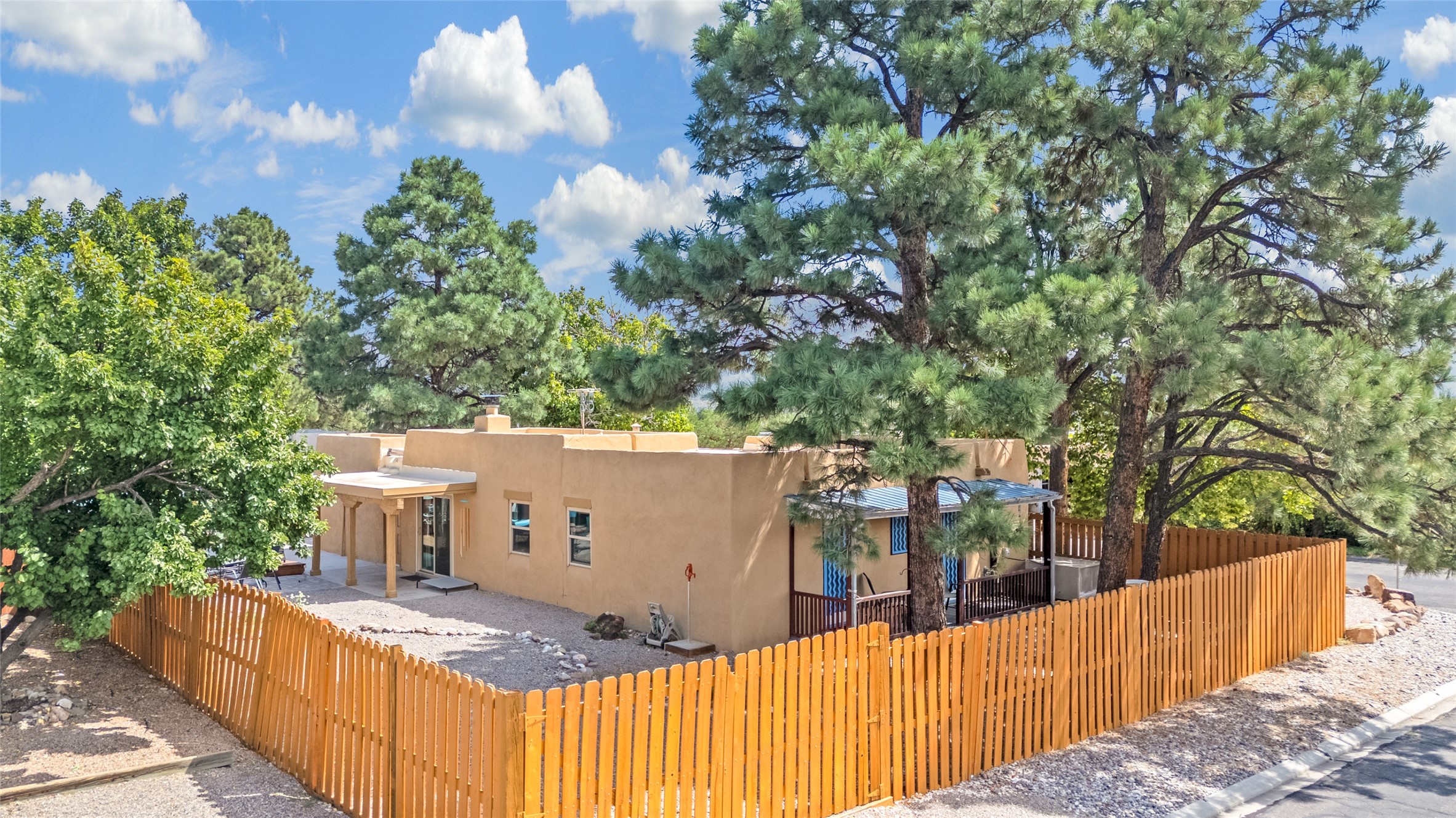 This charming and updated home on a corner lot offers 2 bedrooms, 2 bathrooms, & detached, heated/cooled studio--ideal for a home office, workshop, or additional living space. Plenty of recent upgrades throughout the property including a new roof, stucco, windows, doors, floors, baseboards, paint, A/C, insulated garage & garage door, new chimney sleeve, electrical updates including a new panel, and many more!Inside, the cozy living room features a kiva fireplace and beautiful ceiling beams. The kitchen is well-equipped with ample cabinetry and a bright breakfast nook. Step outside to your private backyard retreat, complete with a new wooden deck, a relaxing sitting area, and brick patio, ideal for entertaining or enjoying outdoor meals.Both bedrooms offer access to a covered 3rd portal, shaded by beautiful Ponderosa Pines, adding an extra touch of serenity and outdoor living space. Additional highlights include convenient outdoor storage and off-street RV parking. Located in the desirable Cochiti Lake area, this home offers the perfect blend of comfort, modern updates, and a peaceful retreat--only 30 minutes to Santa Fe and 40 minutes to Abq.Land Lease is $330/quarterly, Town Tax $332/annually, Lease Improvement Fund $140/year