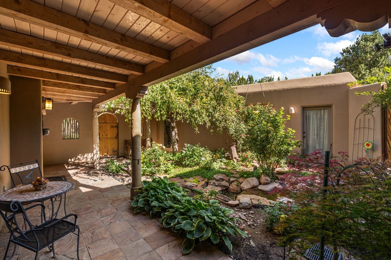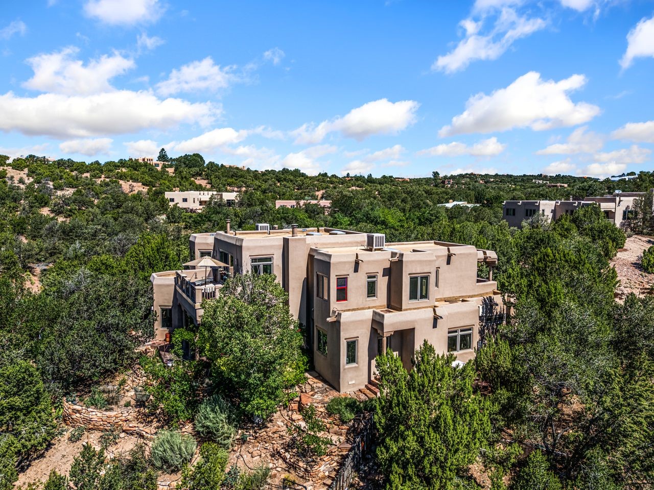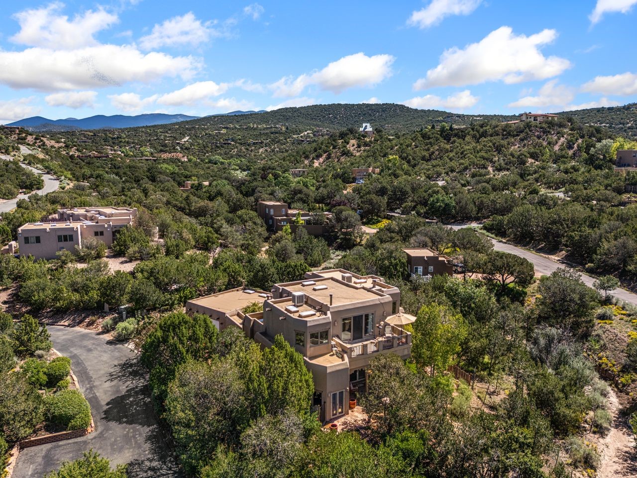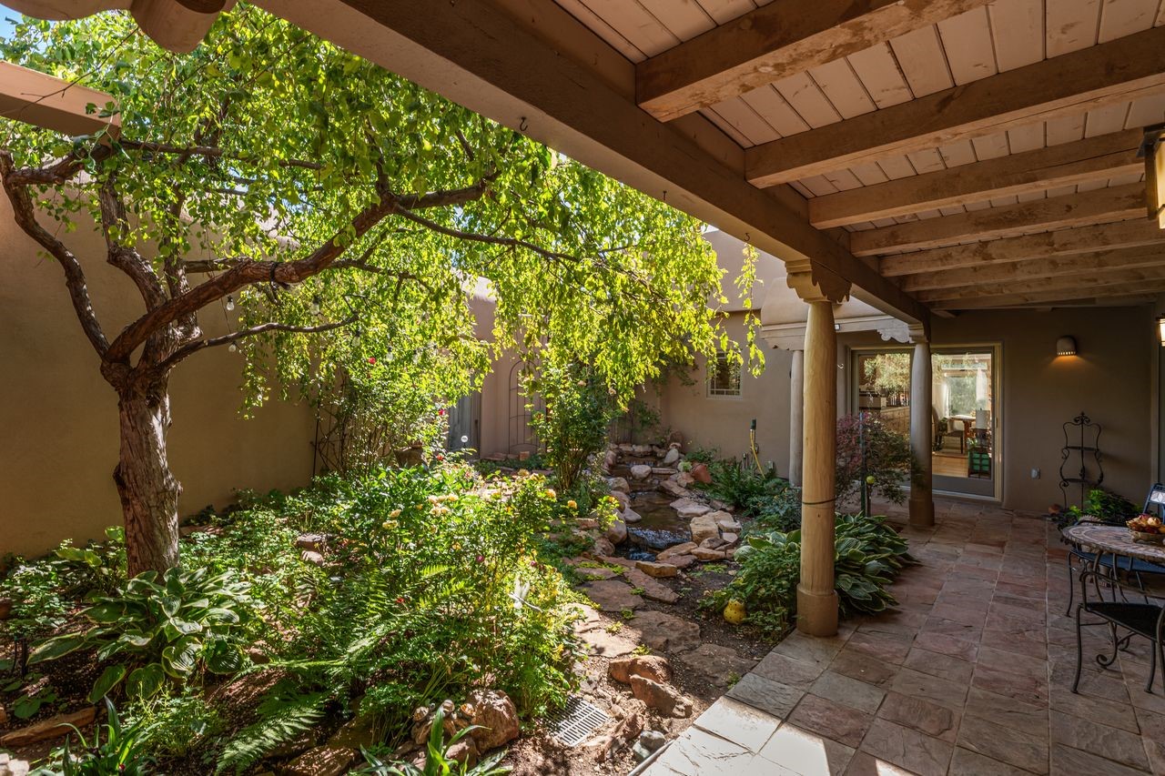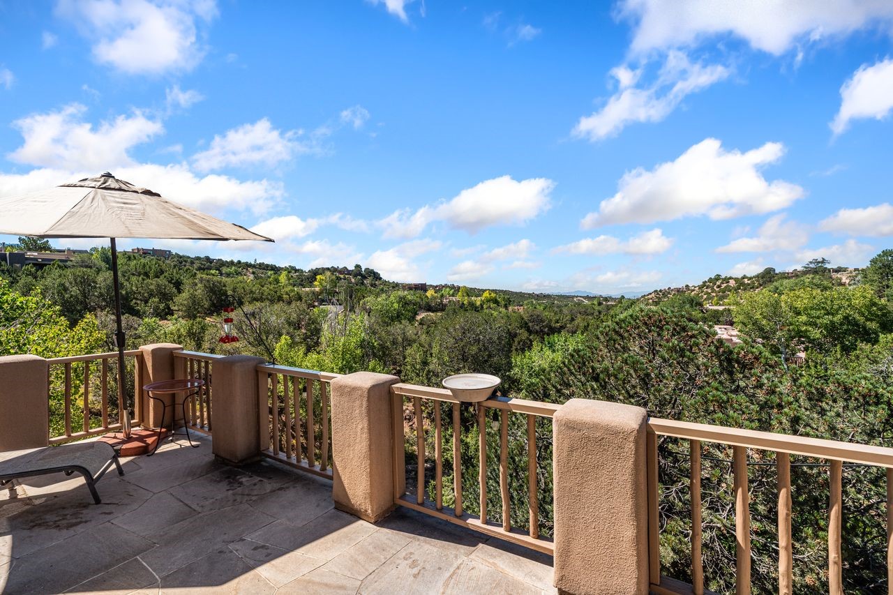 Beautiful home overlooking the arroyo and with stellar views over downtown Santa Fe to the south! The home has a lovely private courtyard with water feature greeting you as you step in. All the living areas on the first floor: Living room, dining room, kitchen, full bathroom, laundry room, and the back of the home has a full suite that is currently being used as a working artist studio. This space is easily converted and designed to be a one-bedroom suite on the first floor. Upstairs is the primary suite with two walk-in closets and primary bath. There are two more bedrooms with a full bath. The two-car garage is off the courtyard. There are two 2nd story balconies, and lovely portal off the living room, and wonderful landscaping around the home. The owner installed high-efficiency Runtal baseboard heaters throughout the house, and it also has a full unfinished basement! Four off-street parking spots available for your guests. Please make sure you make plans to see this lovely home in the heart of the Sierra Del Norte neighborhood!