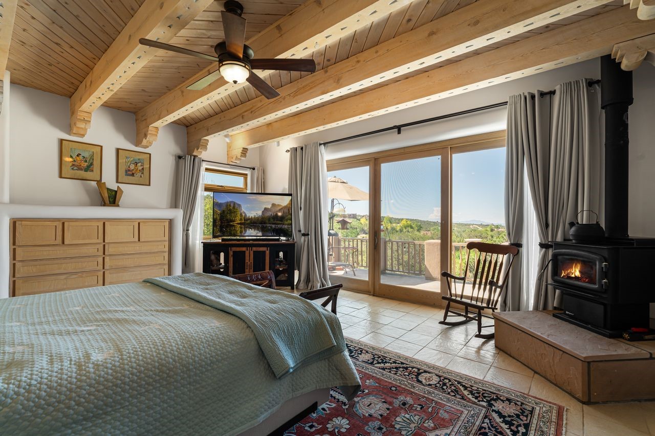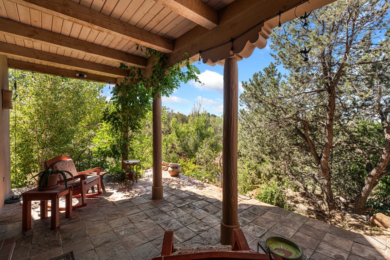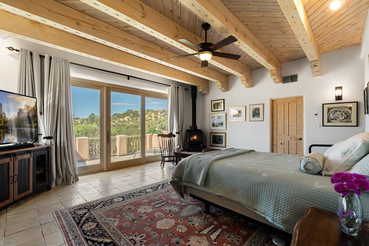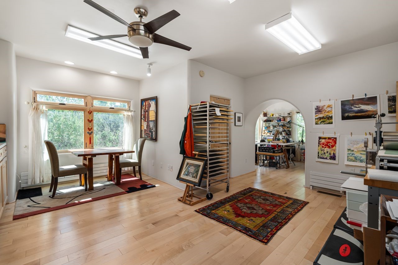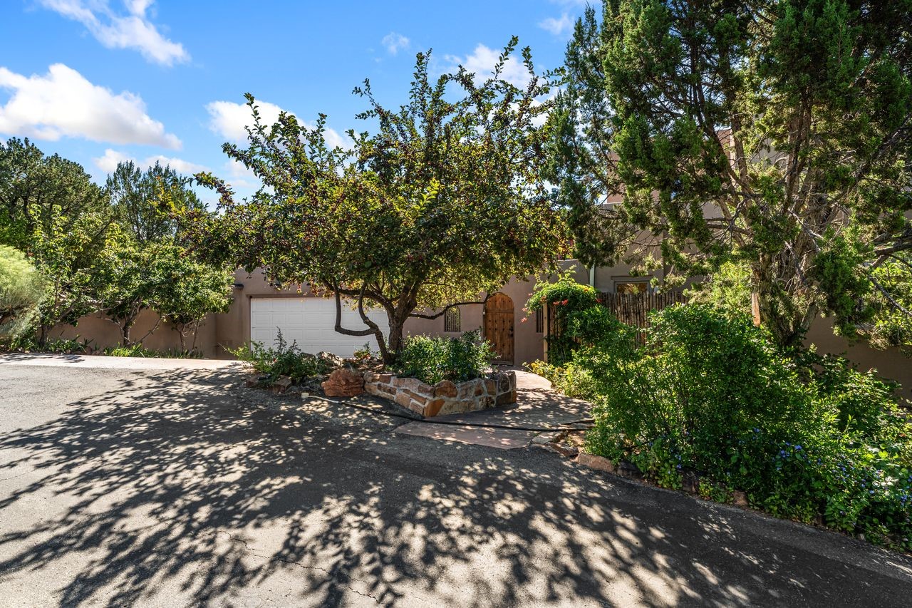Beautiful home overlooking the arroyo and with stellar views over downtown Santa Fe to the south! The home has a lovely private courtyard with water feature greeting you as you step in. All the living areas on the first floor: Living room, dining room, kitchen, full bathroom, laundry room, and the back of the home has a full suite that is currently being used as a working artist studio. This space is easily converted and designed to be a one-bedroom suite on the first floor. Upstairs is the primary suite with two walk-in closets and primary bath. There are two more bedrooms with a full bath. The two-car garage is off the courtyard. There are two 2nd story balconies, and lovely portal off the living room, and wonderful landscaping around the home. The owner installed high-efficiency Runtal baseboard heaters throughout the house, and it also has a full unfinished basement! Four off-street parking spots available for your guests. Please make sure you make plans to see this lovely home in the heart of the Sierra Del Norte neighborhood!