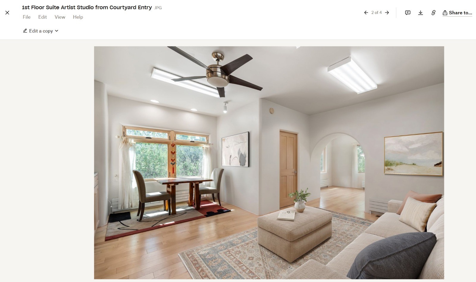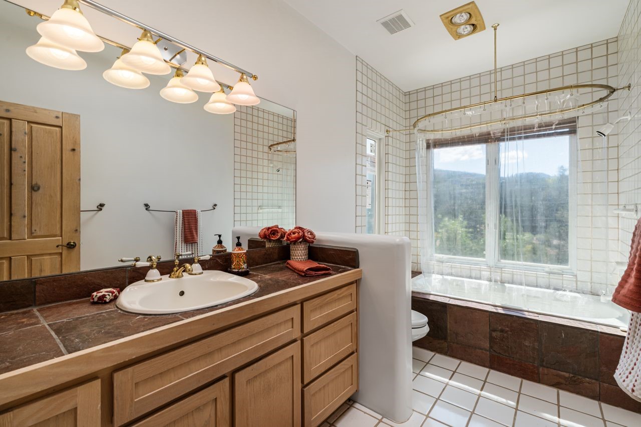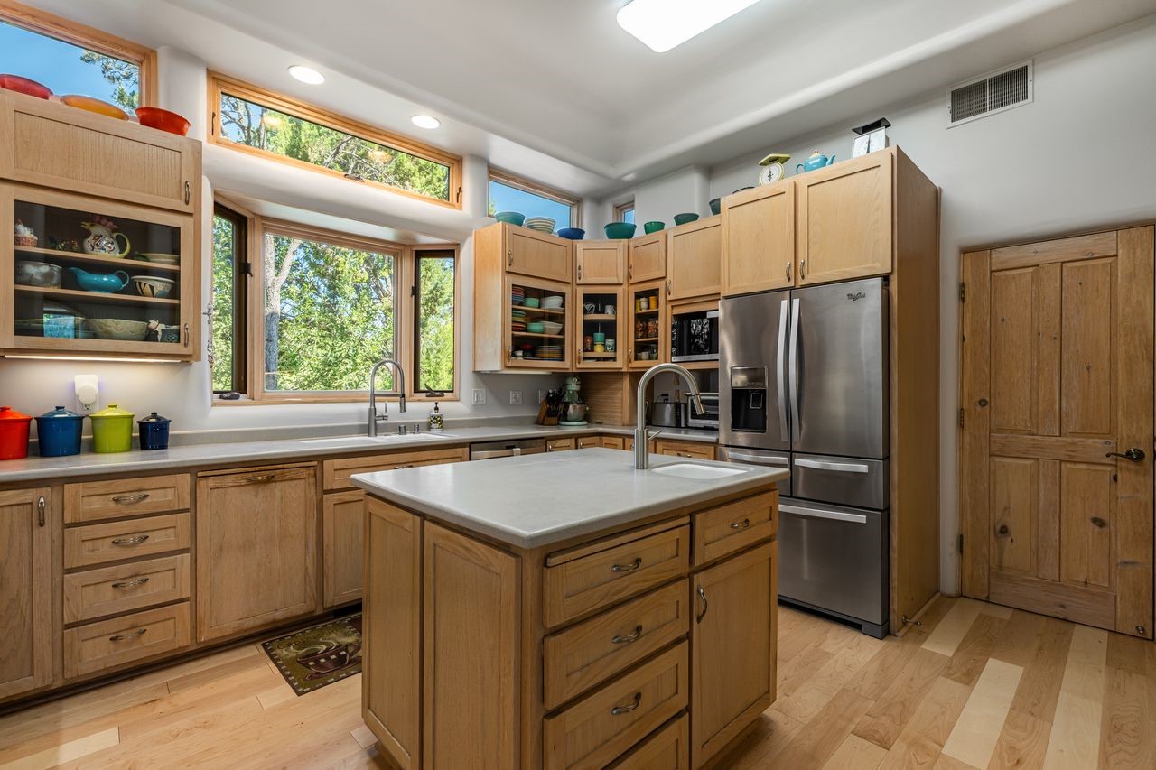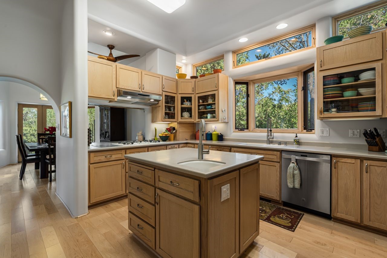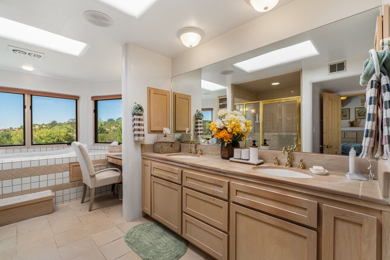 Beautiful home overlooking the arroyo and with stellar views over downtown Santa Fe to the south! The home has a lovely private courtyard with water feature greeting you as you step in. All the living areas on the first floor: Living room, dining room, kitchen, full bathroom, laundry room, and the back of the home has a full suite that is currently being used as a working artist studio. This space is easily converted and designed to be a one-bedroom suite on the first floor. Upstairs is the primary suite with two walk-in closets and primary bath. There are two more bedrooms with a full bath. The two-car garage is off the courtyard. There are two 2nd story balconies, and lovely portal off the living room, and wonderful landscaping around the home. The owner installed high-efficiency Runtal baseboard heaters throughout the house, and it also has a full unfinished basement! Four off-street parking spots available for your guests. Please make sure you make plans to see this lovely home in the heart of the Sierra Del Norte neighborhood!