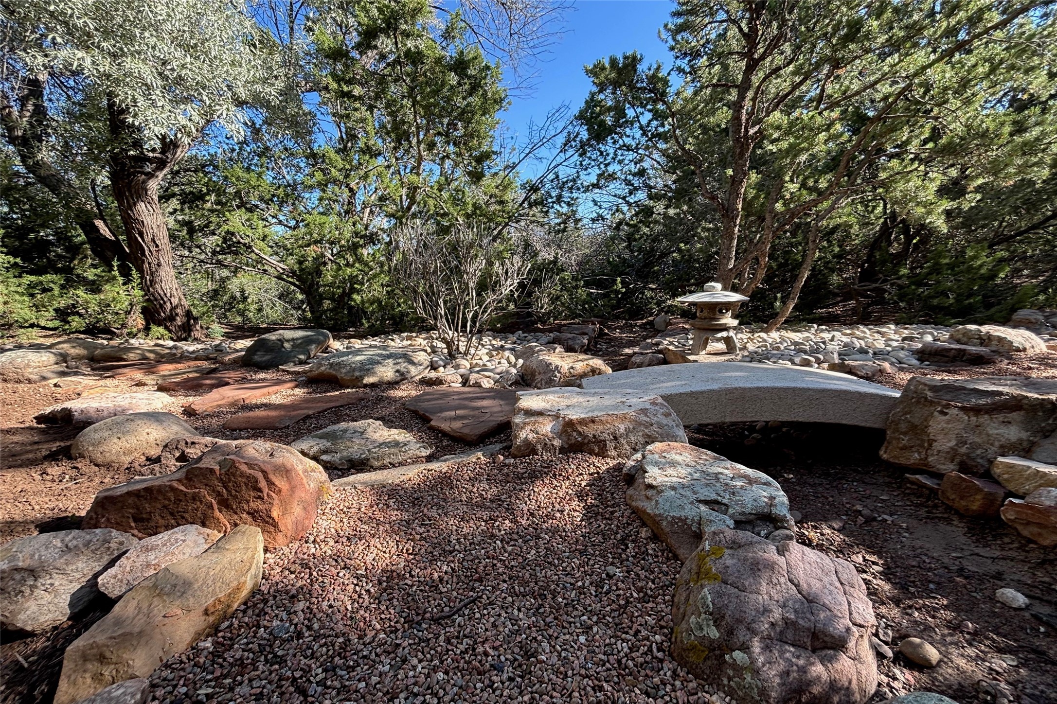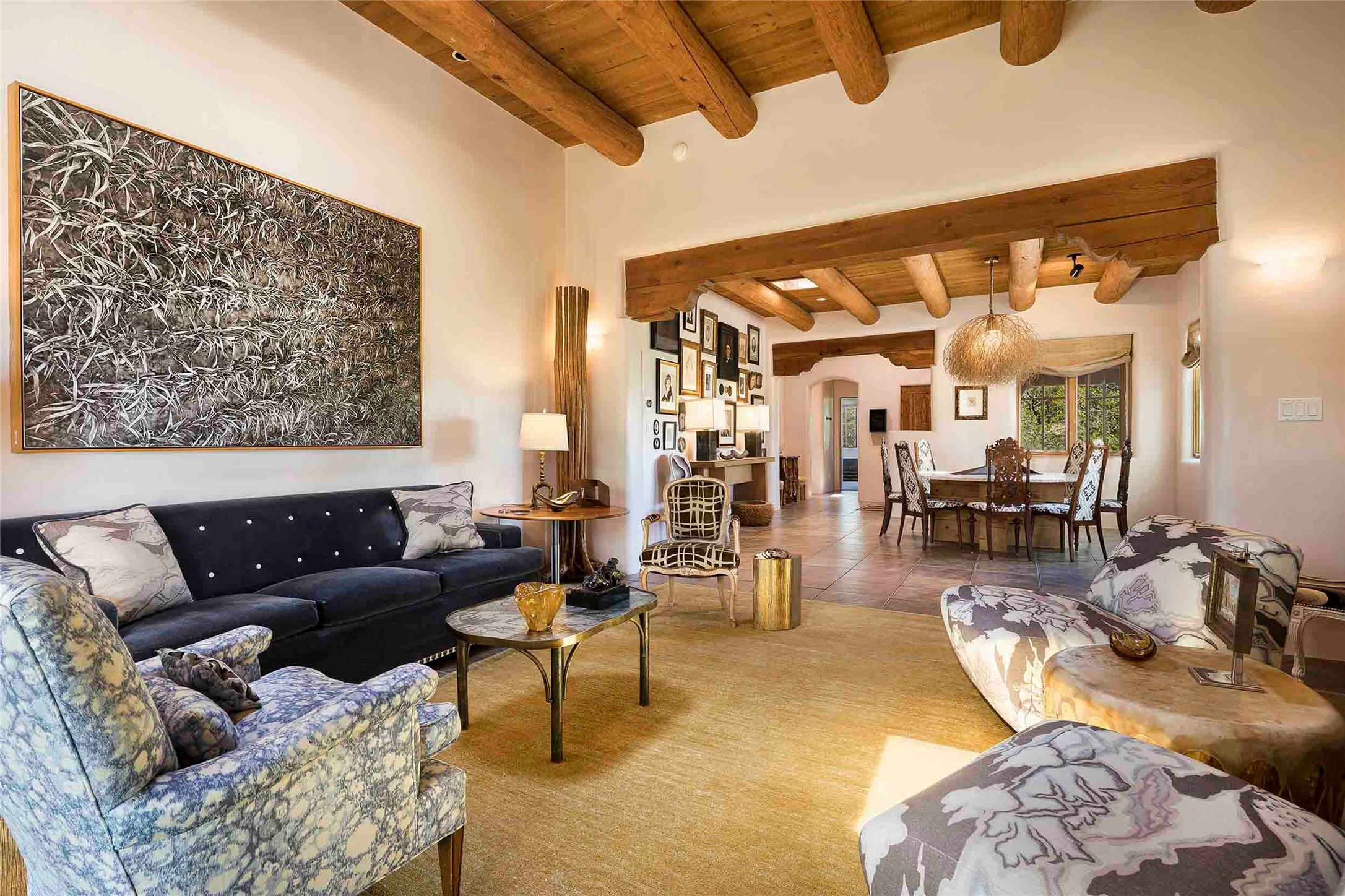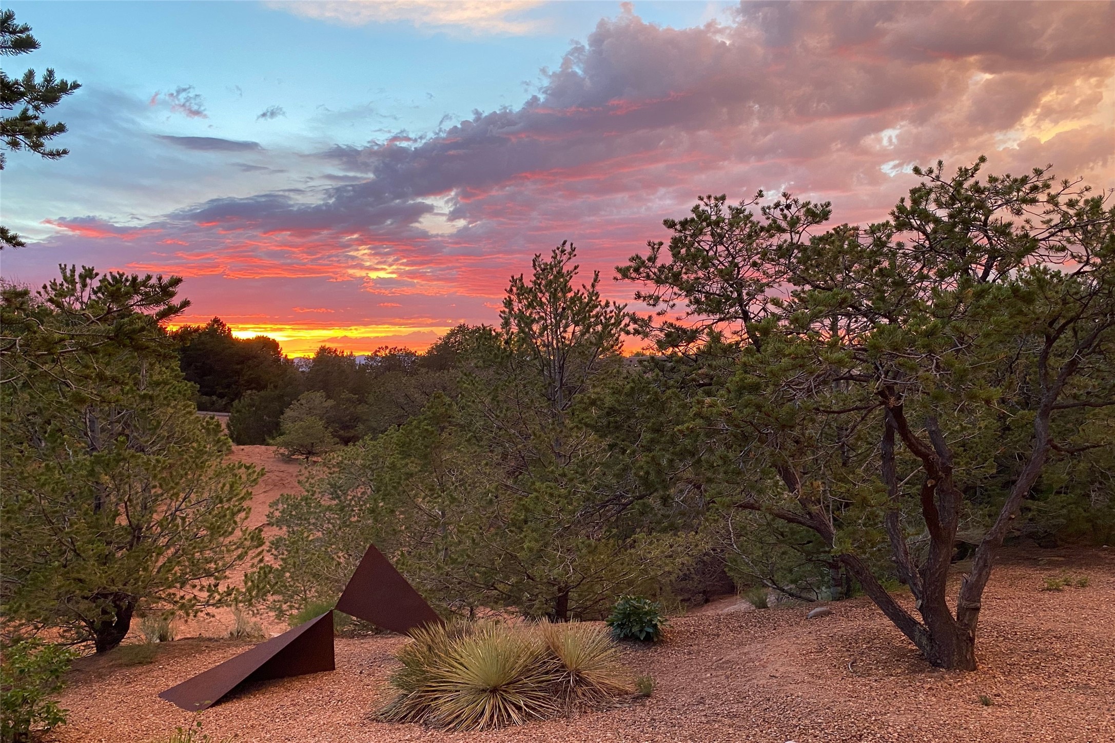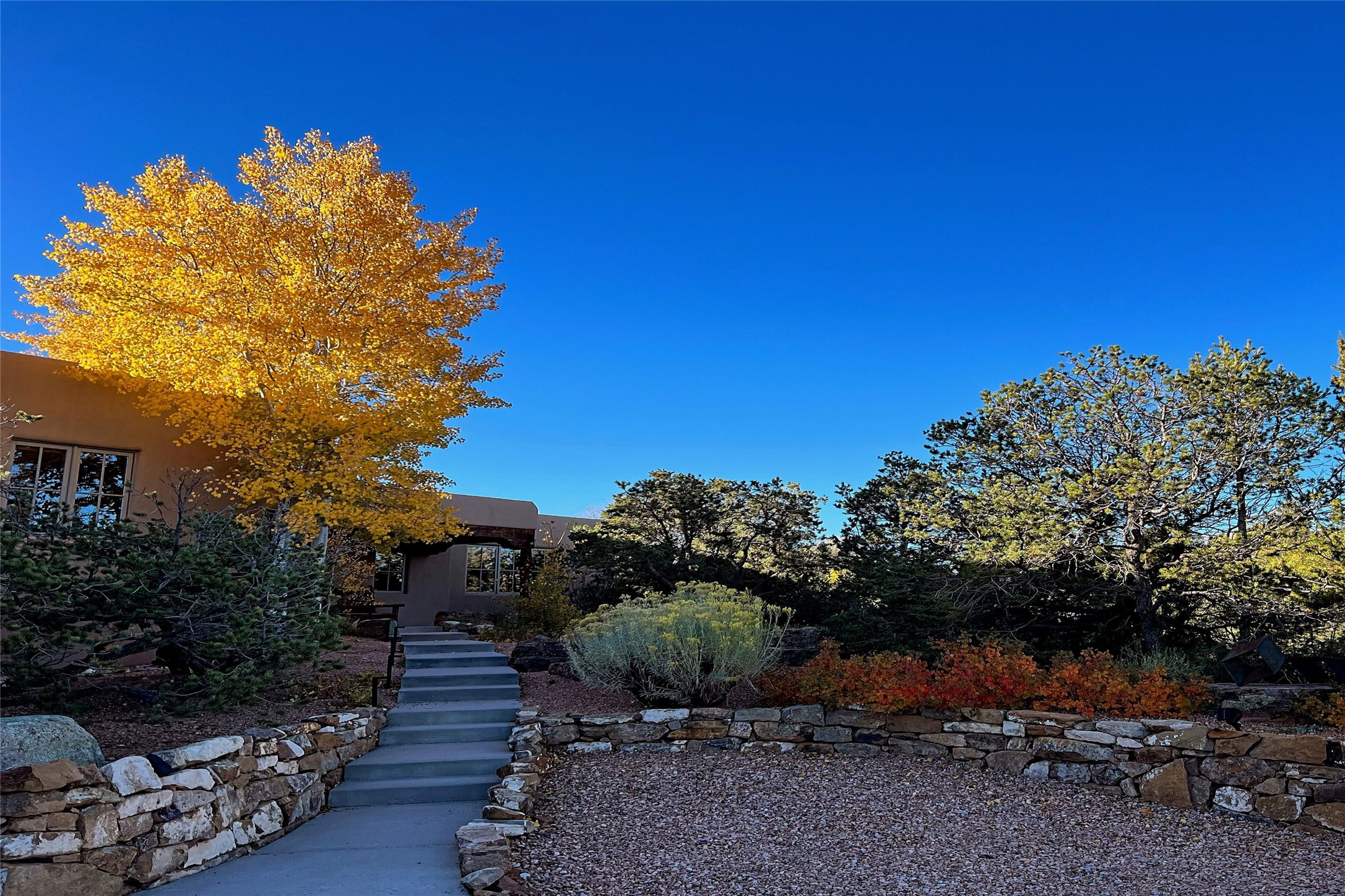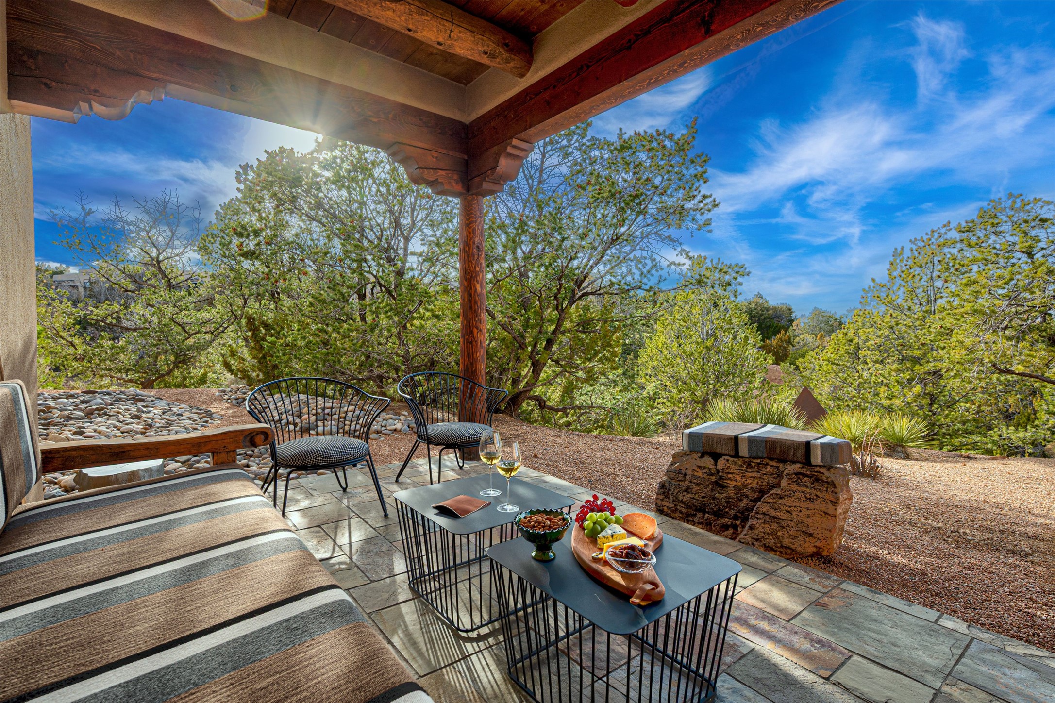 Rare Eastside Private and Gated La Cantera - Timeless Southwestern Elegance - Minutes from Canyon Road and the historic Plaza, this distinguished La Cantera home offers 3BR, 3BA and apx 2,715 sqft of refined living on nearly an acre - one of the enclave's largest and most coveted, private parcels. A graceful drive unveils an luxurious residence with high viga ceilings, hand-troweled plaster walls, and the golden glow of kiva fireplaces. Expansive living and dining rooms flow with effortless sophistication, grounded by wide tile floors. Soft carpeted bedrooms balance comfort and ease, with radiant heat throughout. The gourmet kitchen pairs polished granite, rich alder cabinetry, and sleek stainless appliances, while a luminous banco breakfast nook bathes in morning sun. Two master suites provide generous proportions and a serene ambiance, joined by a versatile third bedroom or office. The residence is completely single-level once entered. Outdoors, inviting portals designed for dining and entertaining create natural circulation into the gardens. A variety of fruit trees including peach, plum, cherry, apple and apricot, and a meandering wooded meditation walking path with fountain complete this secluded haven. Secured within La Cantera's gates with a 2-car attached garage, this rare property offers privacy, beauty, and architectural distinction - a world away but an easy stroll to Canyon Road's world renowned galleries and fine dining including Geronimo, The Tea House, and El Farol.
