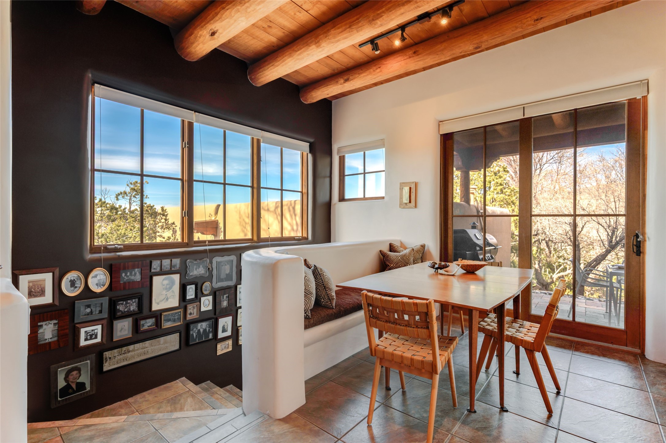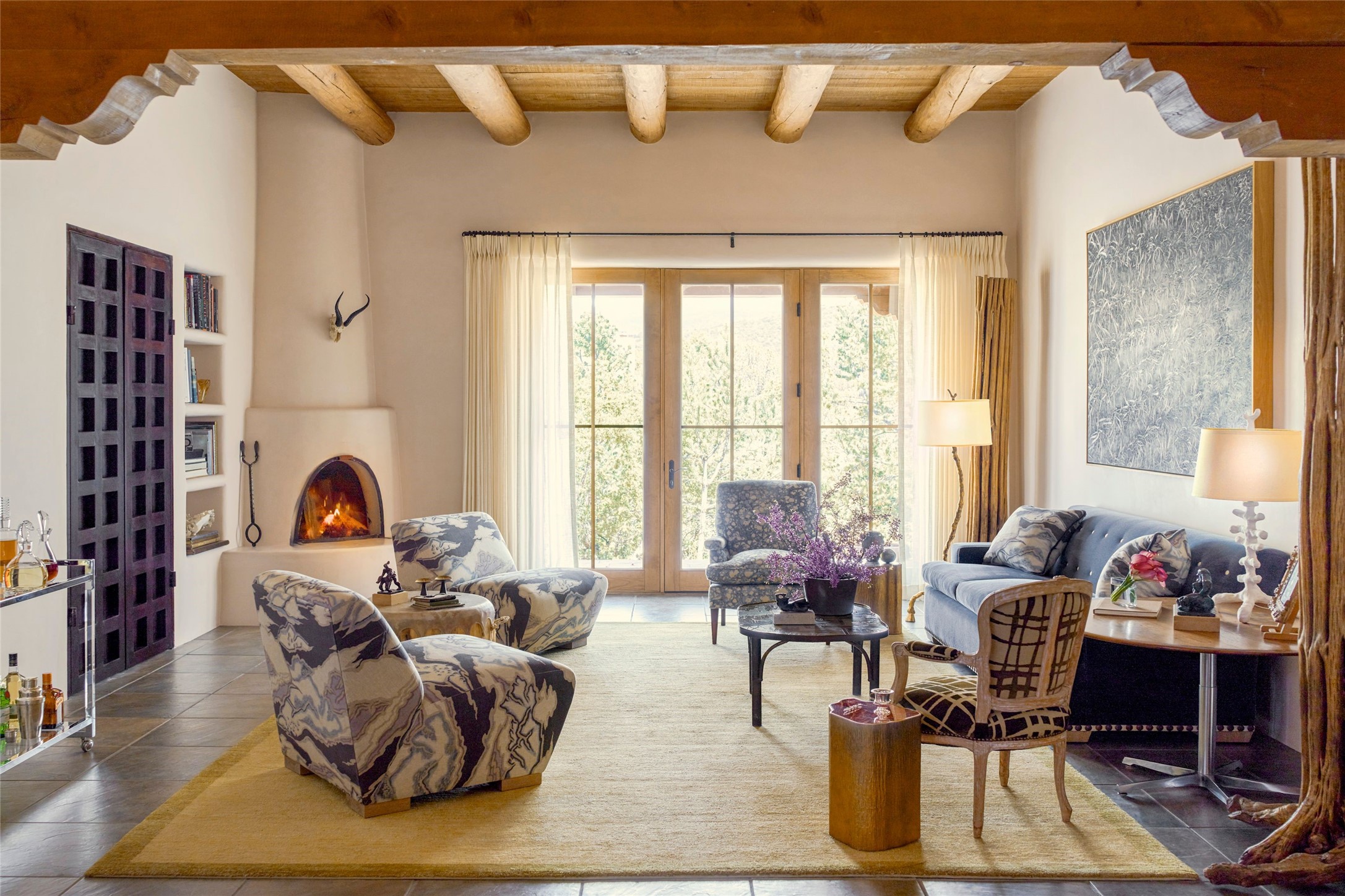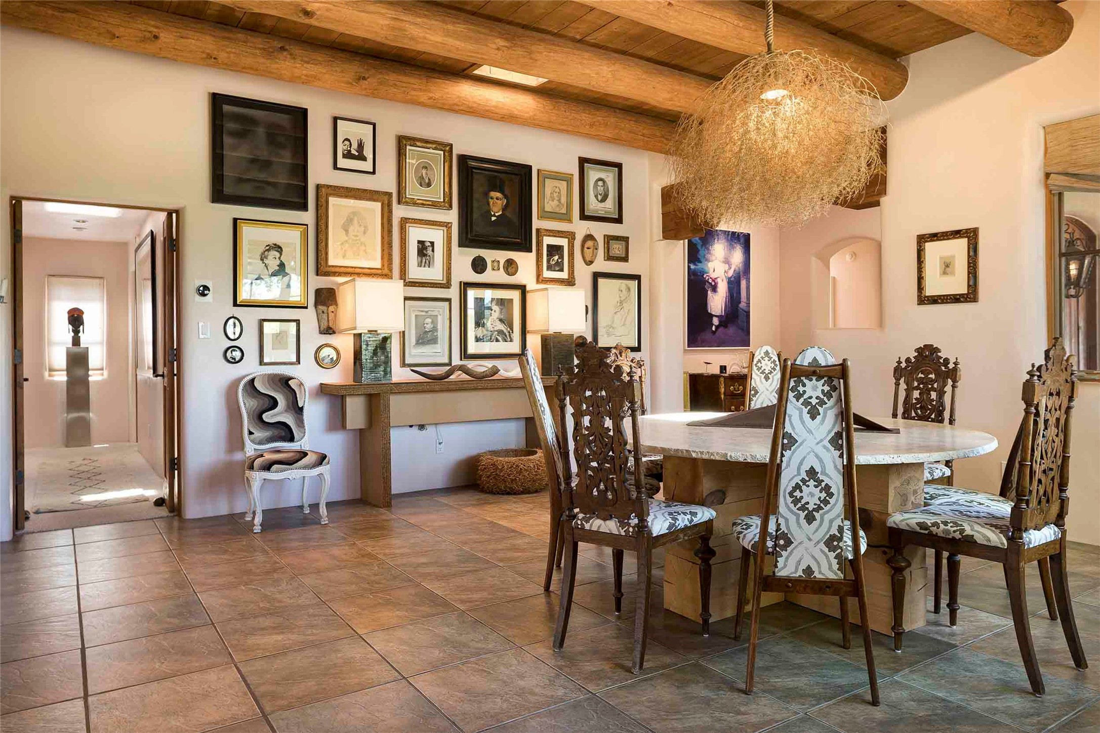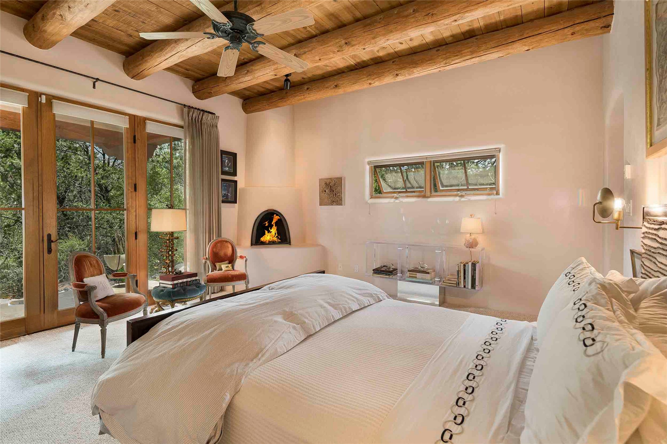 Rare Eastside Private and Gated La Cantera - Timeless Southwestern Elegance - Minutes from Canyon Road and the historic Plaza, this distinguished La Cantera home offers 3BR, 3BA and apx 2,715 sqft of refined living on nearly an acre - one of the enclave's largest and most coveted, private parcels. A graceful drive unveils an luxurious residence with high viga ceilings, hand-troweled plaster walls, and the golden glow of kiva fireplaces. Expansive living and dining rooms flow with effortless sophistication, grounded by wide tile floors. Soft carpeted bedrooms balance comfort and ease, with radiant heat throughout. The gourmet kitchen pairs polished granite, rich alder cabinetry, and sleek stainless appliances, while a luminous banco breakfast nook bathes in morning sun. Two master suites provide generous proportions and a serene ambiance, joined by a versatile third bedroom or office. The residence is completely single-level once entered. Outdoors, inviting portals designed for dining and entertaining create natural circulation into the gardens. A variety of fruit trees including peach, plum, cherry, apple and apricot, and a meandering wooded meditation walking path with fountain complete this secluded haven. Secured within La Cantera's gates with a 2-car attached garage, this rare property offers privacy, beauty, and architectural distinction - a world away but an easy stroll to Canyon Road's world renowned galleries and fine dining including Geronimo, The Tea House, and El Farol.