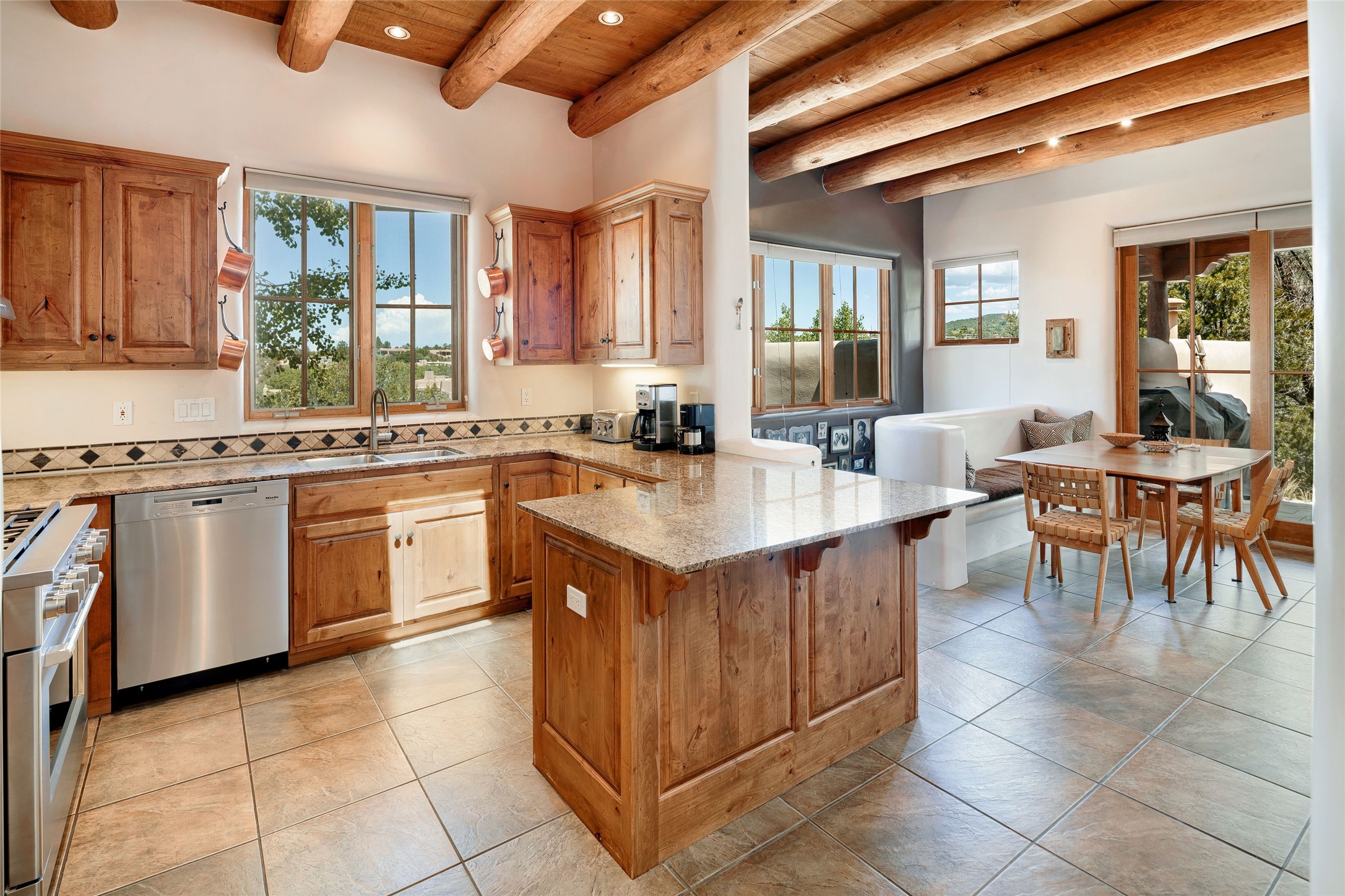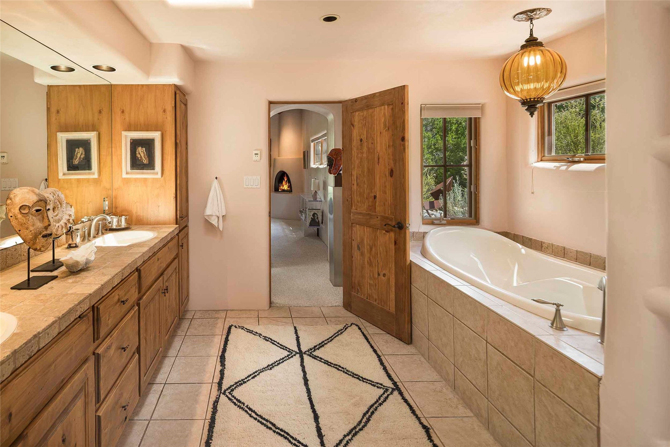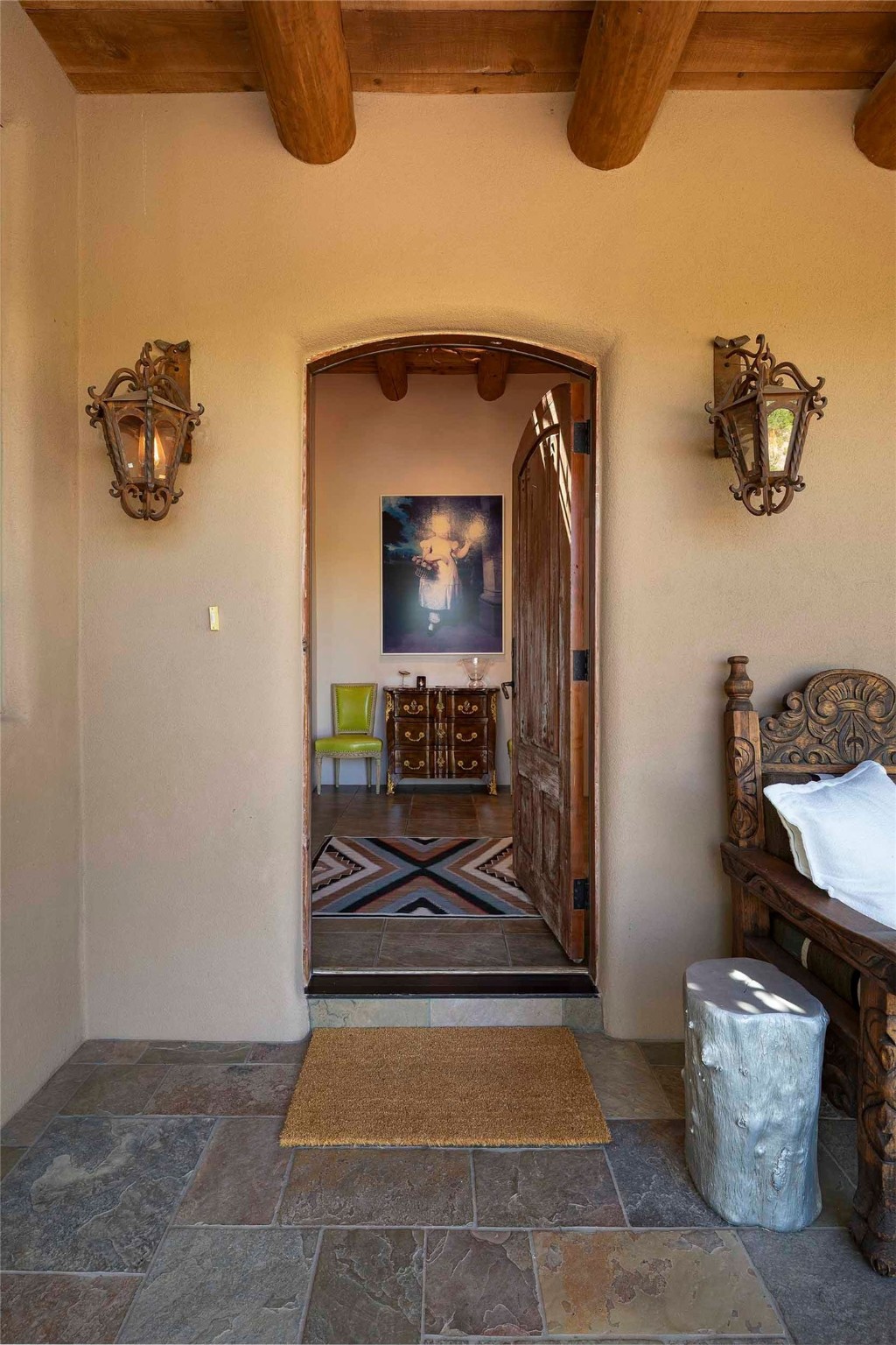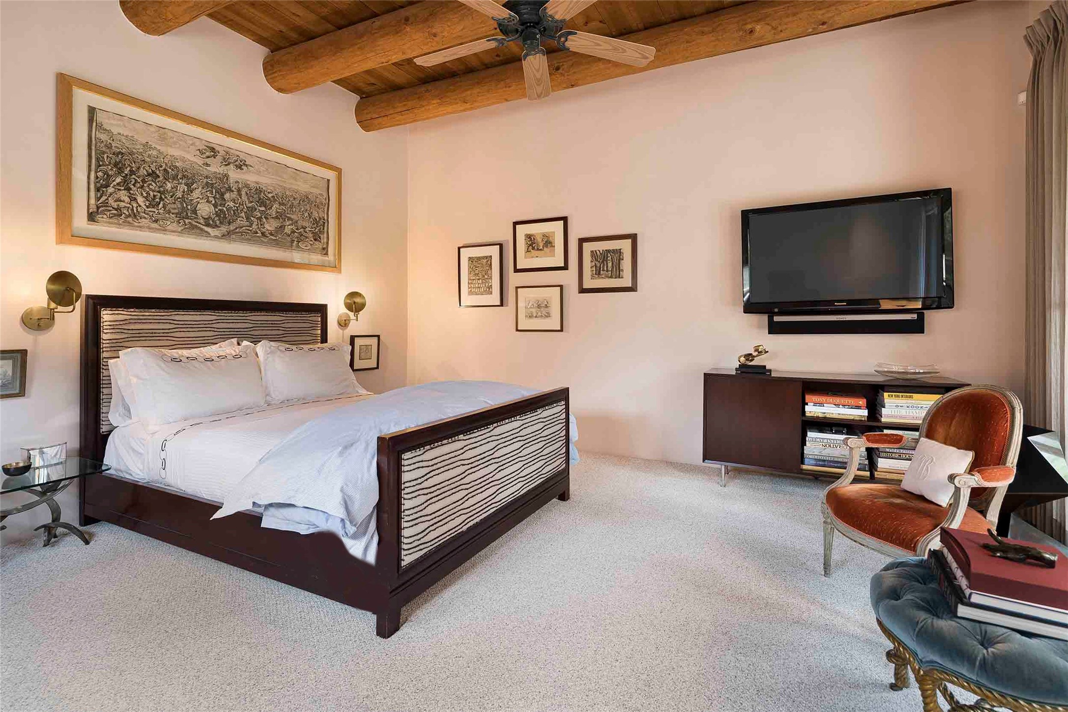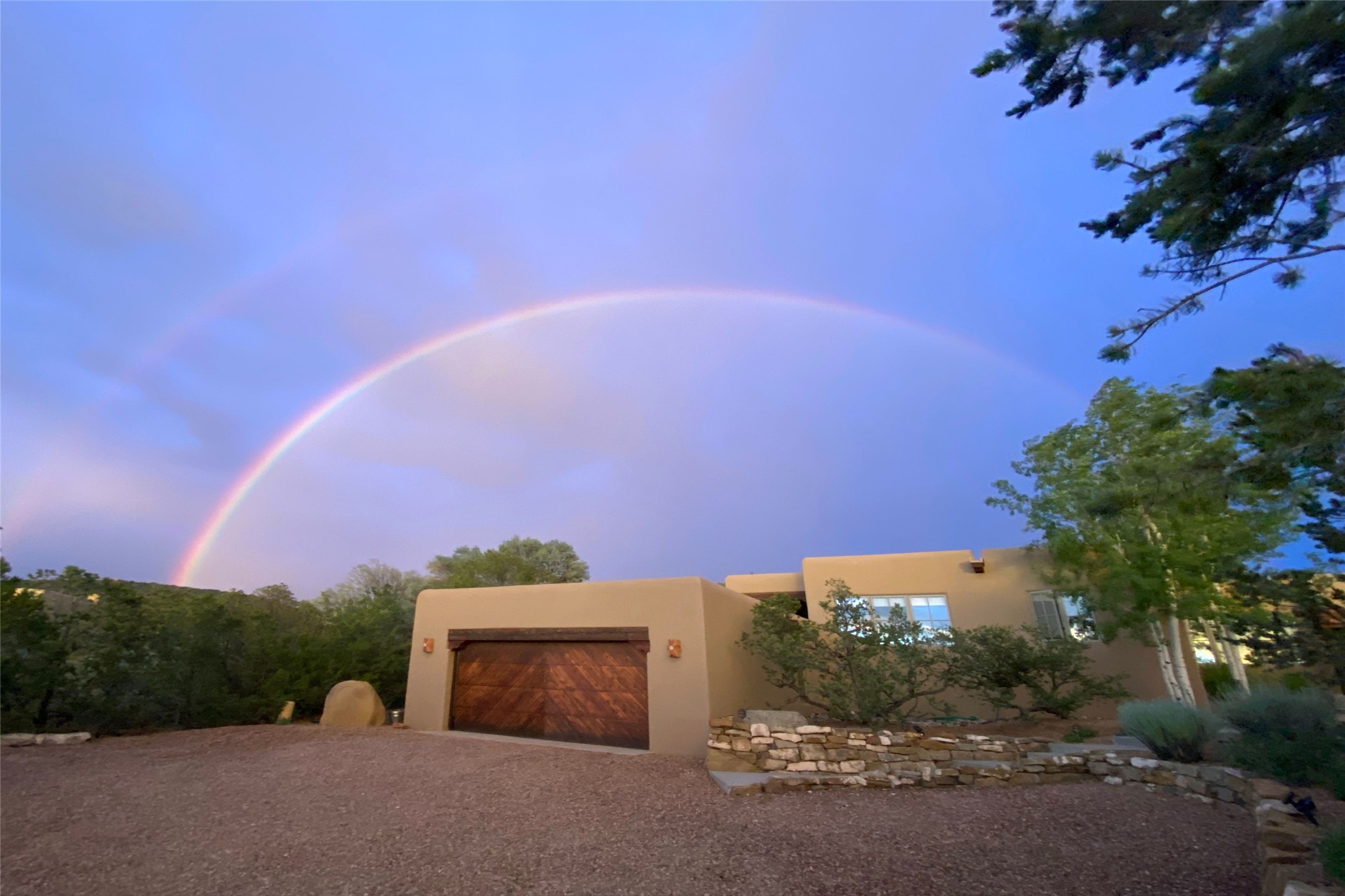 Rare Eastside Private and Gated La Cantera - Timeless Southwestern Elegance - Minutes from Canyon Road and the historic Plaza, this distinguished La Cantera home offers 3BR, 3BA and apx 2,715 sqft of refined living on nearly an acre - one of the enclave's largest and most coveted, private parcels. A graceful drive unveils an luxurious residence with high viga ceilings, hand-troweled plaster walls, and the golden glow of kiva fireplaces. Expansive living and dining rooms flow with effortless sophistication, grounded by wide tile floors. Soft carpeted bedrooms balance comfort and ease, with radiant heat throughout. The gourmet kitchen pairs polished granite, rich alder cabinetry, and sleek stainless appliances, while a luminous banco breakfast nook bathes in morning sun. Two master suites provide generous proportions and a serene ambiance, joined by a versatile third bedroom or office. The residence is completely single-level once entered. Outdoors, inviting portals designed for dining and entertaining create natural circulation into the gardens. A variety of fruit trees including peach, plum, cherry, apple and apricot, and a meandering wooded meditation walking path with fountain complete this secluded haven. Secured within La Cantera's gates with a 2-car attached garage, this rare property offers privacy, beauty, and architectural distinction - a world away but an easy stroll to Canyon Road's world renowned galleries and fine dining including Geronimo, The Tea House, and El Farol.