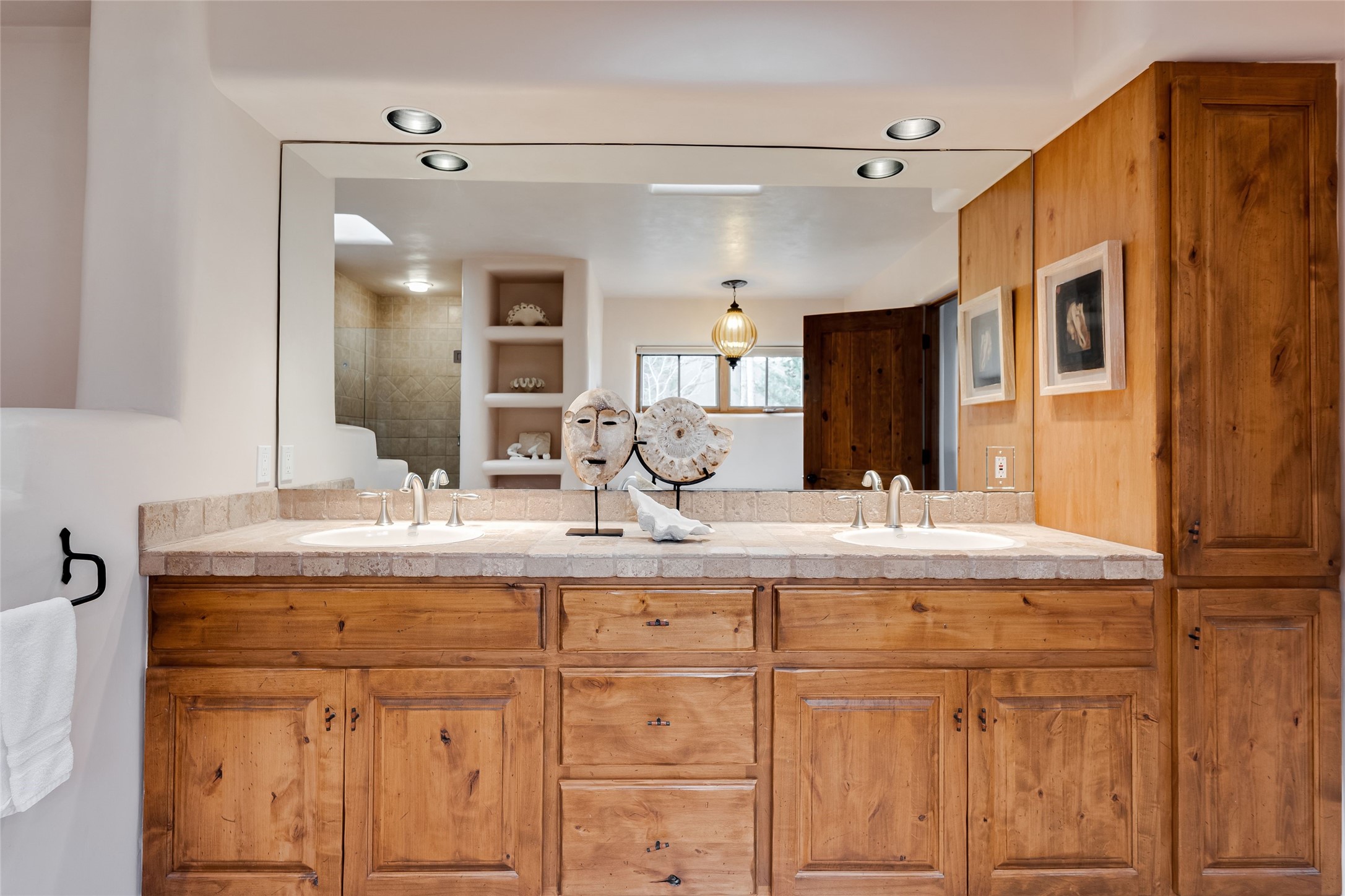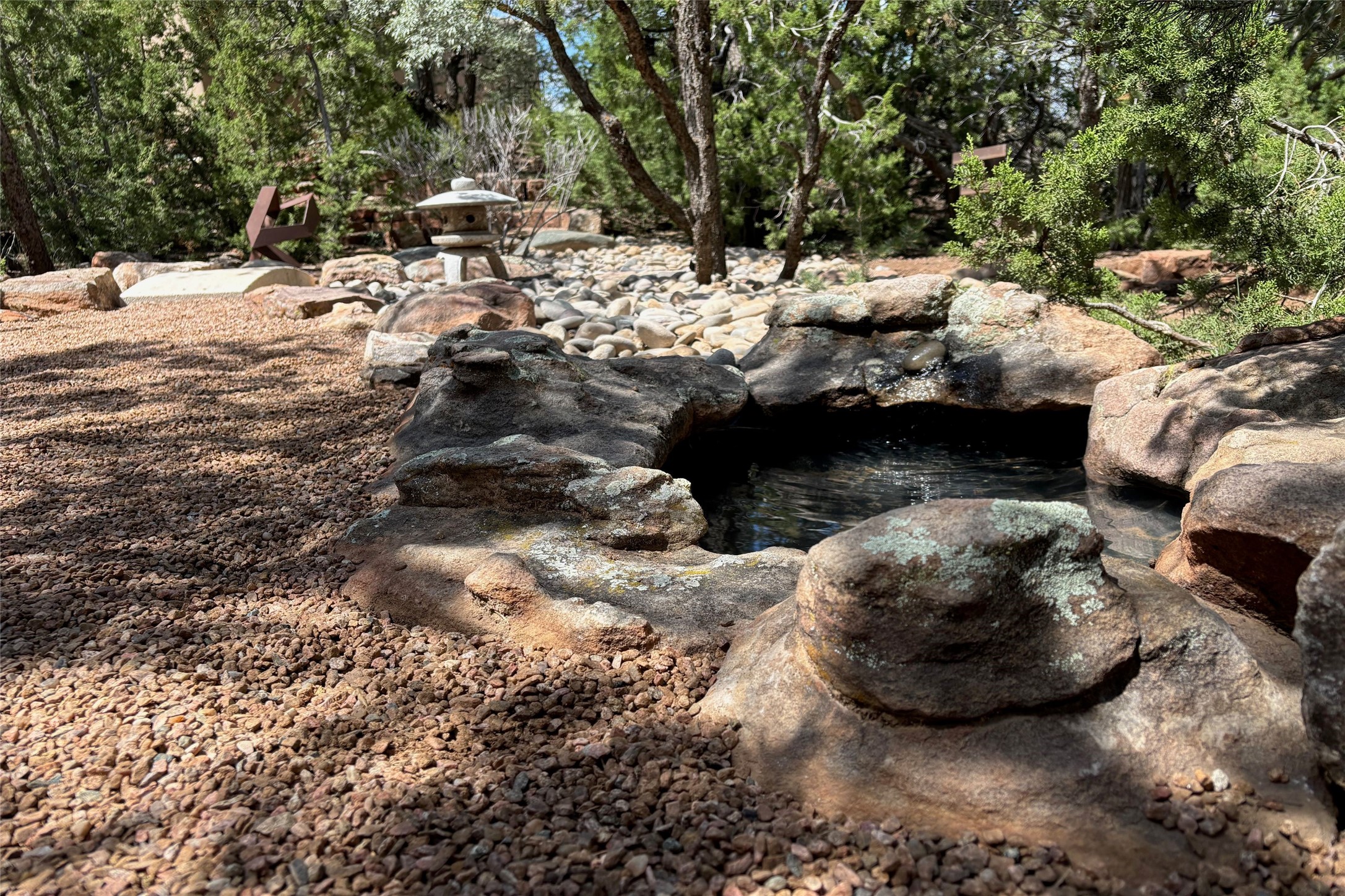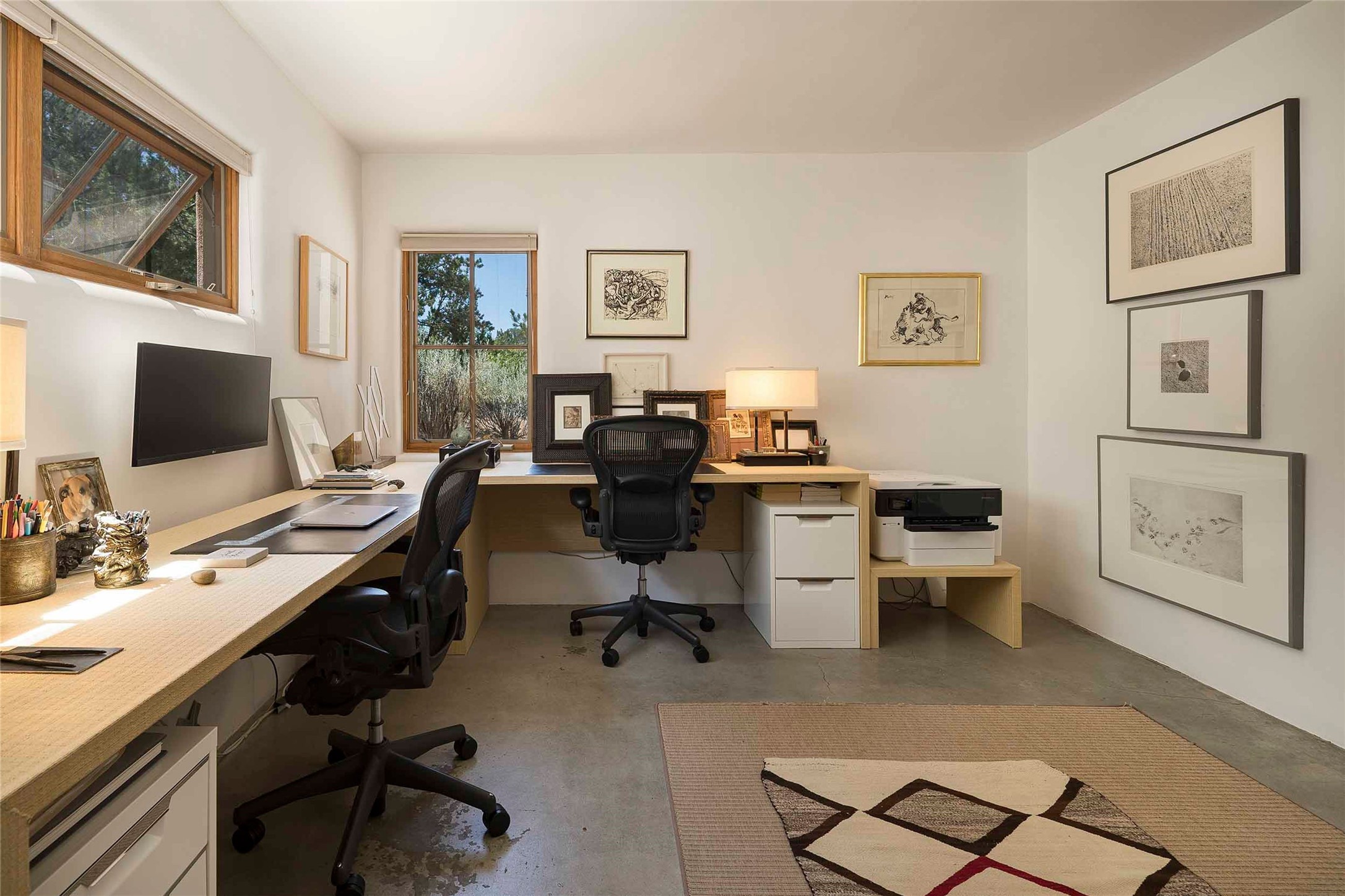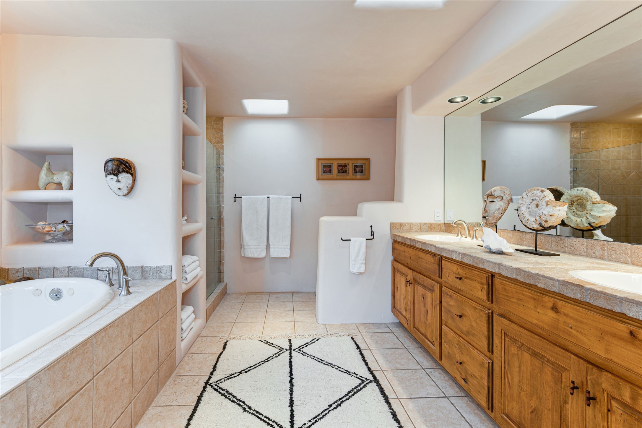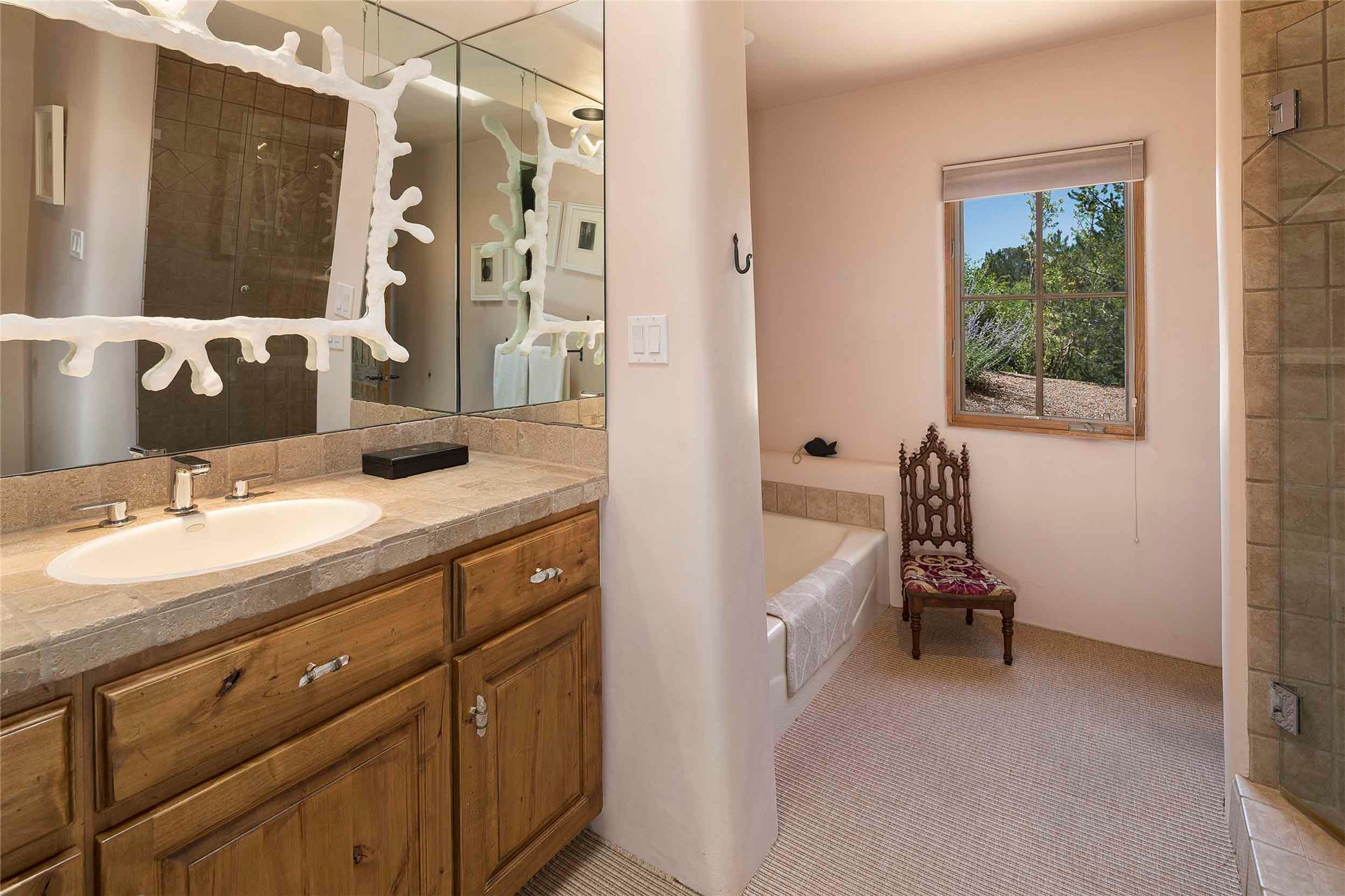 Rare Eastside Private and Gated La Cantera - Timeless Southwestern Elegance - Minutes from Canyon Road and the historic Plaza, this distinguished La Cantera home offers 3BR, 3BA and apx 2,715 sqft of refined living on nearly an acre - one of the enclave's largest and most coveted, private parcels. A graceful drive unveils an luxurious residence with high viga ceilings, hand-troweled plaster walls, and the golden glow of kiva fireplaces. Expansive living and dining rooms flow with effortless sophistication, grounded by wide tile floors. Soft carpeted bedrooms balance comfort and ease, with radiant heat throughout. The gourmet kitchen pairs polished granite, rich alder cabinetry, and sleek stainless appliances, while a luminous banco breakfast nook bathes in morning sun. Two master suites provide generous proportions and a serene ambiance, joined by a versatile third bedroom or office. The residence is completely single-level once entered. Outdoors, inviting portals designed for dining and entertaining create natural circulation into the gardens. A variety of fruit trees including peach, plum, cherry, apple and apricot, and a meandering wooded meditation walking path with fountain complete this secluded haven. Secured within La Cantera's gates with a 2-car attached garage, this rare property offers privacy, beauty, and architectural distinction - a world away but an easy stroll to Canyon Road's world renowned galleries and fine dining including Geronimo, The Tea House, and El Farol.