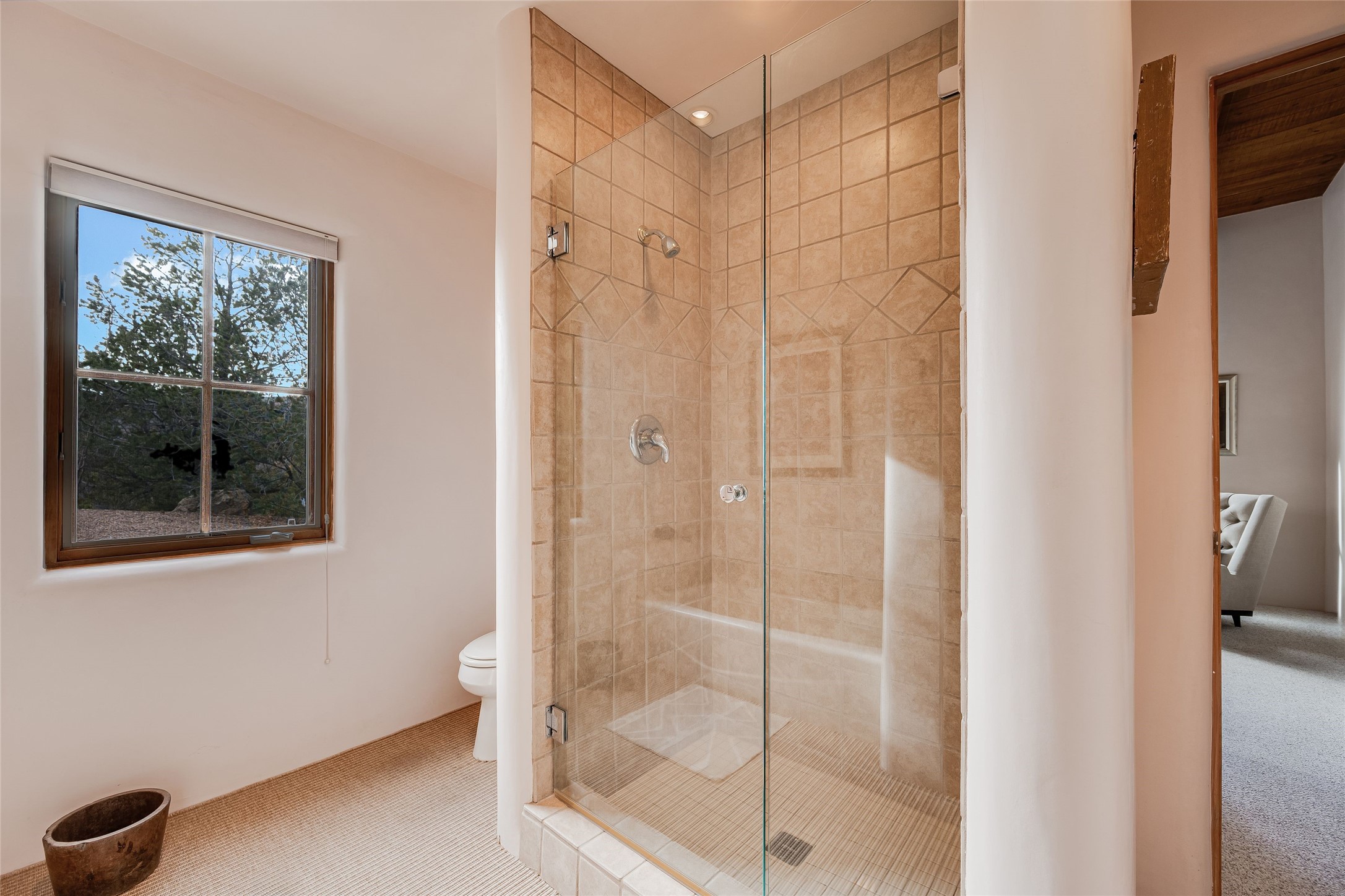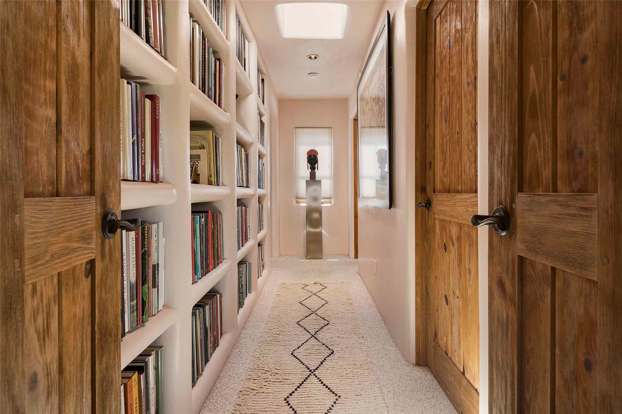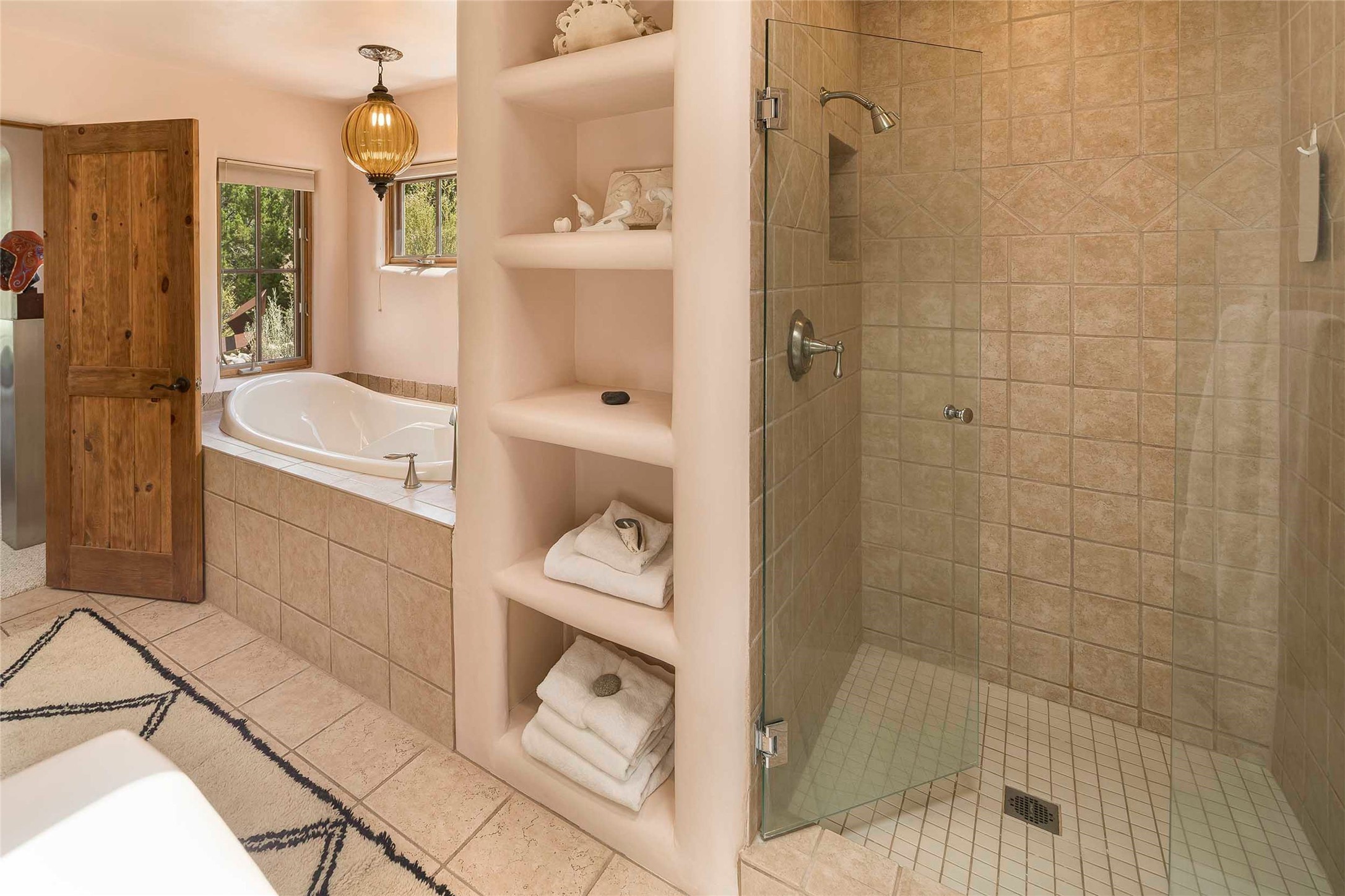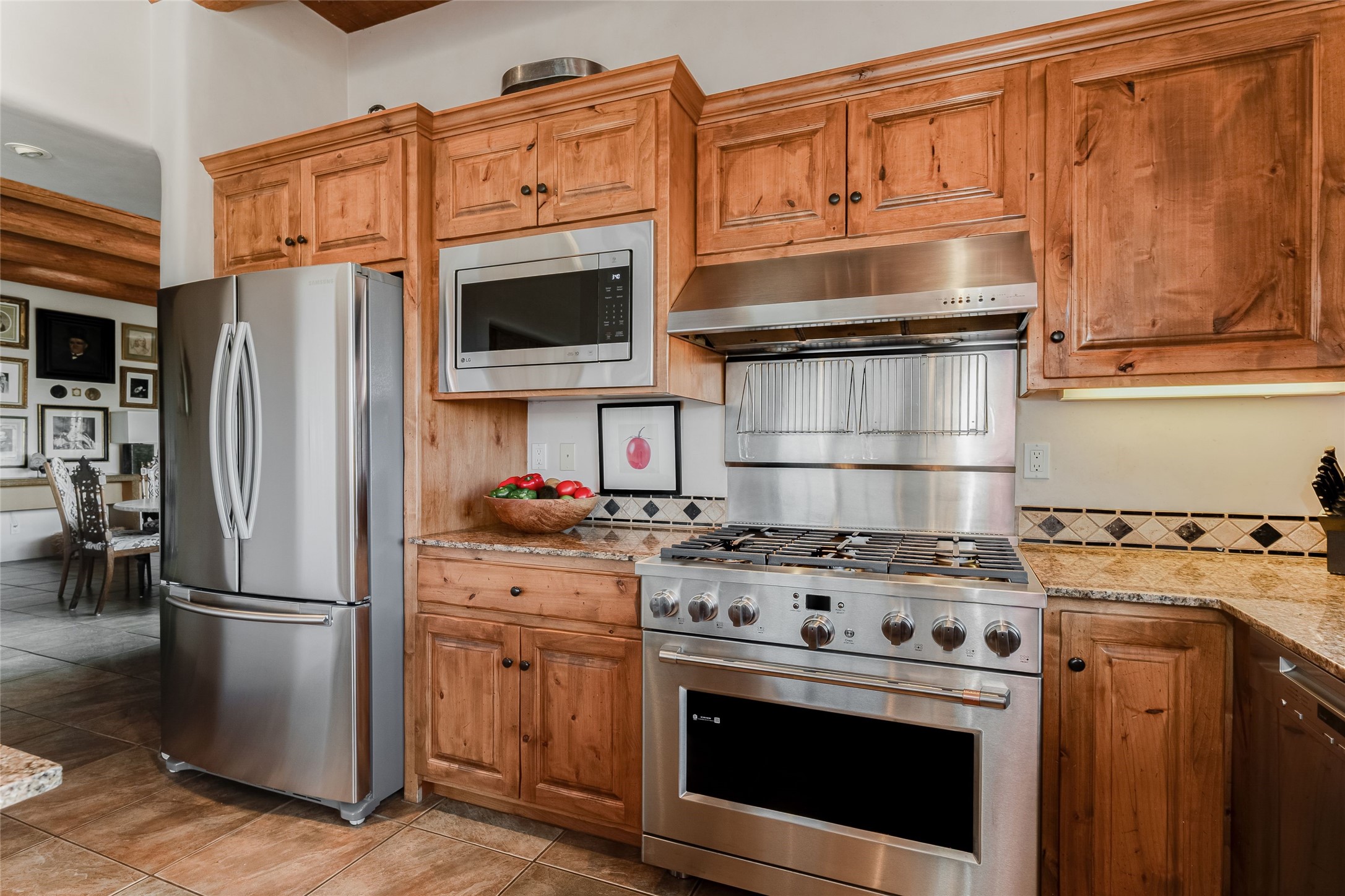 Rare Eastside Private and Gated La Cantera - Timeless Southwestern Elegance - Minutes from Canyon Road and the historic Plaza, this distinguished La Cantera home offers 3BR, 3BA and apx 2,715 sqft of refined living on nearly an acre - one of the enclave's largest and most coveted, private parcels. A graceful drive unveils an luxurious residence with high viga ceilings, hand-troweled plaster walls, and the golden glow of kiva fireplaces. Expansive living and dining rooms flow with effortless sophistication, grounded by wide tile floors. Soft carpeted bedrooms balance comfort and ease, with radiant heat throughout. The gourmet kitchen pairs polished granite, rich alder cabinetry, and sleek stainless appliances, while a luminous banco breakfast nook bathes in morning sun. Two master suites provide generous proportions and a serene ambiance, joined by a versatile third bedroom or office. The residence is completely single-level once entered. Outdoors, inviting portals designed for dining and entertaining create natural circulation into the gardens. A variety of fruit trees including peach, plum, cherry, apple and apricot, and a meandering wooded meditation walking path with fountain complete this secluded haven. Secured within La Cantera's gates with a 2-car attached garage, this rare property offers privacy, beauty, and architectural distinction - a world away but an easy stroll to Canyon Road's world renowned galleries and fine dining including Geronimo, The Tea House, and El Farol.