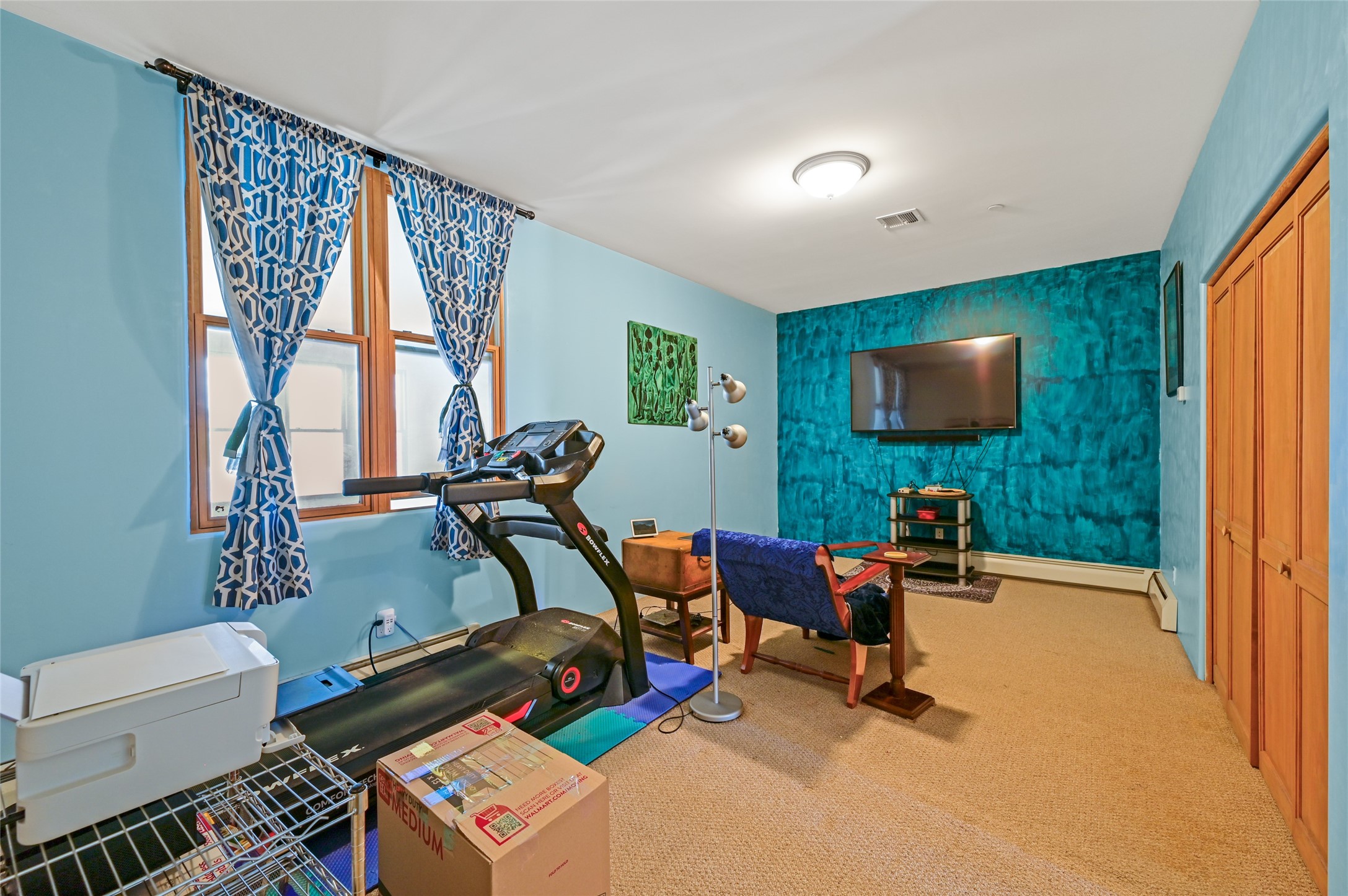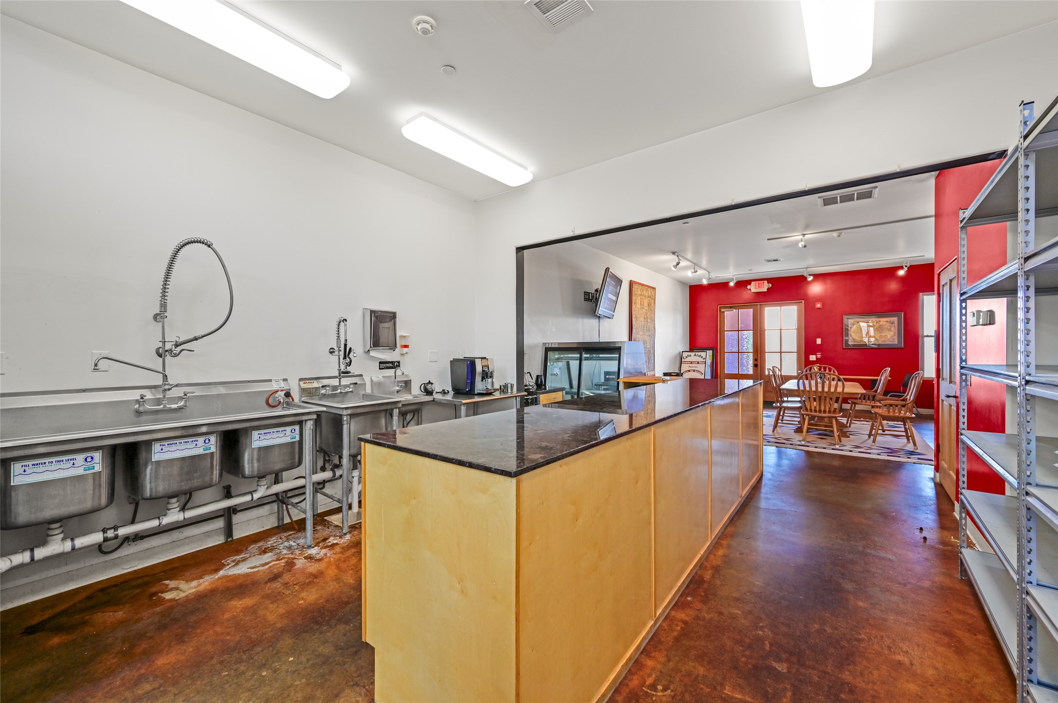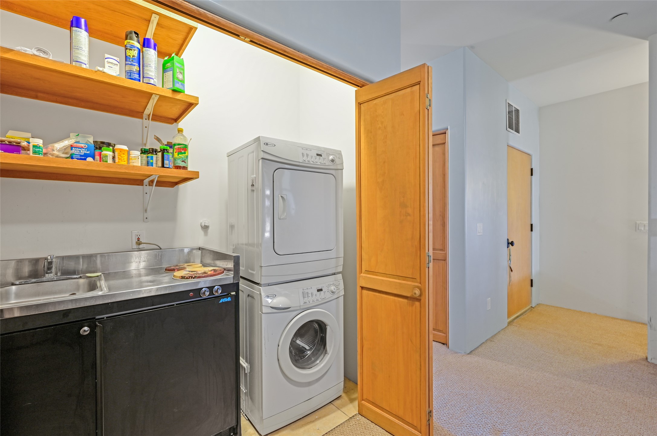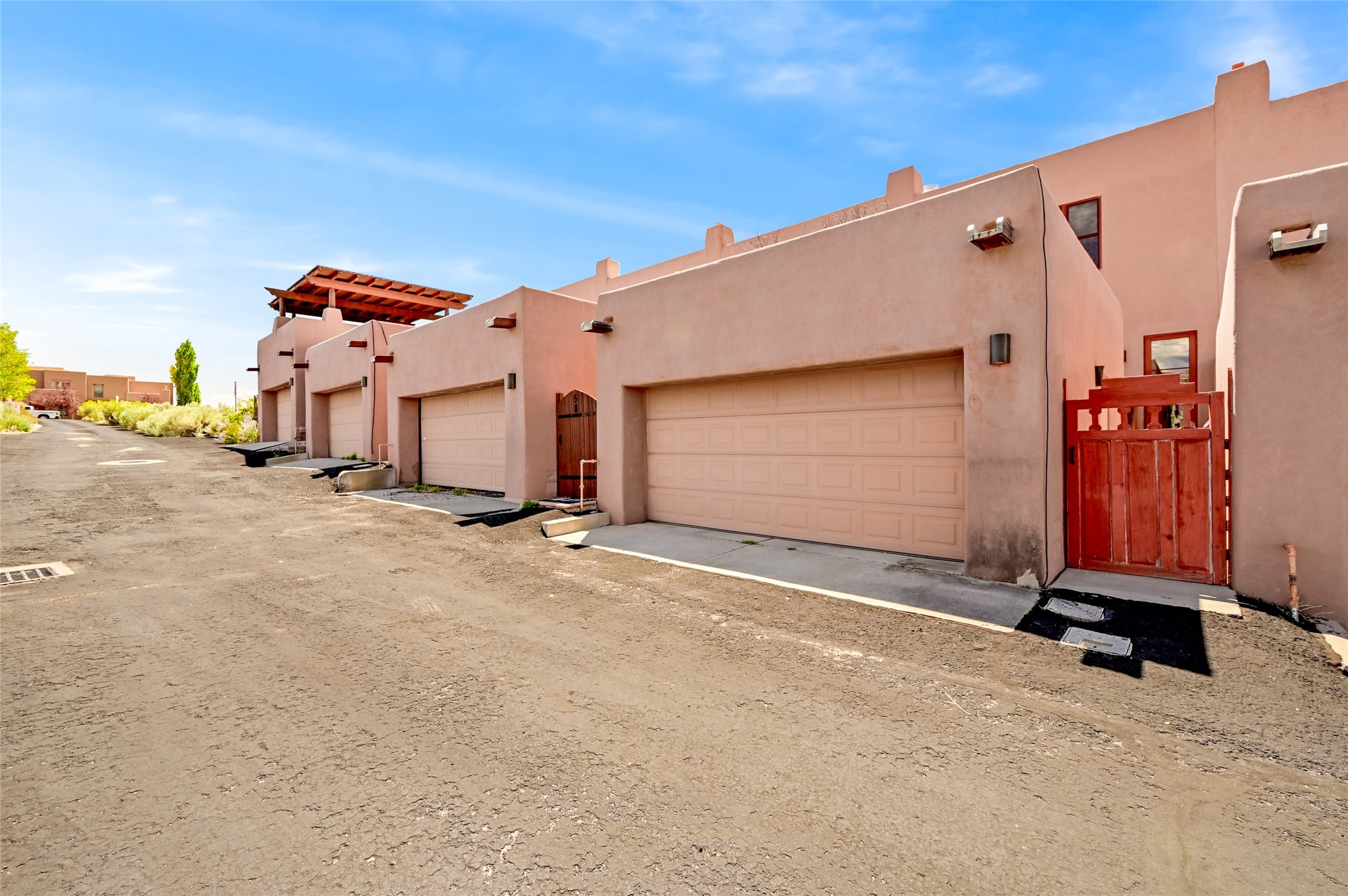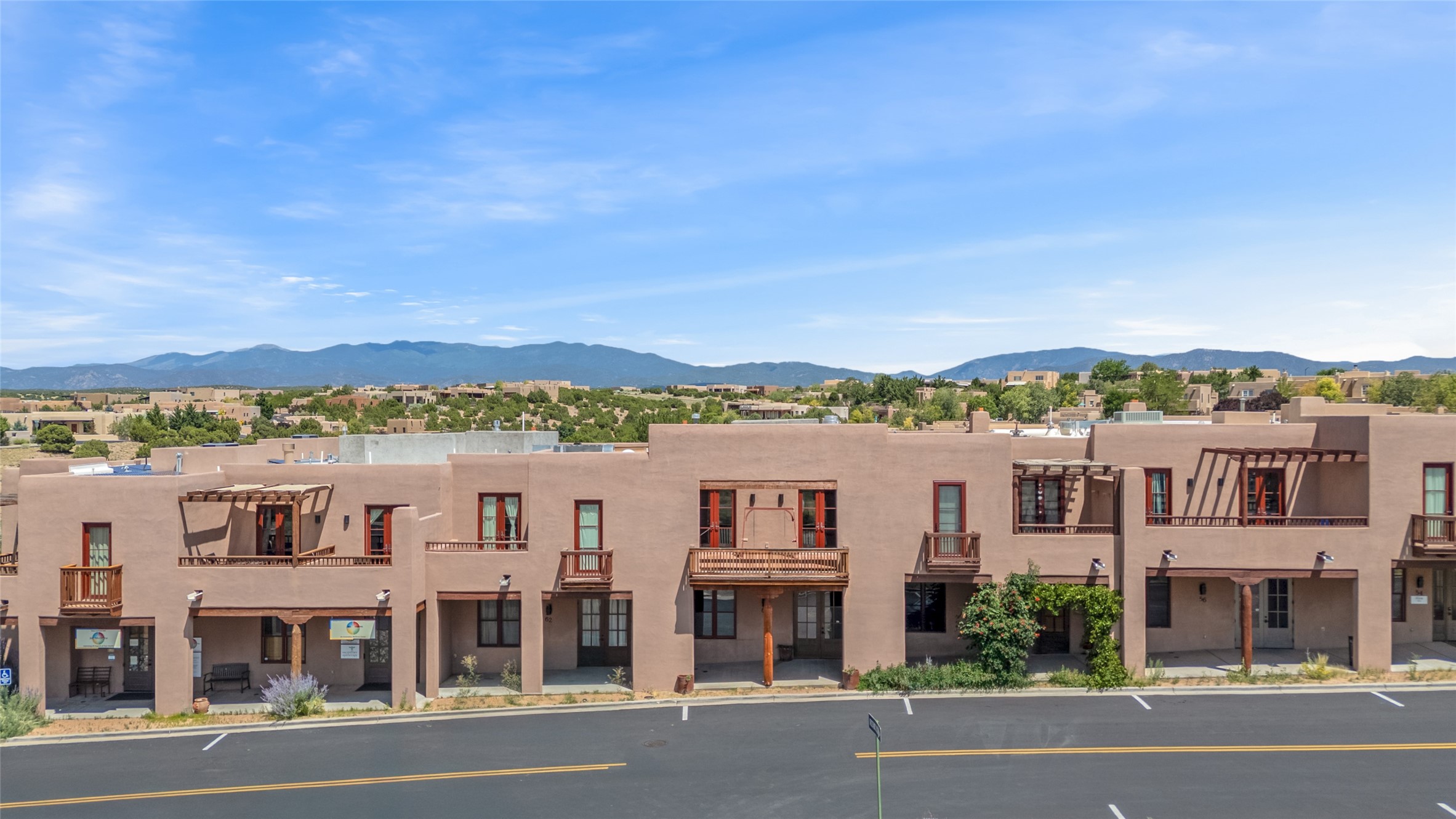 Rare live/work opportunity in Aldea de Santa Fe. The unit has been converted into a restaurant with approx. 1,788/SF of ground-floor space, featuring a commercial vent hood, 3-compartment sink, grease trap, floor drain, handwashing sink, customer restroom, employee restroom, and a private back patio with mature landscaping and brickwork. The upstairs unit can be used for residential or commercial purposes and is currently built out with a living room, kitchenette with stackable washer and dryer, full bath, guestroom, and a main bedroom with an en suite bath and walk-in closet. The second and main bedrooms offers outdoor balcony access with superb mountain views. The property also includes a spacious two-car garage and additional commercial parking at the rear. This is an excellent opportunity for another restaurant, office, gallery, florist, retail store, or other neighborhood use. Association dues are approximately $500 per quarter. Restaurant equipment is negotiable.