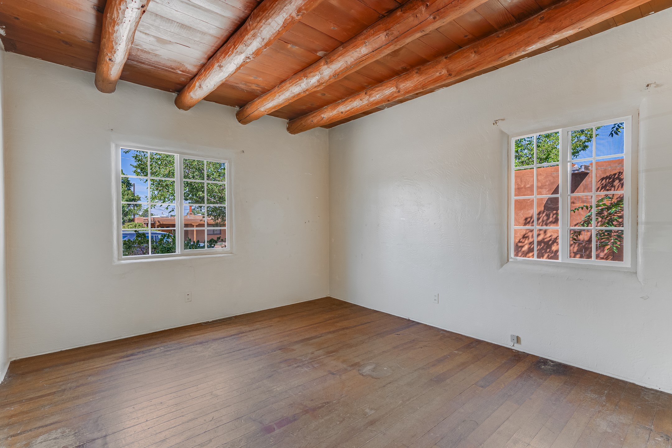This charming three-bedroom single-level home is located a stone's throw from downtown Santa Fe. The original Stamm design features vigas, wood floors, a corner kiva fireplace, and a converted garage centered, on a generous 1/8 acre lot. The 1,334+/- square foot floor plan offers excellent bones to build upon. The primary bedroom and two additional rooms benefit from large newer windows for plenty of natural light. Some other updates include granite countertops, a partially renovated hallway bathroom, roof work in 2024 and stucco around 2022. Whether you're looking to build equity, generate passive income, or settle into a friendly area with character, this home's value, location, and potential combine for a compelling opportunity.