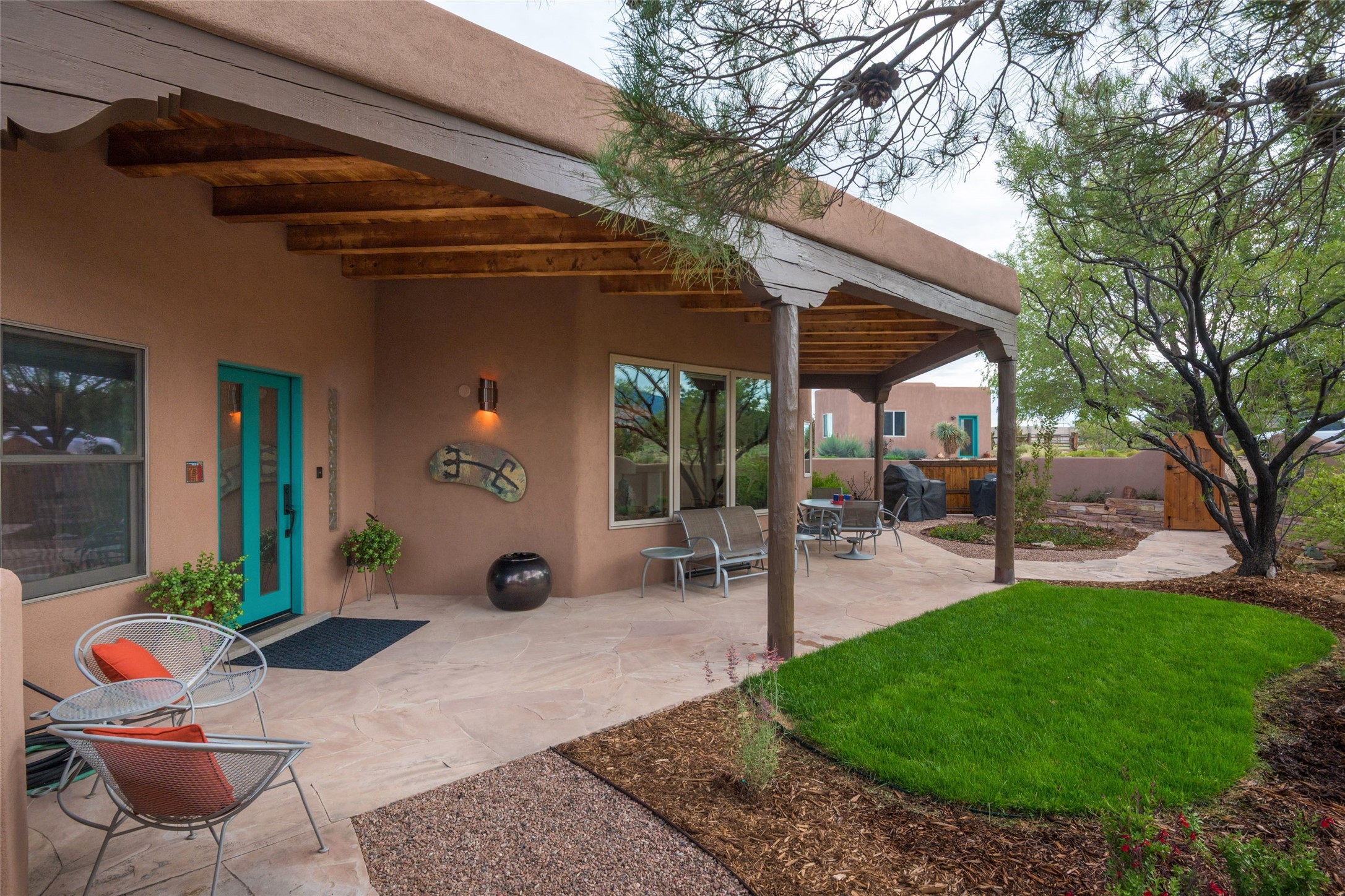 Discover the perfect Placitas home that offers peace, stunning views, charm, and an ideal location. This meticulously maintained single-level residence features 3 bedrooms and 2 bathrooms, with an updated kitchen including a Wolf cooktop. The spacious 3-car garage is ideal for parking or a workshop, and a separate 351 sq ft heated and cooled building provides versatile space as an office, studio, or craft room. Located at the end of a quiet road, it's just a 35-minute drive to Santa Fe, close to the RailRunner, grocery stores, golf, and amenities. The home boasts beautiful stone floors throughout, with brick flooring and a large walk-in closet in the primary suite. The landscaped front courtyard and covered patio offers breathtaking mountain views, perfect for relaxing and entertaining.