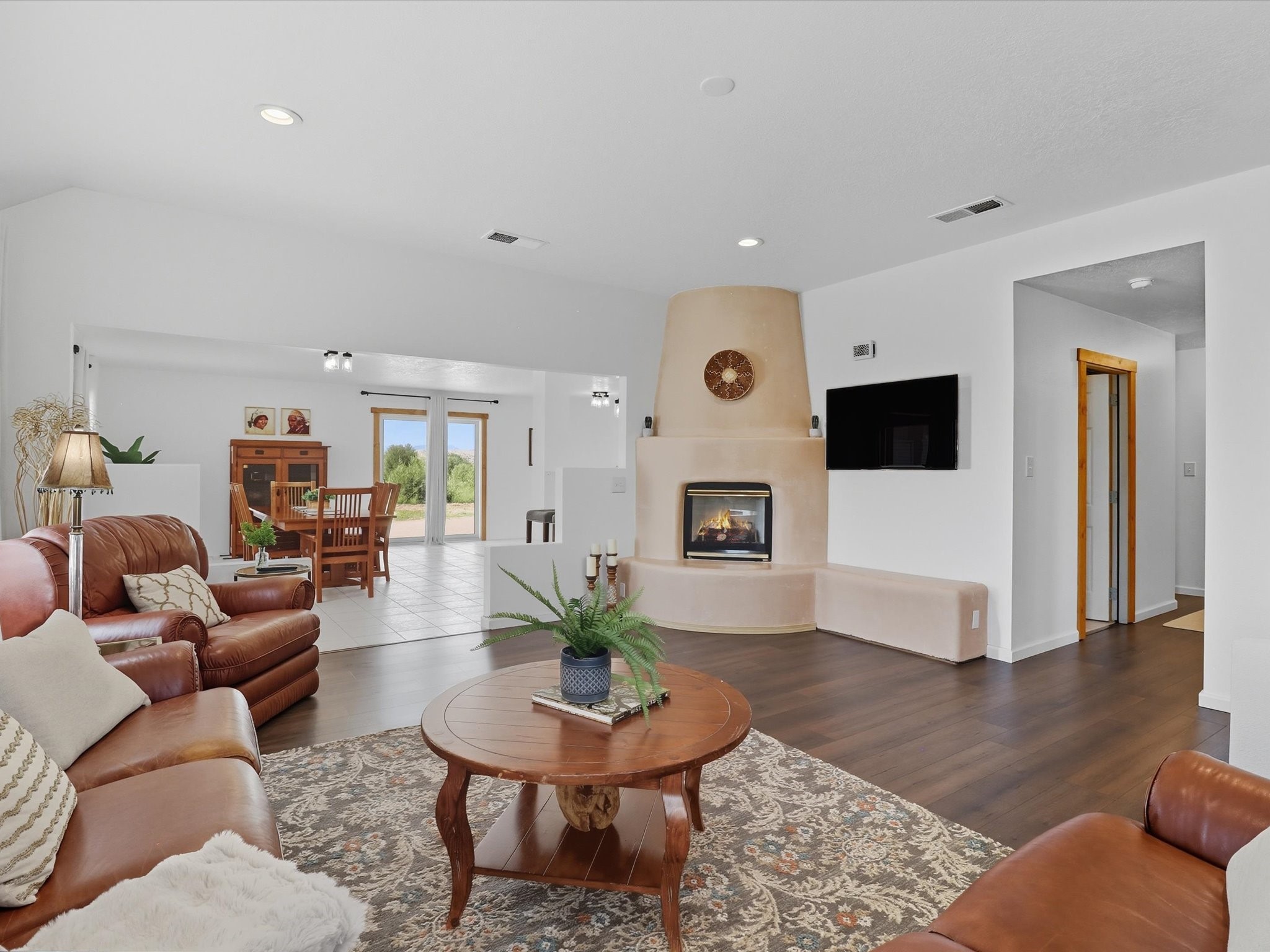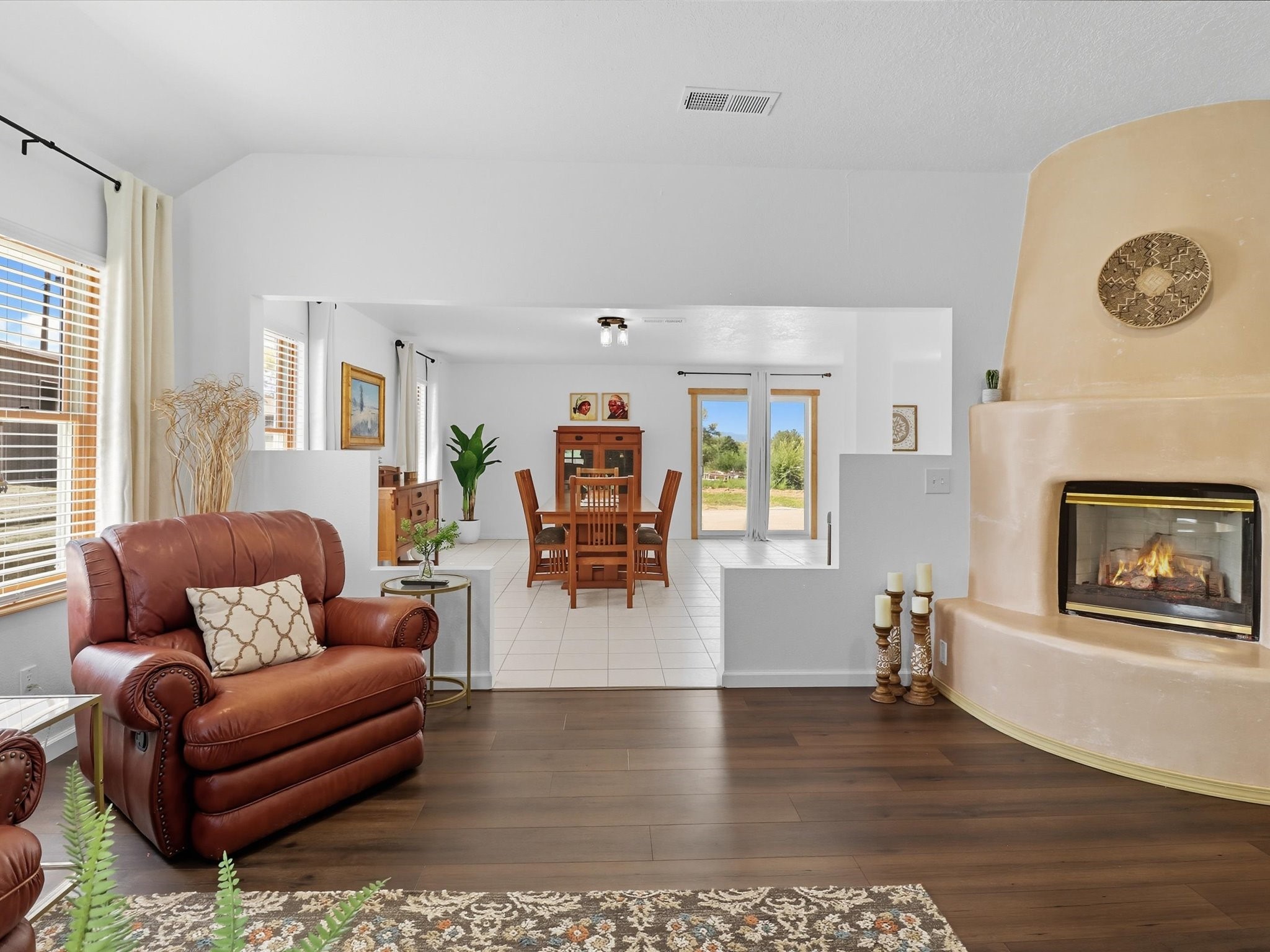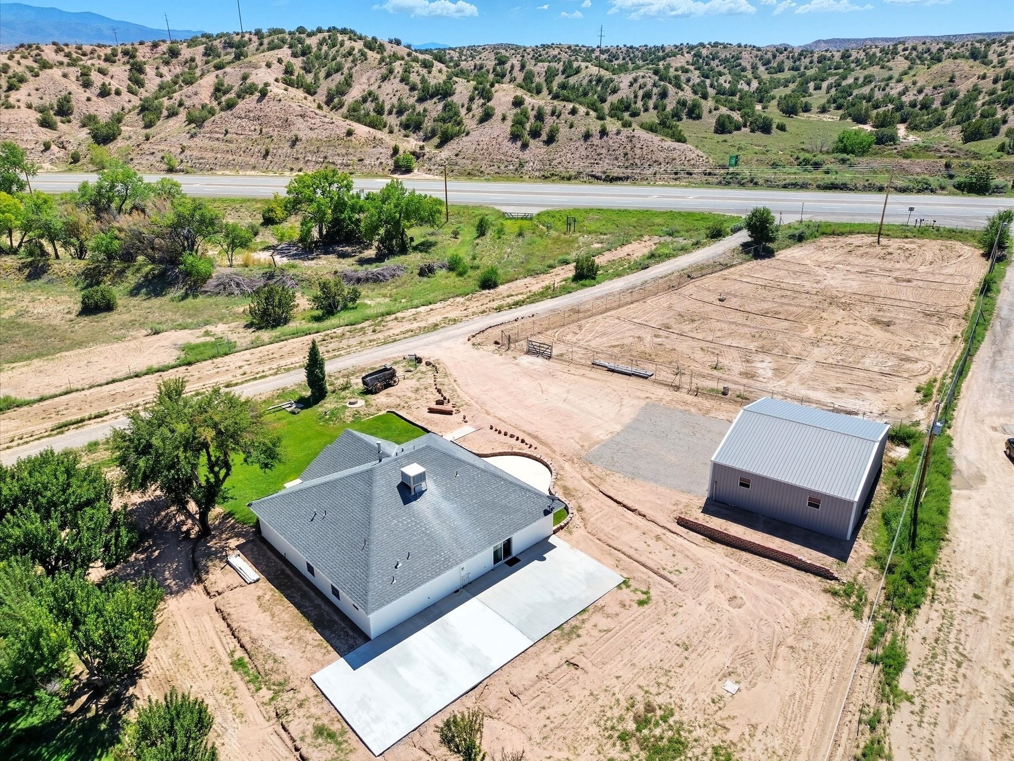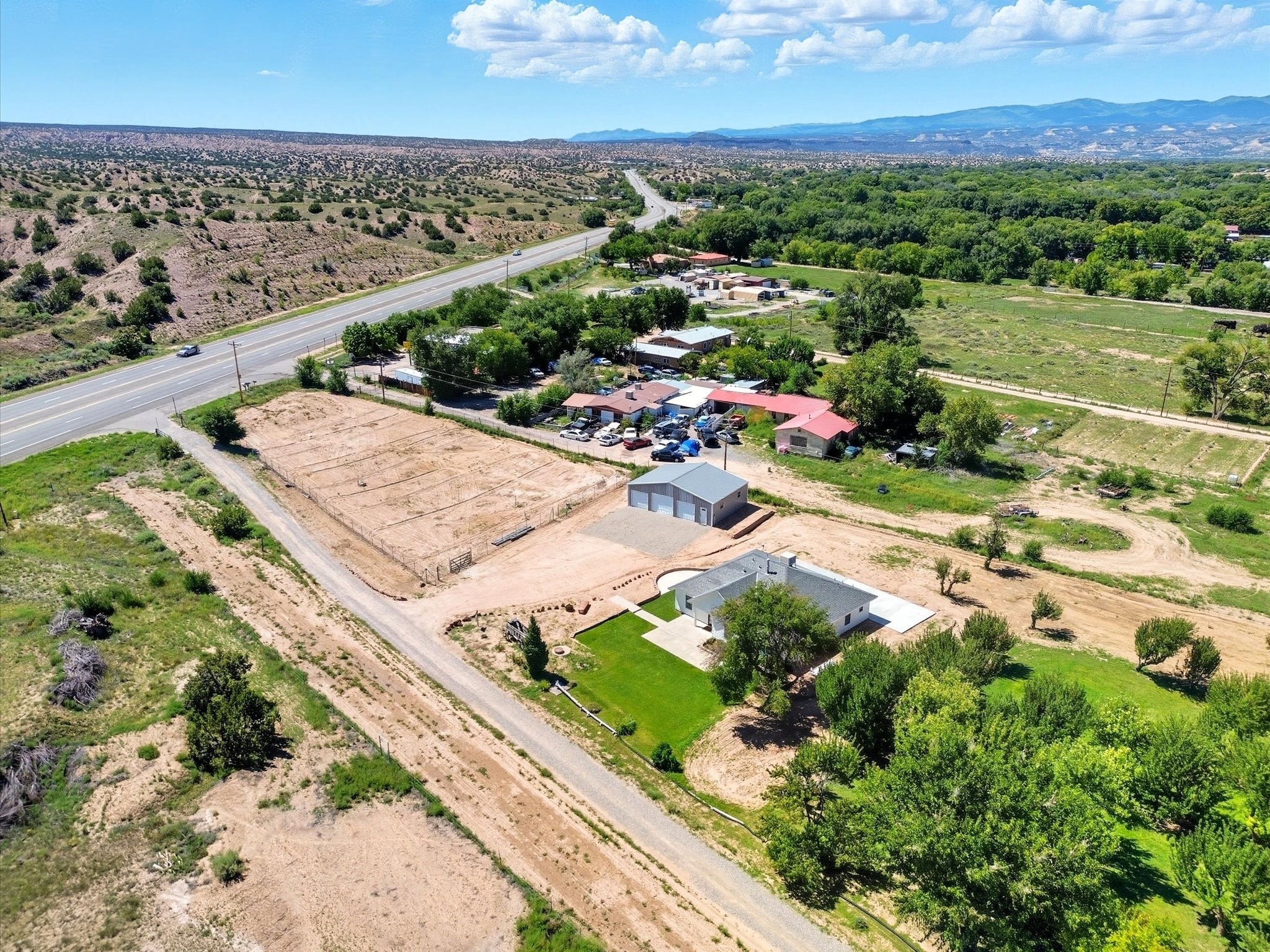 INCREDIBLE FIND - 0.75 acre property w/quality dream home and separate 1,206 sq ft workshop building w/3 garage doors (up to 6 car tandem). Found just 20 minutes from either Santa Fe plaza or Los Alamos National Labs in the coveted & fertile Pojoaque valley complete w/irrigation water rights. Special features of the home incl: new roof (installation 9/2025), newly painted interior & exterior, energy-saving Pella thermal windows, in-floor radiant heat for cozy winter days, 2 low-maintenance gas diamond plaster kiva fireplaces, tile or new high-quality engineered wood flooring throughout (no carpet!), updated baths with a Dream Style Shower, and a total kitchen remodel w/new cabinetry | stainless steel appliances | granite slab countertops. *Also available on 1.5 acres (including adjacent .75 acre lot) for September 2025 appraised value of $845,000.*
