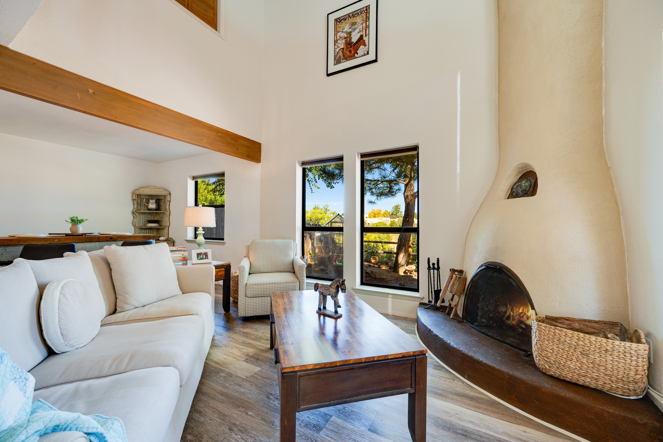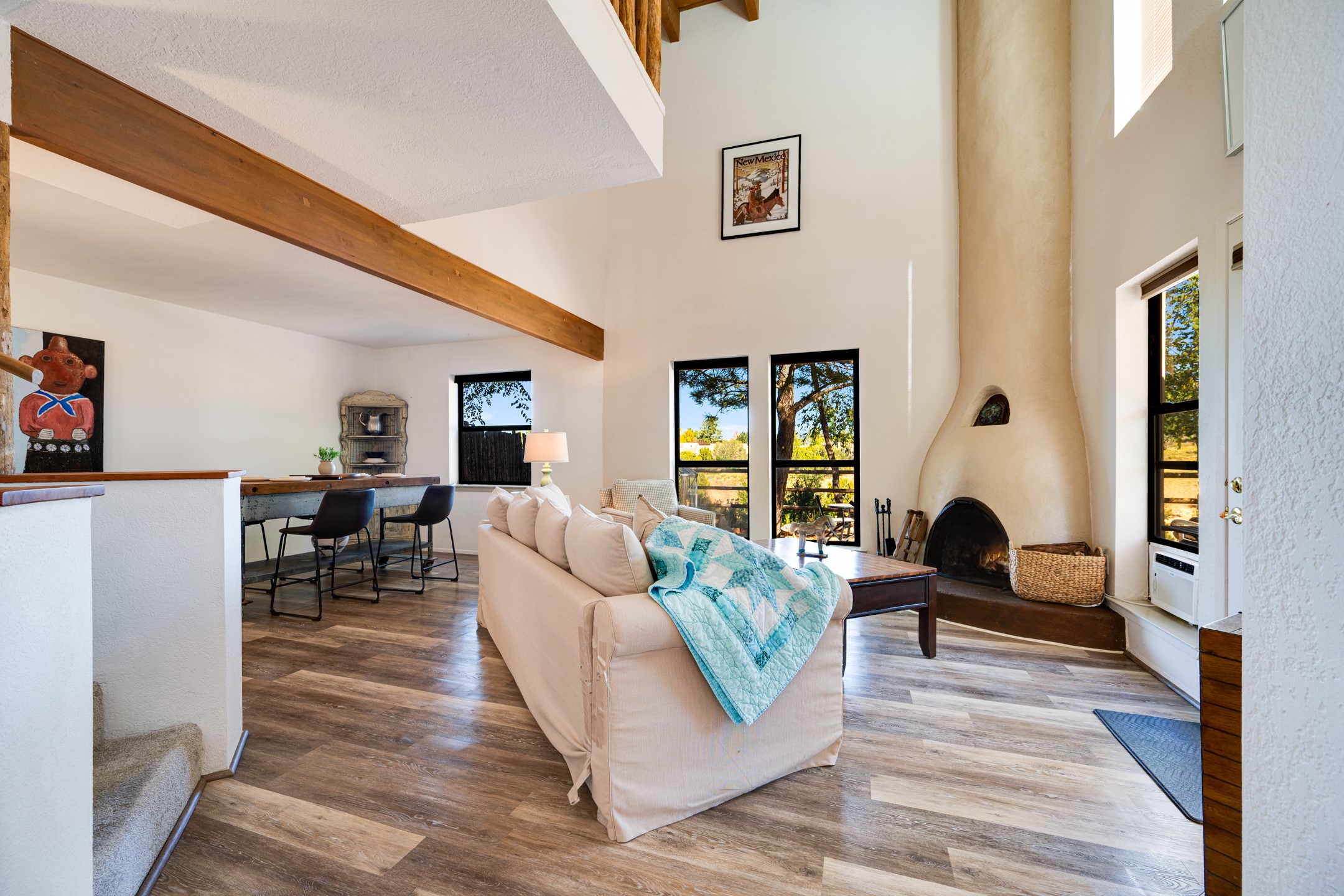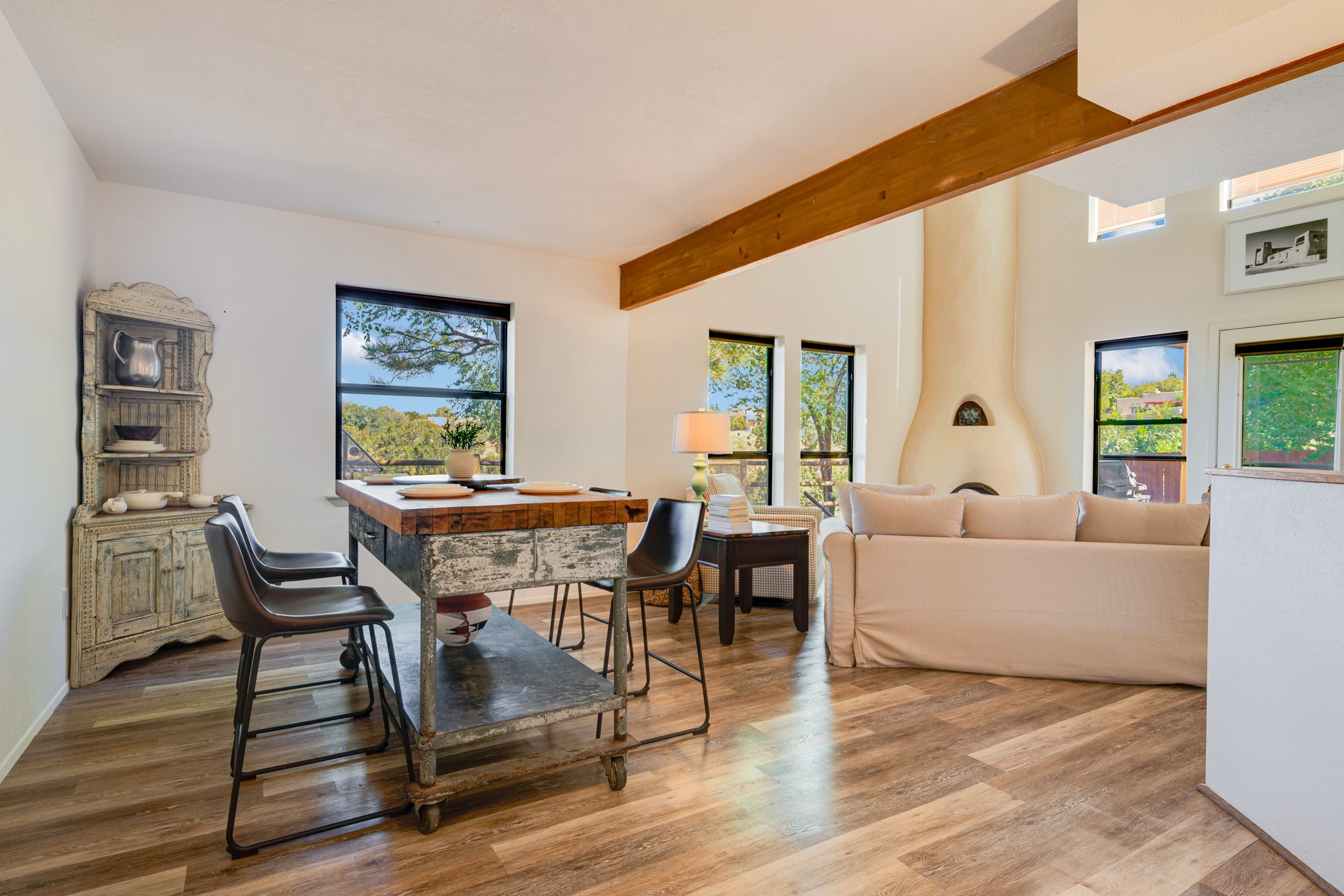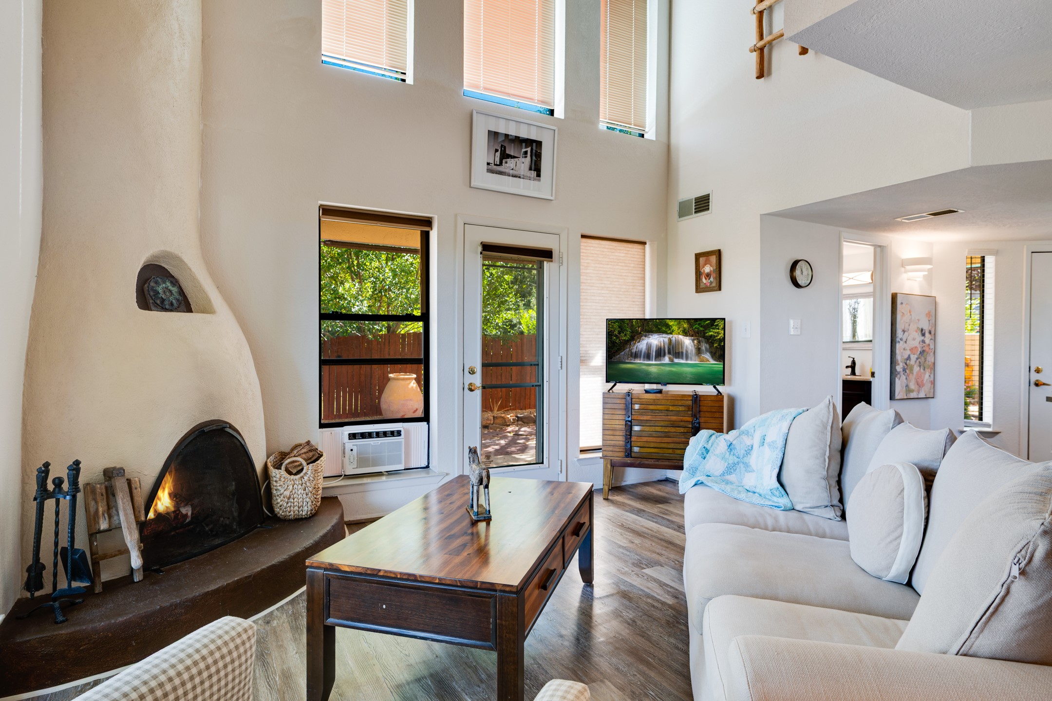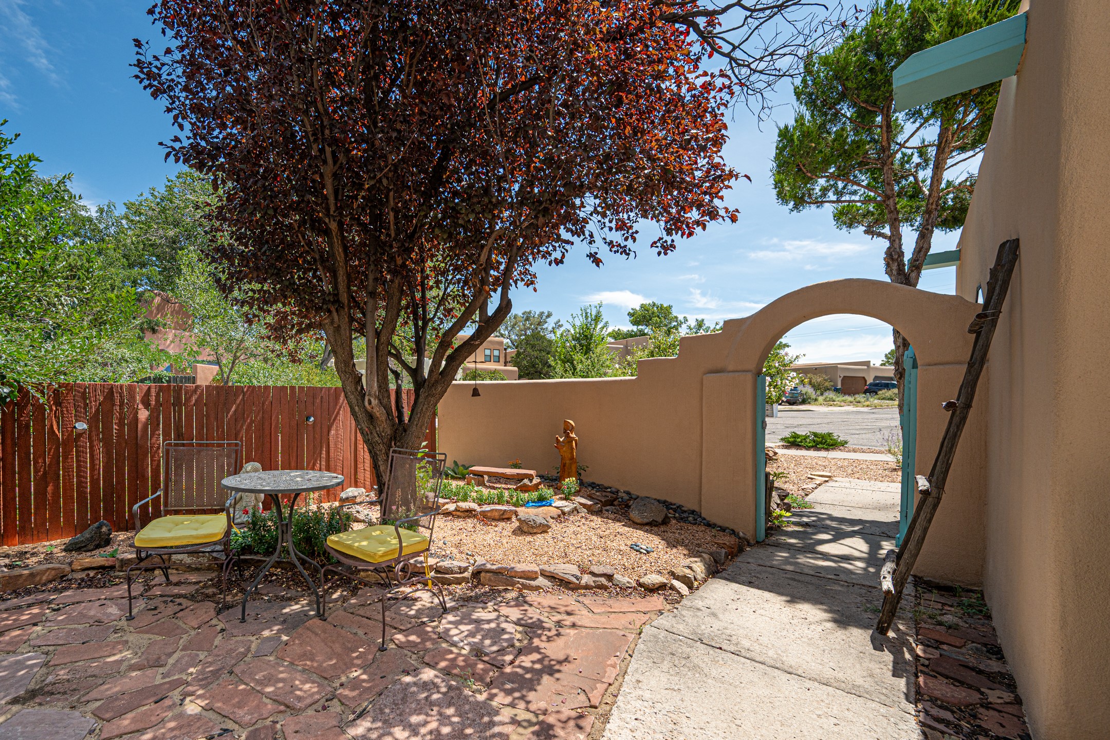 This inviting two-bedroom, two-and-a-half-bath home, located in the desirable Via Caballeros neighborhood, features 1400+/- square feet of interior space on two levels. The living room, with its soaring ceilings, abundant natural light, wood-like floors, and a charming Kiva fireplace, is warm and inviting. The spacious kitchen is appointed with wood cabinets and butcher-block countertops to add timeless appeal. Also on the main level you will find a convenient powder room, dedicated laundry room, and direct access to a 2-car garage. Upstairs, each bedroom has its own full bathroom and lots of closet space. This end unit backs onto a greenbelt, with a sublimely private wrap-around yard shaded by mature trees, with a standalone greenhouse, and xeriscaped for ease of maintenance. Local parks and amenities nearby make this an ideal starter home or investment, blending of modern updates, traditional New Mexican charm, and a central location for everyone to love.
