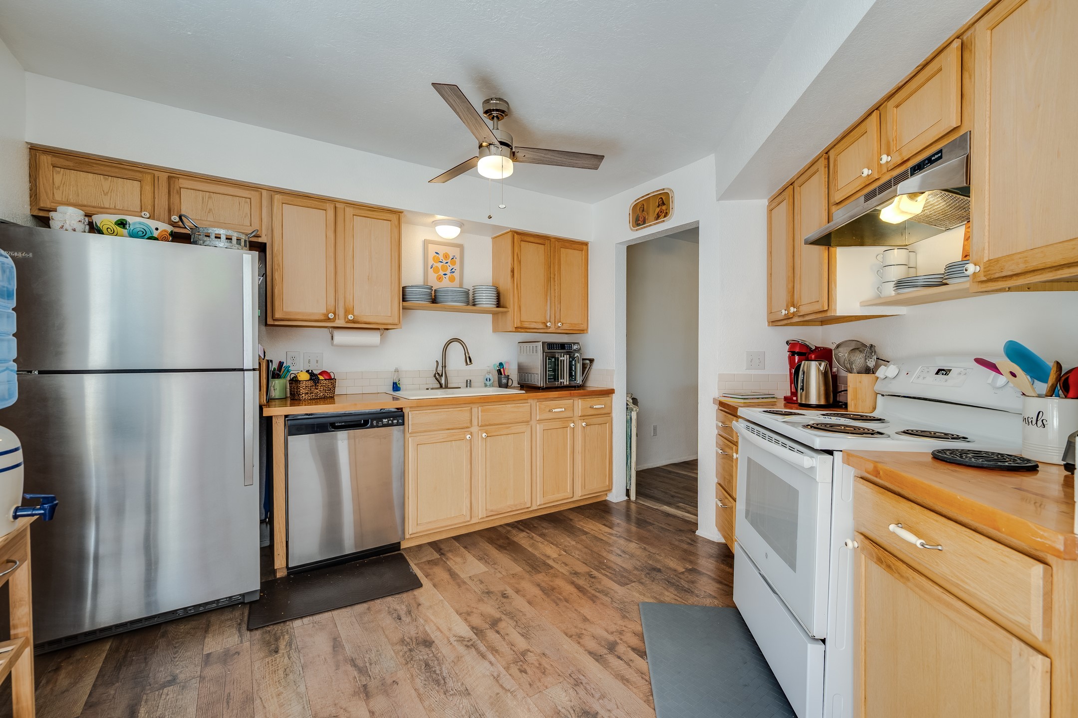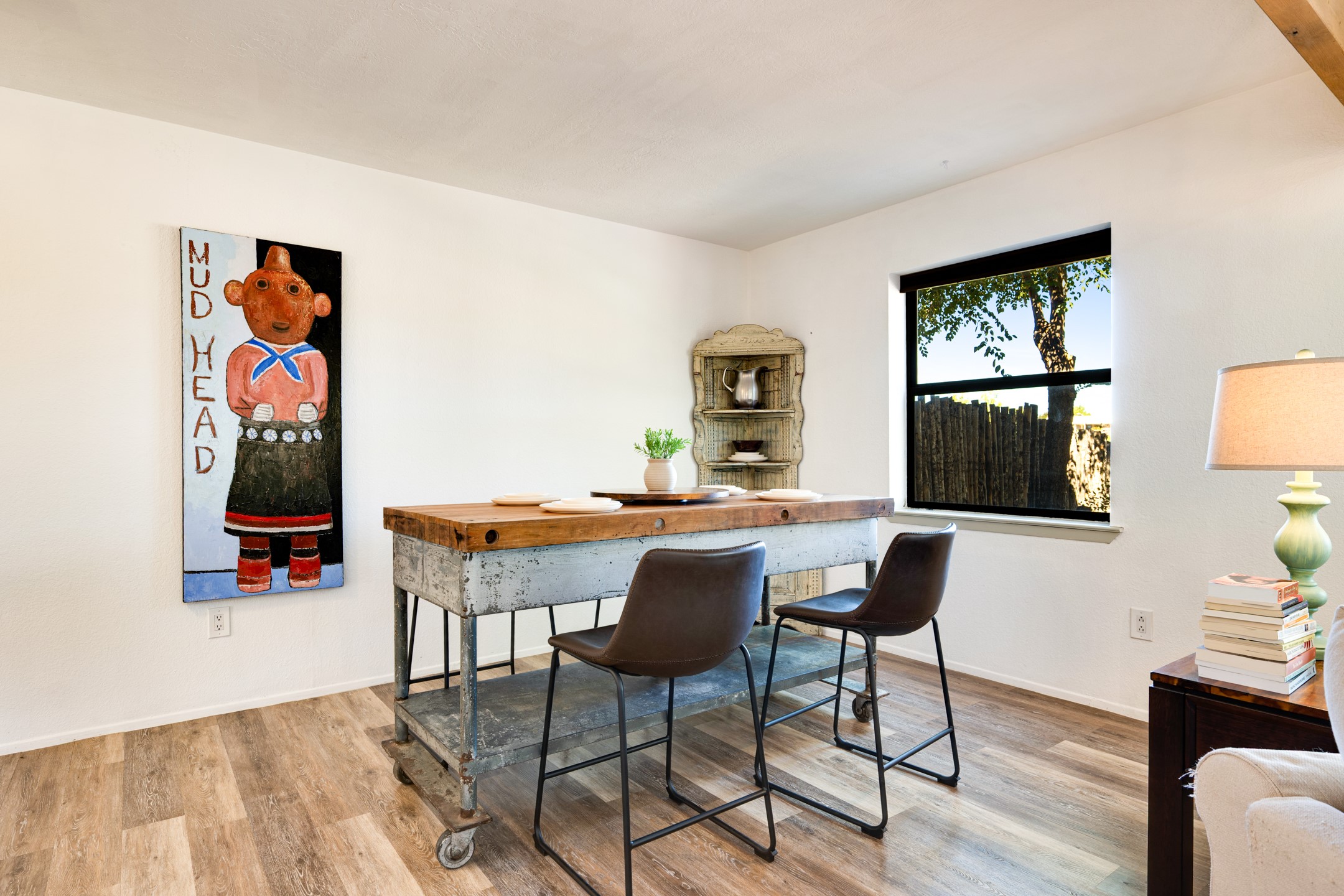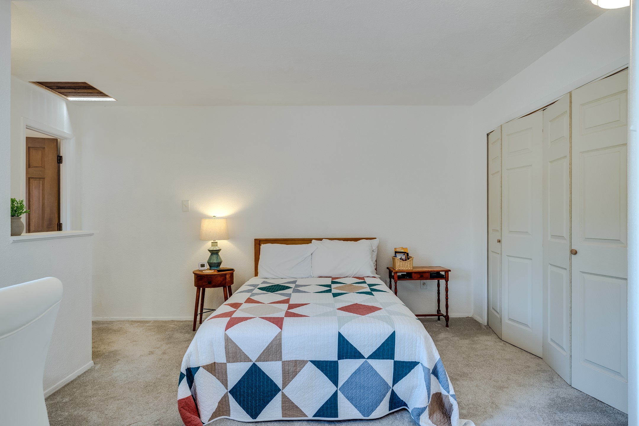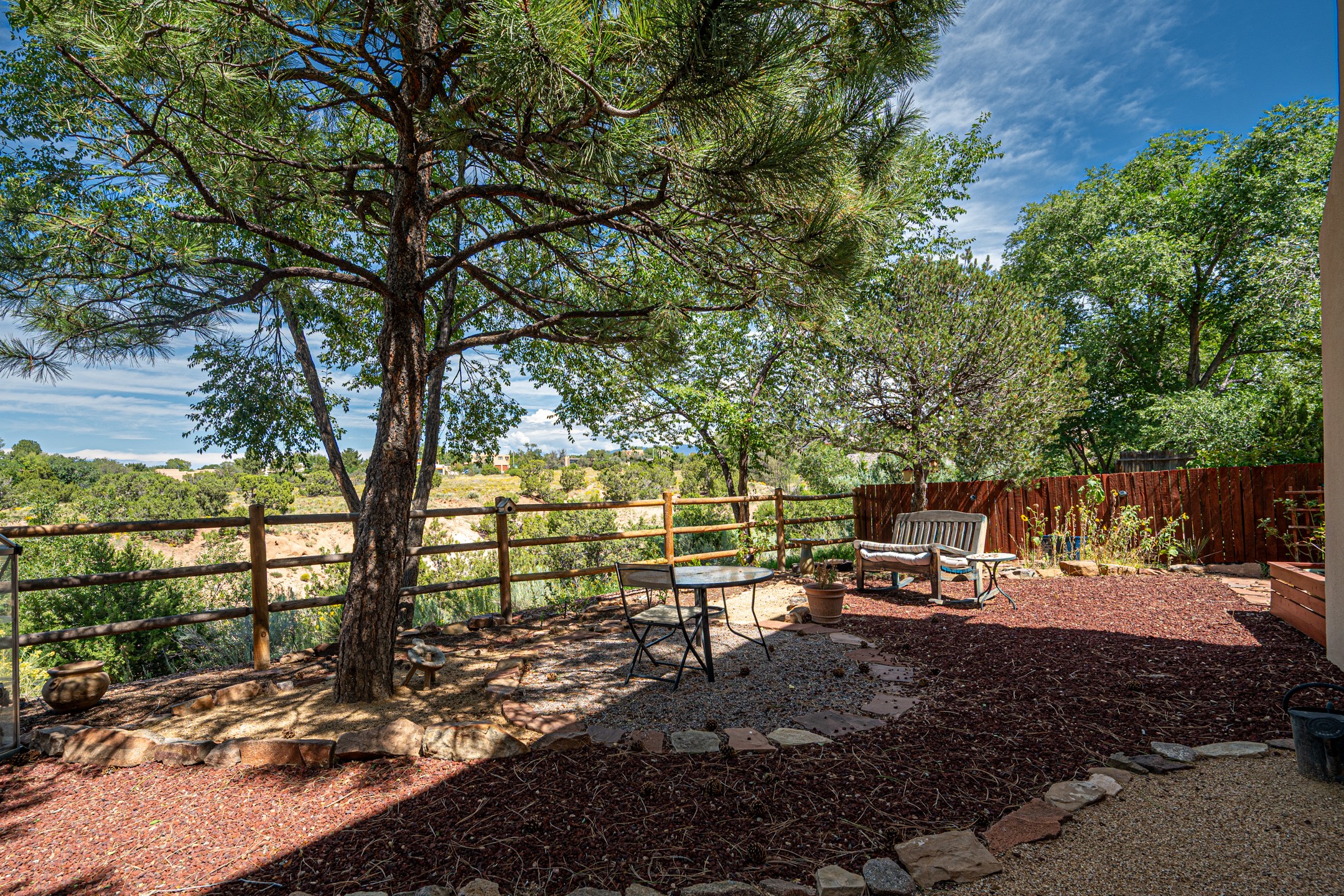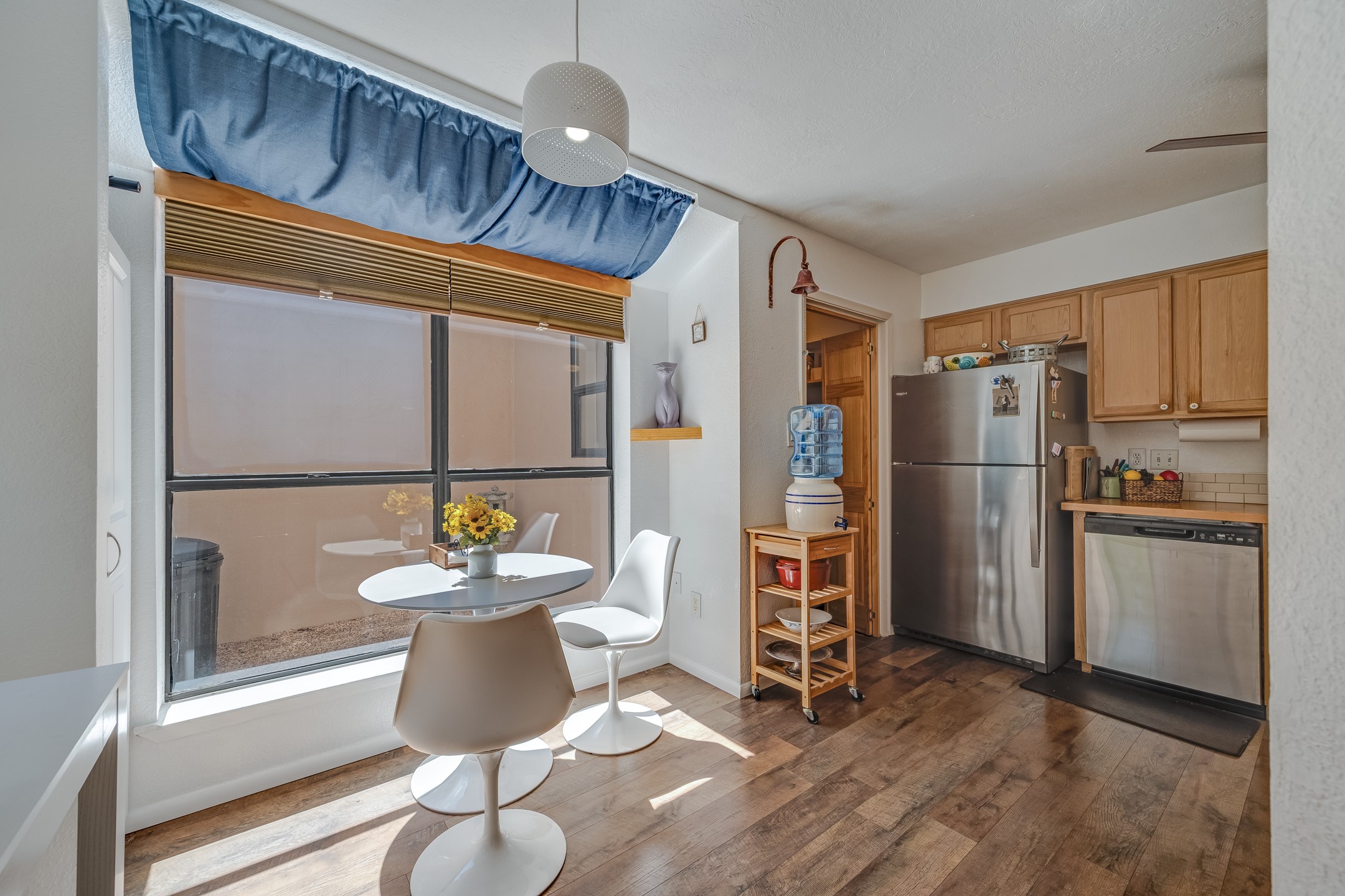 This inviting two-bedroom, two-and-a-half-bath home, located in the desirable Via Caballeros neighborhood, features 1400+/- square feet of interior space on two levels. The living room, with its soaring ceilings, abundant natural light, wood-like floors, and a charming Kiva fireplace, is warm and inviting. The spacious kitchen is appointed with wood cabinets and butcher-block countertops to add timeless appeal. Also on the main level you will find a convenient powder room, dedicated laundry room, and direct access to a 2-car garage. Upstairs, each bedroom has its own full bathroom and lots of closet space. This end unit backs onto a greenbelt, with a sublimely private wrap-around yard shaded by mature trees, with a standalone greenhouse, and xeriscaped for ease of maintenance. Local parks and amenities nearby make this an ideal starter home or investment, blending of modern updates, traditional New Mexican charm, and a central location for everyone to love.