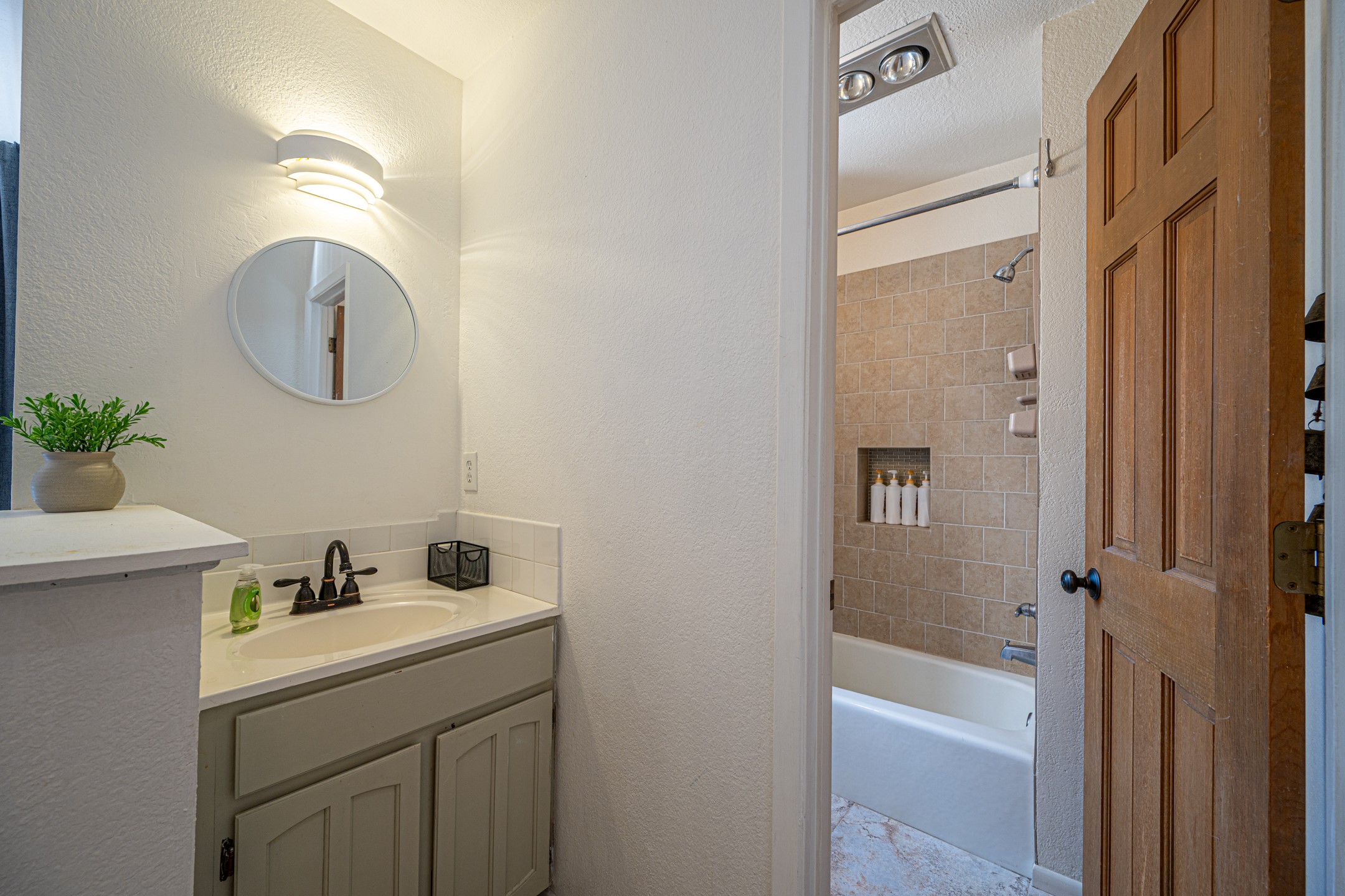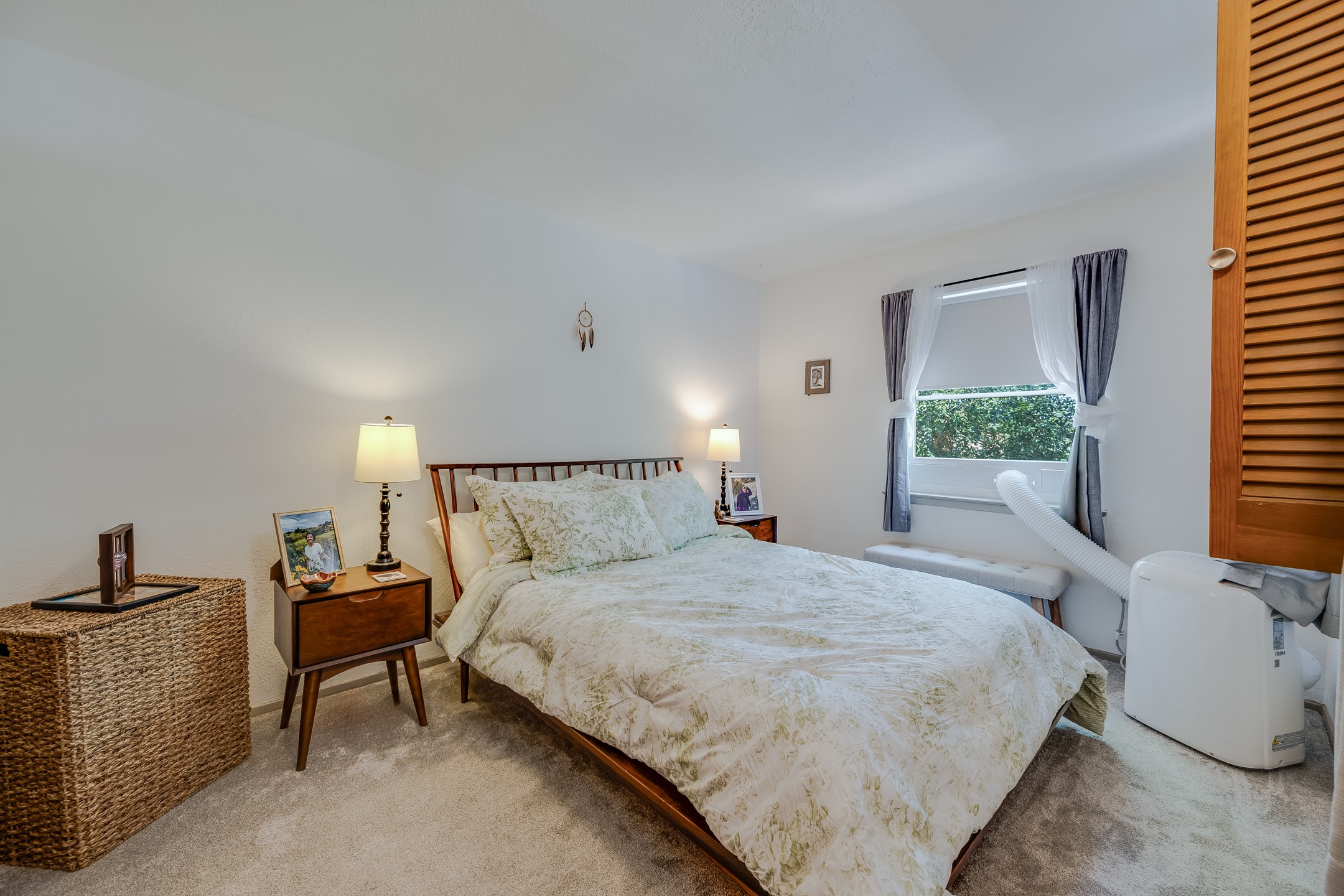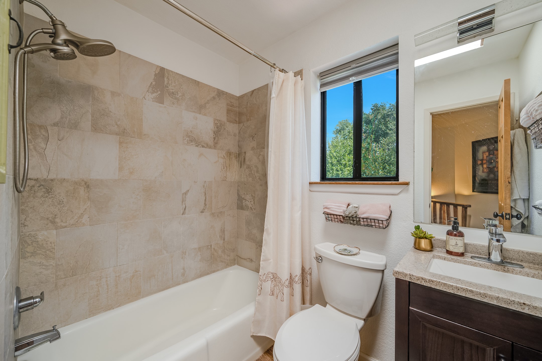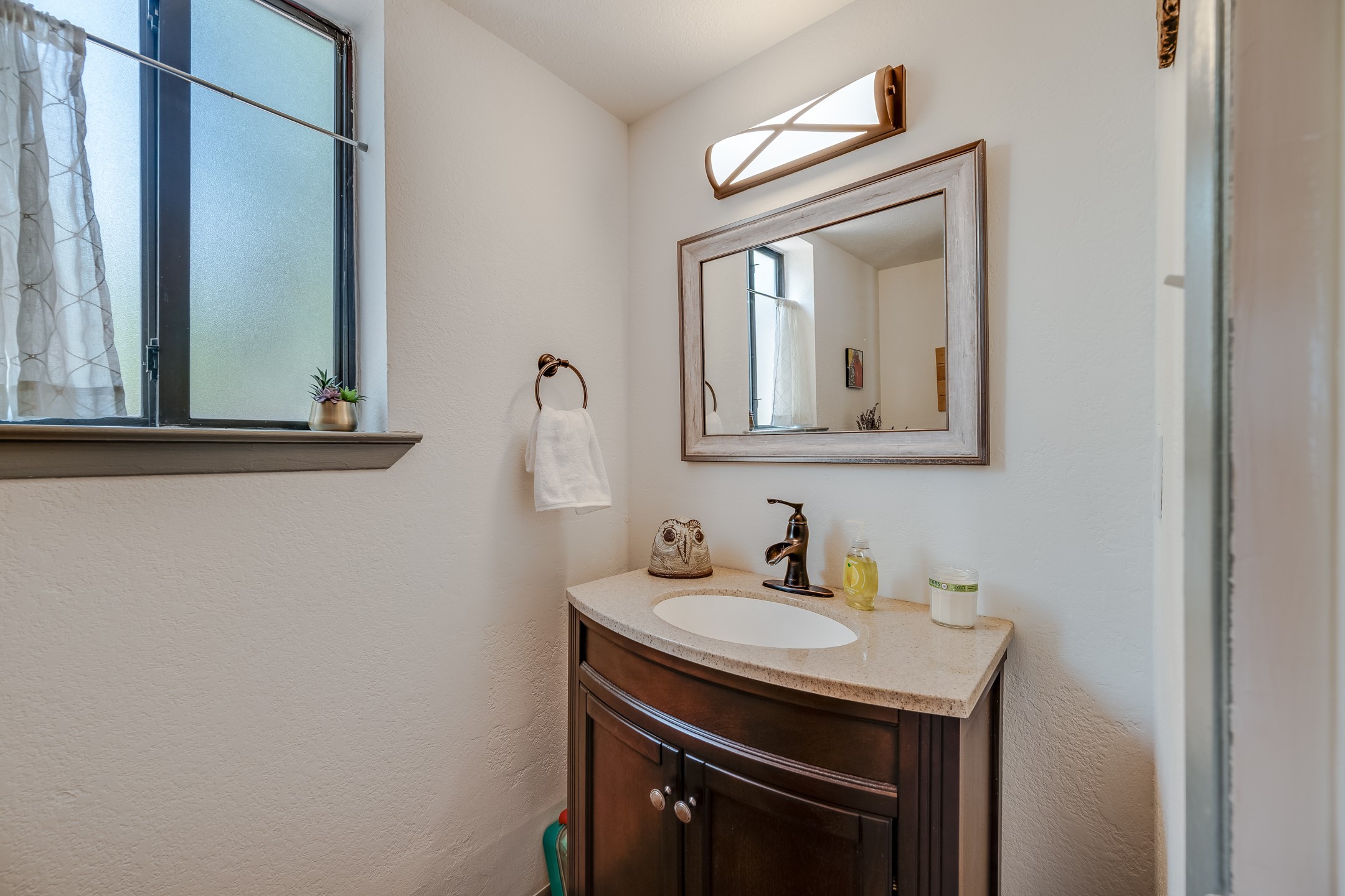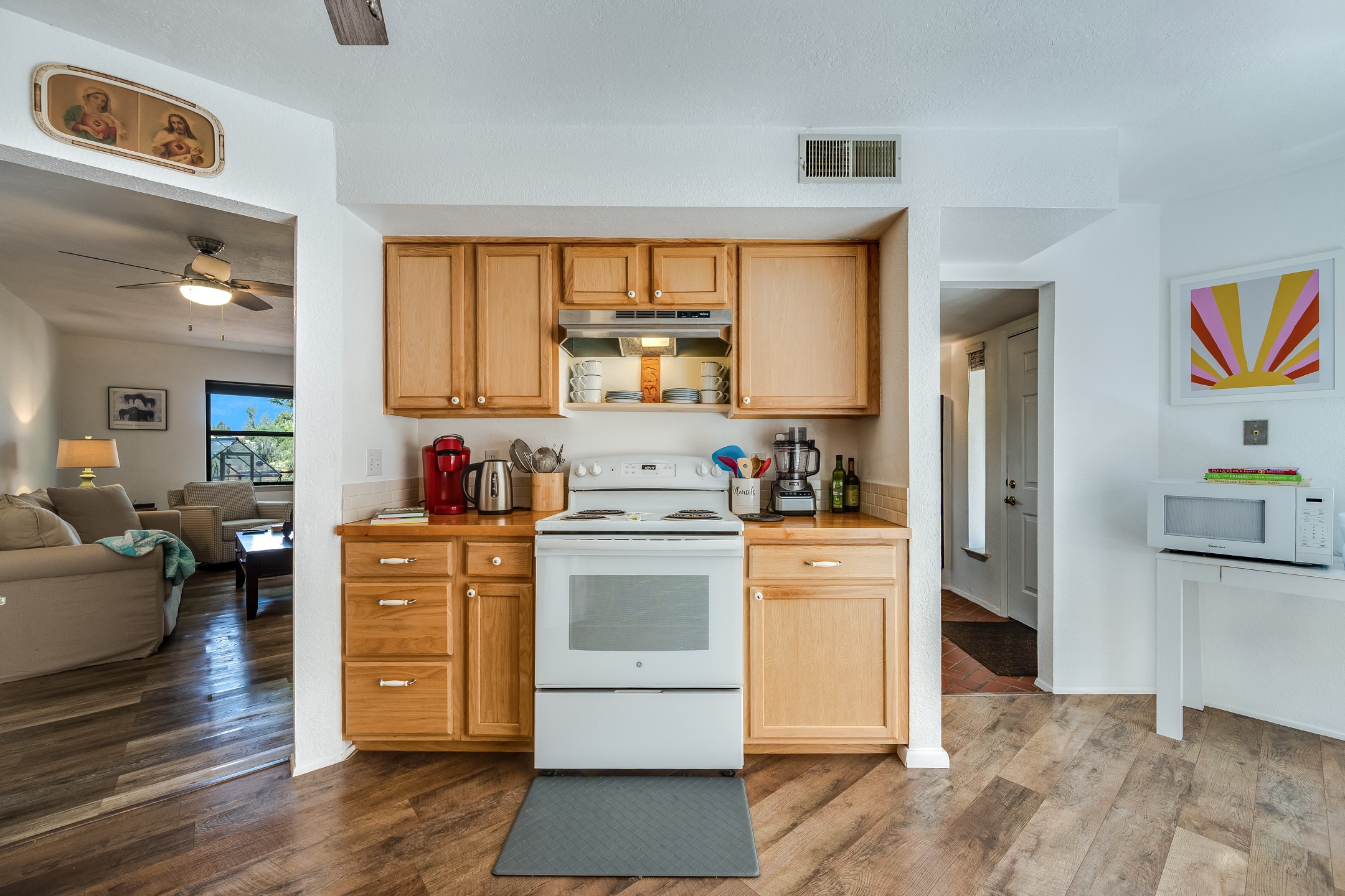 This inviting two-bedroom, two-and-a-half-bath home, located in the desirable Via Caballeros neighborhood, features 1400+/- square feet of interior space on two levels. The living room, with its soaring ceilings, abundant natural light, wood-like floors, and a charming Kiva fireplace, is warm and inviting. The spacious kitchen is appointed with wood cabinets and butcher-block countertops to add timeless appeal. Also on the main level you will find a convenient powder room, dedicated laundry room, and direct access to a 2-car garage. Upstairs, each bedroom has its own full bathroom and lots of closet space. This end unit backs onto a greenbelt, with a sublimely private wrap-around yard shaded by mature trees, with a standalone greenhouse, and xeriscaped for ease of maintenance. Local parks and amenities nearby make this an ideal starter home or investment, blending of modern updates, traditional New Mexican charm, and a central location for everyone to love.