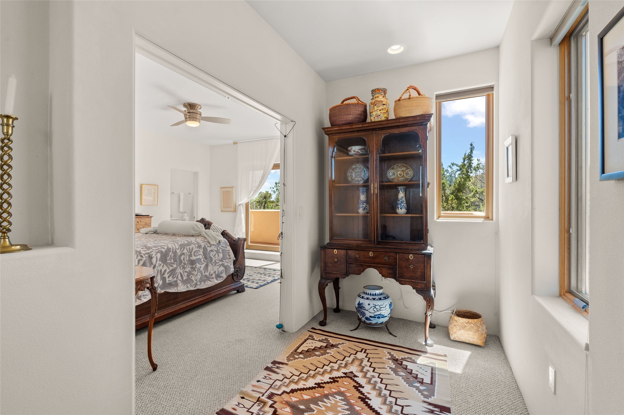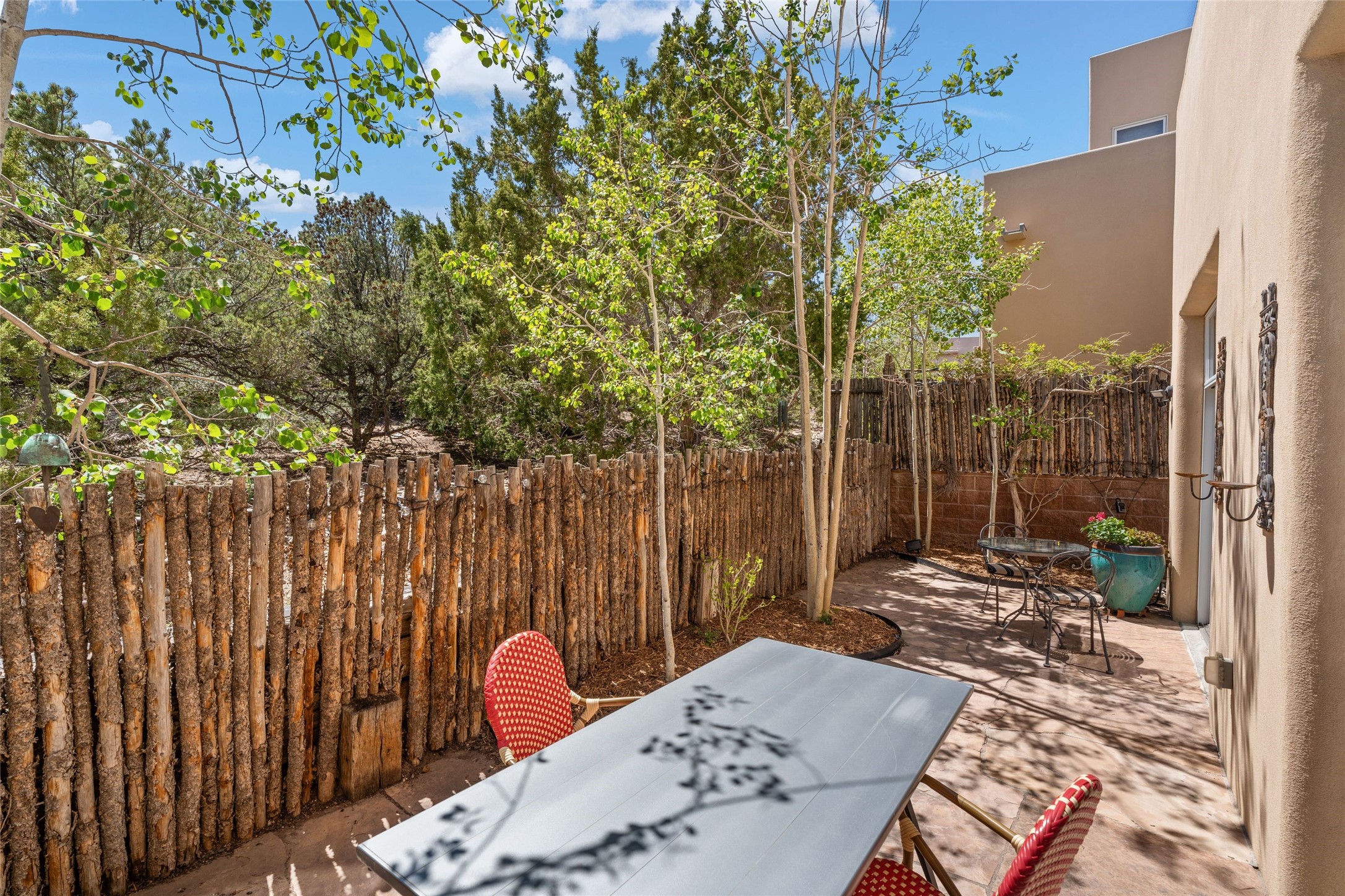Northside 3-bedroom, 2.5-bath condominium offering captivating views and a thoughtfully designed multi-level layout. The first level features a two-car garage, mechanical room, and generous storage options. Move up to the second level, where the living area includes a welcoming fireplace, providing a focal point for relaxation. The open living room and kitchen design encourages easy interaction, complemented by a convenient half bath. Enjoy access to a private patio and outdoor area, perfect for unwinding or entertaining. On the third level, discover a guest bedroom, a laundry area, an office, and a full bath. A balcony enhances this level, offering an additional outdoor retreat. The primary suite occupies the fourth level, serving as a tranquil getaway. Recent updates add to this home's charm, featuring upgraded fireplace with granite, modern lighting, ceiling fans, and practical shelving. The addition of flagstone and aspen trees enhances the outdoor environment, creating a serene atmosphere. Conveniently located, this condo is just moments away from the DeVargas Center, Frank Ortiz Dog Park, Ft. Marcy Recreation Center, and the Historic Santa Fe Plaza.