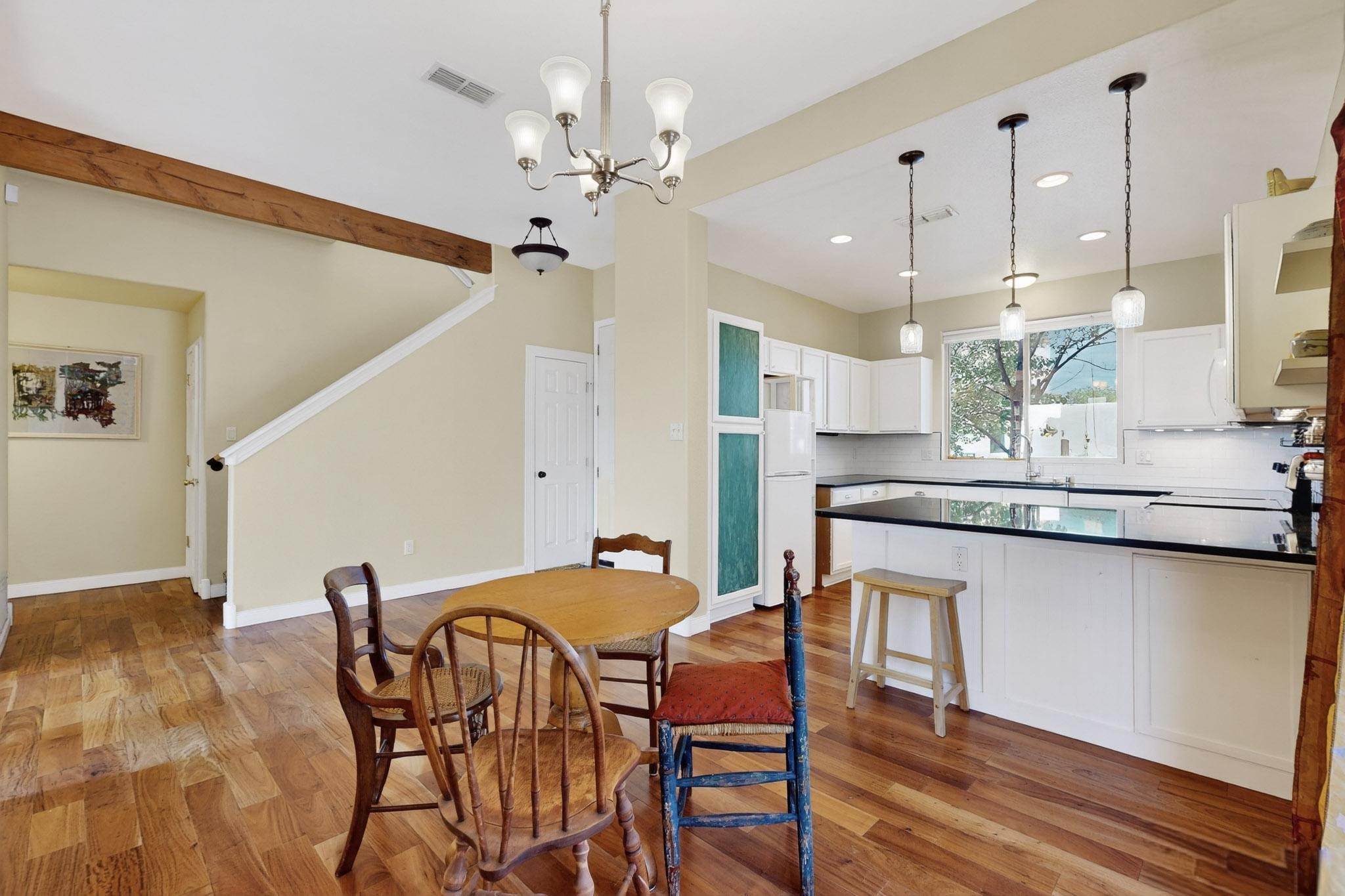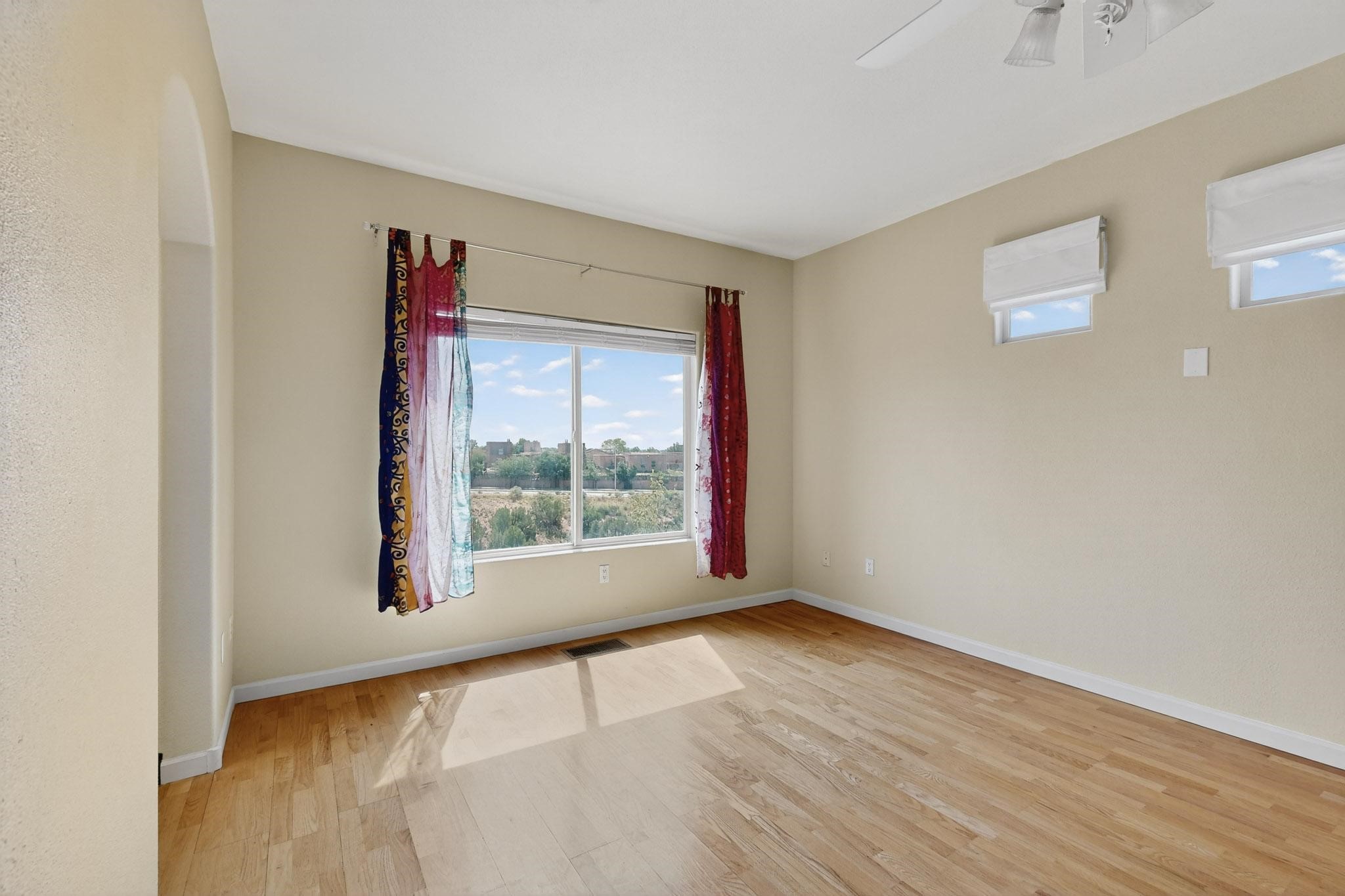 Nestled atop a serene arroyo, this exceptional property offers unparalleled convenience, mere minutes from Highway 599 and Cerrillos Road--perfect for commuters heading to Los Alamos (45 minutes) or Albuquerque (50 minutes). This location is the heart of a vibrant community, with tree-lined sidewalks and trails along Jaguar Drive, nearby schools, a public library, and the picturesque Swan Park. Plus, you can easily access historic Agua Fria Street for a quick 20-minute drive to the Railyard or Plaza in the charming heart of Santa Fe. Inside, the home welcomes you with soaring ceilings and is truly move-in ready, featuring a newer TPO roof and fresh exterior stucco. The original garage has been transformed into a stunning Artist Studio, a versatile space that can easily be reverted back or used as additional flex space for your hobbies or as a family room. The ground floor seamlessly opens onto a spacious outdoor patio, surrounded by mature trees, creating an ideal setting for entertaining or peace and relaxation. The beautifully upgraded kitchen is perfect for culinary enthusiasts and entertaining, while the master suite upstairs offers a spa tub and a private outdoor deck--your sanctuary for morning yoga or evening stargazing. With a drip irrigation system in place to maintain lush, green grounds and keep the house cool, this property truly embodies comfort and convenience. Don't miss your chance to call this beautiful home your own!