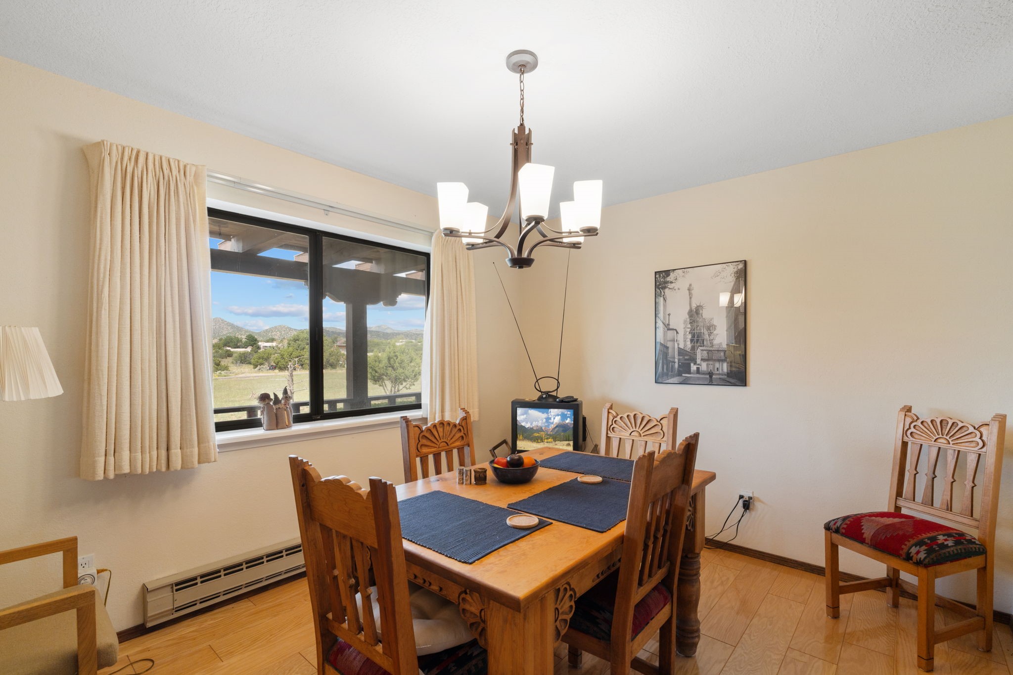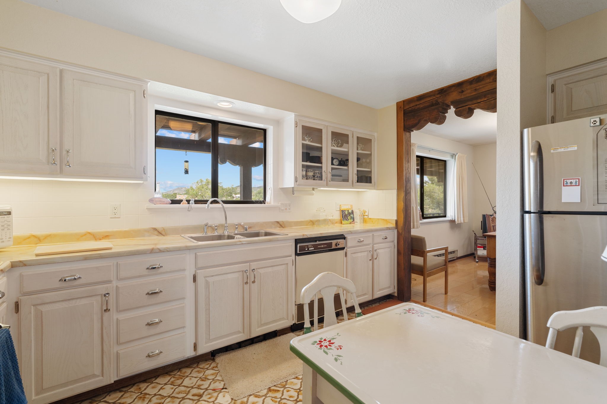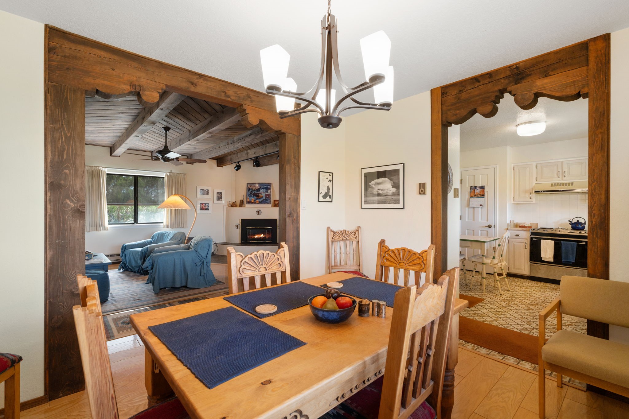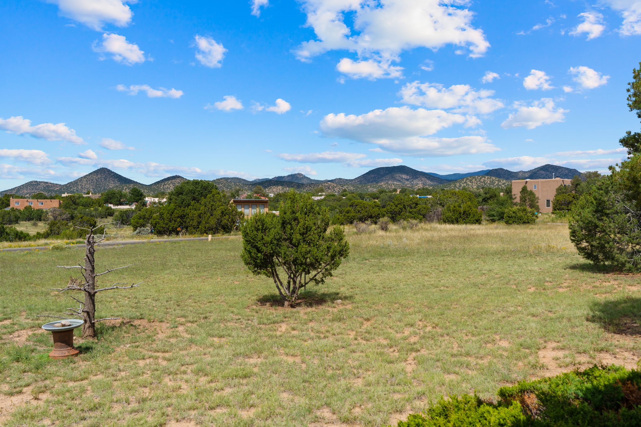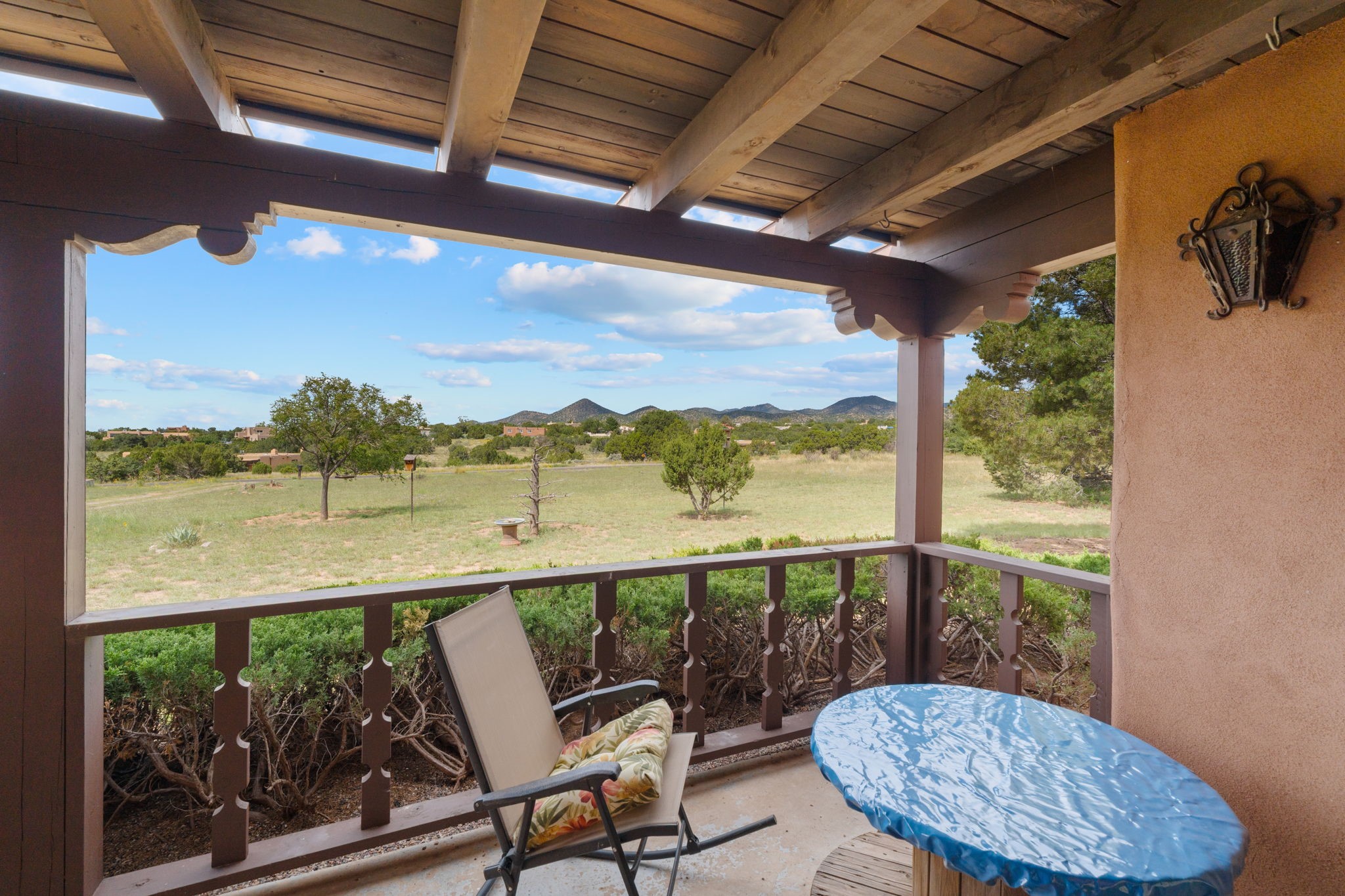 Imagine relaxing under a long portal, watching the birds and facing panoramic foothill views of the Sangre de Cristo mountains. This is the entrance to 77 Moya Rd, in the Eldorado subdivision, just minutes from Santa Fe. This 3 bedroom, 2 bath home is over 1600 square feet, with a living room highlighted by beamed, wooden ceilings, wood floors, and a kiva fireplace with gas insert. New pleated shades highlight the windows in most of the home. There is direct access to the covered portal in the rear fenced yard. The kitchen is light and pleasant with re-faced and painted cabinets, Stainless Steel Appliances, (new Kitchen aid stove and Bosch dishwasher), and flows to the adjacent dining room. The bedrooms have ample closet space and the baths have colorful tile throughout. The home has a one-car finished garage. Situated on a large 1.45 acre view lot, the location is very close to the school, library, senior center, and the community pool. The extensive hike/bike trail is off of the back yard, an local restaurants and shopping are nearby.