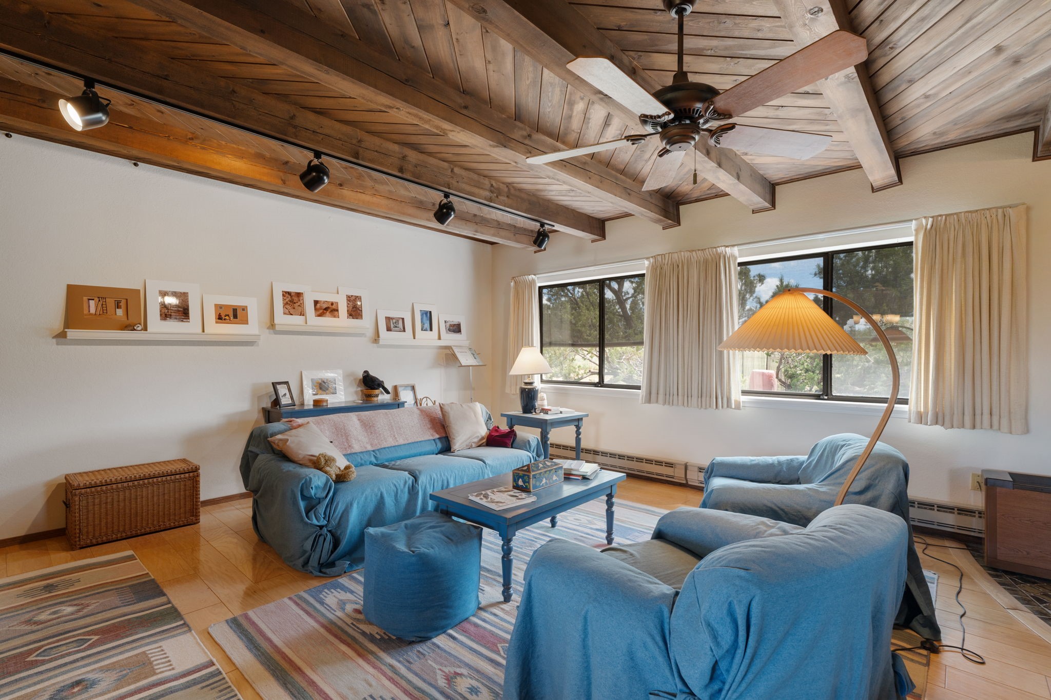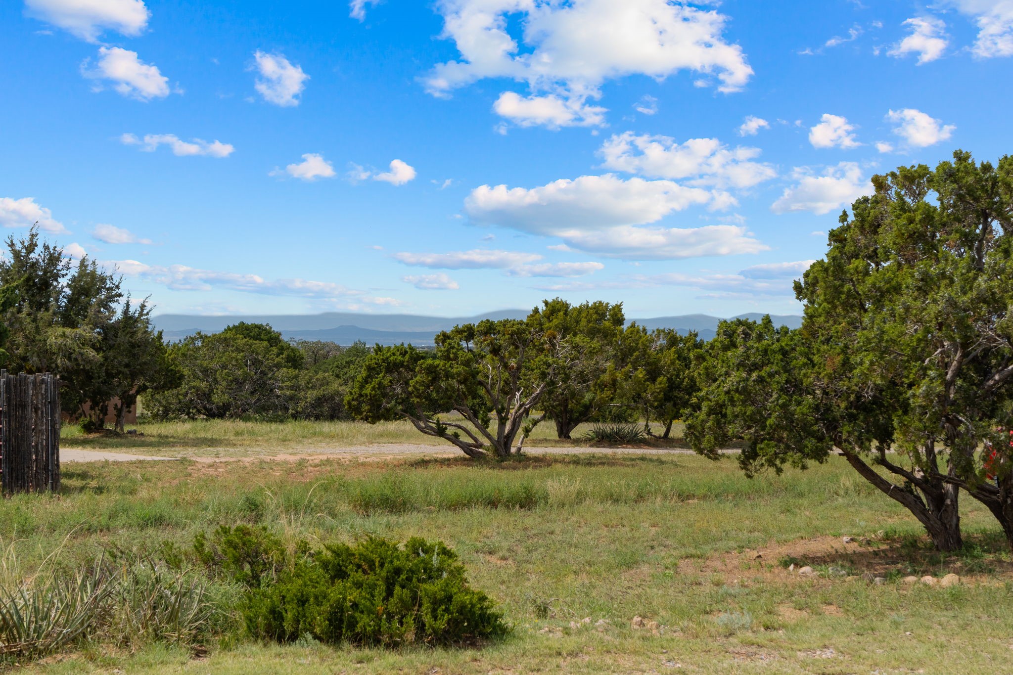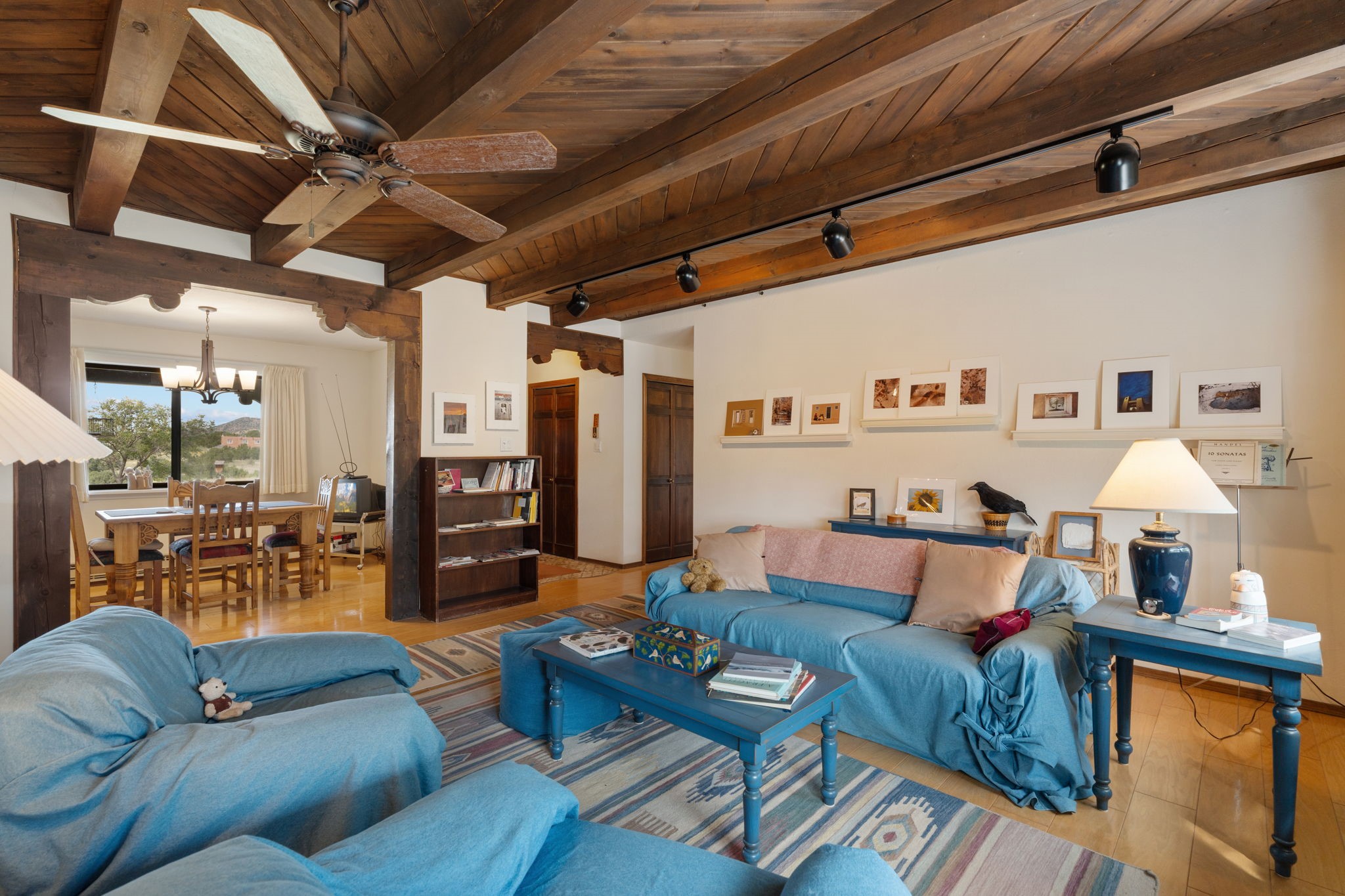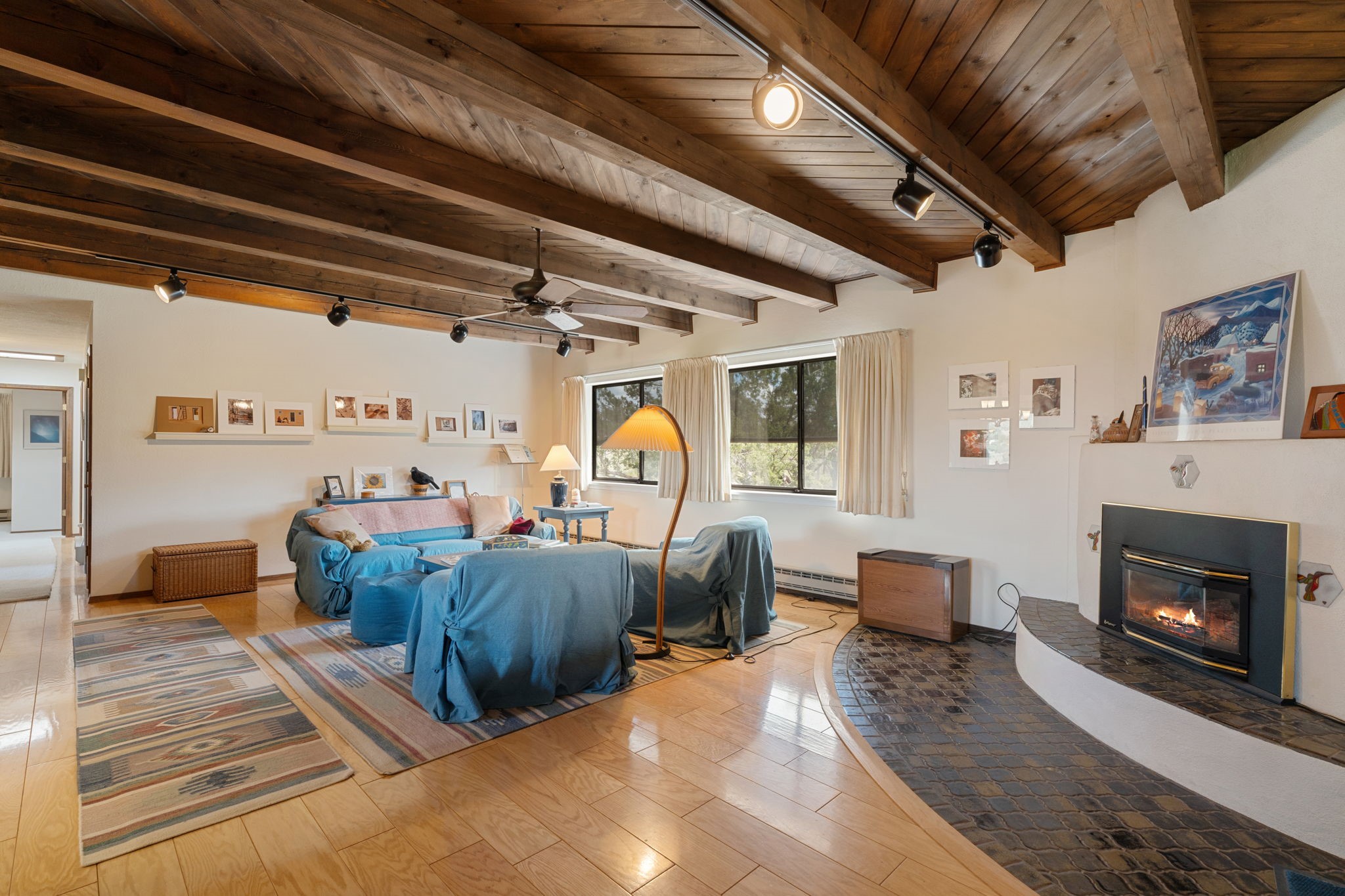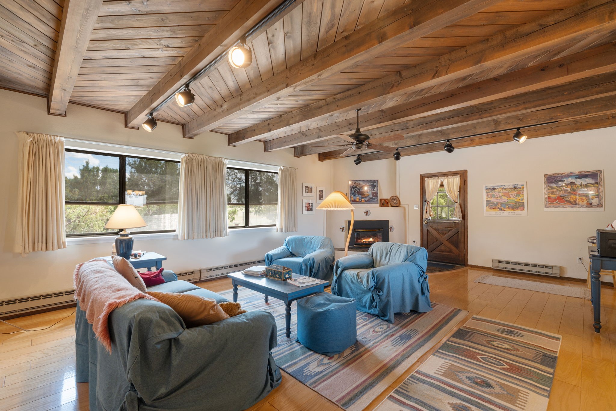 Imagine relaxing under a long portal, watching the birds and facing panoramic foothill views of the Sangre de Cristo mountains. This is the entrance to 77 Moya Rd, in the Eldorado subdivision, just minutes from Santa Fe. This 3 bedroom, 2 bath home is over 1600 square feet, with a living room highlighted by beamed, wooden ceilings, wood floors, and a kiva fireplace with gas insert. New pleated shades highlight the windows in most of the home. There is direct access to the covered portal in the rear fenced yard. The kitchen is light and pleasant with re-faced and painted cabinets, Stainless Steel Appliances, (new Kitchen aid stove and Bosch dishwasher), and flows to the adjacent dining room. The bedrooms have ample closet space and the baths have colorful tile throughout. The home has a one-car finished garage. Situated on a large 1.45 acre view lot, the location is very close to the school, library, senior center, and the community pool. The extensive hike/bike trail is off of the back yard, an local restaurants and shopping are nearby.
