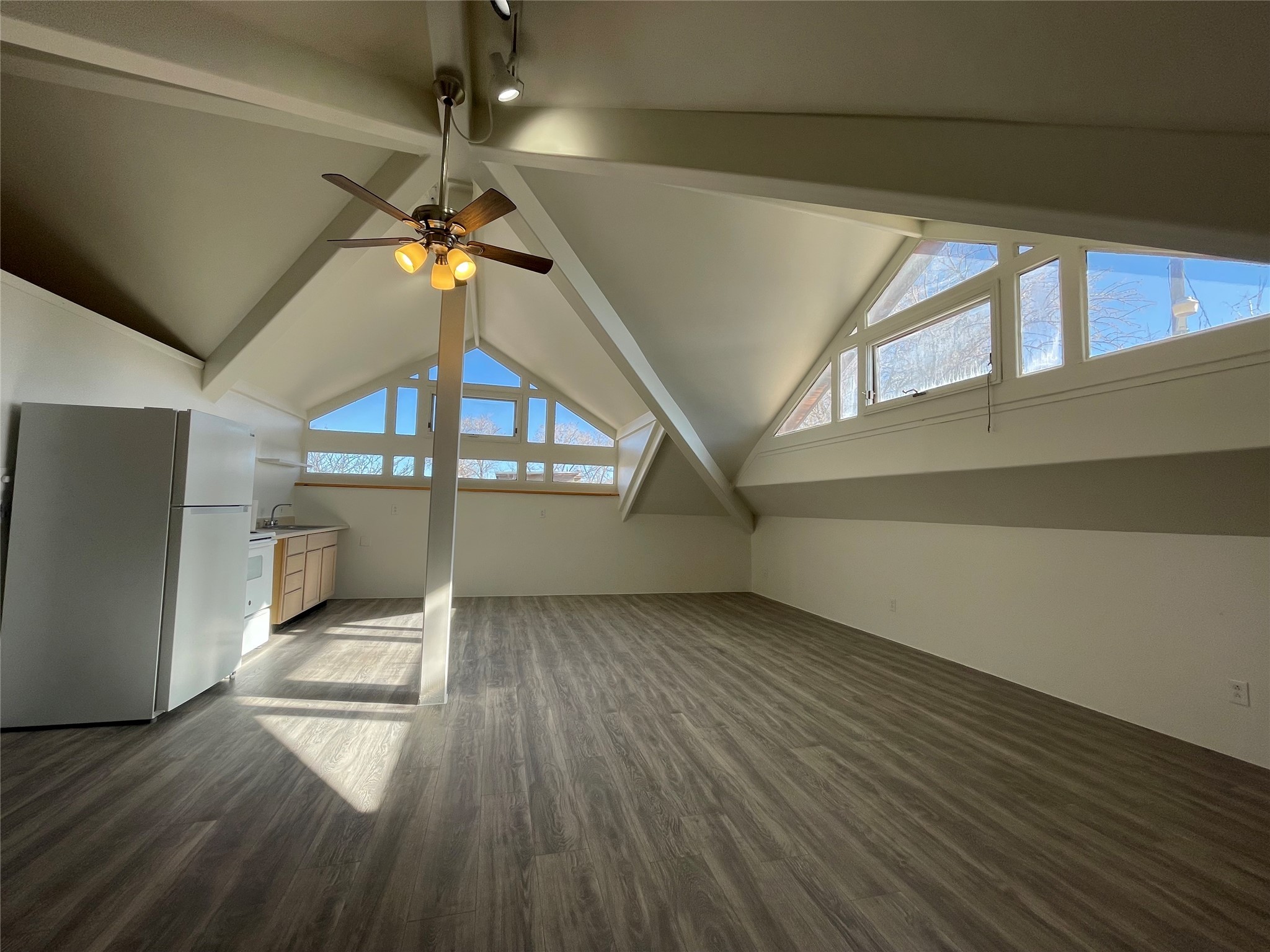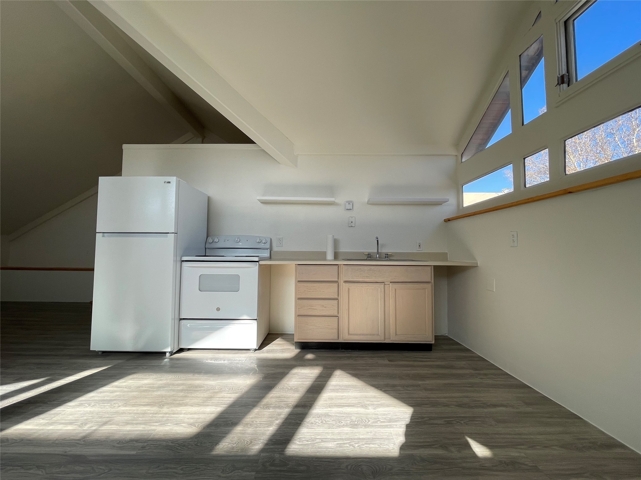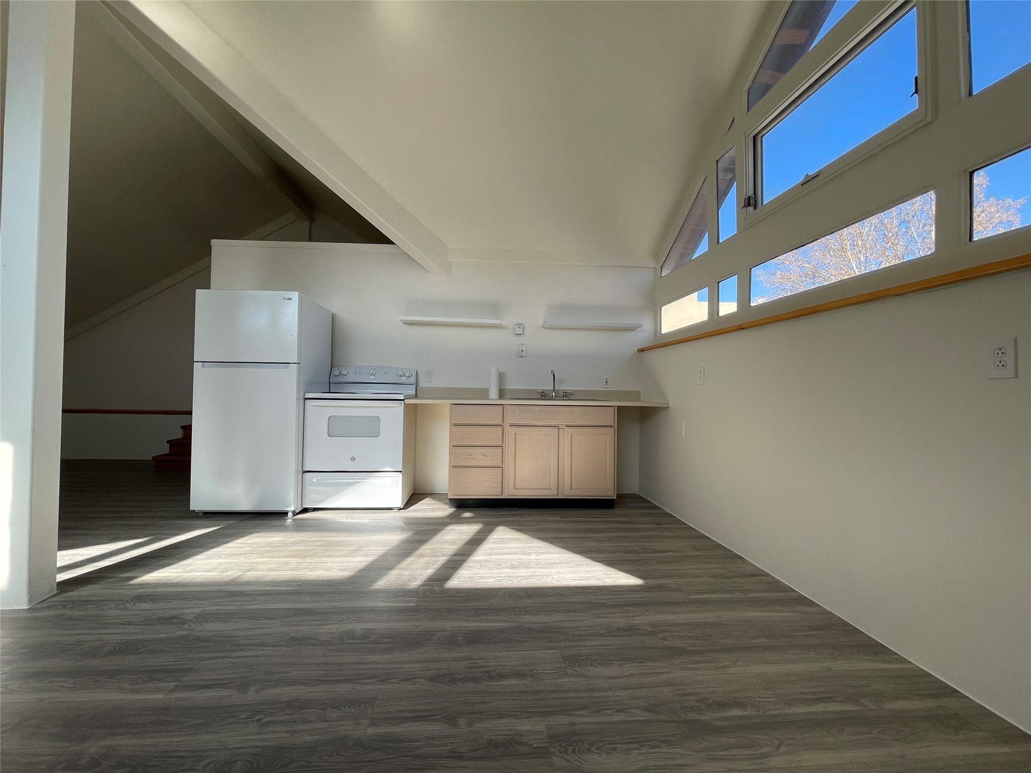 Discover this unique and bright 600 sq ft mixed-use studio, perfect for a live/work space. The studio's standout features are the soaring vaulted ceilings and a stunning array of large, angular windows that flood the space with natural light, creating a warm and inviting atmosphere.The open layout includes a functional kitchenette with a full-size refrigerator, electric stove, and generous counter space for your needs. The sleek, durable wood-like flooring provides a clean, modern feel throughout the main area. A stylish ceiling fan with integrated lighting helps to keep the space comfortable year-round.This studio also includes a private bathroom featuring a pedestal sink and a separate walk-in shower. Situated in a convenient location, this property offers a great blend of comfort and functionality.Key Features:Bright and Open: Expansive windows and vaulted ceilings create a spacious, sunlit environment.Efficient Kitchenette: Equipped with a full-size fridge and electric stove.Modern Touches: Wood-like flooring and a ceiling fan with track lighting.Private Bathroom: Includes a pedestal sink, toilet, and walk-in shower.Flexible Space: Ideal for a creative studio, home office, or a comfortable living area.This space is a must-see for anyone seeking a versatile and light-filled studio. Contact us to schedule a viewing!