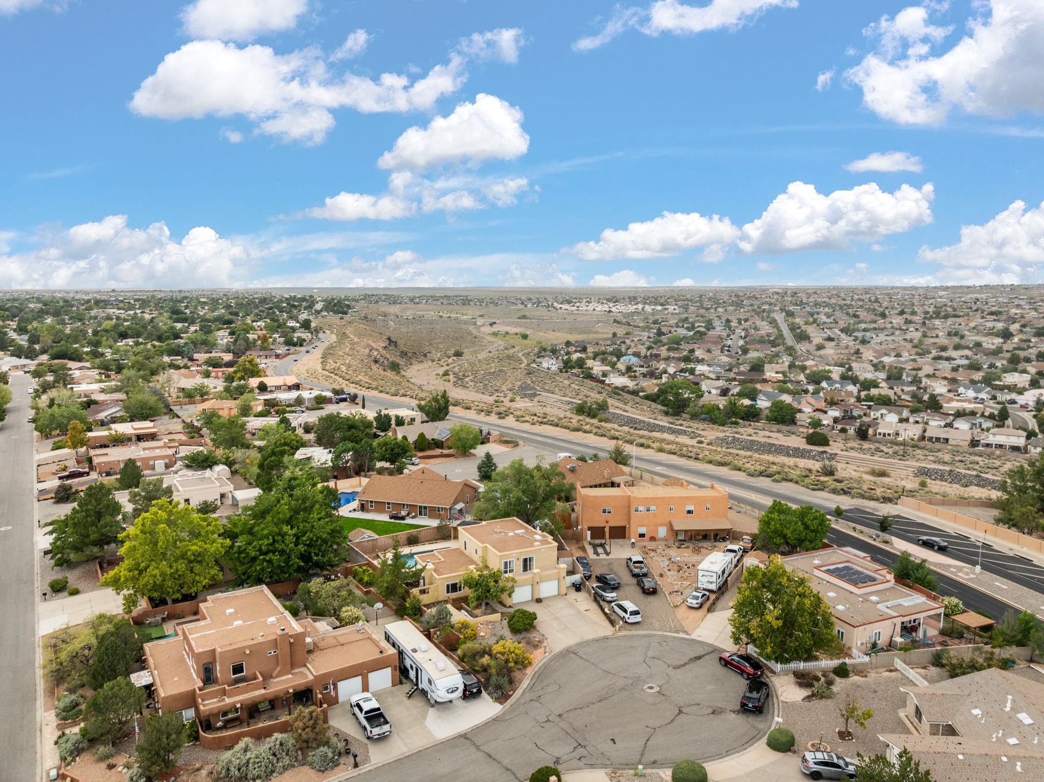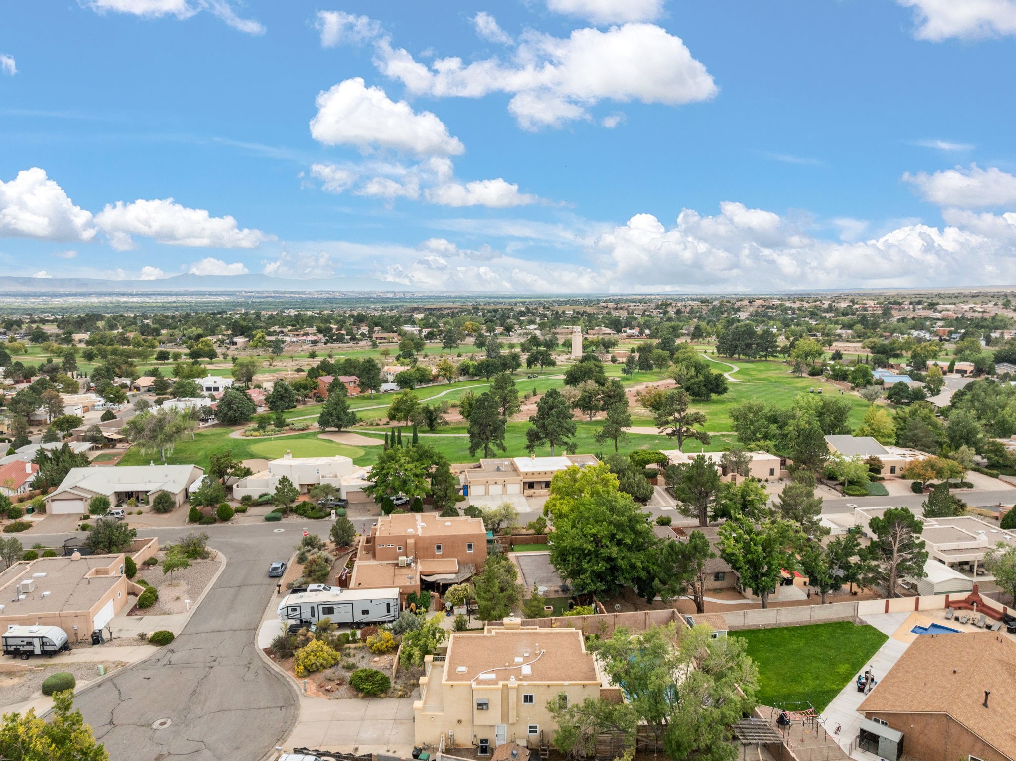 Well loved two story home with an in ground pool 40*18 in Length and 4ft-8ft depth. Updated, new floors, spacious living areas quality living, defined yet open rooms that access the outside pool/ patio area. Large study with built in's, half bath, all on main floor. Upstairs newly carpeted with two large bedrooms, hall bath, primary bedroom with Sandia Mountains views welcoming you every morning. Access to east deck. Fabulous! Situated on a private cul de sac. Green house to enjoy all year long, and dual CFA unit for the second level with Refrigerated air. A wonderful place to call home.