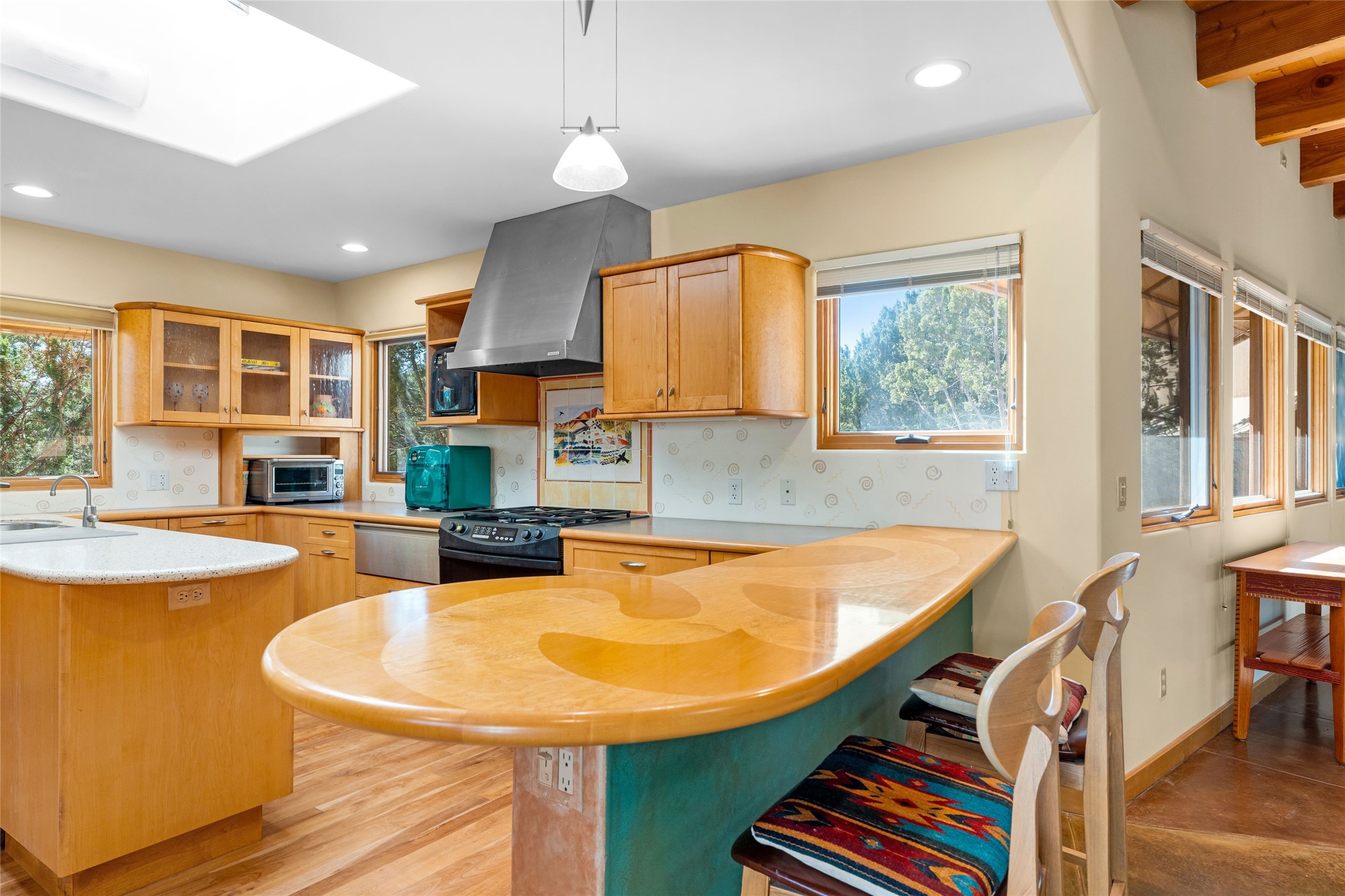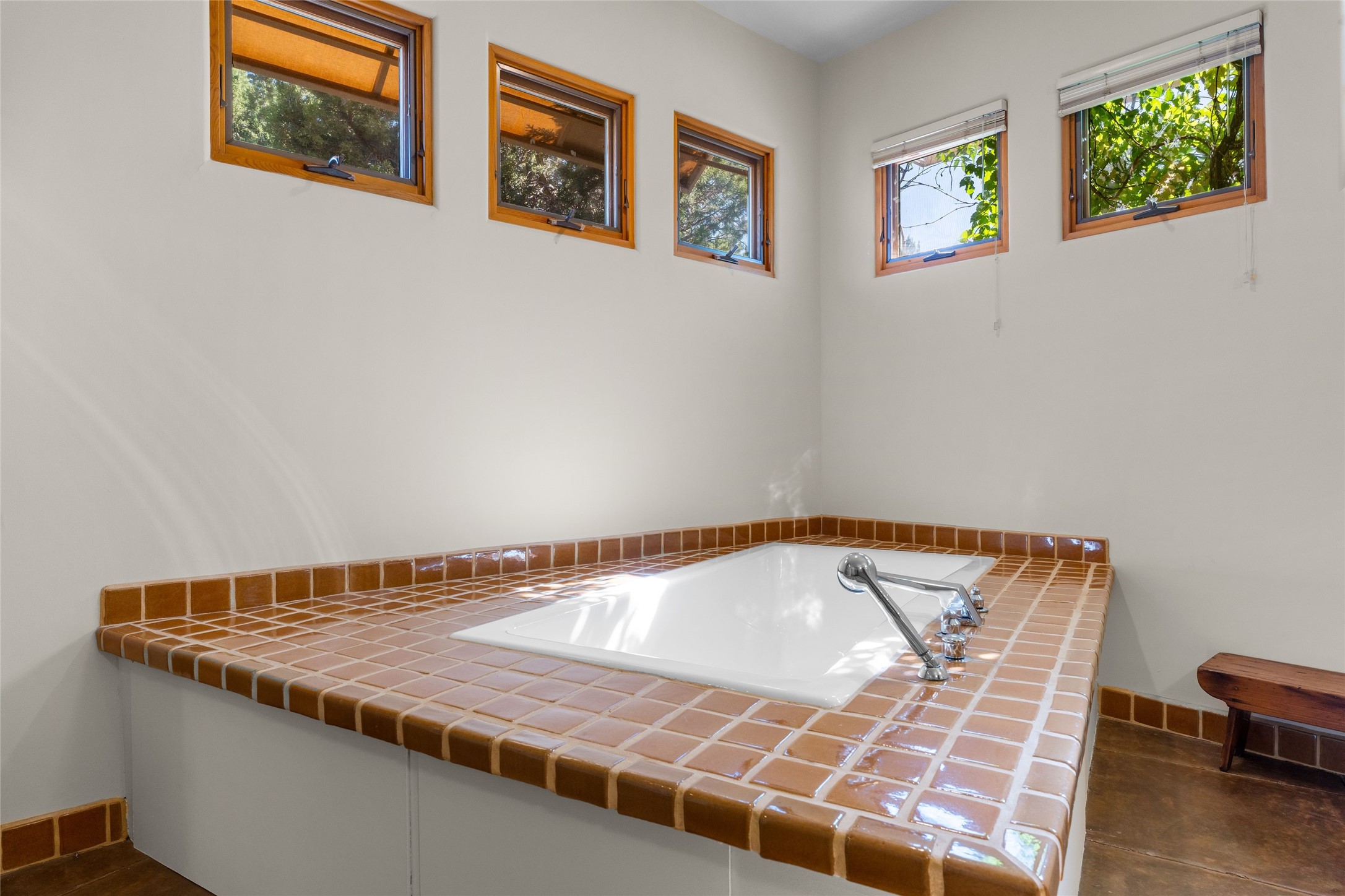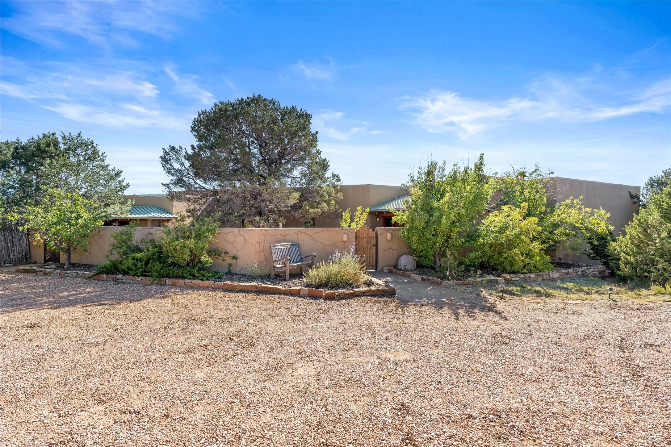 Offered for the first time since its construction in 1997 by renowed builder J. Koledin, this custom single-level residence blends soft contemporary design with mid-century modern influences and New Mexico charm in a peaceful, private setting. Nestled on approximately three acres at the end of a paved cul-de-sac within the exclusive, gated, Belicia Estates, the home offers both tranquility and convenient access to Santa Fe.A walled and gated patio entry opens to a warm and inviting living area, highlighed by a custom fireplace and striking wood-beamed ceilings. The kitchen features cherry wood flooring, custom cabinetry, and artful wall tile, while colored concrete floors with radiant heating flow throughout the rest of the home.The floor plan provides excellent bedroom separation, a dedicated office adjacent to the primary suite, private studio, laundry room with porcelain sink, plentiful cabinetry. A detached open-air structure near the rear courtyard serves as a serene retreat-perfect for yoga, exercise, or creative purcuits.Additional features include an oversized two-car garage with ample parking nearby.Set within a private, conservation-minded community of just 44 homesites, this distinctive property offers sweeping mountain views, exceptional privacy, and effortless proximity to downtown Santa Fe.