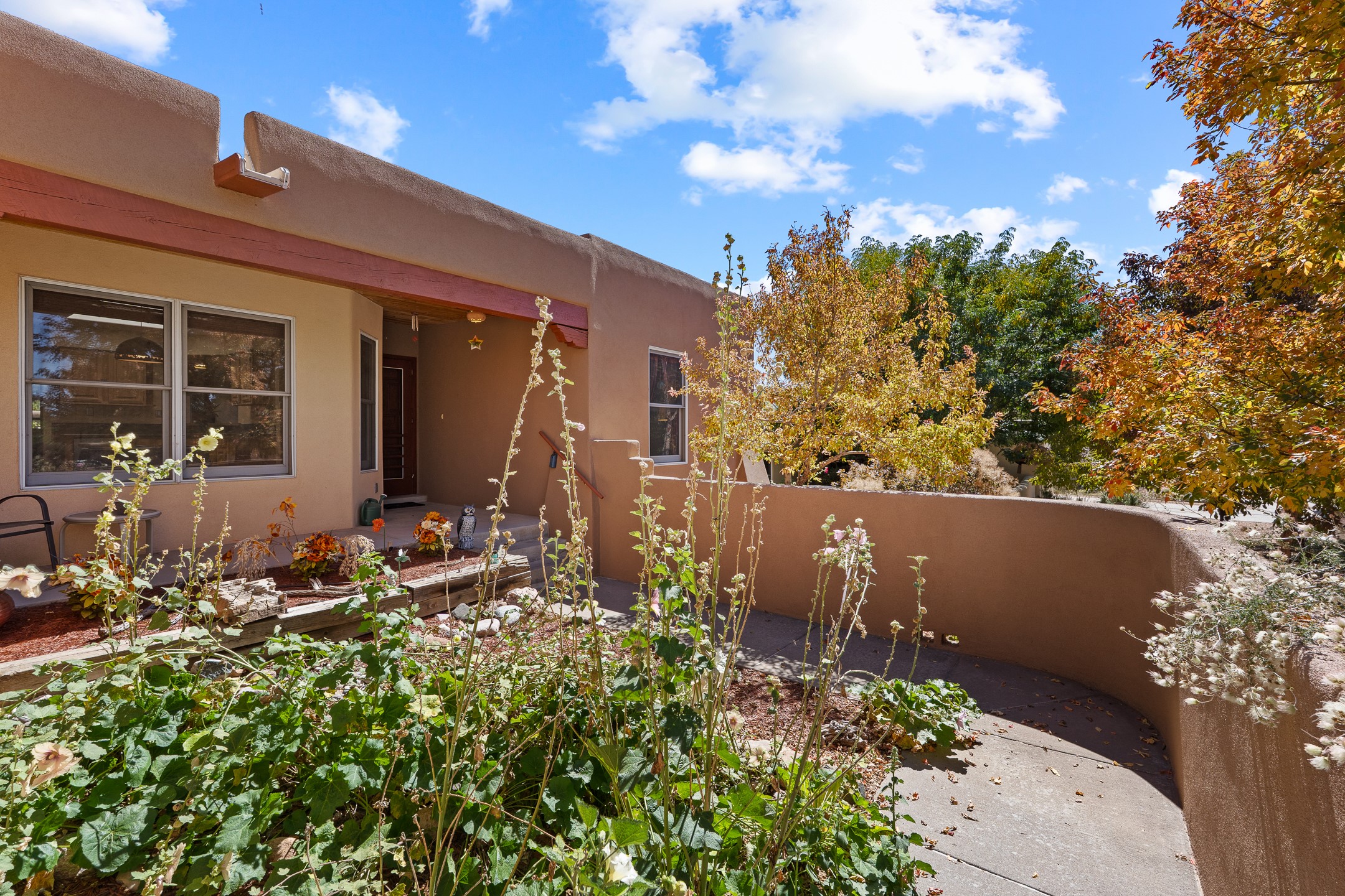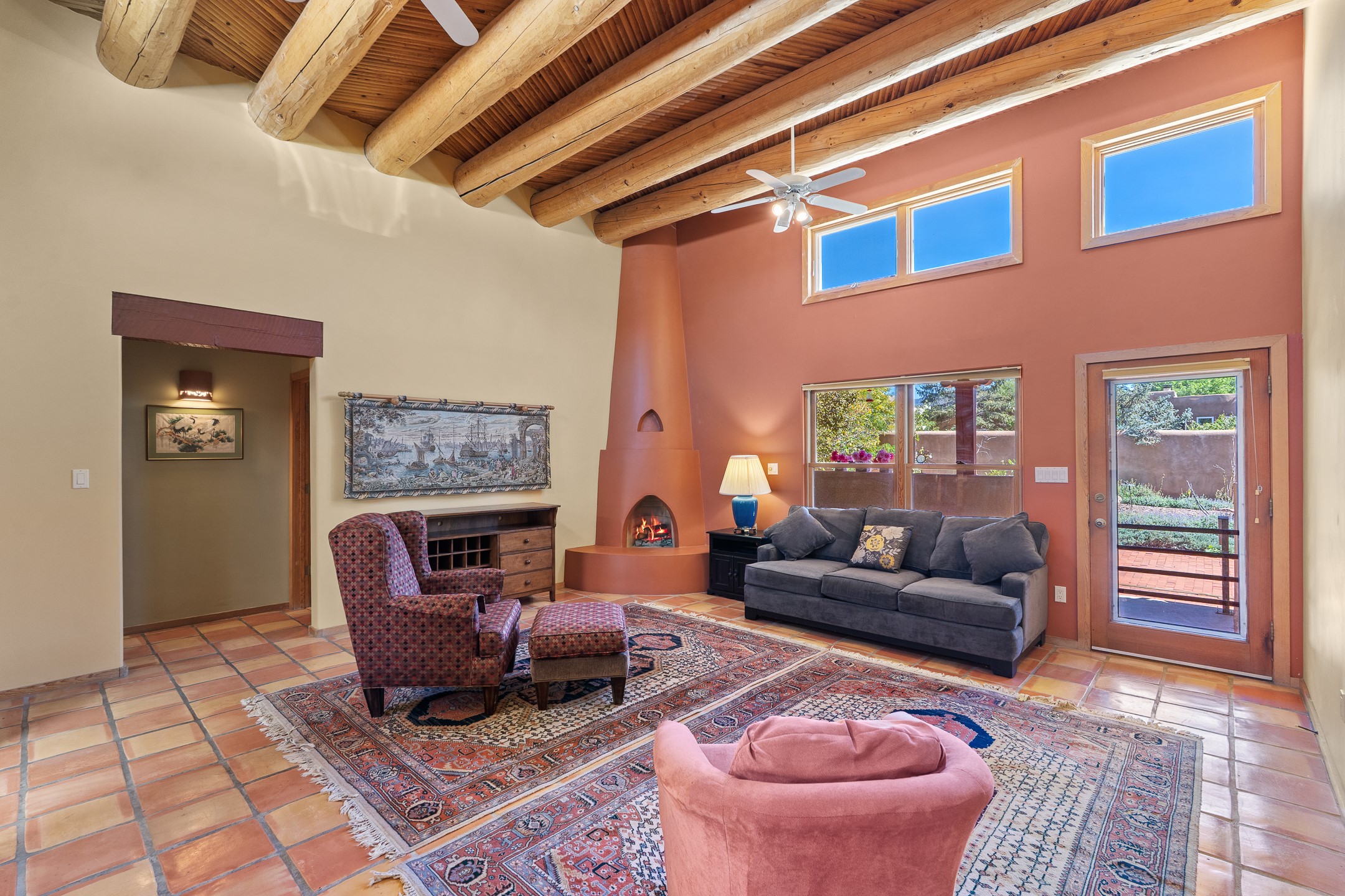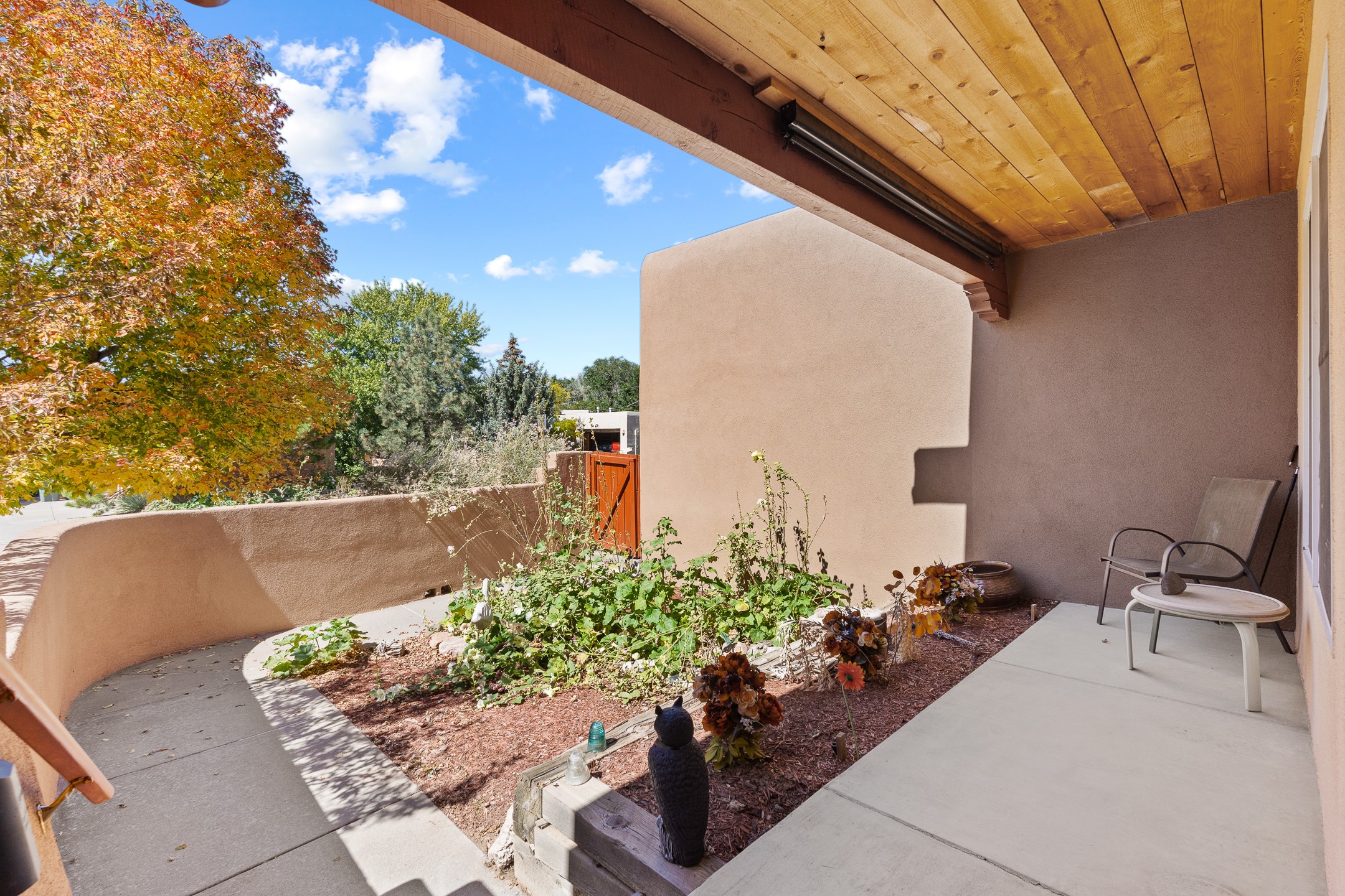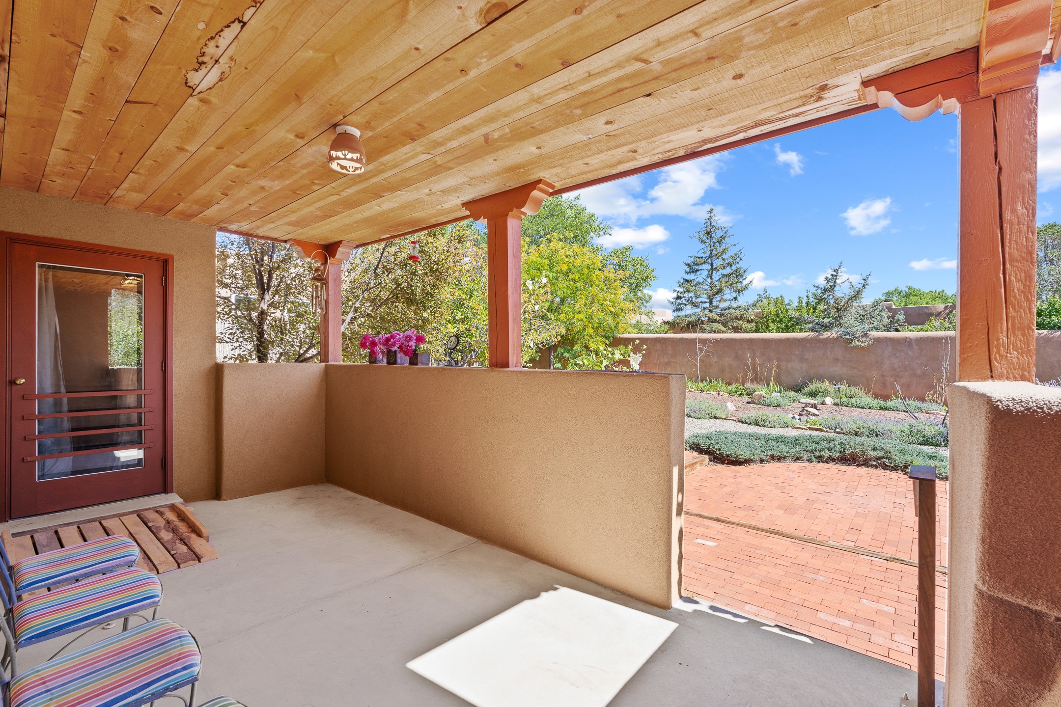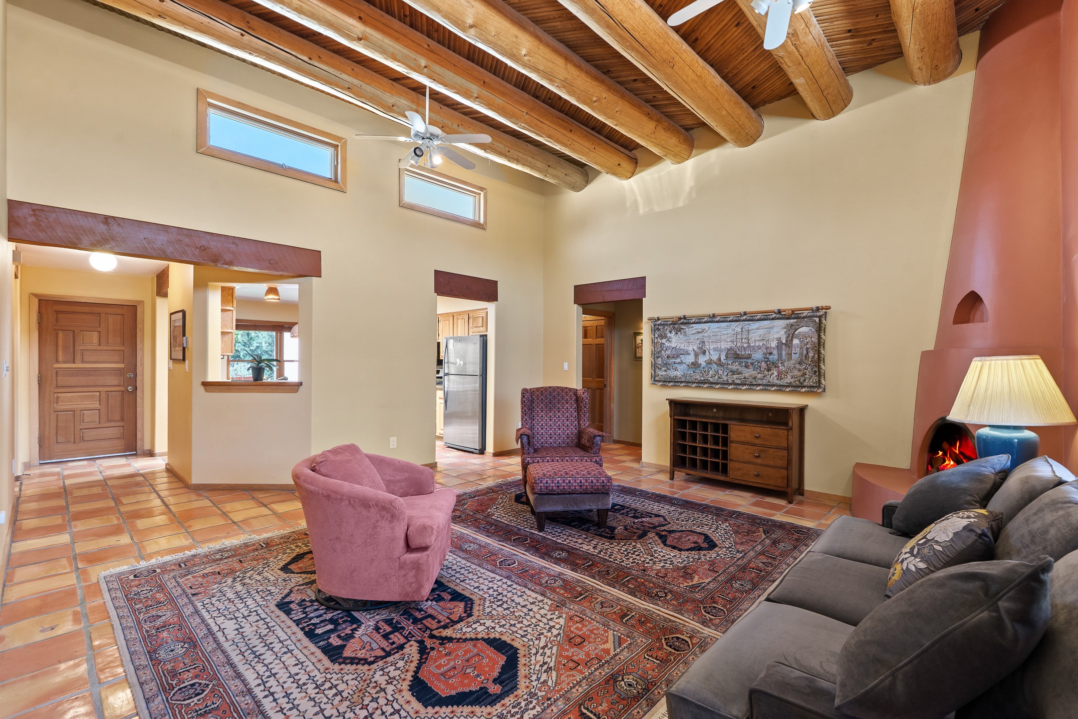 Charming Santa Fe-Style Retreat in a Prime Central Location. This beautifully maintained single-story home blends timeless Southwestern charm with modern comfort. Nestled in a peaceful, centrally located neighborhood, it offers the perfect balance of city convenience and tranquil living. Step inside to discover a light-filled interior featuring beamed living area with a walk out, traditional kiva fireplace, and Saltillo tile floors. The kitchen is both stylish and functional, boasting quartzite countertops, newer appliances, ample cabinet space. The spacious primary suite includes a walk out plus a generous walk-in closet, while two additional bedrooms offer versatility for guests, office space, or hobbies. Finished direct access two car garage. Outside, you'll find a beautiful, mature, landscaped yard that's fully private and perfect for relaxing or entertaining. The walled portal provides a serene outdoor living area in an ideal setting for enjoying Santa Fe's beautiful weather. Close to shopping, schools, medical facilities, and restaurants, this pristine property offers an exceptional opportunity to enjoy the best of Santa Fe living.