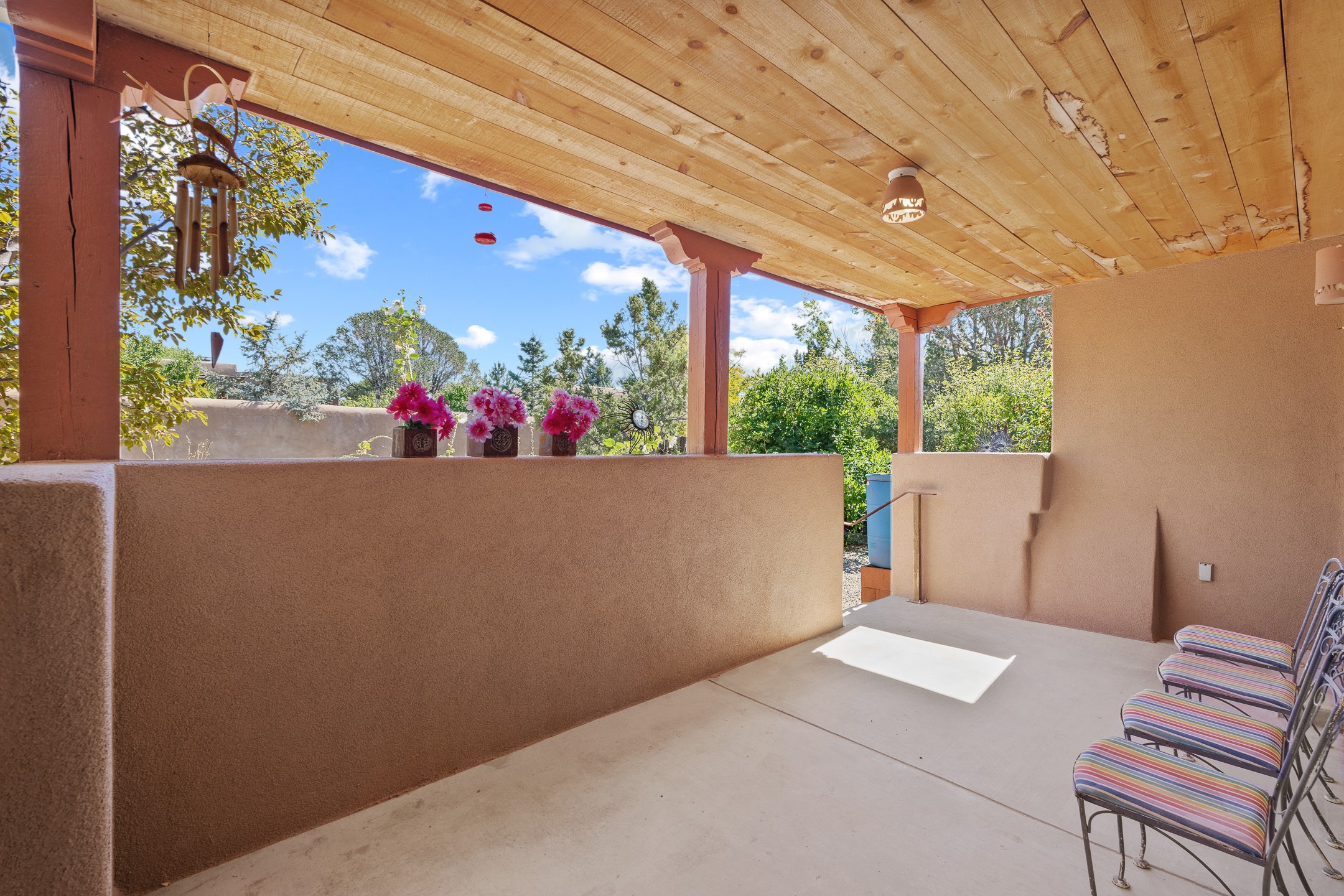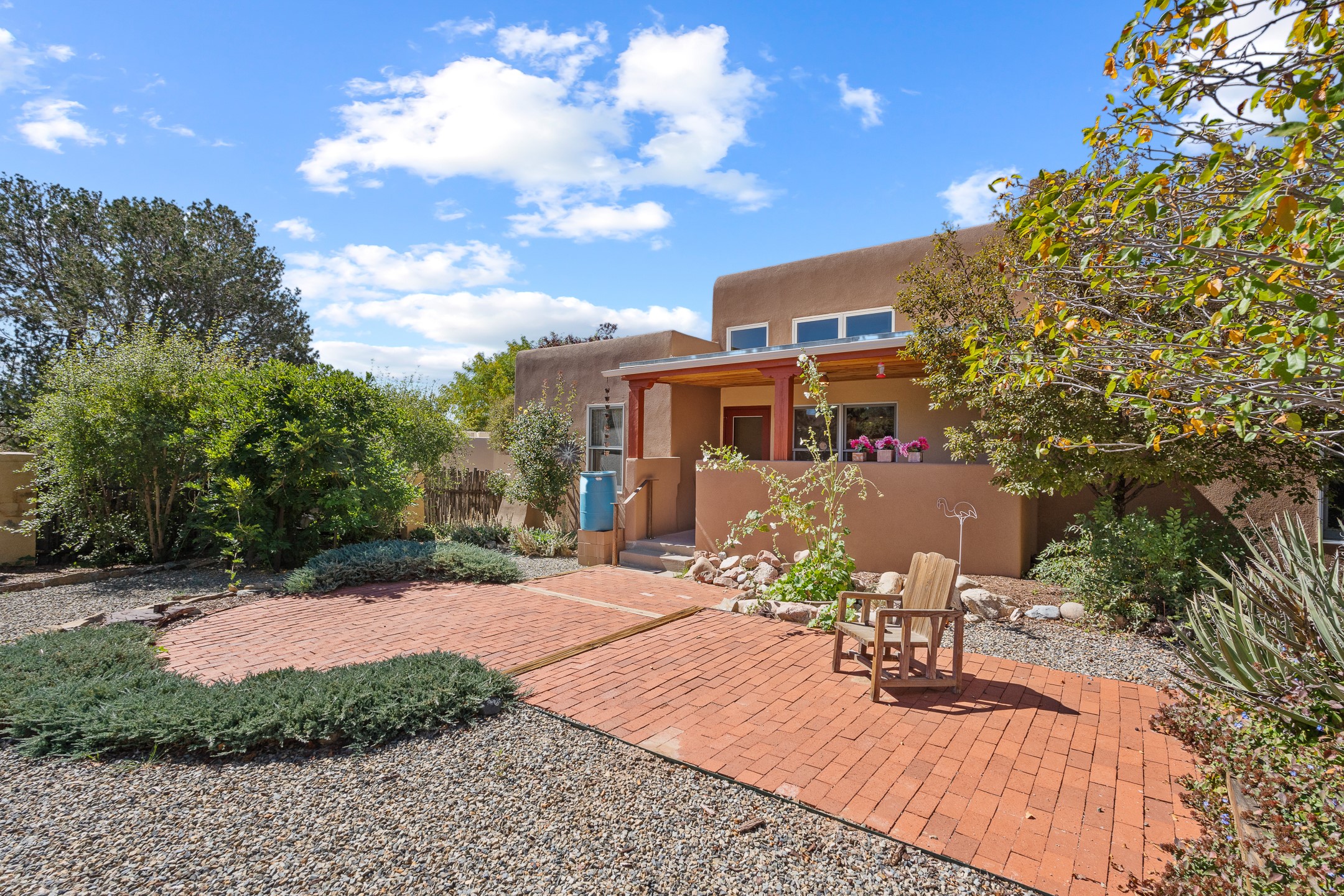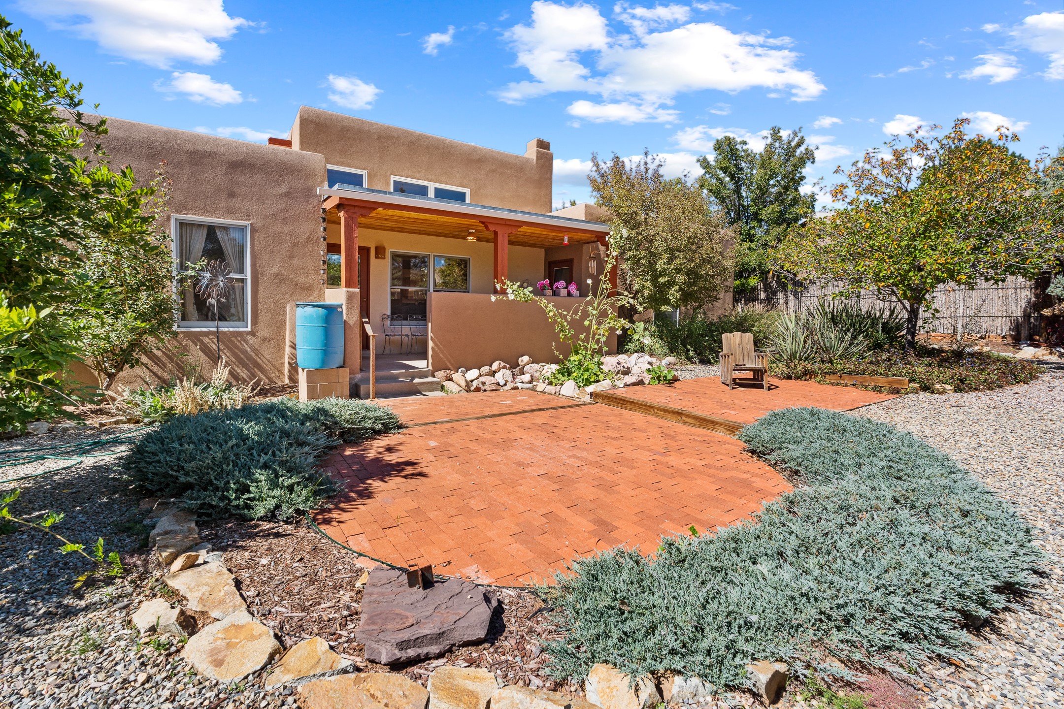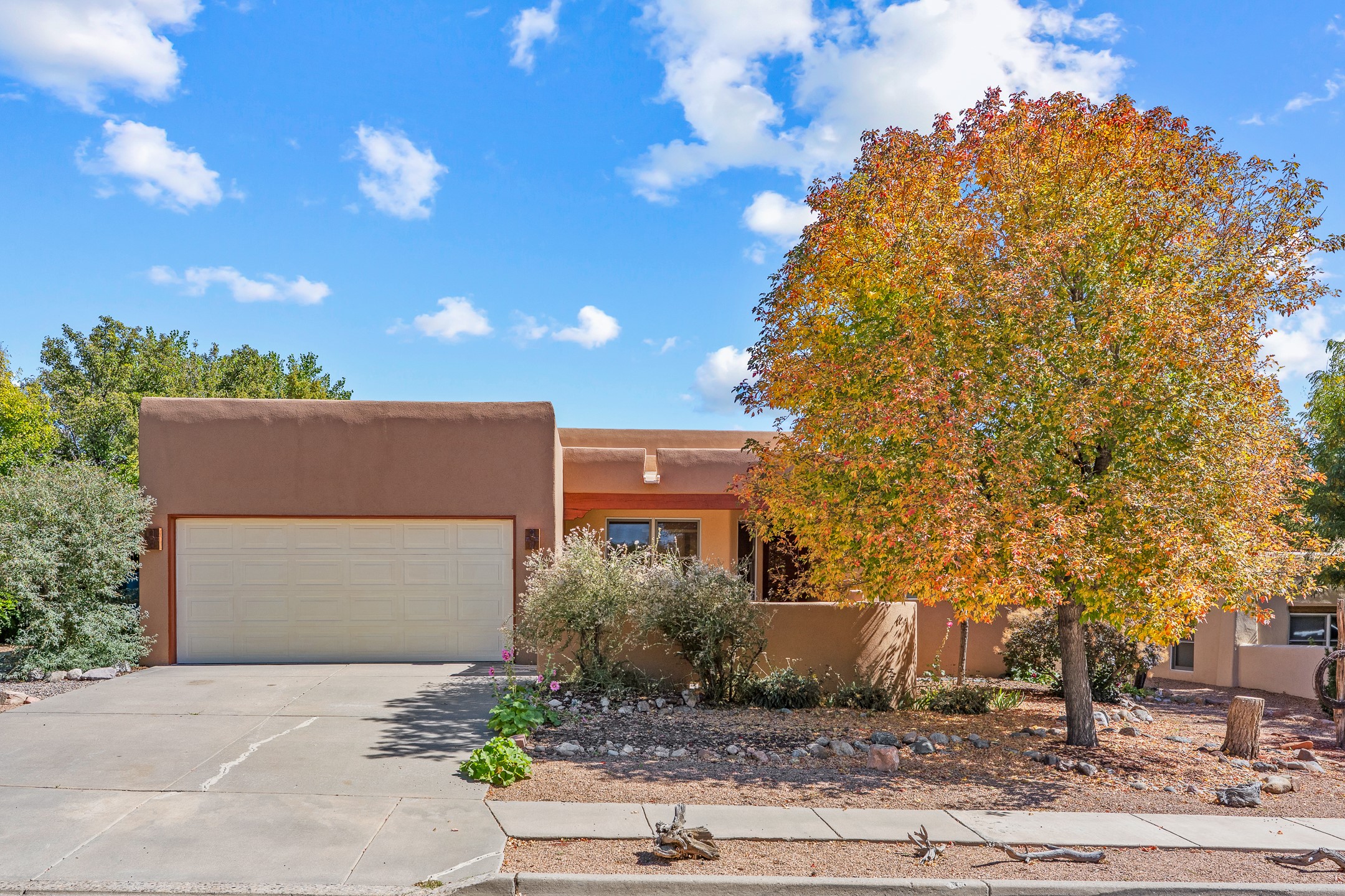 Charming Santa Fe-Style Retreat in a Prime Central Location. This beautifully maintained single-story home blends timeless Southwestern charm with modern comfort. Nestled in a peaceful, centrally located neighborhood, it offers the perfect balance of city convenience and tranquil living. Step inside to discover a light-filled interior featuring beamed living area with a walk out, traditional kiva fireplace, and Saltillo tile floors. The kitchen is both stylish and functional, boasting quartzite countertops, newer appliances, ample cabinet space. The spacious primary suite includes a walk out plus a generous walk-in closet, while two additional bedrooms offer versatility for guests, office space, or hobbies. Finished direct access two car garage. Outside, you'll find a beautiful, mature, landscaped yard that's fully private and perfect for relaxing or entertaining. The walled portal provides a serene outdoor living area in an ideal setting for enjoying Santa Fe's beautiful weather. Close to shopping, schools, medical facilities, and restaurants, this pristine property offers an exceptional opportunity to enjoy the best of Santa Fe living.