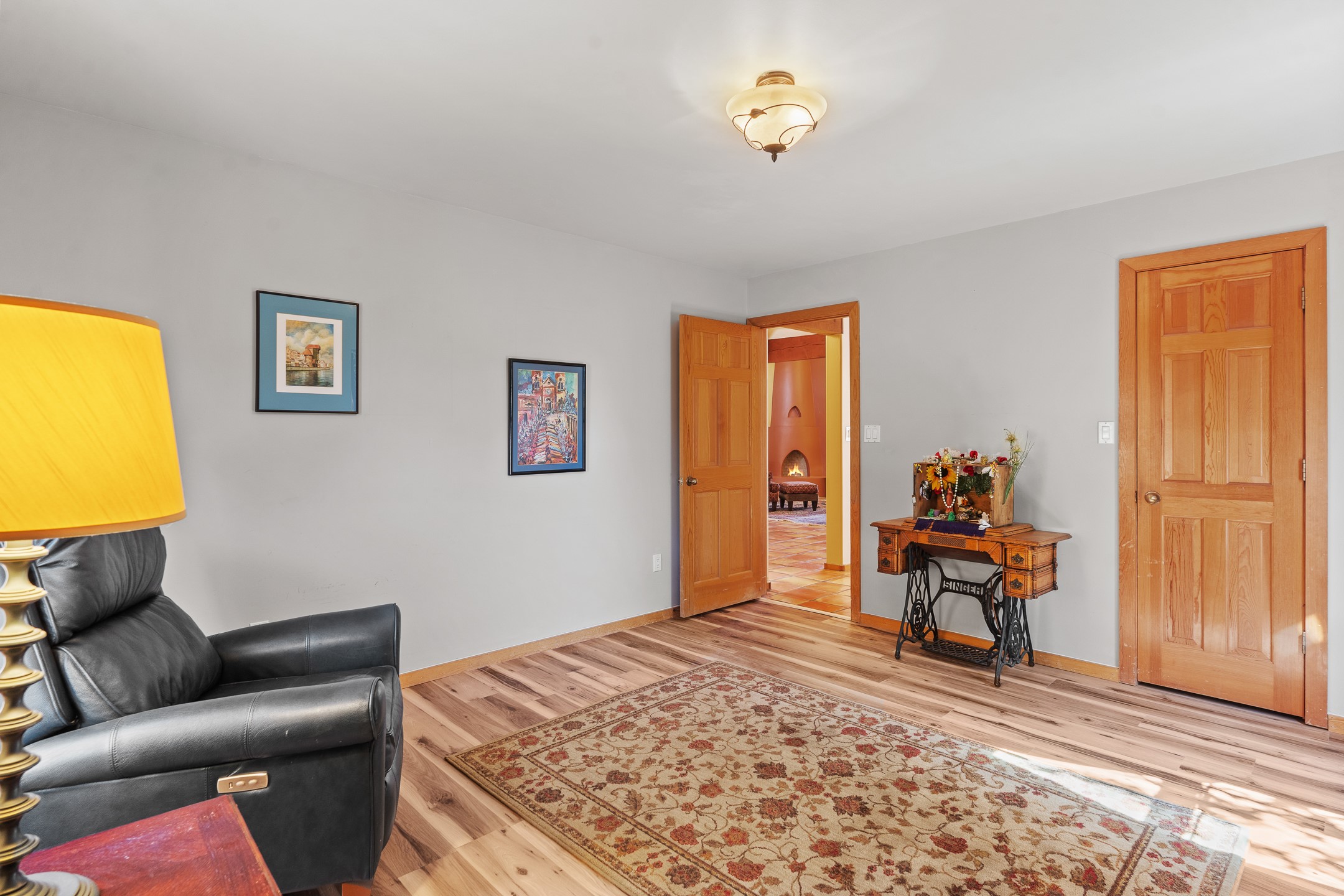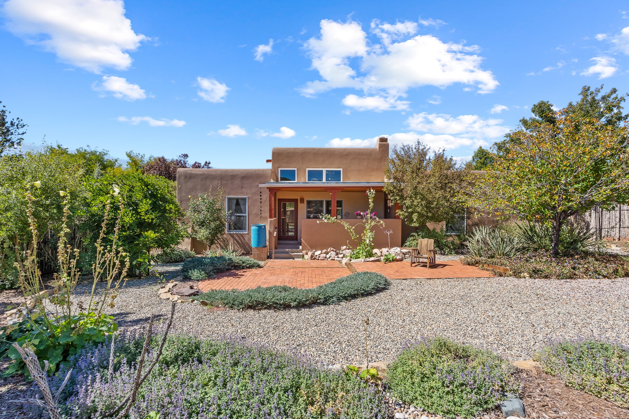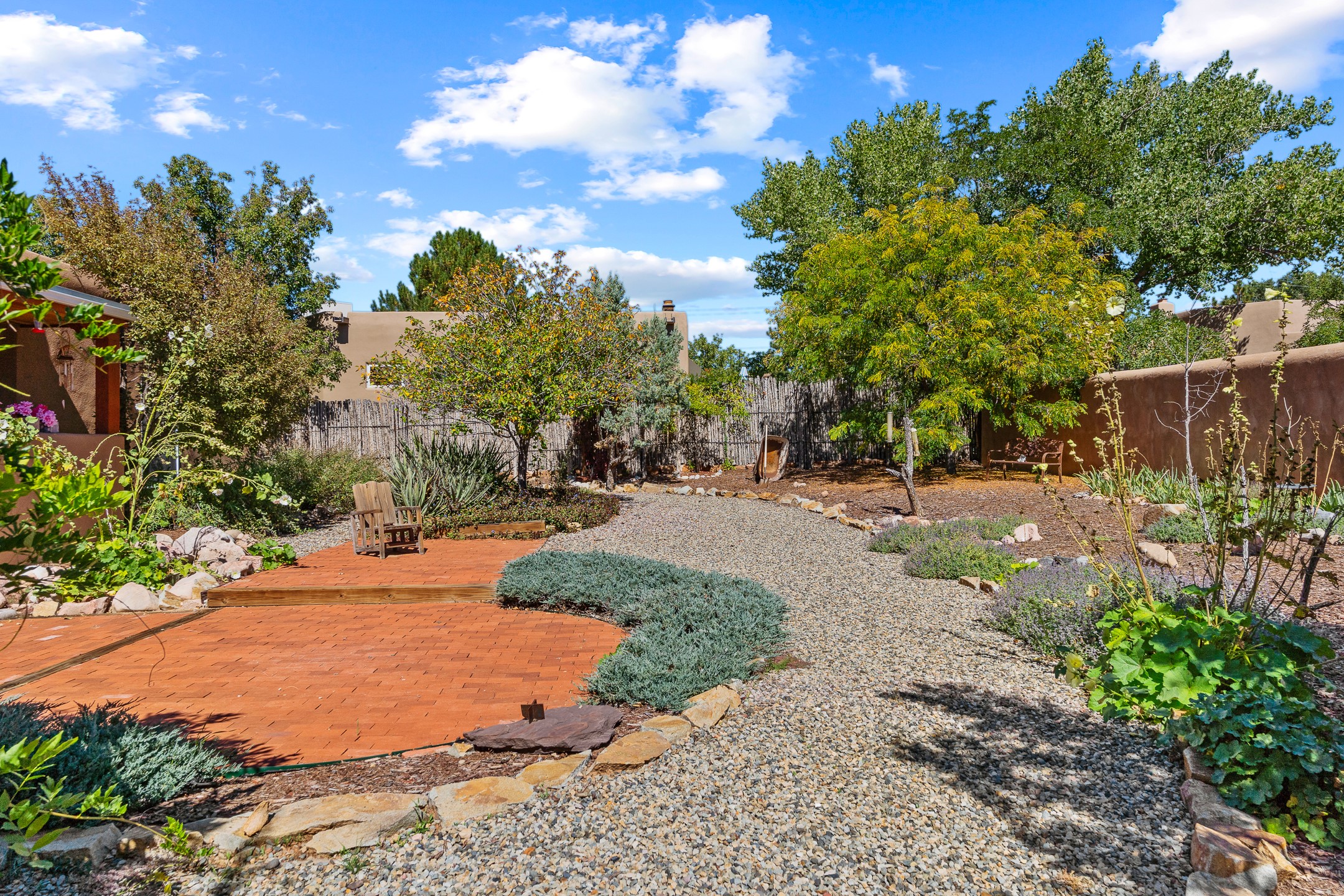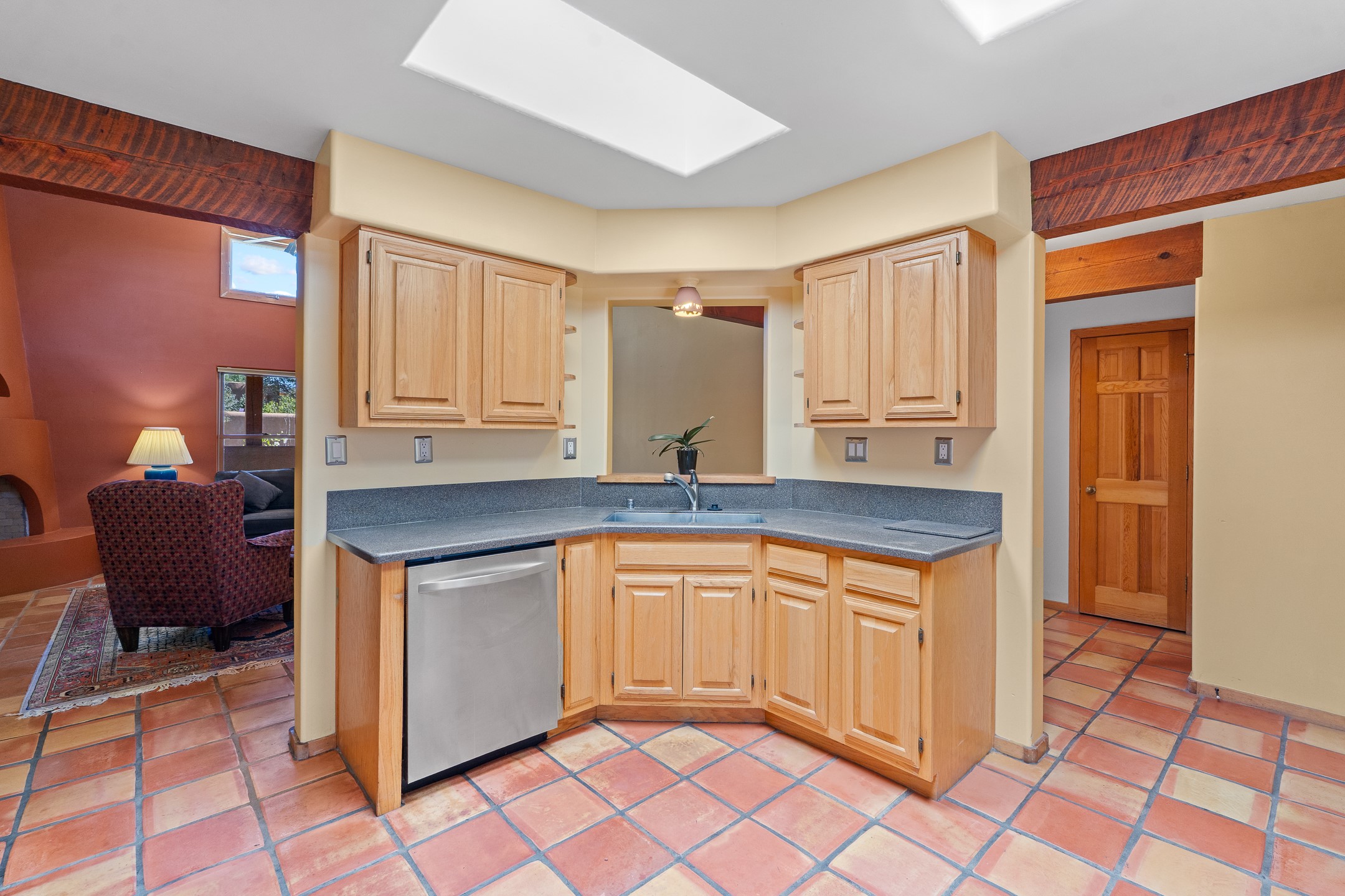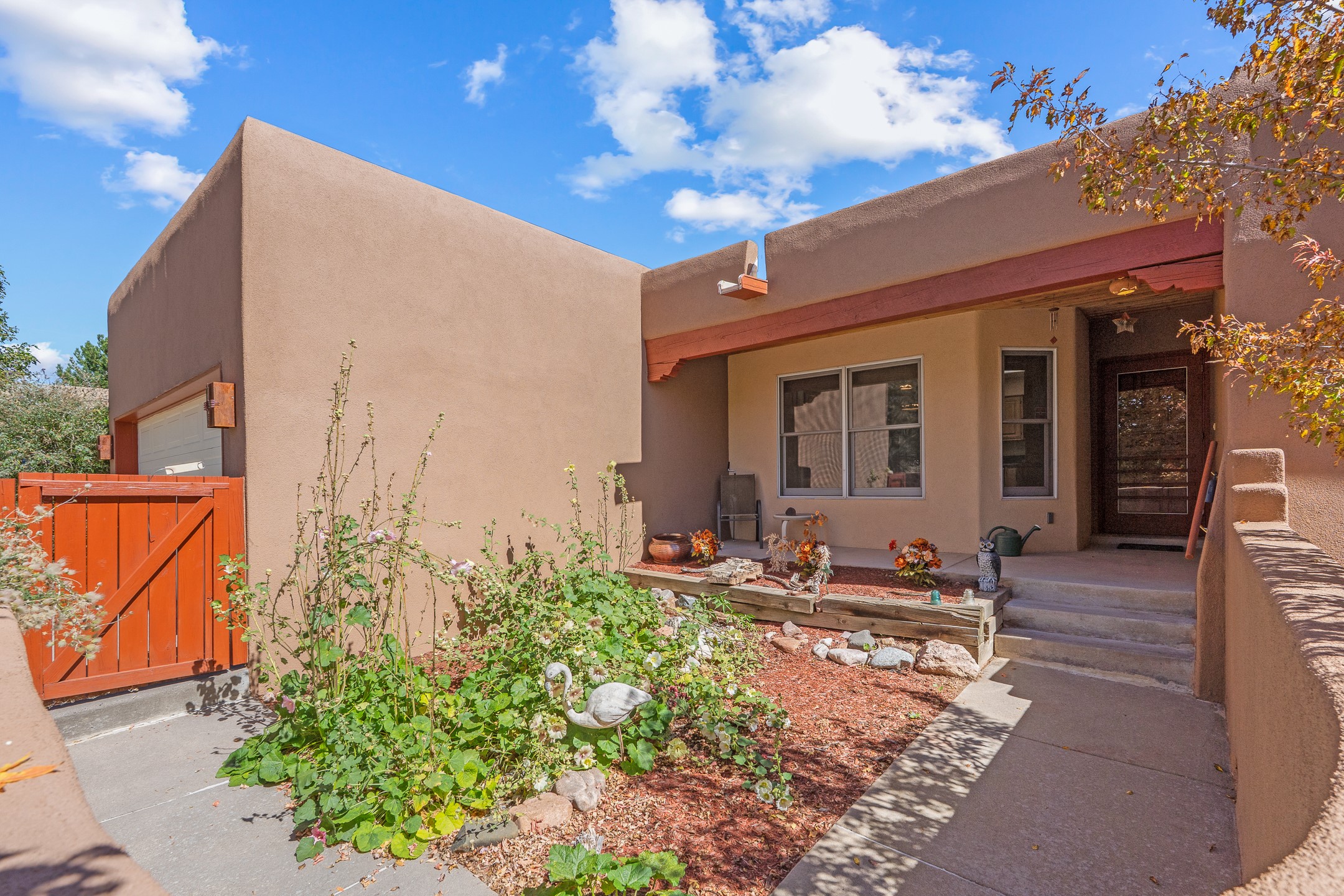 Charming Santa Fe-Style Retreat in a Prime Central Location. This beautifully maintained single-story home blends timeless Southwestern charm with modern comfort. Nestled in a peaceful, centrally located neighborhood, it offers the perfect balance of city convenience and tranquil living. Step inside to discover a light-filled interior featuring beamed living area with a walk out, traditional kiva fireplace, and Saltillo tile floors. The kitchen is both stylish and functional, boasting quartzite countertops, newer appliances, ample cabinet space. The spacious primary suite includes a walk out plus a generous walk-in closet, while two additional bedrooms offer versatility for guests, office space, or hobbies. Finished direct access two car garage. Outside, you'll find a beautiful, mature, landscaped yard that's fully private and perfect for relaxing or entertaining. The walled portal provides a serene outdoor living area in an ideal setting for enjoying Santa Fe's beautiful weather. Close to shopping, schools, medical facilities, and restaurants, this pristine property offers an exceptional opportunity to enjoy the best of Santa Fe living.