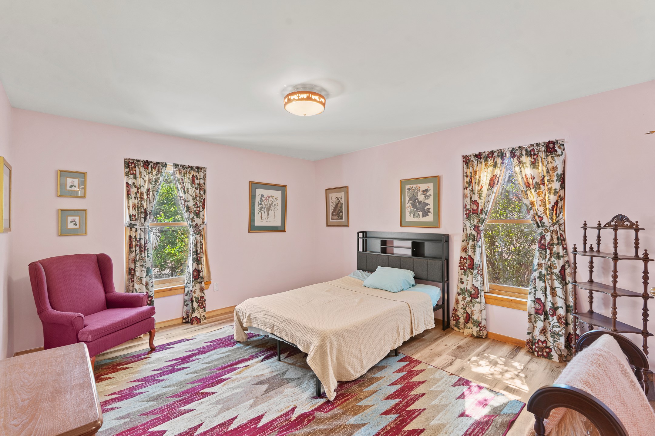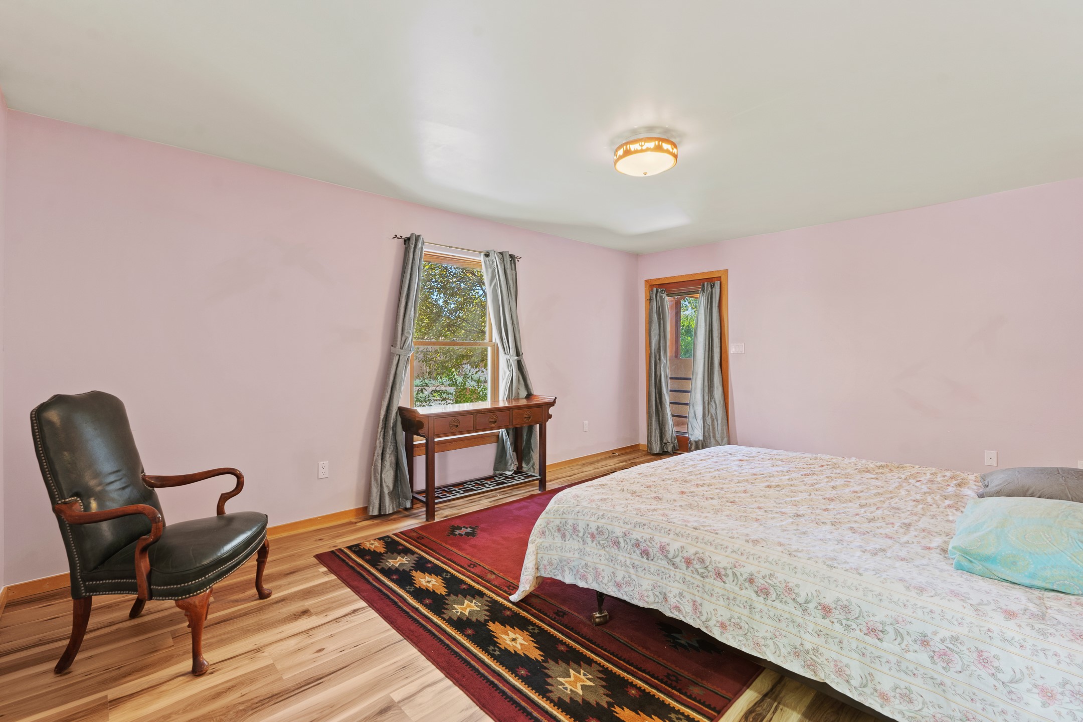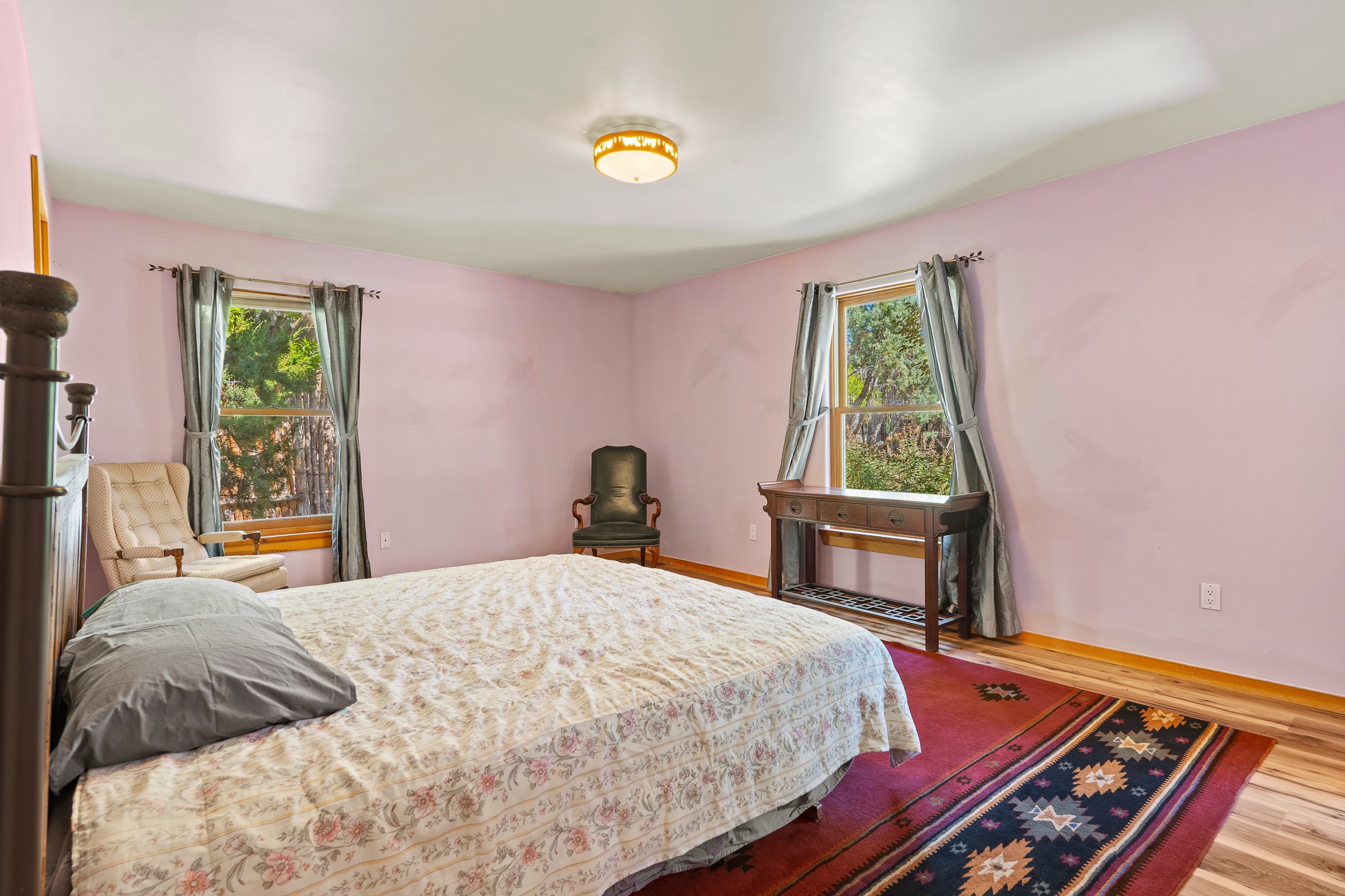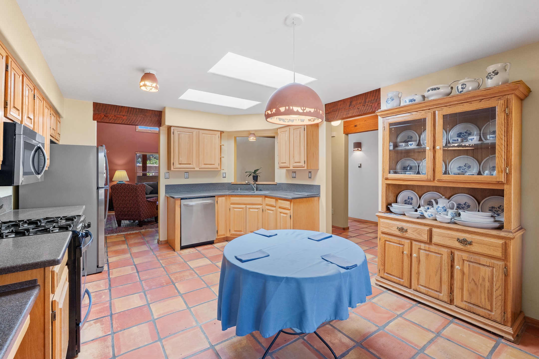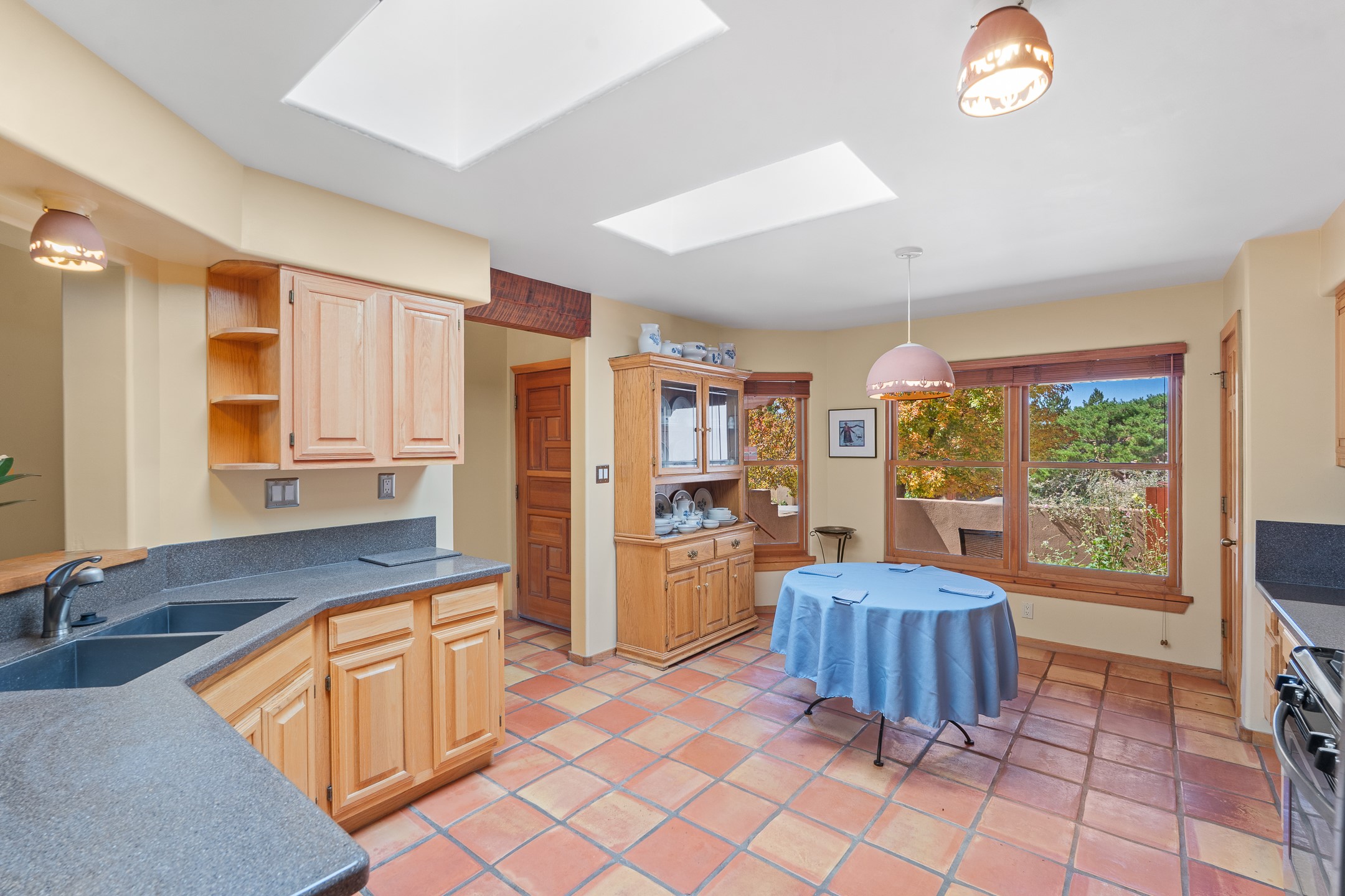Charming Santa Fe-Style Retreat in a Prime Central Location. This beautifully maintained single-story home blends timeless Southwestern charm with modern comfort. Nestled in a peaceful, centrally located neighborhood, it offers the perfect balance of city convenience and tranquil living. Step inside to discover a light-filled interior featuring beamed living area with a walk out, traditional kiva fireplace, and Saltillo tile floors. The kitchen is both stylish and functional, boasting quartzite countertops, newer appliances, ample cabinet space. The spacious primary suite includes a walk out plus a generous walk-in closet, while two additional bedrooms offer versatility for guests, office space, or hobbies. Finished direct access two car garage. Outside, you'll find a beautiful, mature, landscaped yard that's fully private and perfect for relaxing or entertaining. The walled portal provides a serene outdoor living area in an ideal setting for enjoying Santa Fe's beautiful weather. Close to shopping, schools, medical facilities, and restaurants, this pristine property offers an exceptional opportunity to enjoy the best of Santa Fe living.