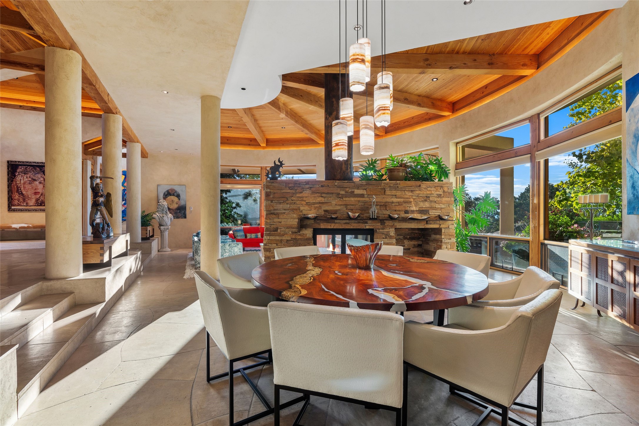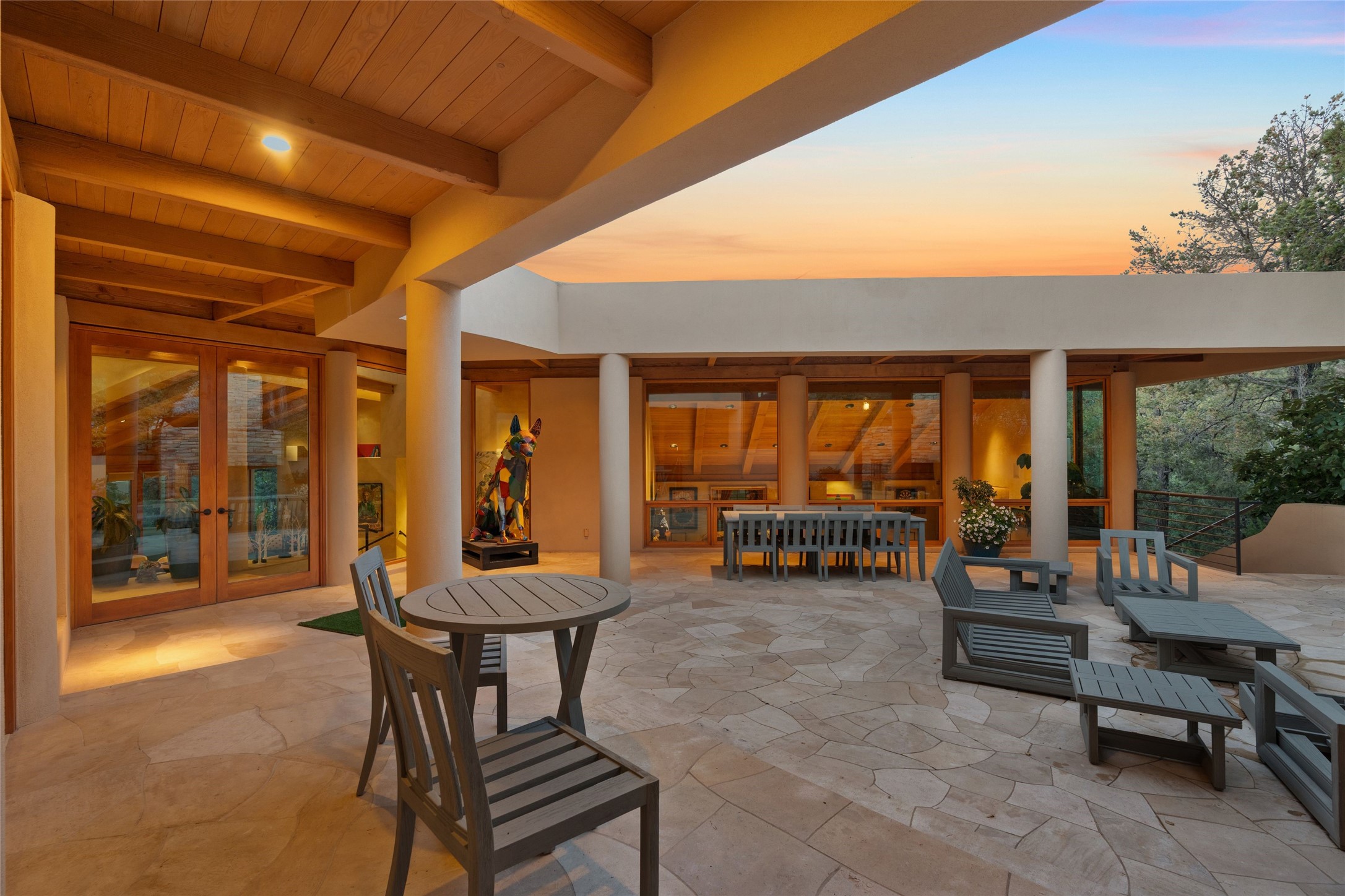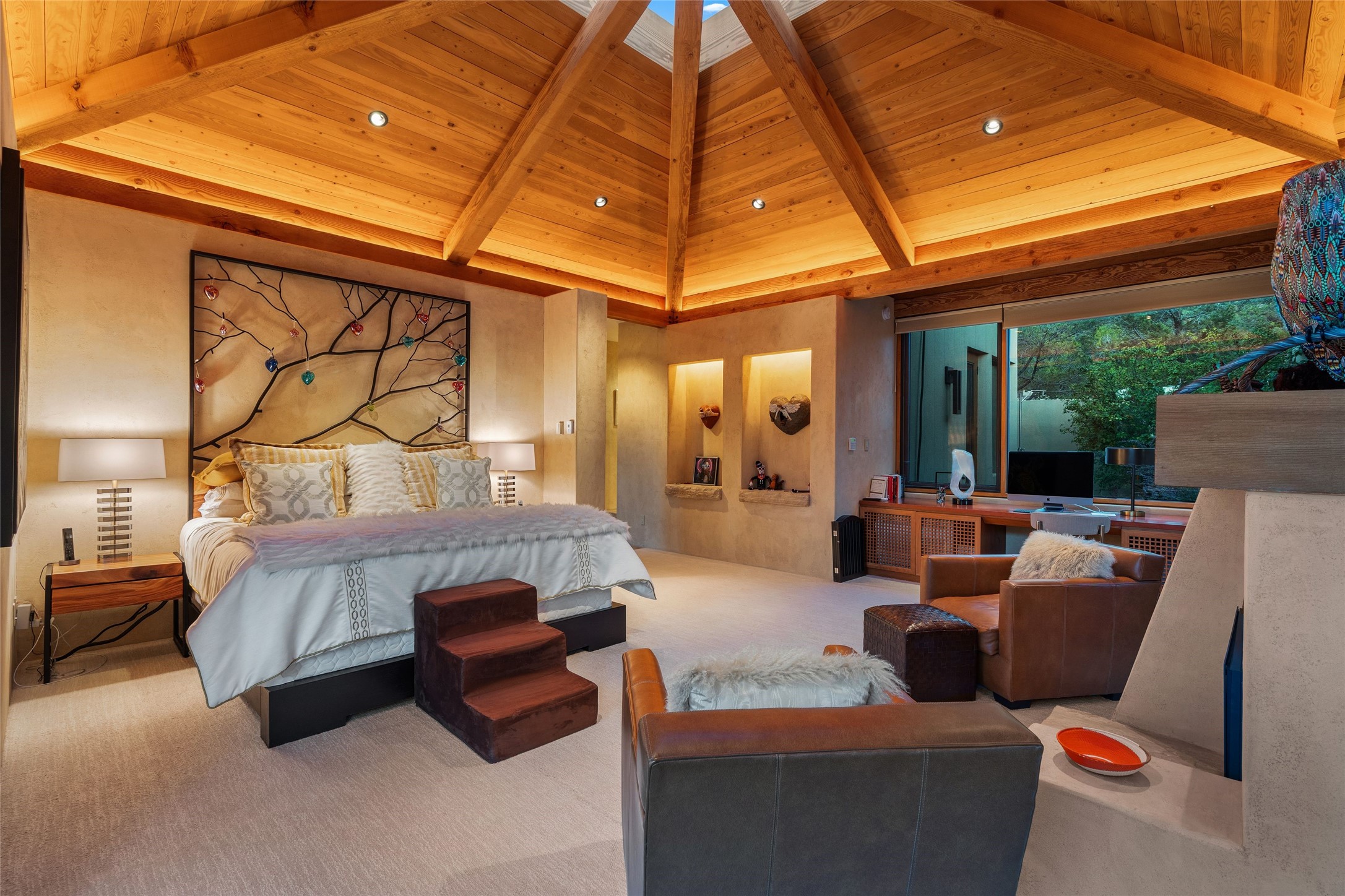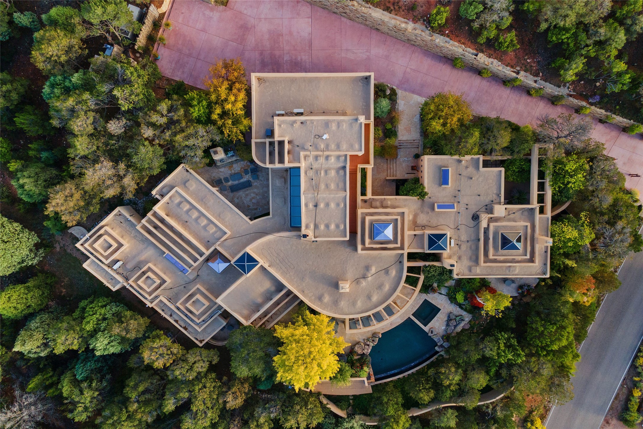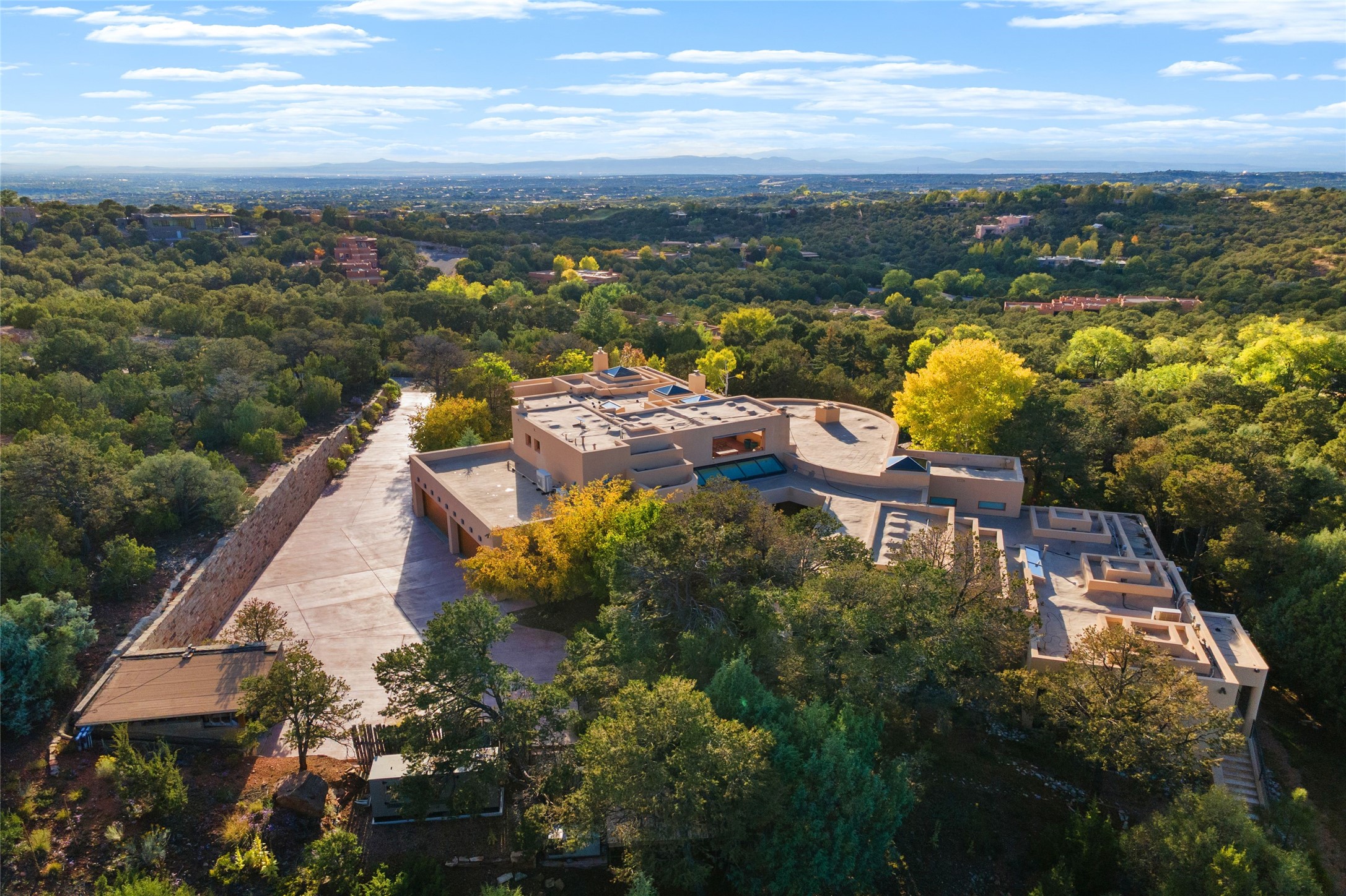 A Rare Masterpiece in Sierra del Norte! Welcome to 1056 Sierra del Norte--an architectural triumph and one of Santa Fe's most extraordinary residences! This estate offers breathtaking panoramic views and unmatched privacy from the moment you pass through the gated entrance. The heated driveway, stacked stone retaining walls, full-capacity generator, and an oversized four-car garage set the tone for the exceptional quality of this one-of-a-kind residence. Inside, grand entertaining spaces flow effortlessly around a world-class chef's kitchen, where top-tier appliances and exquisite finishes inspire culinary creativity. The design and craftsmanship throughout the home are truly unparalleled, with amazing custom details and impressive execution of unique design elements throughout. The expansive living room and formal dining area are anchored by a stunning natural stacked-stone gas fireplace, creating warmth and elegance. Enjoy evenings in the spacious media room, unwind at the custom bar, or challenge friends to Pool or Darts in the dedicated game room. Upstairs, a versatile studio space--perfect as a fifth bedroom--features a sitting room, bath, and access to a private viewing deck. Step outside to discover a sanctuary of lush, mature landscaping, multiple covered portals and patios, and a high-end outdoor kitchen ideal for alfresco dining. The infinity-edge pool and hot tub, complemented by a newly-built pool bath house, offer resort quality relaxation at your own property. The primary suite is a retreat unto itself, with a cozy library, a grand sleeping room, two fireplaces, a spa-inspired bath, and a magnificent walk-in closet. Each guest bedroom is a private suite, thoughtfully separated for lavish comfort and complete tranquility. This is more than a home--it's a lifestyle! With room to grow and views that inspire, 1056 Sierra del Norte is a rare opportunity to own a piece of Santa Fe paradise! Included with the home is a vacant, unimproved adjacent lot, offering rare potential for future expansion or permanent open space.