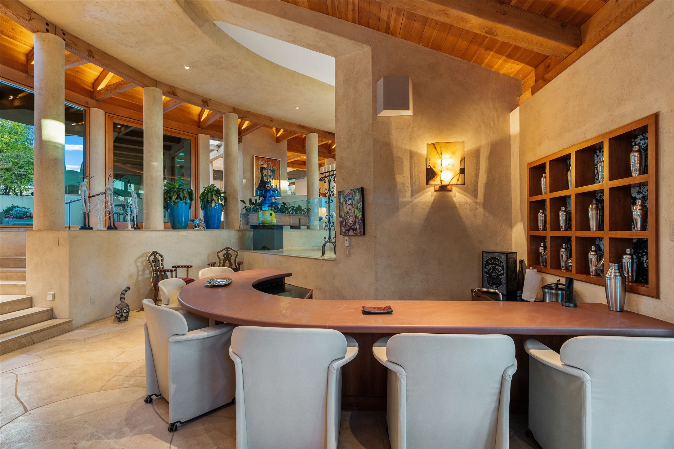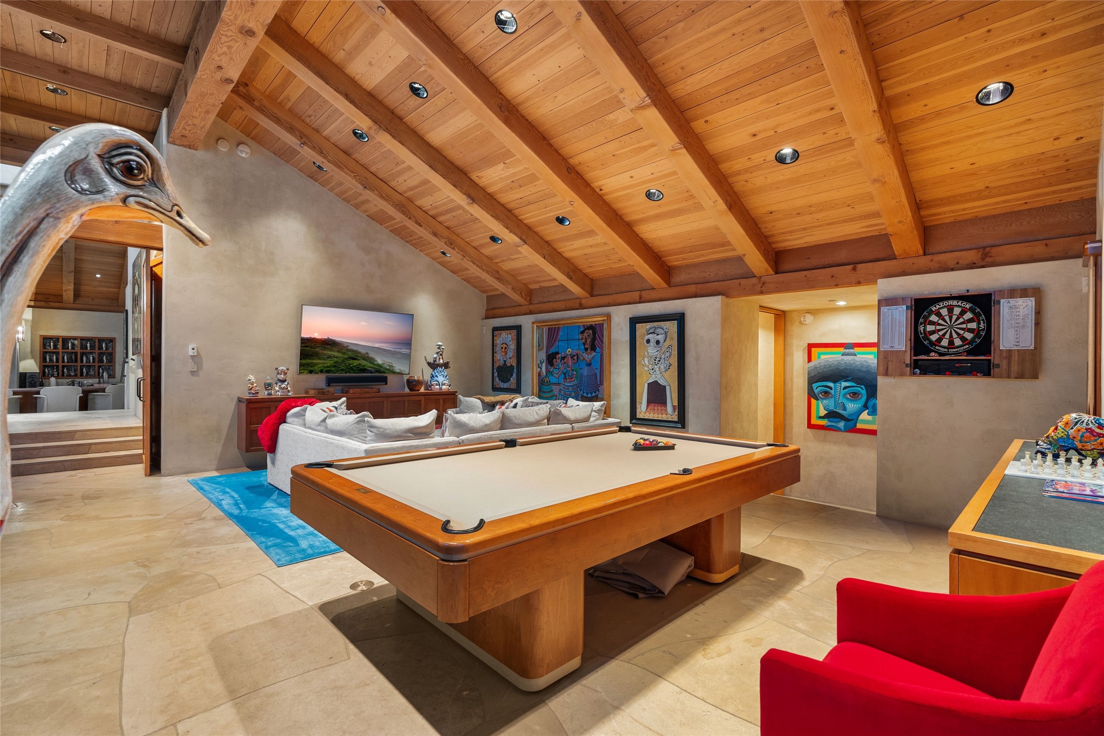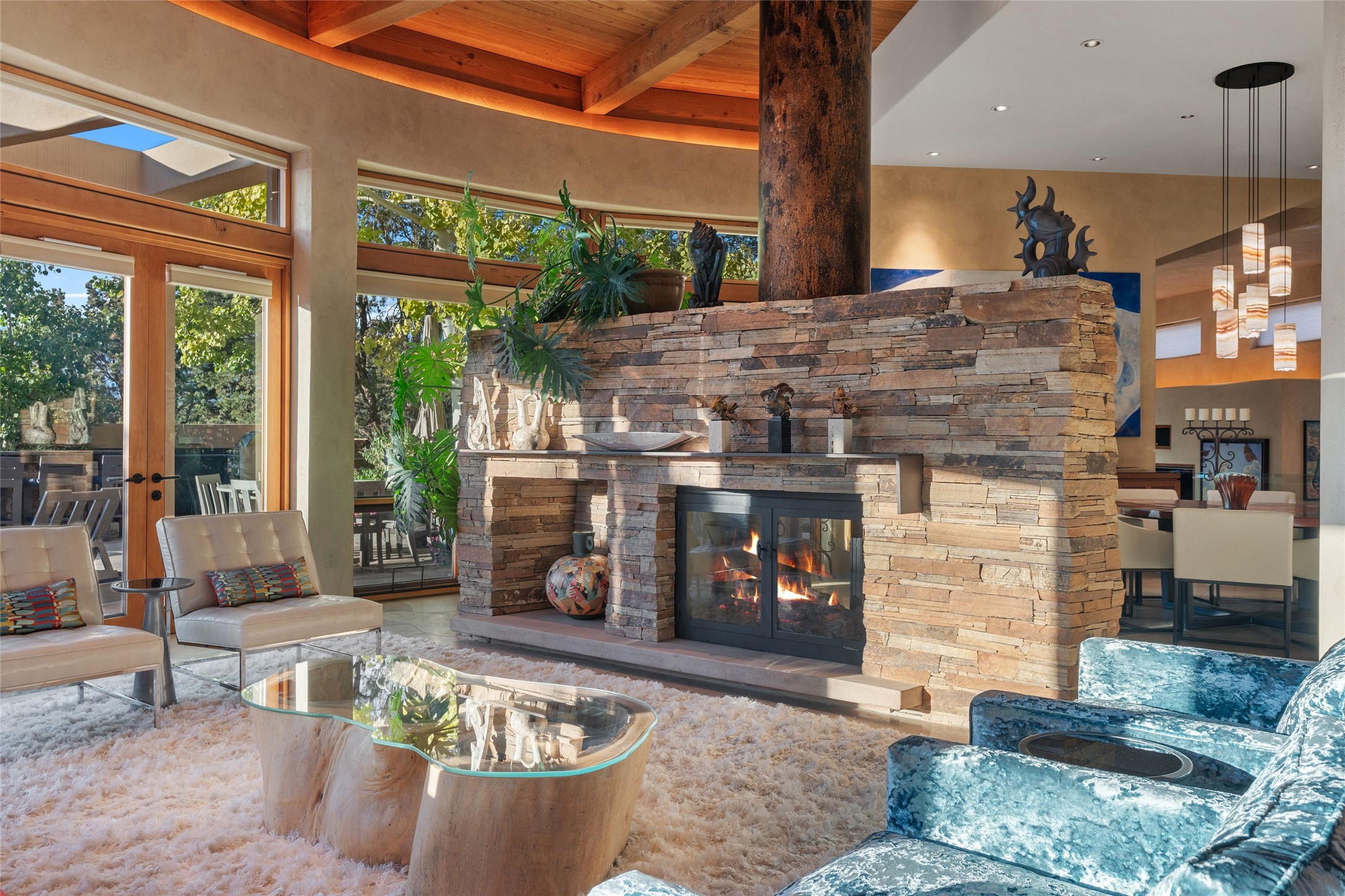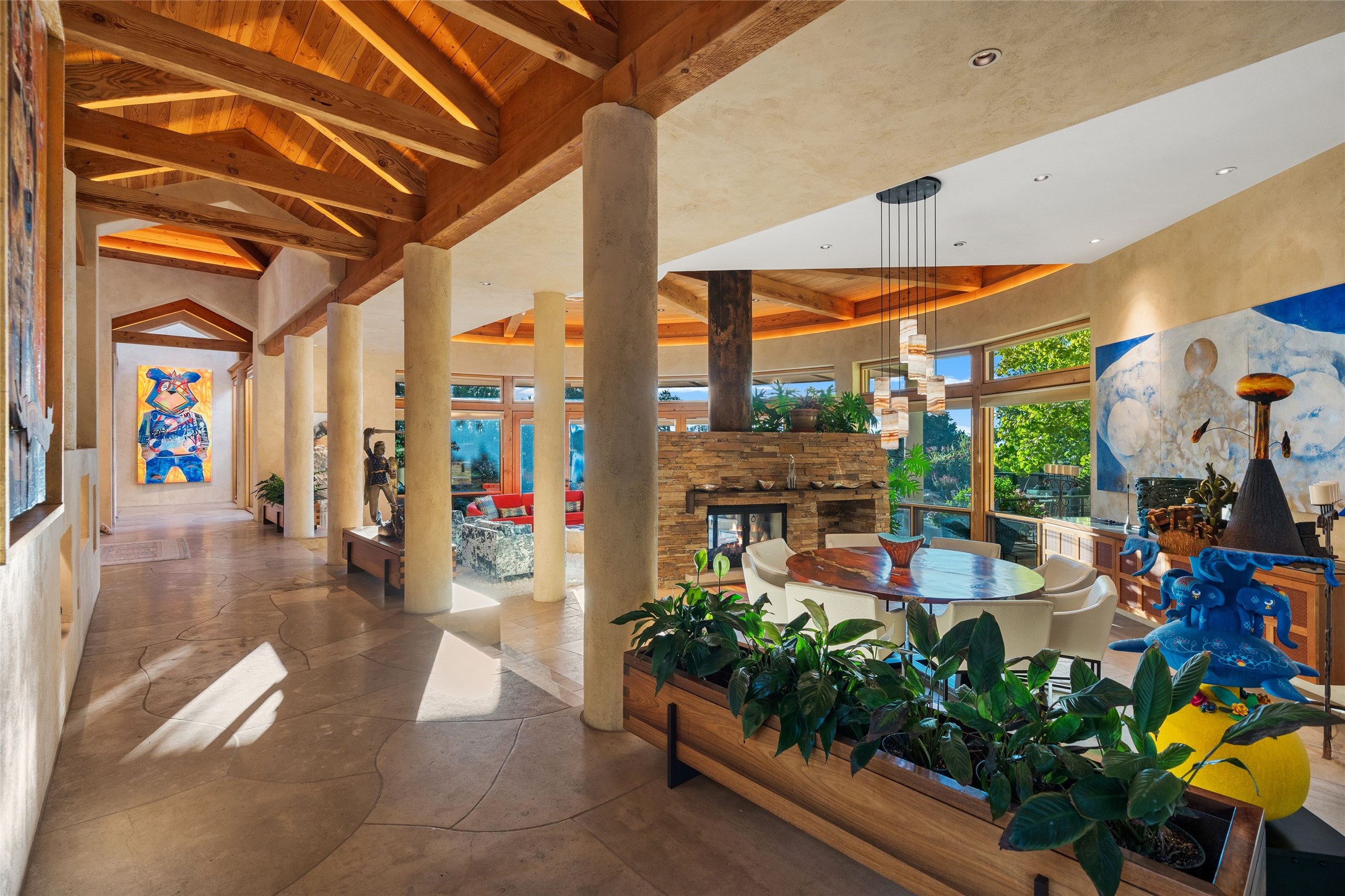 A Rare Masterpiece in Sierra del Norte! Welcome to 1056 Sierra del Norte--an architectural triumph and one of Santa Fe's most extraordinary residences! This estate offers breathtaking panoramic views and unmatched privacy from the moment you pass through the gated entrance. The heated driveway, stacked stone retaining walls, full-capacity generator, and an oversized four-car garage set the tone for the exceptional quality of this one-of-a-kind residence. Inside, grand entertaining spaces flow effortlessly around a world-class chef's kitchen, where top-tier appliances and exquisite finishes inspire culinary creativity. The design and craftsmanship throughout the home are truly unparalleled, with amazing custom details and impressive execution of unique design elements throughout. The expansive living room and formal dining area are anchored by a stunning natural stacked-stone gas fireplace, creating warmth and elegance. Enjoy evenings in the spacious media room, unwind at the custom bar, or challenge friends to Pool or Darts in the dedicated game room. Upstairs, a versatile studio space--perfect as a fifth bedroom--features a sitting room, bath, and access to a private viewing deck. Step outside to discover a sanctuary of lush, mature landscaping, multiple covered portals and patios, and a high-end outdoor kitchen ideal for alfresco dining. The infinity-edge pool and hot tub, complemented by a newly-built pool bath house, offer resort quality relaxation at your own property. The primary suite is a retreat unto itself, with a cozy library, a grand sleeping room, two fireplaces, a spa-inspired bath, and a magnificent walk-in closet. Each guest bedroom is a private suite, thoughtfully separated for lavish comfort and complete tranquility. This is more than a home--it's a lifestyle! With room to grow and views that inspire, 1056 Sierra del Norte is a rare opportunity to own a piece of Santa Fe paradise! Included with the home is a vacant, unimproved adjacent lot, offering rare potential for future expansion or permanent open space.
