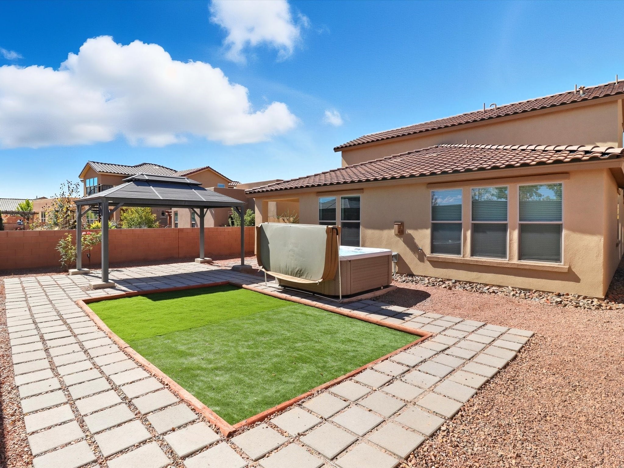 Welcome to your dream home in one of Las Soleras' most desirable neighborhoods -- this well-maintained home offers elegance, functionality, and peace of mind with warranties and new features throughout.This home has a brand-new carpet, ceiling fans in every room, and upgraded 8-foot doors, adding a touch of sophistication and spaciousness throughout. The Kitchen is with granite countertops, new backsplash, new faucet, and a brand-new refrigerator, while the bathrooms feature quartz vanities, new faucets, and upgraded shower heads.Every detail has been thoughtfully refreshed -- from the new washer and dryer to the WiFi-enabled garage door opener and new weatherproof rubber entryway perfect for winter durability. Enjoy peace of mind with the remainder of the Pulte structural warranty, AC/heater and water heater warranties, and a 6-month refurbishment warranty on the hot tub.The zeroscaped backyard is designed for low-maintenance living, complete with a 50-amp outdoor service, ideal for gatherings or future enhancements. The extended garage provides space for a workshop, and CenturyLink wiring ensures high-speed connectivity. Pet lovers will appreciate the dog door conveniently leading into the garage, while guests will love the ample parking space directly across the home and the upstairs loft with a full bath -- a perfect retreat for visitors or entertainment.Located on a perimeter lot close to mailboxes and neighborhood conveniences, this home embodies modern Santa Fe living with unmatched practicality and style.Move-in ready, fully upgraded, and built to last -- this Las Soleras gem is a rare find you don't want to miss.
