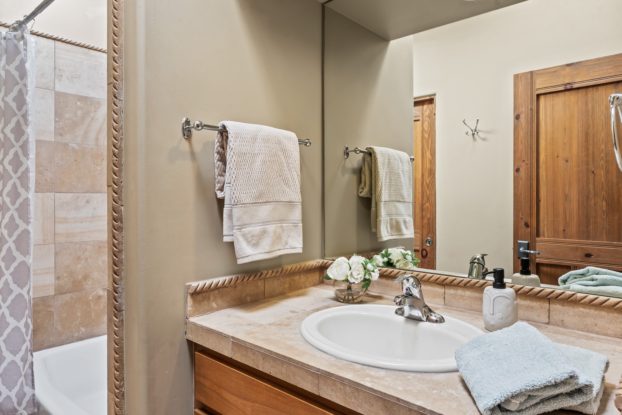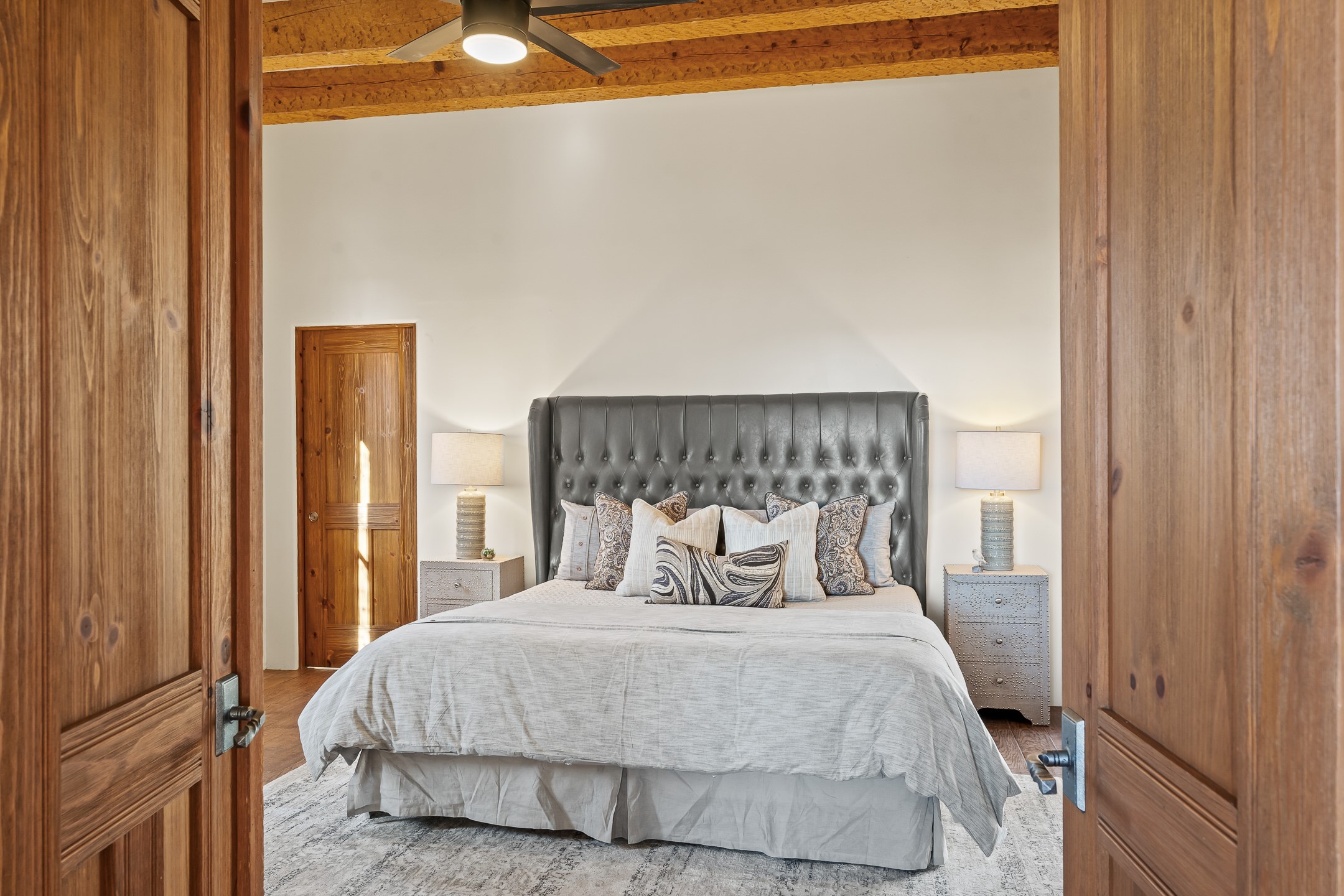 42 E. Va Plaza Nueva offers a warm embrace of classic Santa Fe style within the highly desirable community of Aldea de Santa Fe. This 2,392-square-foot residence features 3 bedrooms, 2.5 baths, and a 2-car garage, blending timeless craftsmanship with inviting indoor-outdoor living.Enter through a private front courtyard and step into a home rich with Old World charm. Brick and tile floors run throughout, complementing the carved wood beams, vigas, and hand-troweled plaster walls in the main living areas. The expansive living room feels gracious and grounded, ideal for quiet evenings or elegant entertaining.The third bedroom, with its own separate entrance and cozy fireplace, offers versatility--perfect as a guest suite or a comfortable home office with added privacy.The kitchen is appointed with wood cabinetry, a gas cooktop and vent hood, double wall ovens, and granite counters accented by tile surrounds. A cozy breakfast nook creates an inviting place to savor your morning coffee.Designed for Santa Fe's coveted lifestyle, the home's outdoor living and dining spaces are surrounded by mature landscaping and back up to open space, creating a serene setting with views to the Sandias to enjoy year-round.Located in desirable Aldea de Santa Fe, a vibrant village-style community, residents enjoy 13 miles of walking trails, extensive shared open space, a community center, and tennis, basketball, and bocce courts. Neighborhood life is enhanced further with annual art tours, community garage sales, and a variety of active clubs--participate as much or as little as you like.This home embodies the warmth, texture, and tradition of Old Santa Fe while offering the amenities of a welcoming, engaged community.