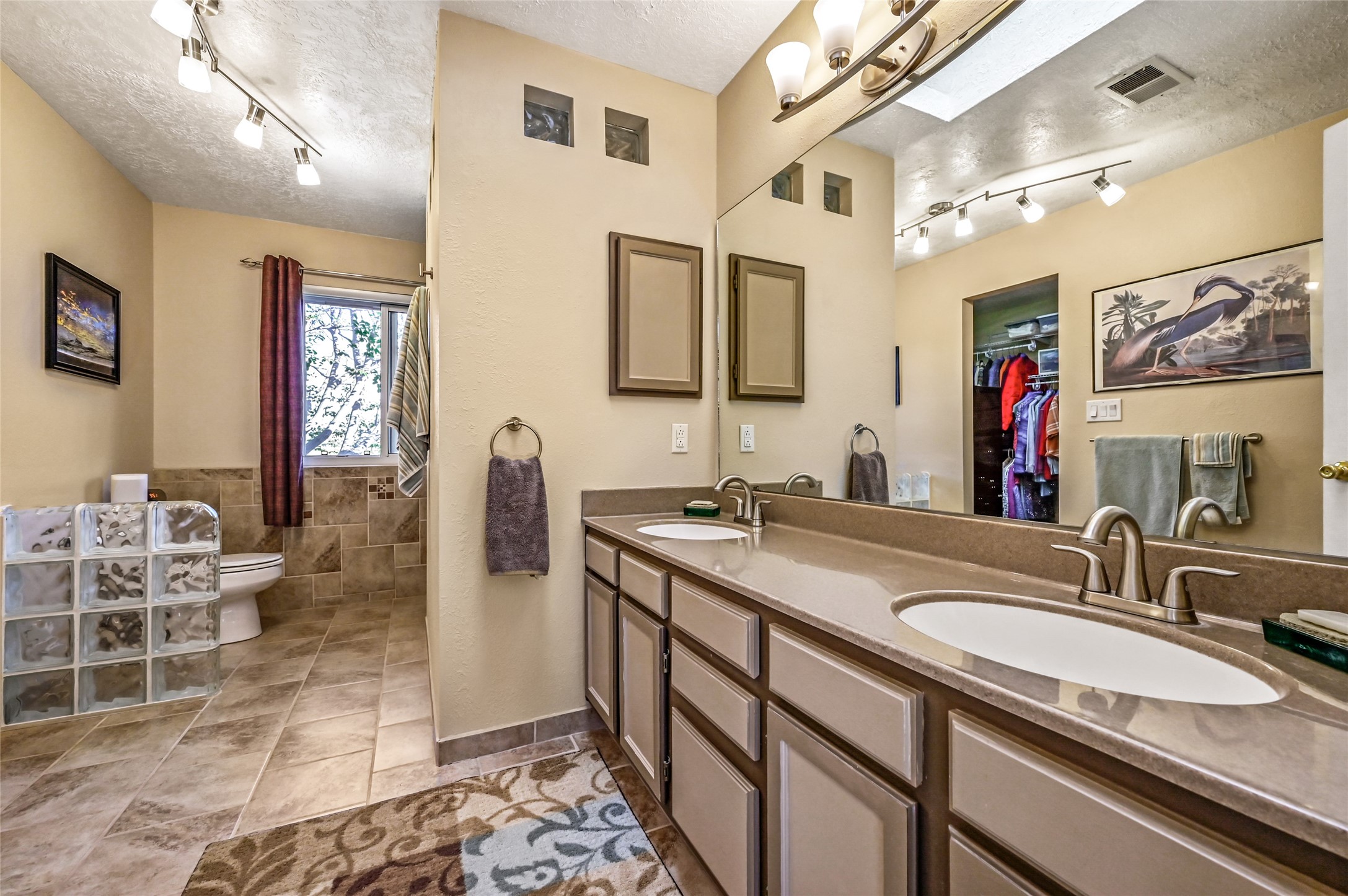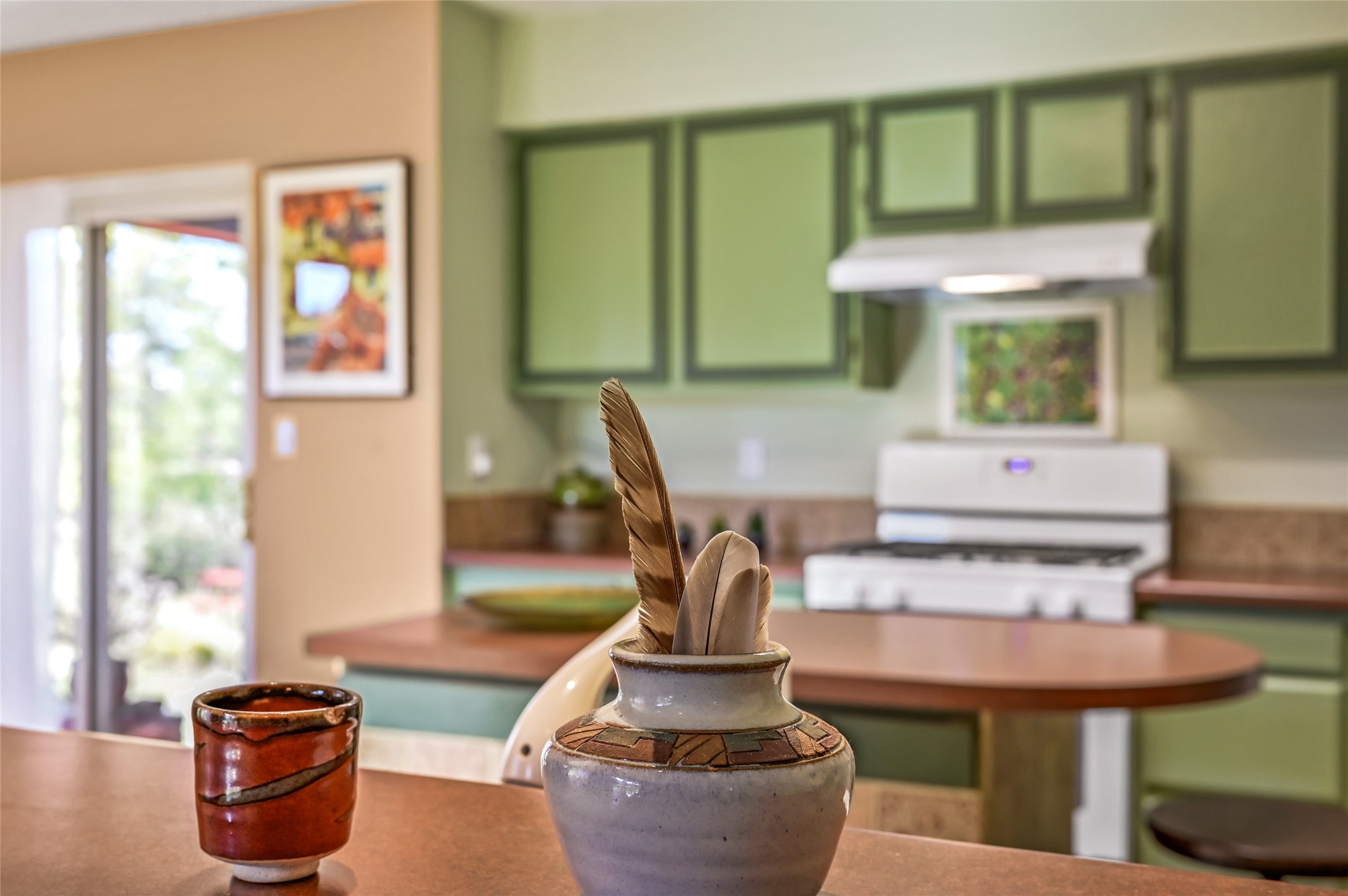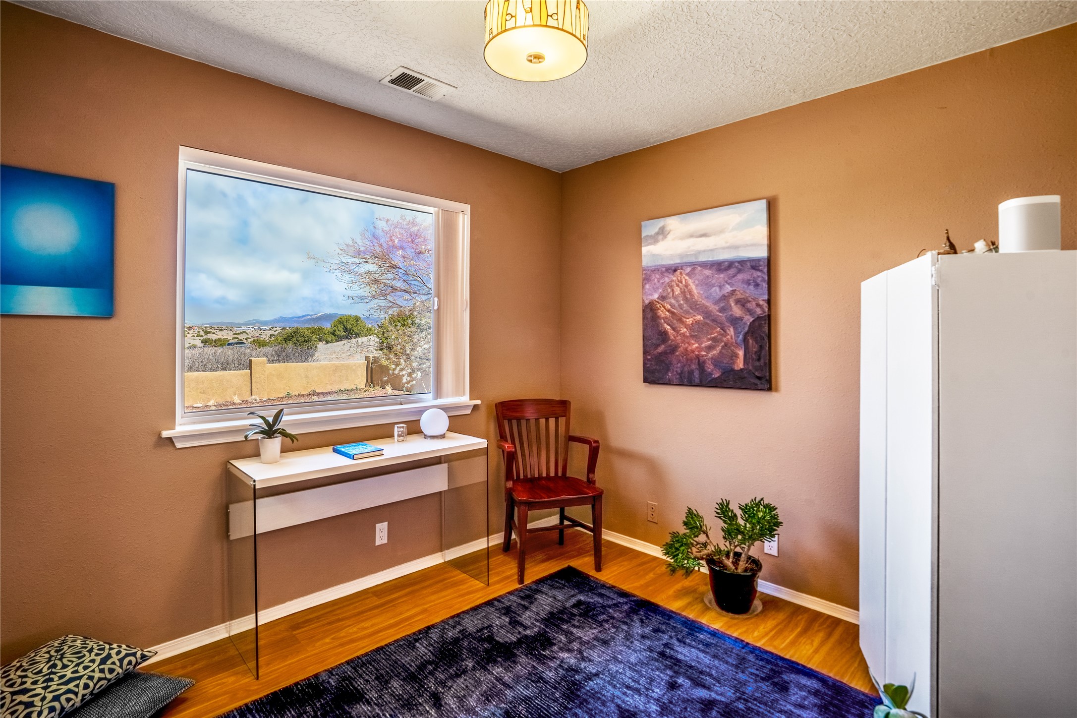 This sparkling, light-filled New Mexico ranch house, set on a gentle hillside among mature trees, wildflowers, and expansive mountain views, offers an easy blend of indoor and outdoor living. It includes 3+ fully fenced acres, located on a quiet road just north of the historic, artists' village of Cerrillos and just south of Santa Fe. Horses are allowed or may be boarded nearby. Inside, a thoughtfully designed layout flows from room to room, offering versatility for entertaining, home-business, or family use. The spacious living room has a wood-burning stove and convenient pass-through access to the kitchen. The kitchen features custom tiled floors and trim, all new appliances, and ample counter space. A large adjoining dining area is surrounded by tall windows. It opens to a covered patio and rear courtyard, complete with a ramada for shade and a fire ring for cool-season conversations under the stars. The primary suite catches the morning sun and opens onto a secluded rock garden. It features a lavish tiled bath and walk-in closet. Down the hall you'll find two generously sized bedrooms, a recently restyled bath with soaking tub, and flexible space for your office, media, studio, or whatever you can imagine. Grid-tied solar PV, a high efficiency gas furnace, upgraded windows and insulation assure low energy bills for years to come. A new water heater, supplemental water storage, and Pro-Panel roof round out the practicality of this beautiful place you'll want to come home to. Highly rated charter schools with bus service nearby. Outdoor furnishings and equipment will stay if desired. Seller financing available.