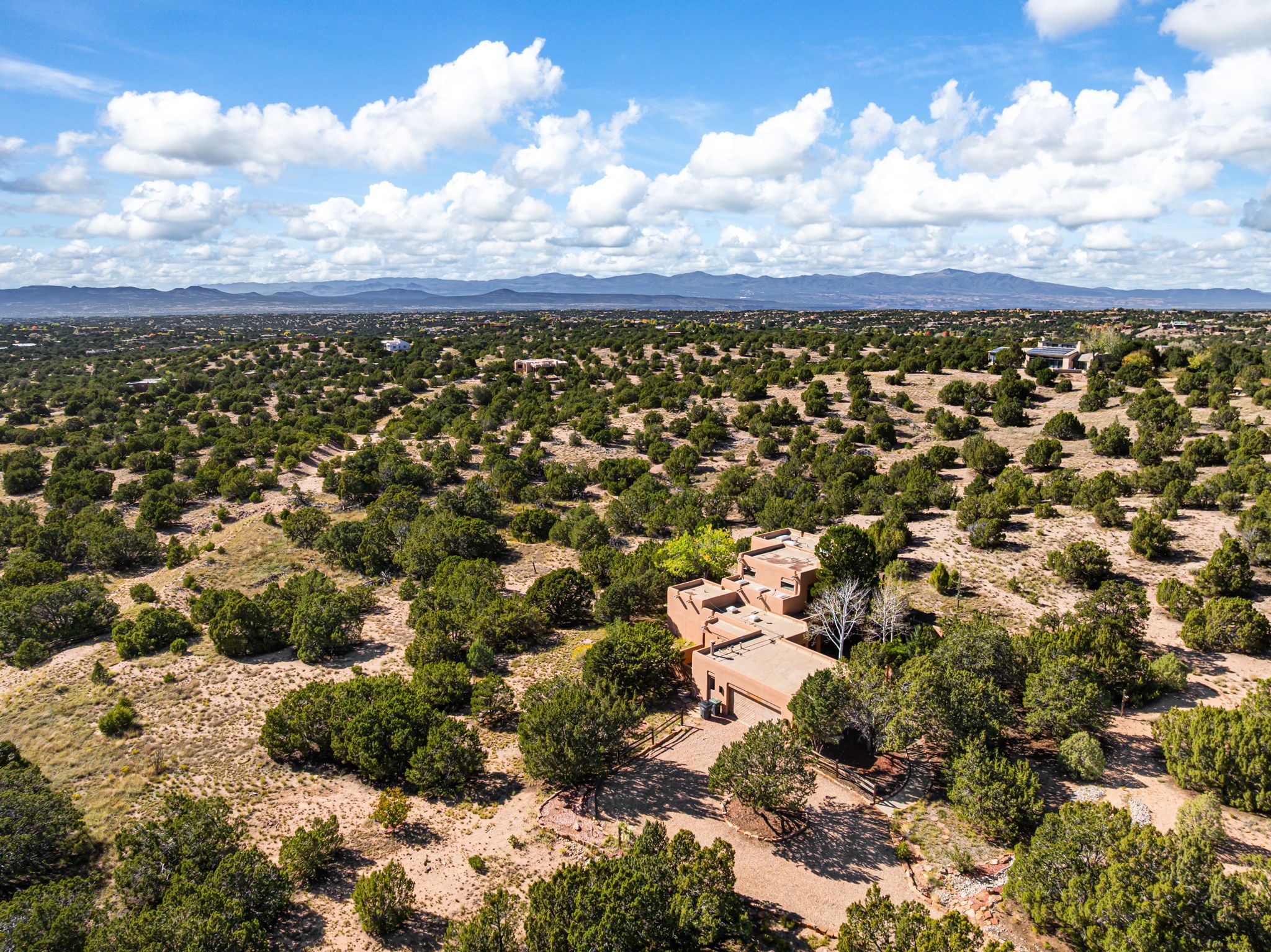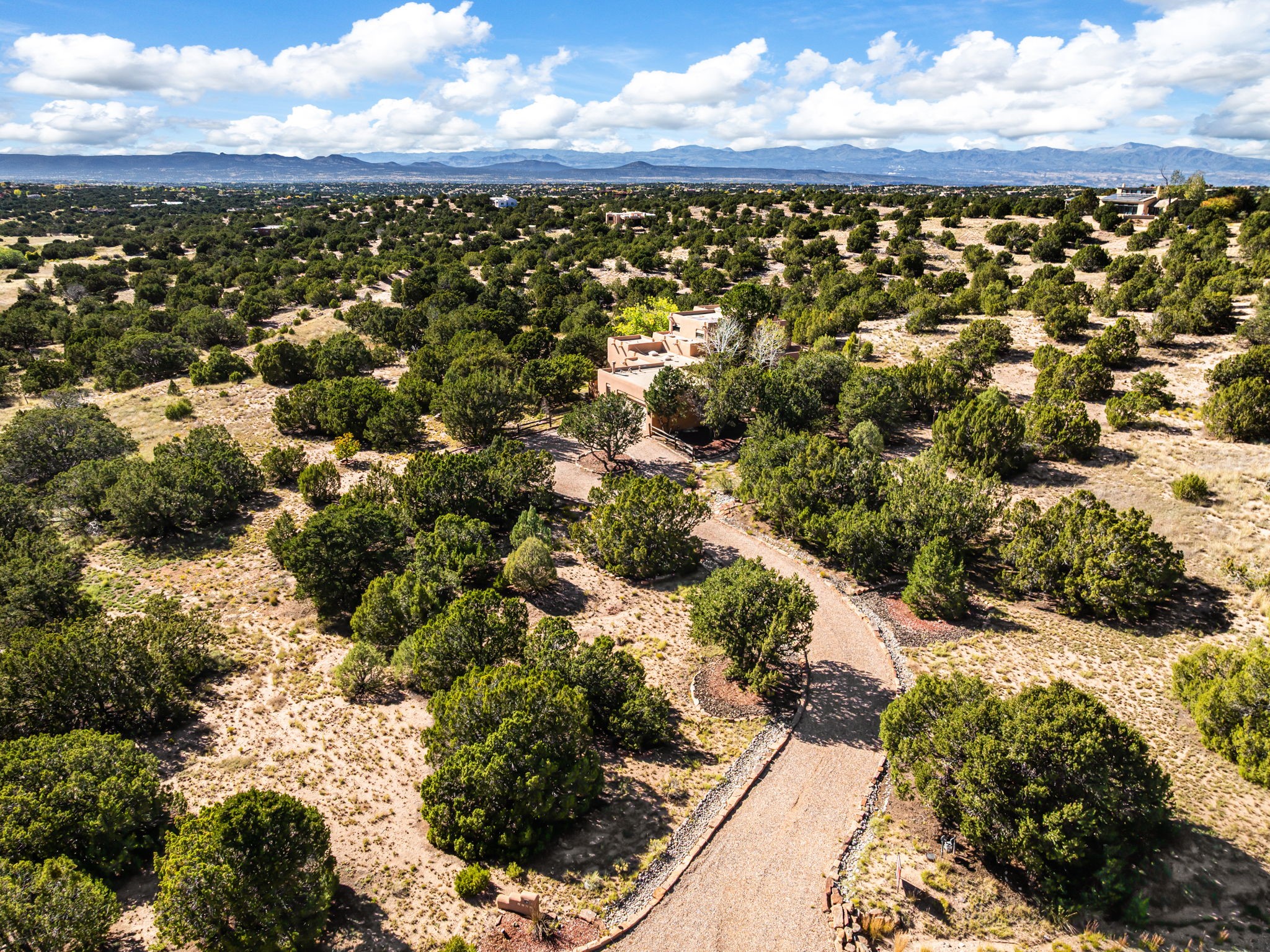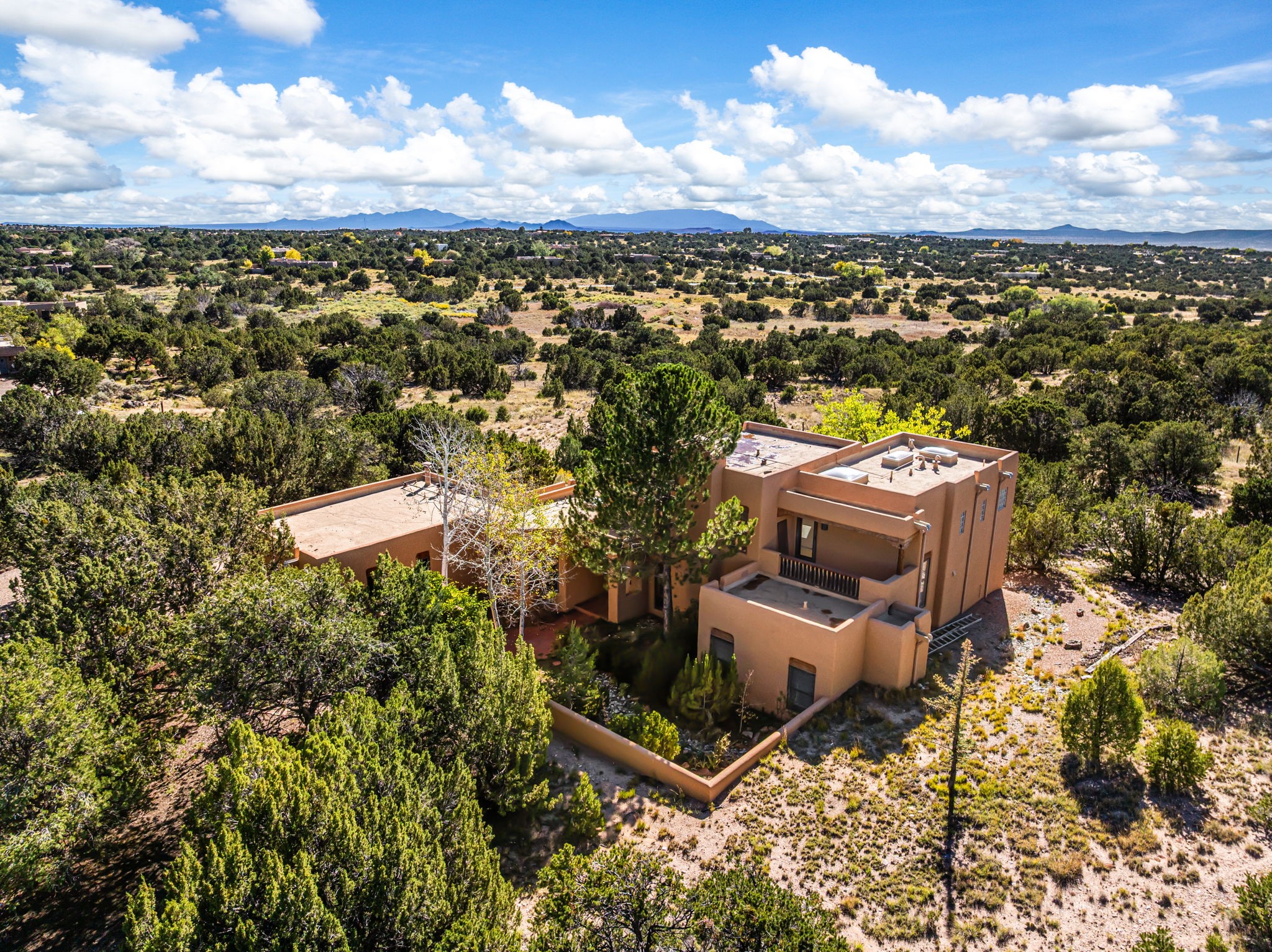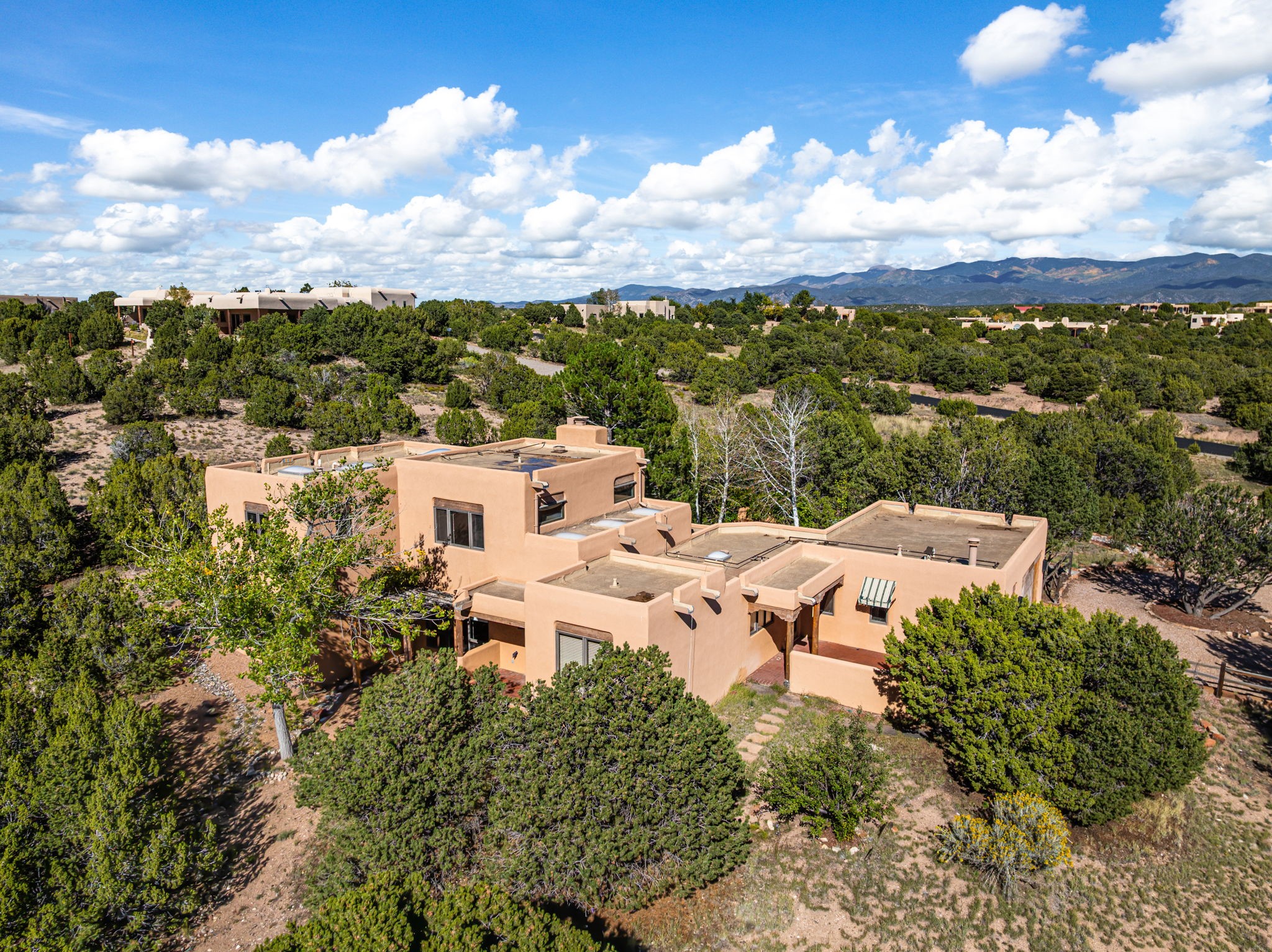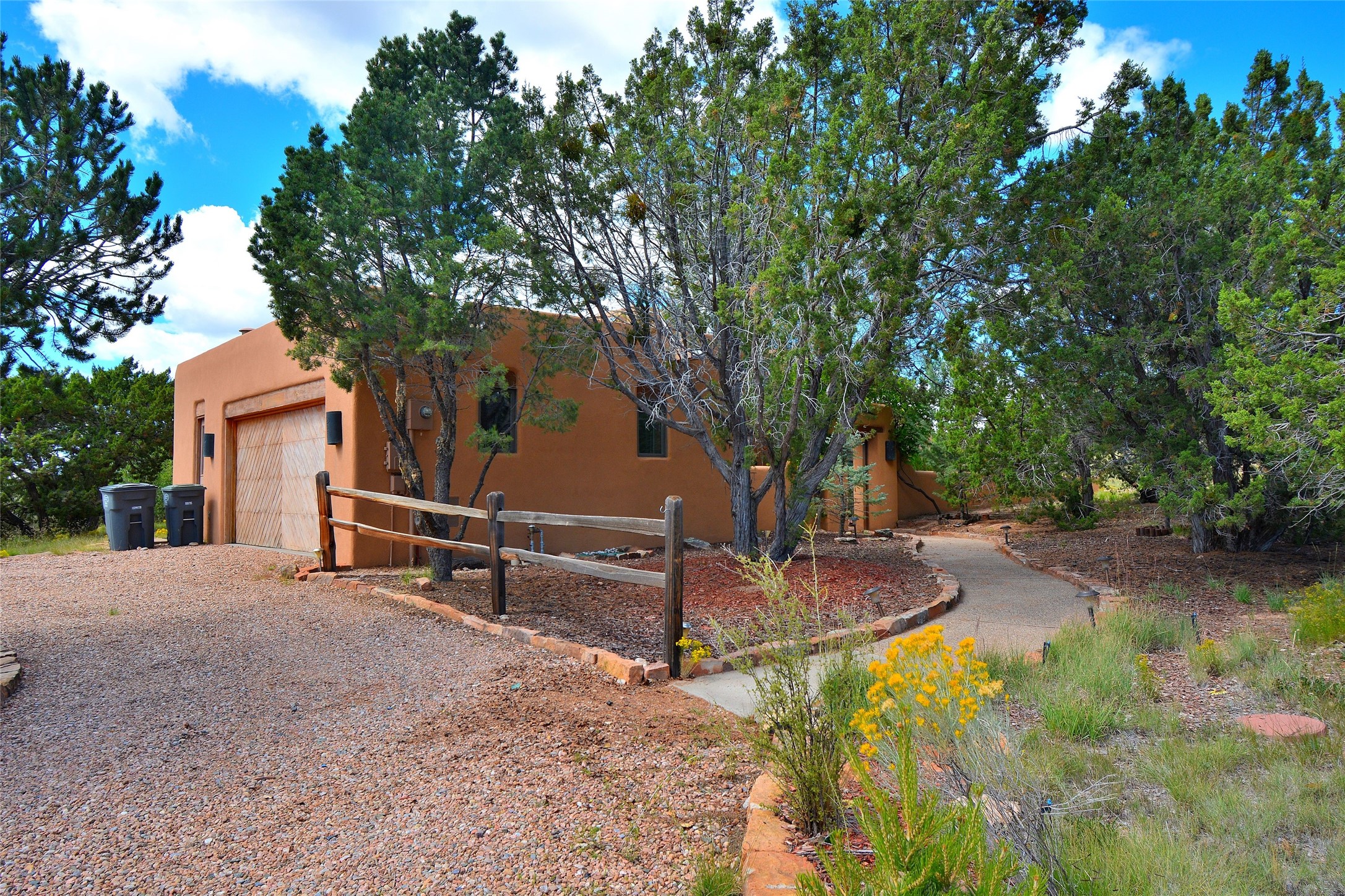 Nestled on two acres dotted with pion and juniper, this inviting Santa Fe-style home blends traditional charm with modern comforts. A gravel driveway leads to a graceful walkway, which in turn leads to a beautifully landscaped, enclosed front yard, The house features plastered walls, and the ground-level floors are adorned with traditional Saltillo tiles, except for the guest bedroom, which has carpet and an en-suite bathroom. The living and dining rooms feature soaring ceilings with vigas. A gas fireplace in the living room adds ambiance during cold winter nights.The kitchen, featuring skylights, granite countertops, and a gas cooktop, microwave, oven, and fridge/freezer, opens to a breakfast nook on one side, complete with its own private patio. Continuing from the breakfast nook, you enter the laundry and then the garage. On the other side of the kitchen is the dining room. The main level also features a second guest room or den with a nearby half-bath. The downstairs has in-floor radiant heat.Upstairs, the spacious main bedroom offers vigas, a second gas fireplace, radiant baseboard heat, and mountain views on one side and a deck on the other. The adjoining bath offers dual sinks, a Jacuzzi-style tub, a shower with seating, and a walk-in cedar closet.With an alarm system and thoughtful storage throughout, this home offers a blend of traditional Santa Fe style and practicality in a serene setting, just a couple of minutes drive to 599 and access to Santa Fe (approx.10 minutes) or to Los Alamos, the Santa Fe airport, and Albuquerque.Adjacent to the subdivision is the La Tierra open space of almost 1500 acres, offering 25 miles of walking trails.