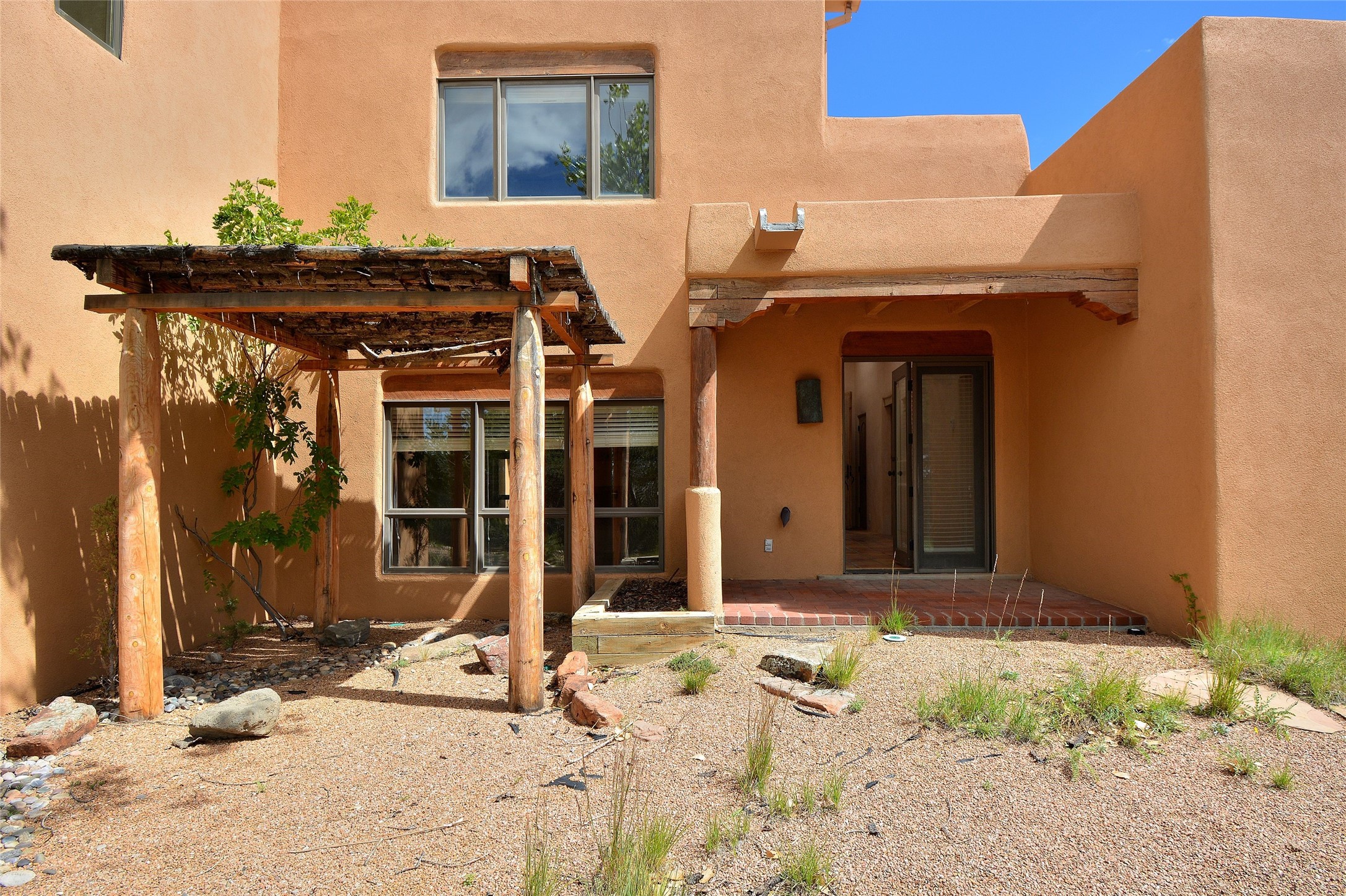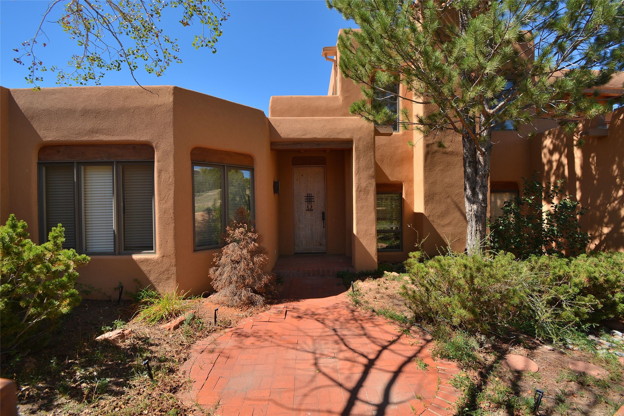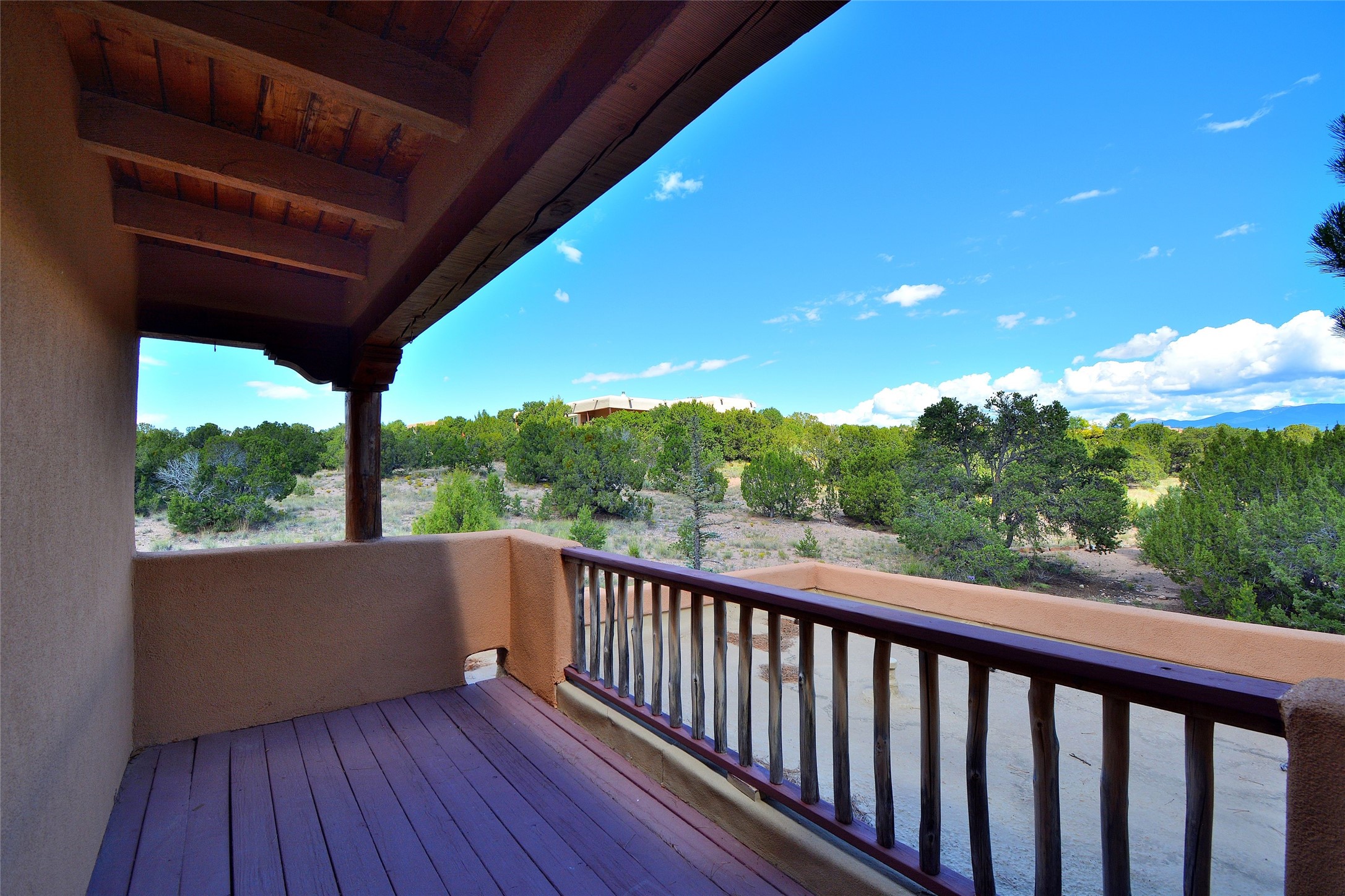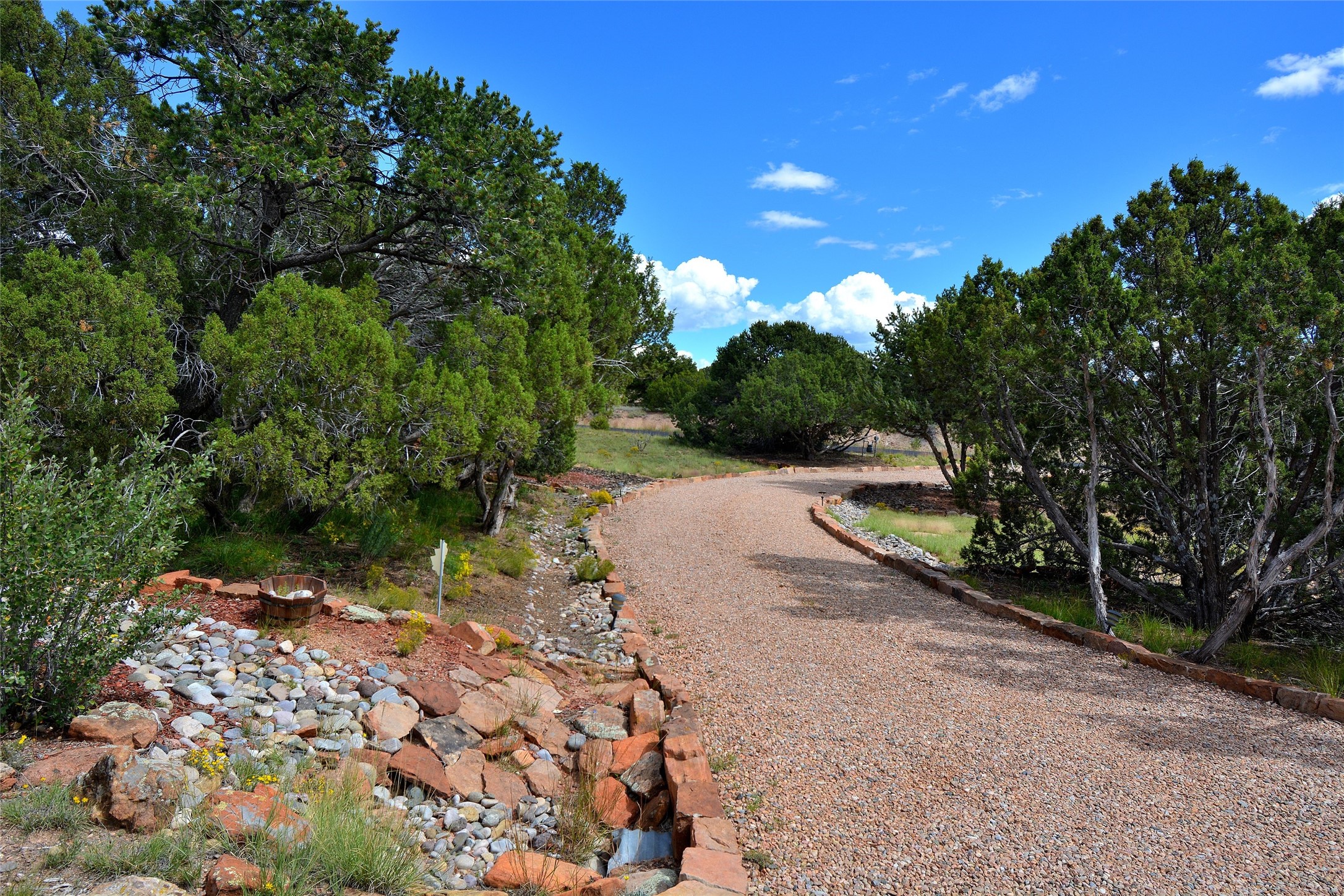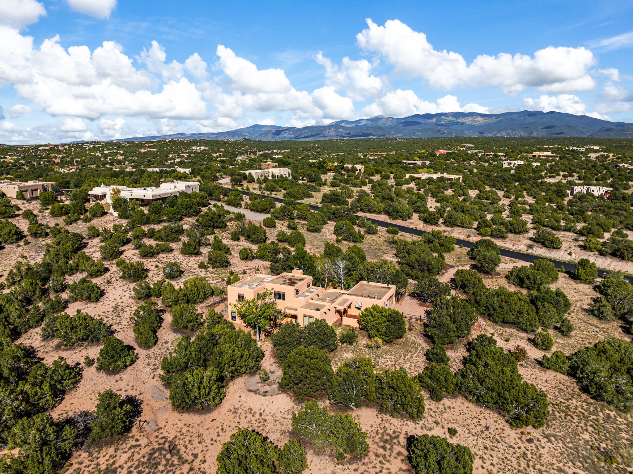 Nestled on two acres dotted with pion and juniper, this inviting Santa Fe-style home blends traditional charm with modern comforts. A gravel driveway leads to a graceful walkway, which in turn leads to a beautifully landscaped, enclosed front yard, The house features plastered walls, and the ground-level floors are adorned with traditional Saltillo tiles, except for the guest bedroom, which has carpet and an en-suite bathroom. The living and dining rooms feature soaring ceilings with vigas. A gas fireplace in the living room adds ambiance during cold winter nights.The kitchen, featuring skylights, granite countertops, and a gas cooktop, microwave, oven, and fridge/freezer, opens to a breakfast nook on one side, complete with its own private patio. Continuing from the breakfast nook, you enter the laundry and then the garage. On the other side of the kitchen is the dining room. The main level also features a second guest room or den with a nearby half-bath. The downstairs has in-floor radiant heat.Upstairs, the spacious main bedroom offers vigas, a second gas fireplace, radiant baseboard heat, and mountain views on one side and a deck on the other. The adjoining bath offers dual sinks, a Jacuzzi-style tub, a shower with seating, and a walk-in cedar closet.With an alarm system and thoughtful storage throughout, this home offers a blend of traditional Santa Fe style and practicality in a serene setting, just a couple of minutes drive to 599 and access to Santa Fe (approx.10 minutes) or to Los Alamos, the Santa Fe airport, and Albuquerque.Adjacent to the subdivision is the La Tierra open space of almost 1500 acres, offering 25 miles of walking trails.