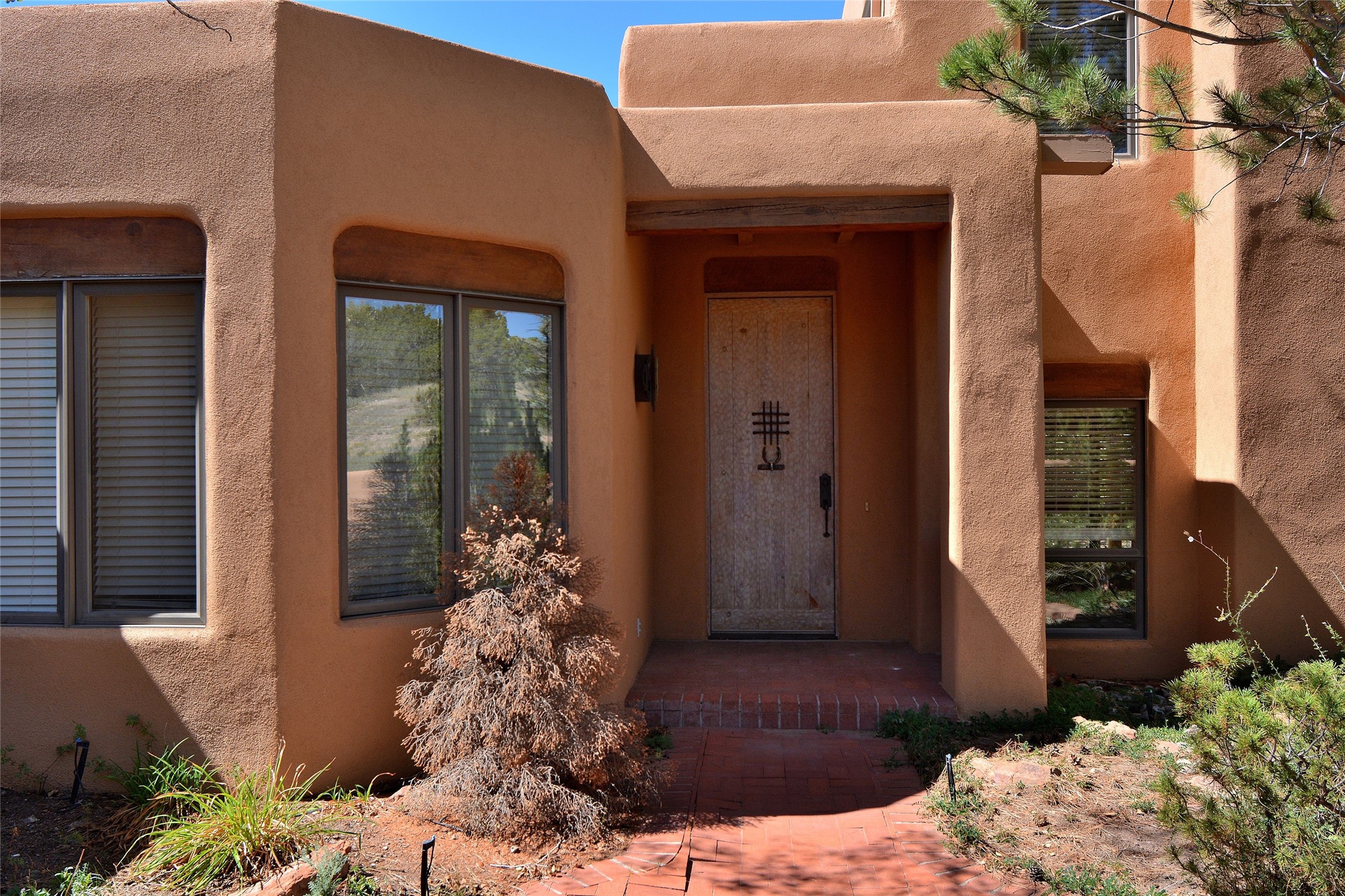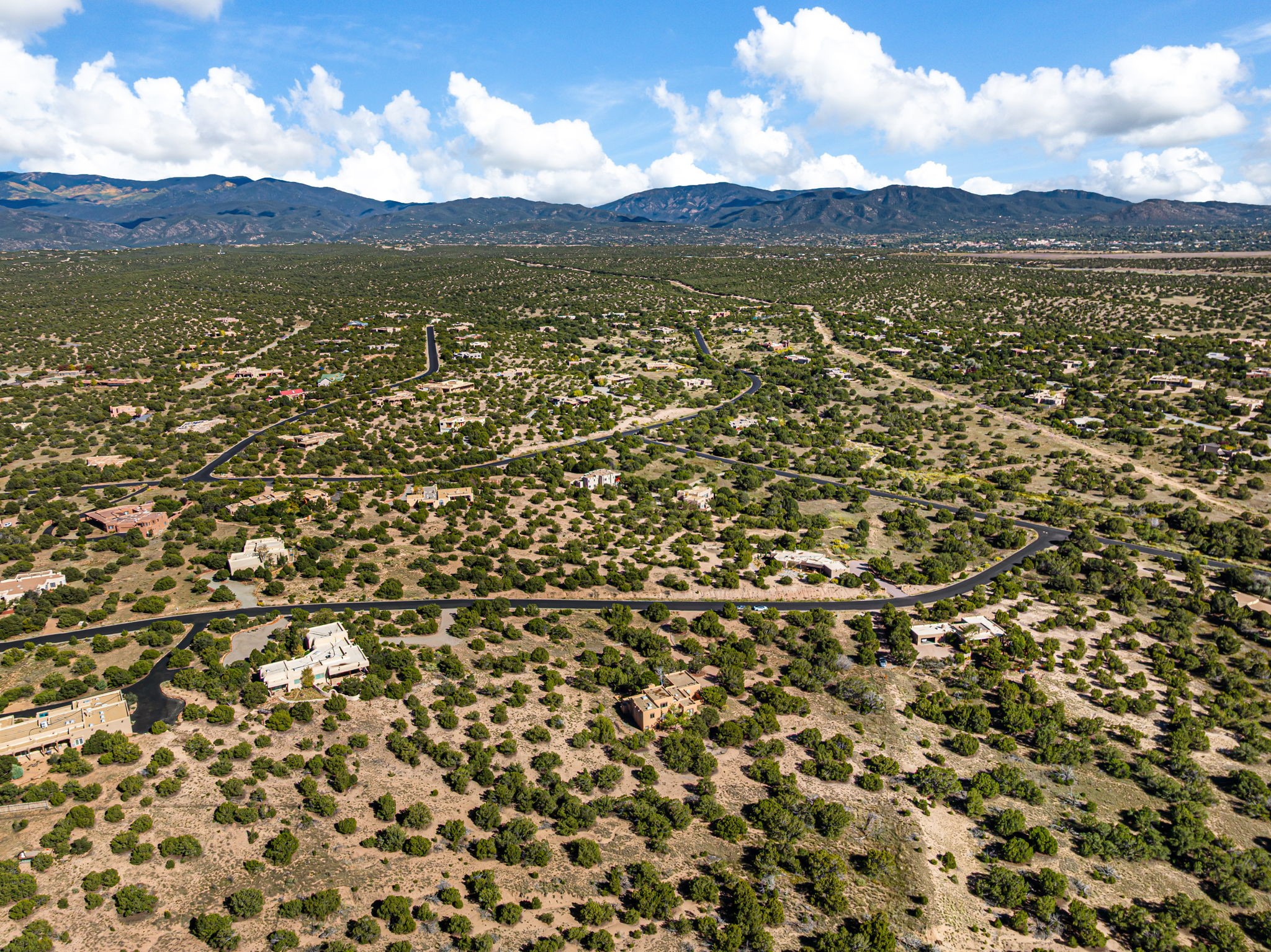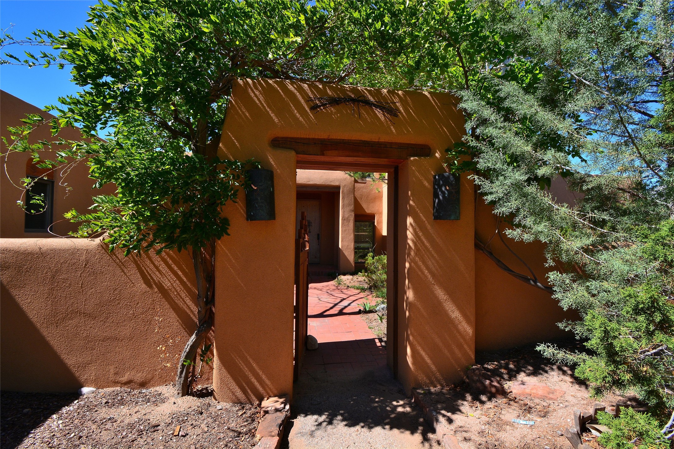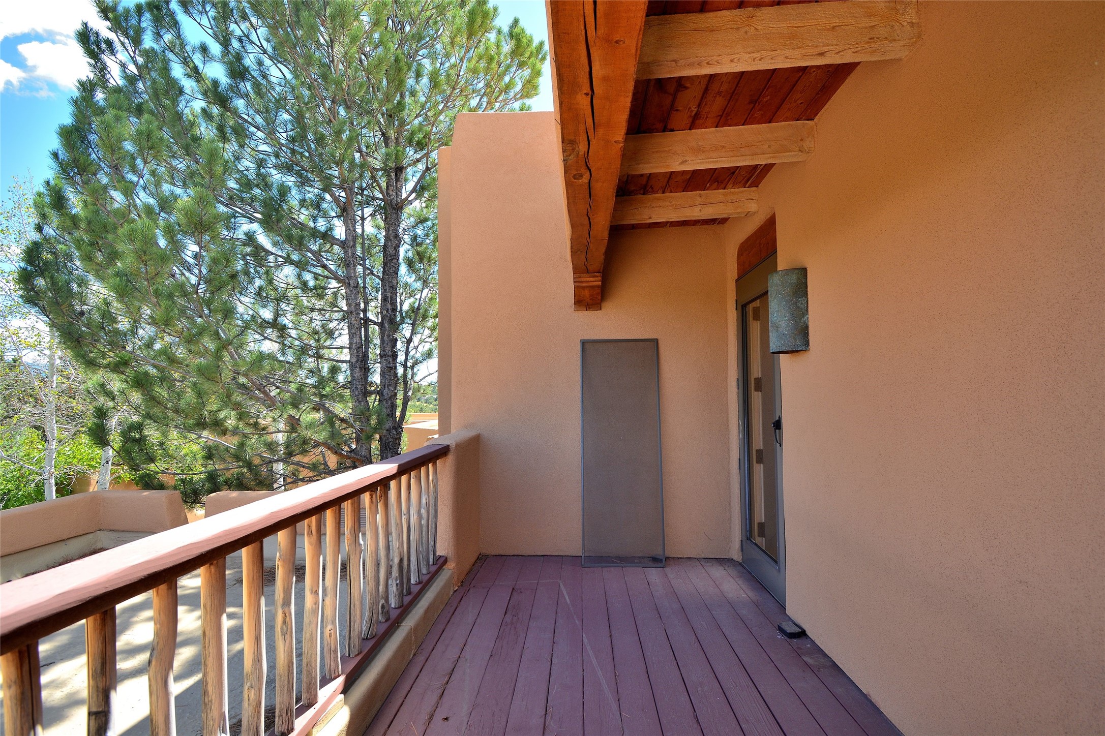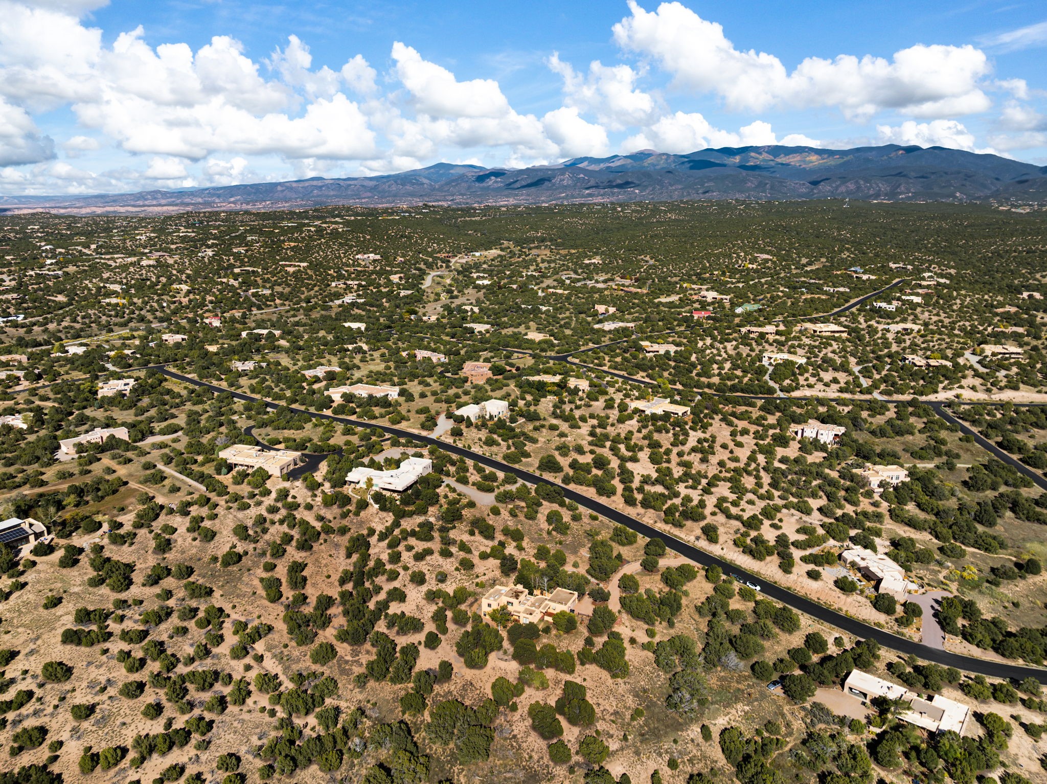 Nestled on two acres dotted with pion and juniper, this inviting Santa Fe-style home blends traditional charm with modern comforts. A gravel driveway leads to a graceful walkway, which in turn leads to a beautifully landscaped, enclosed front yard, The house features plastered walls, and the ground-level floors are adorned with traditional Saltillo tiles, except for the guest bedroom, which has carpet and an en-suite bathroom. The living and dining rooms feature soaring ceilings with vigas. A gas fireplace in the living room adds ambiance during cold winter nights.The kitchen, featuring skylights, granite countertops, and a gas cooktop, microwave, oven, and fridge/freezer, opens to a breakfast nook on one side, complete with its own private patio. Continuing from the breakfast nook, you enter the laundry and then the garage. On the other side of the kitchen is the dining room. The main level also features a second guest room or den with a nearby half-bath. The downstairs has in-floor radiant heat.Upstairs, the spacious main bedroom offers vigas, a second gas fireplace, radiant baseboard heat, and mountain views on one side and a deck on the other. The adjoining bath offers dual sinks, a Jacuzzi-style tub, a shower with seating, and a walk-in cedar closet.With an alarm system and thoughtful storage throughout, this home offers a blend of traditional Santa Fe style and practicality in a serene setting, just a couple of minutes drive to 599 and access to Santa Fe (approx.10 minutes) or to Los Alamos, the Santa Fe airport, and Albuquerque.Adjacent to the subdivision is the La Tierra open space of almost 1500 acres, offering 25 miles of walking trails.