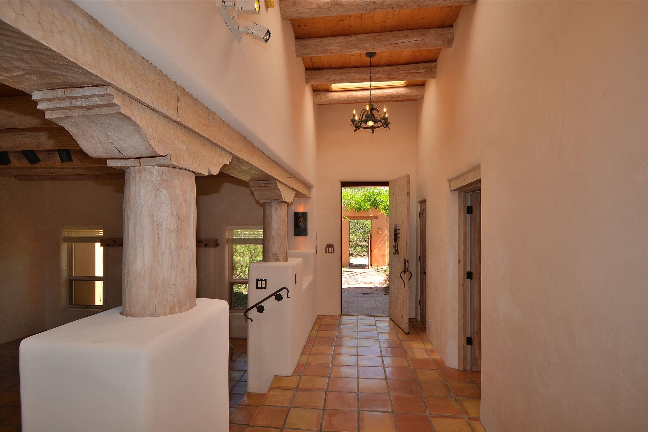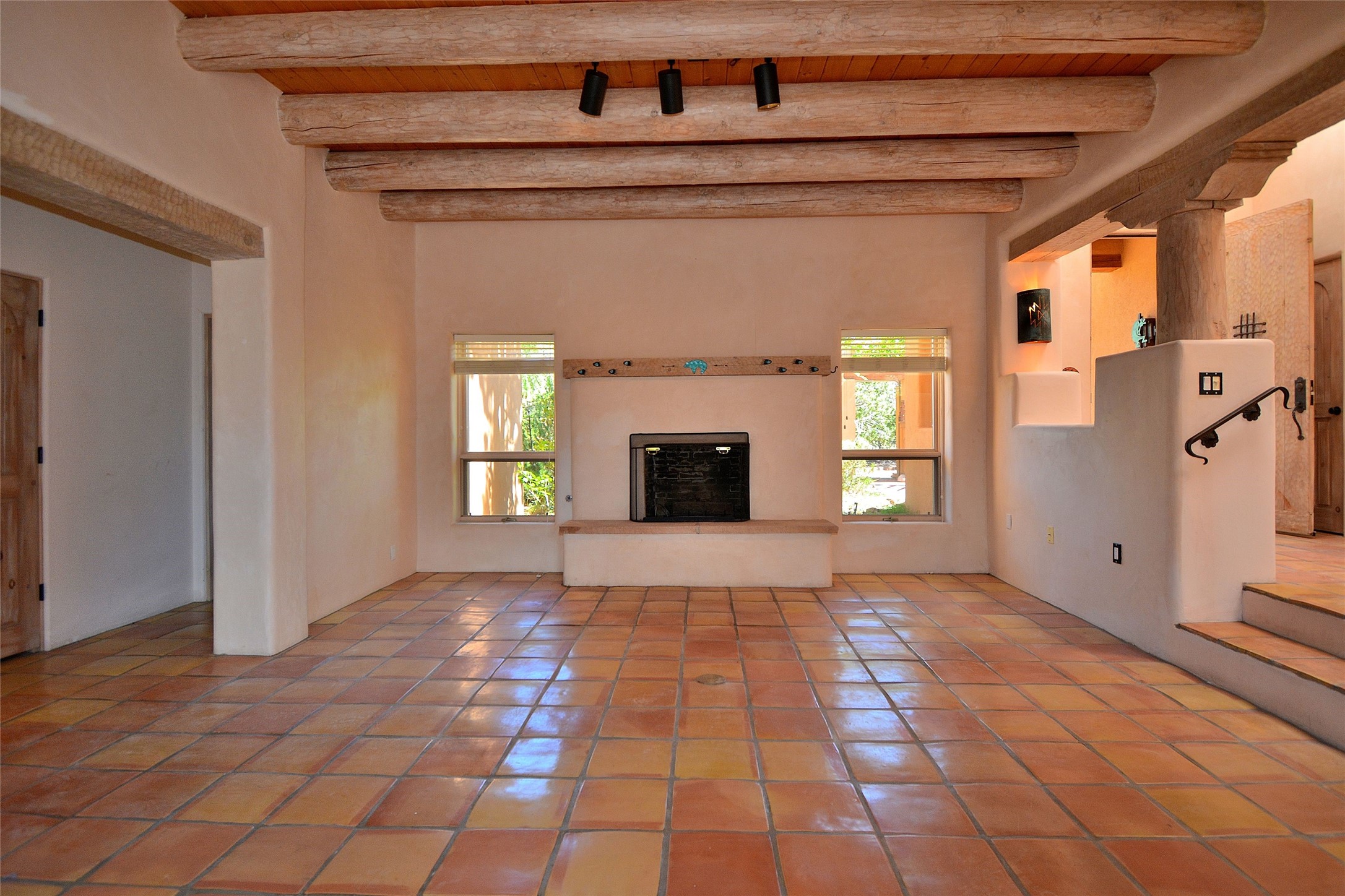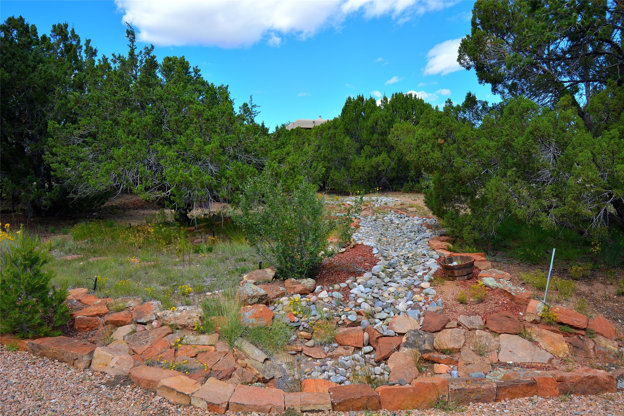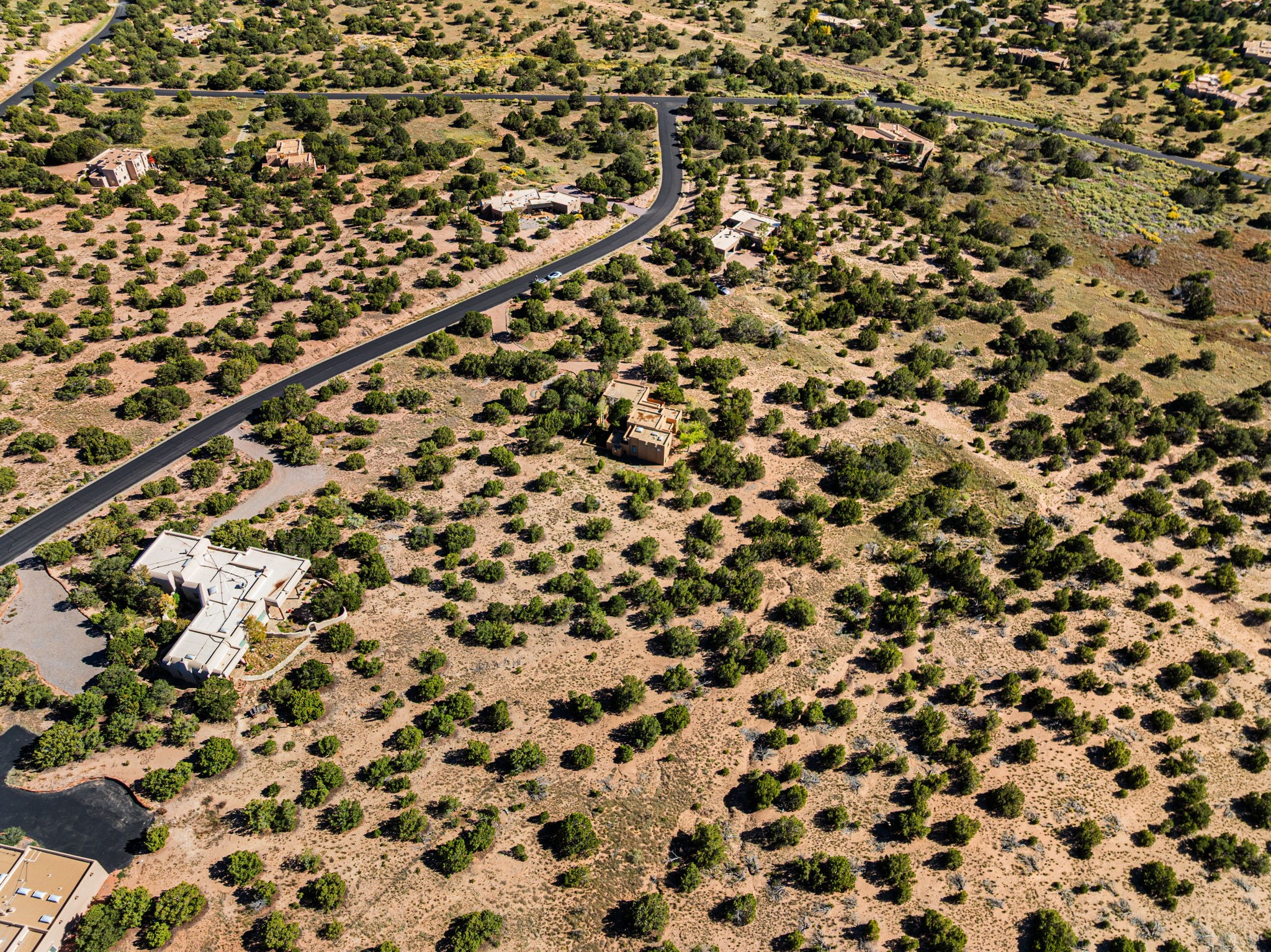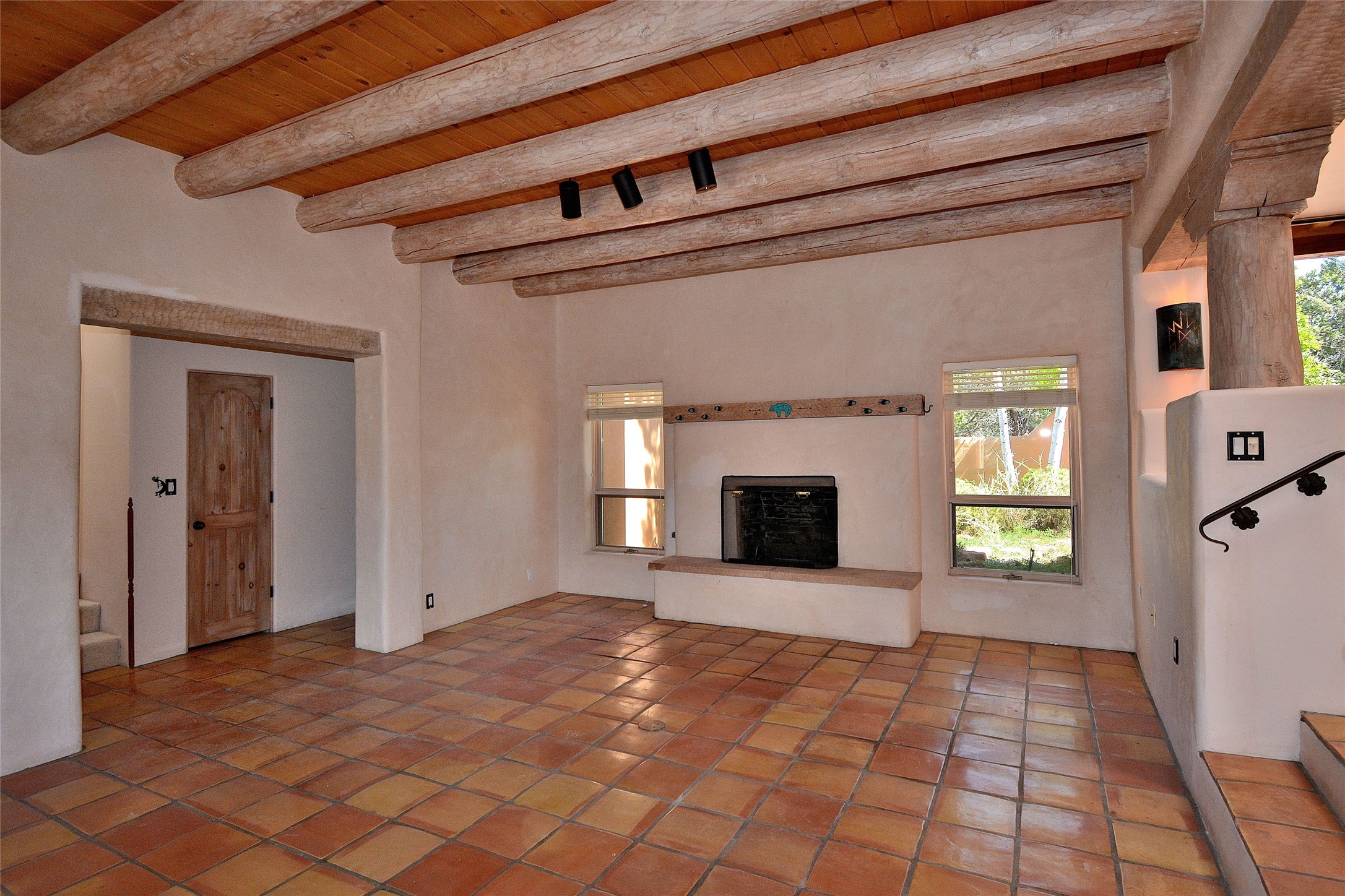 Nestled on two acres dotted with pion and juniper, this inviting Santa Fe-style home blends traditional charm with modern comforts. A gravel driveway leads to a graceful walkway, which in turn leads to a beautifully landscaped, enclosed front yard, The house features plastered walls, and the ground-level floors are adorned with traditional Saltillo tiles, except for the guest bedroom, which has carpet and an en-suite bathroom. The living and dining rooms feature soaring ceilings with vigas. A gas fireplace in the living room adds ambiance during cold winter nights.The kitchen, featuring skylights, granite countertops, and a gas cooktop, microwave, oven, and fridge/freezer, opens to a breakfast nook on one side, complete with its own private patio. Continuing from the breakfast nook, you enter the laundry and then the garage. On the other side of the kitchen is the dining room. The main level also features a second guest room or den with a nearby half-bath. The downstairs has in-floor radiant heat.Upstairs, the spacious main bedroom offers vigas, a second gas fireplace, radiant baseboard heat, and mountain views on one side and a deck on the other. The adjoining bath offers dual sinks, a Jacuzzi-style tub, a shower with seating, and a walk-in cedar closet.With an alarm system and thoughtful storage throughout, this home offers a blend of traditional Santa Fe style and practicality in a serene setting, just a couple of minutes drive to 599 and access to Santa Fe (approx.10 minutes) or to Los Alamos, the Santa Fe airport, and Albuquerque.Adjacent to the subdivision is the La Tierra open space of almost 1500 acres, offering 25 miles of walking trails.