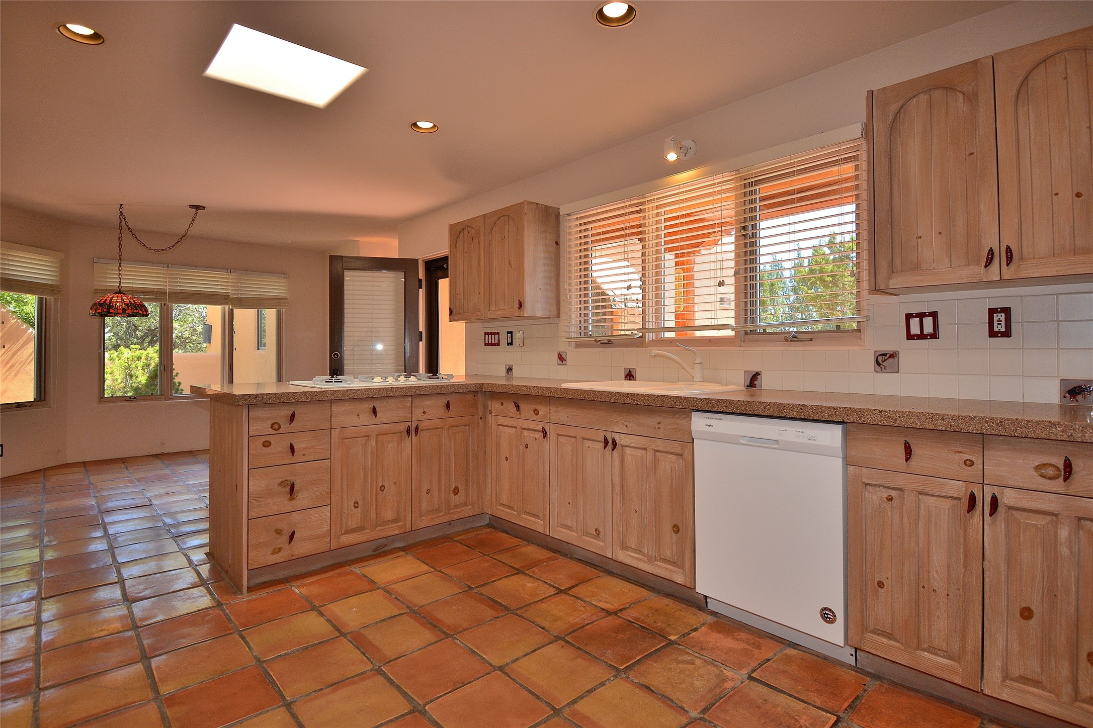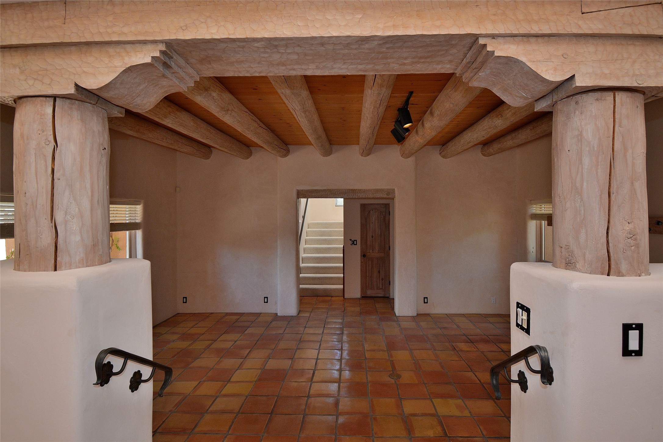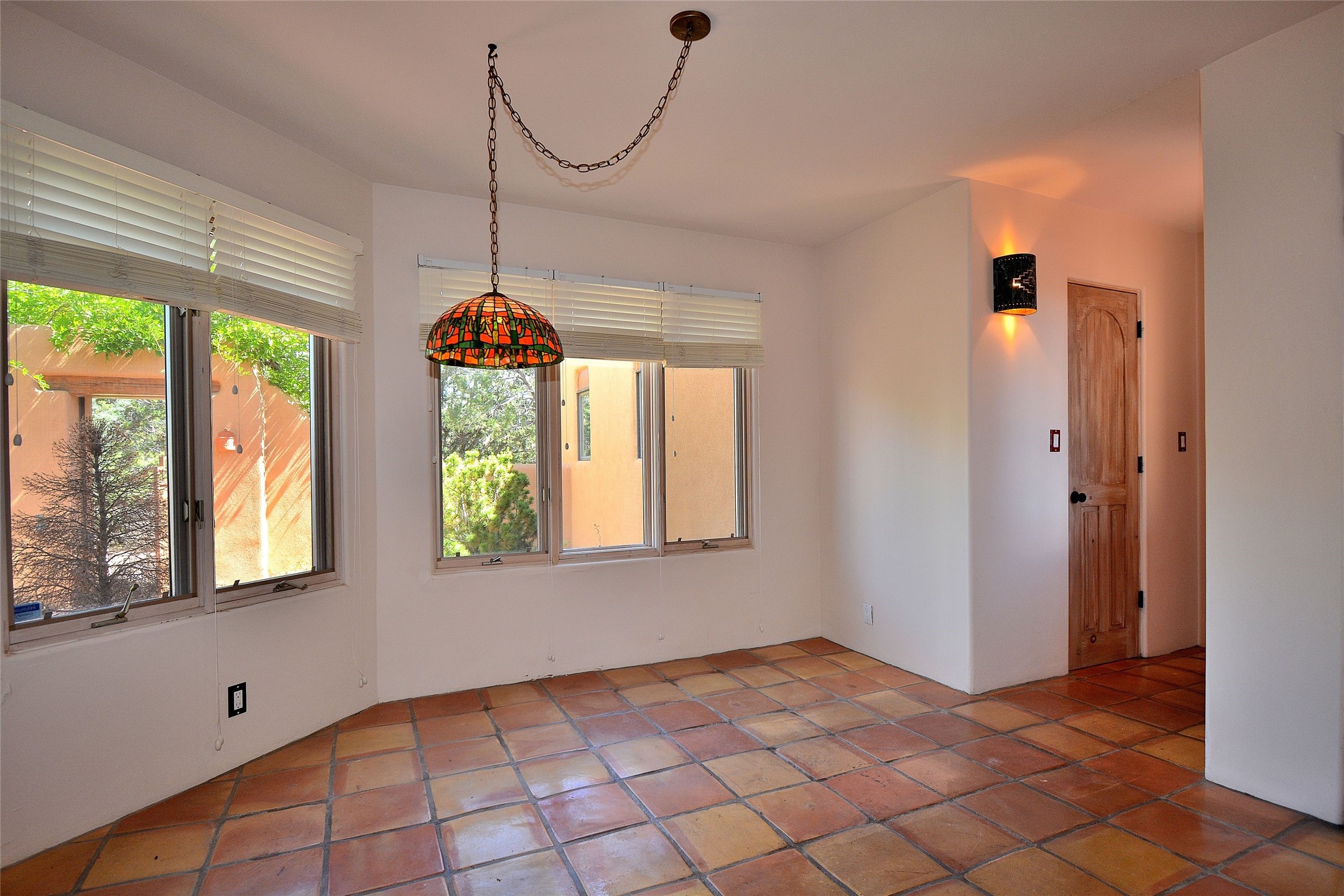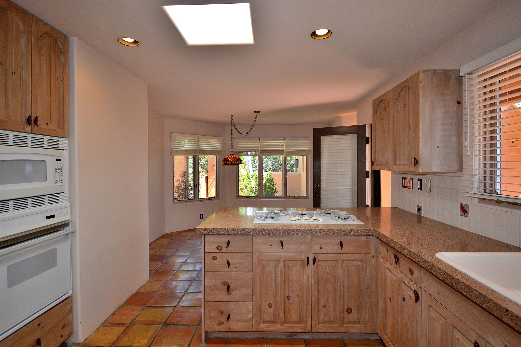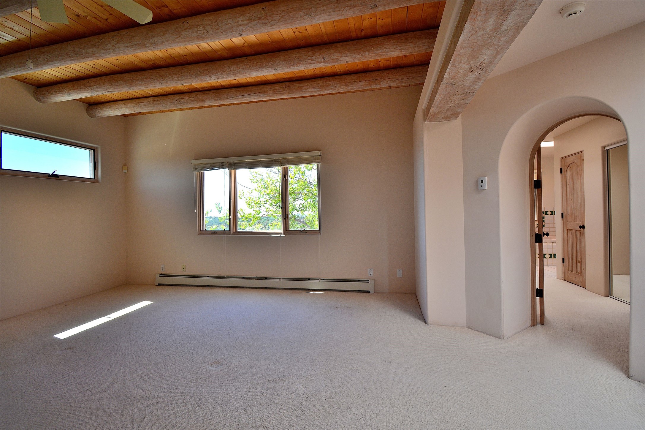 Nestled on two acres dotted with pion and juniper, this inviting Santa Fe-style home blends traditional charm with modern comforts. A gravel driveway leads to a graceful walkway, which in turn leads to a beautifully landscaped, enclosed front yard, The house features plastered walls, and the ground-level floors are adorned with traditional Saltillo tiles, except for the guest bedroom, which has carpet and an en-suite bathroom. The living and dining rooms feature soaring ceilings with vigas. A gas fireplace in the living room adds ambiance during cold winter nights.The kitchen, featuring skylights, granite countertops, and a gas cooktop, microwave, oven, and fridge/freezer, opens to a breakfast nook on one side, complete with its own private patio. Continuing from the breakfast nook, you enter the laundry and then the garage. On the other side of the kitchen is the dining room. The main level also features a second guest room or den with a nearby half-bath. The downstairs has in-floor radiant heat.Upstairs, the spacious main bedroom offers vigas, a second gas fireplace, radiant baseboard heat, and mountain views on one side and a deck on the other. The adjoining bath offers dual sinks, a Jacuzzi-style tub, a shower with seating, and a walk-in cedar closet.With an alarm system and thoughtful storage throughout, this home offers a blend of traditional Santa Fe style and practicality in a serene setting, just a couple of minutes drive to 599 and access to Santa Fe (approx.10 minutes) or to Los Alamos, the Santa Fe airport, and Albuquerque.Adjacent to the subdivision is the La Tierra open space of almost 1500 acres, offering 25 miles of walking trails.