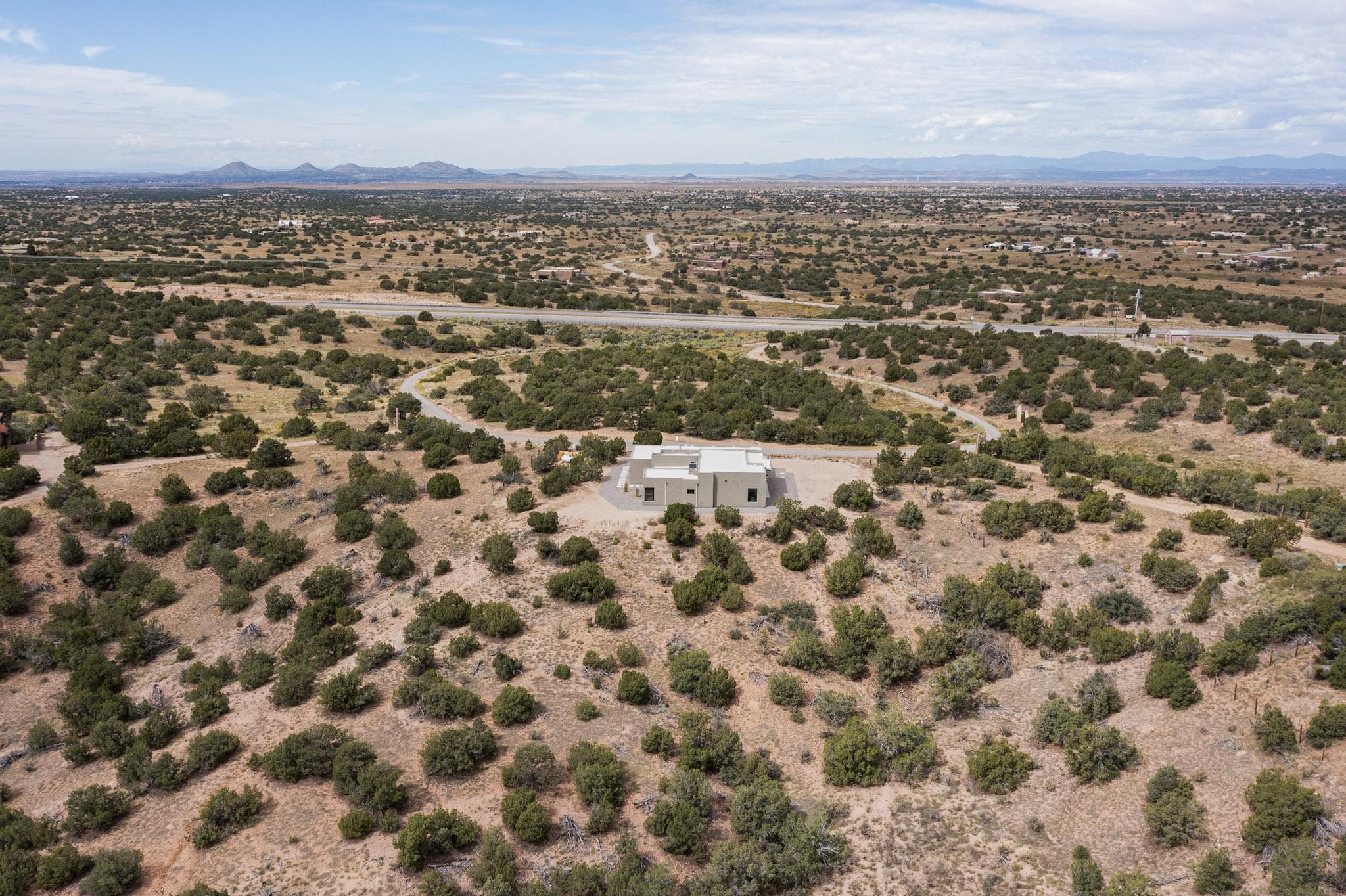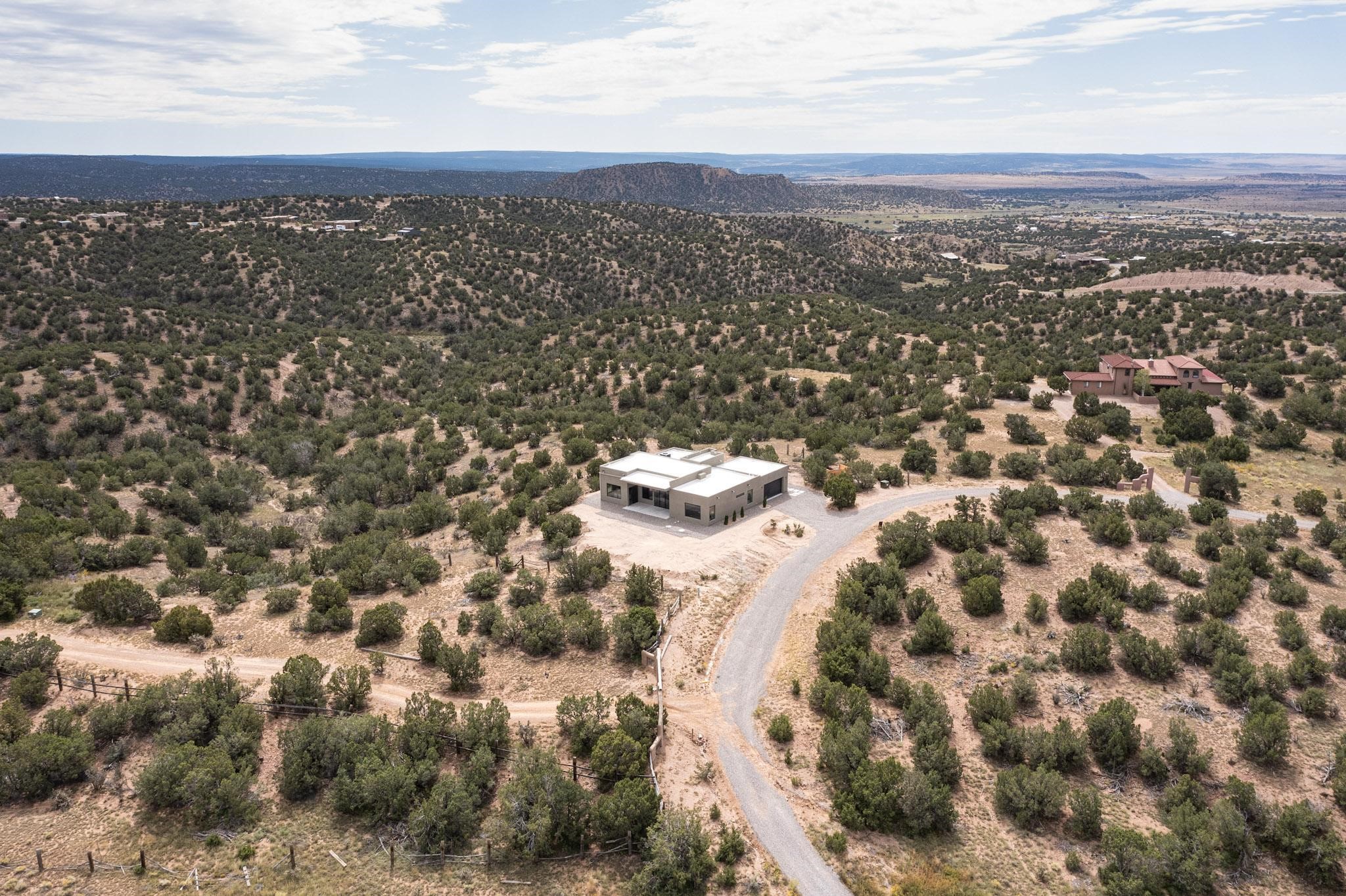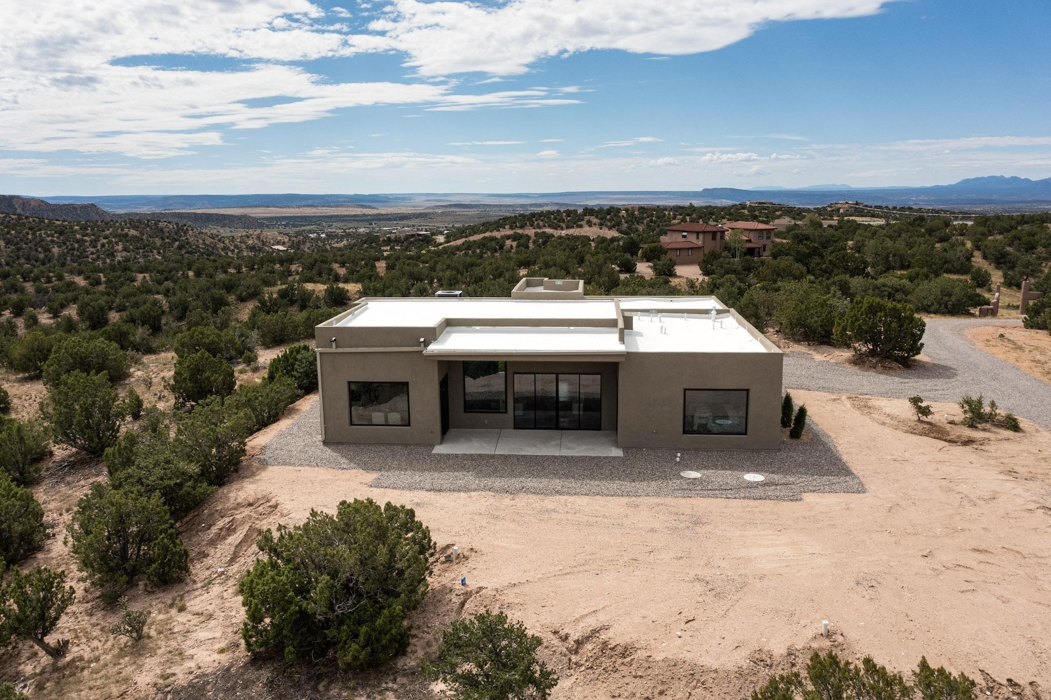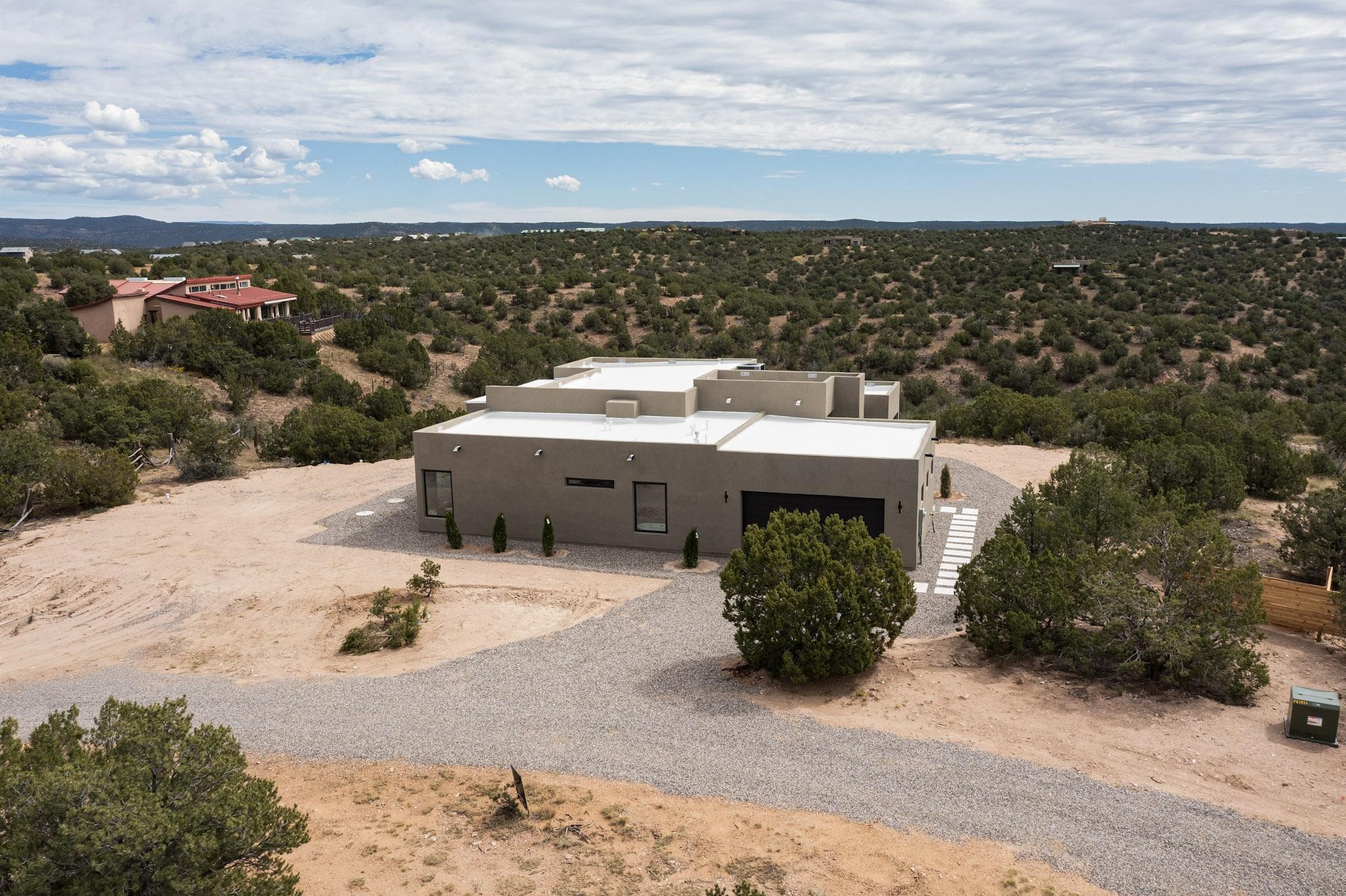 Just completed and ready for occupancy! Mountain views from every window in this new custom built contemporary pueblo style home with open floor plan situated on a huge 10.0 +/- ac. private lot in Lamy. Convenient access to US-285, the Agora shopping center, bank and restaurants. Perfect for indoor and outdoor entertaining. Open kitchen/family/dining room has floor to ceiling windows and double sliding glass doors to take in the fabulous views and access to the portal. The contemporary kitchen has a huge island bar and large walk in pantry. Every room has large picture windows with fabulous mountain views. Owner's bath has double sinks, soaking tub and large walk in shower room with double shower heads and rain showers and a large walk in closet. Home features contemporary style vigas in living areas. Three bedrooms with good separation and 2 baths. A guest house and equestrian structures are allowed, as well as 10 horses or cattle. (1 large animal per acre.) No HOA, recreational vehicles are allowed if parked inconspicuously. Connected to the Eldorado community water system. Located only 20 minutes from Downtown Santa Fe this home offers gorgeous views, rural living and easy access to everything Santa Fe has to offer. This home has it all; new home, fabulous views, great outdoor spaces, contemporary open floor plan, large private lot. Buyer to verify all information and Covenants. Seller gives $4000 credit to the buyer at closing for Range, dishwasher and microwave. Open House Sunday, Nov 23. 1:00 - 4:00 PM.