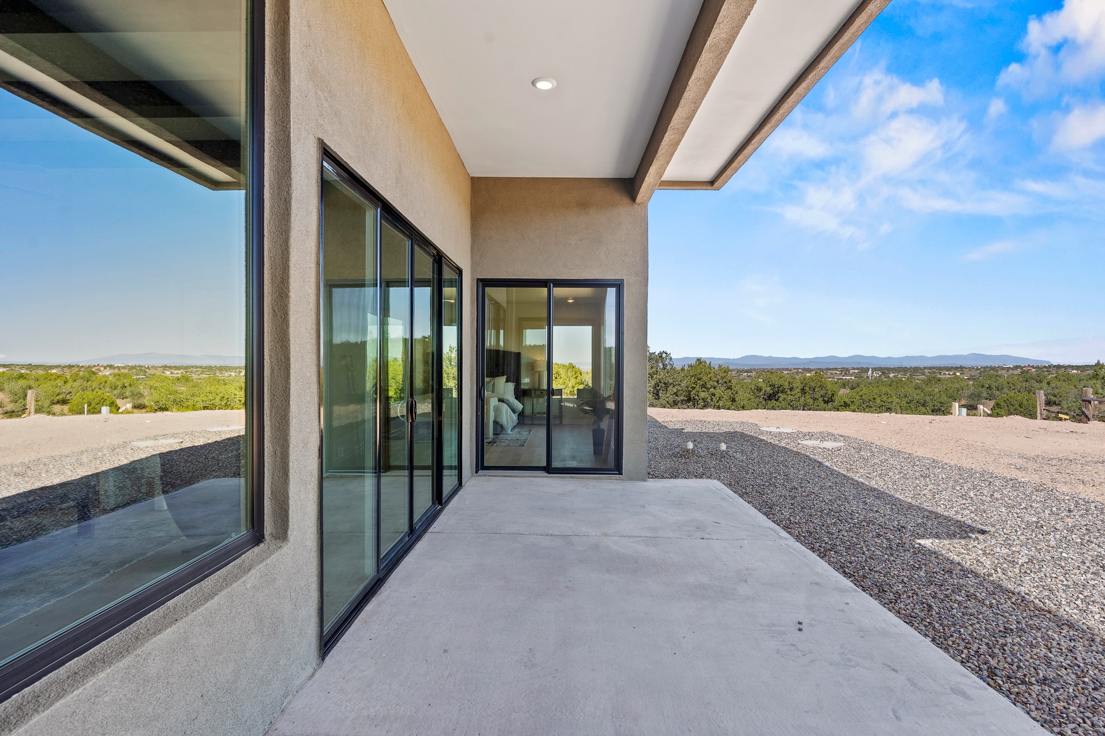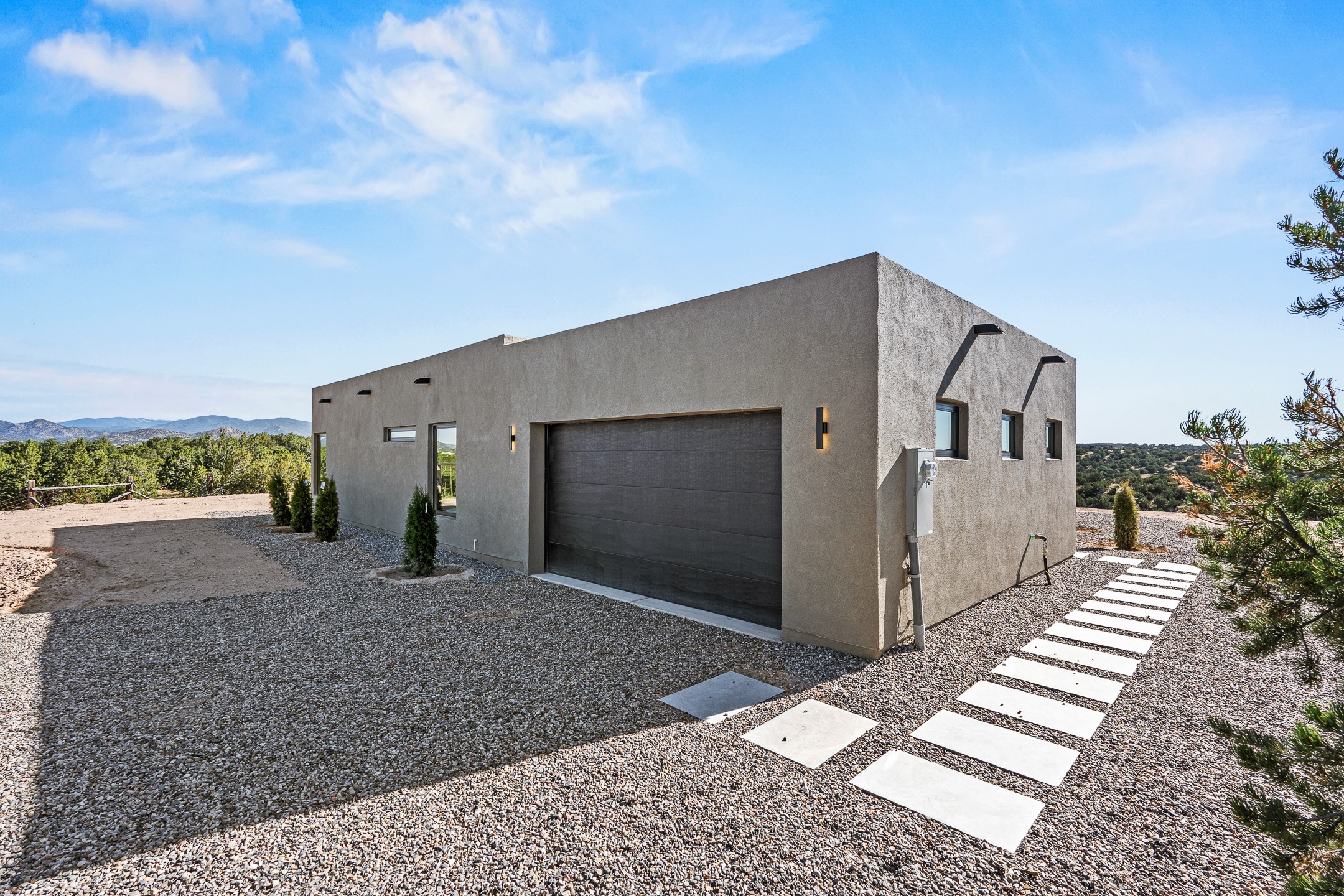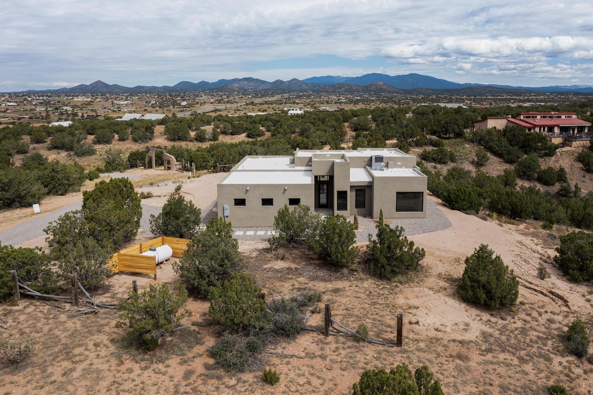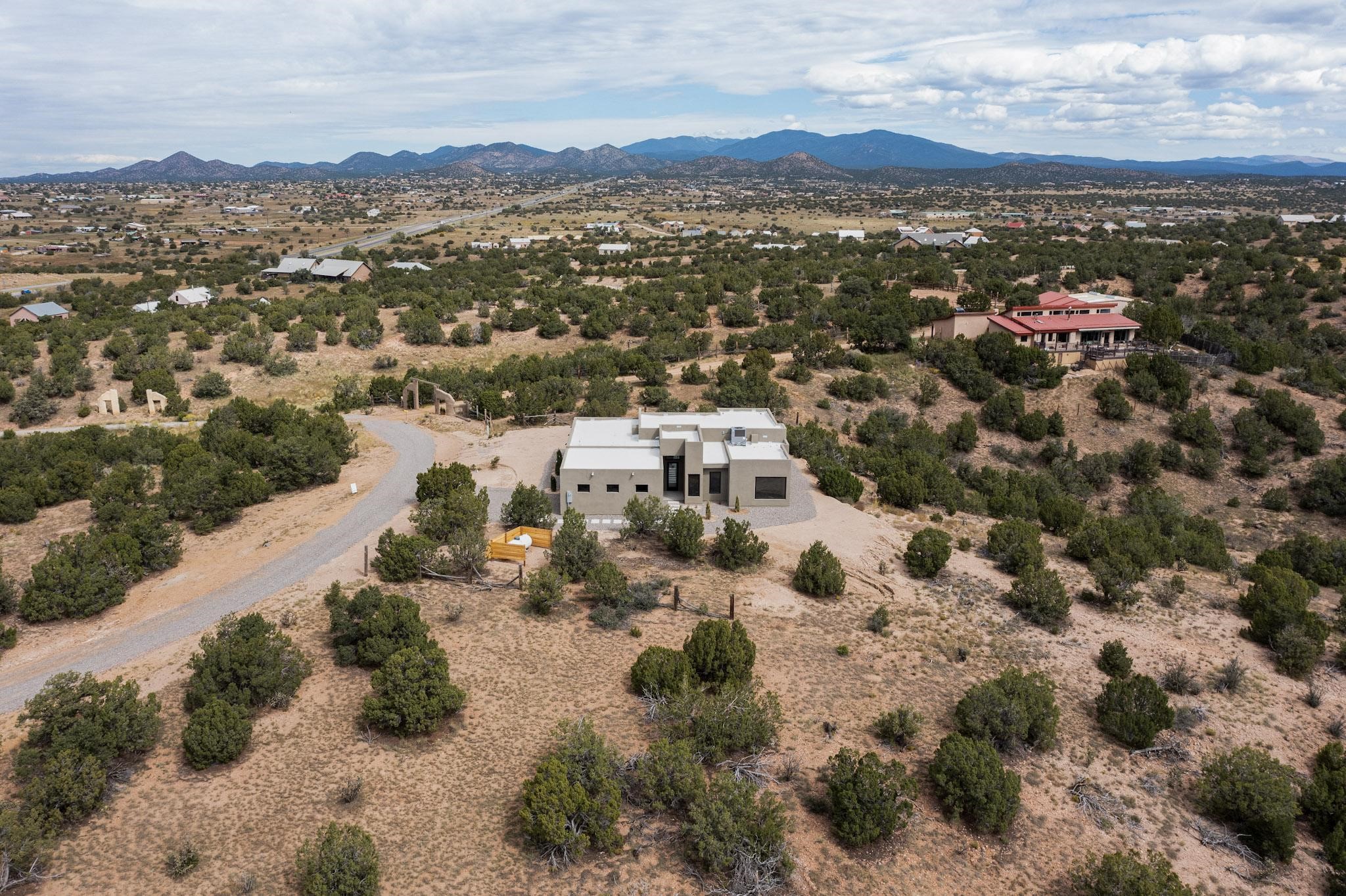 Just completed and ready for occupancy! Mountain views from every window in this new custom built contemporary pueblo style home with open floor plan situated on a huge 10.0 +/- ac. private lot in Lamy. Convenient access to US-285, the Agora shopping center, bank and restaurants. Perfect for indoor and outdoor entertaining. Open kitchen/family/dining room has floor to ceiling windows and double sliding glass doors to take in the fabulous views and access to the portal. The contemporary kitchen has a huge island bar and large walk in pantry. Every room has large picture windows with fabulous mountain views. Owner's bath has double sinks, soaking tub and large walk in shower room with double shower heads and rain showers and a large walk in closet. Home features contemporary style vigas in living areas. Three bedrooms with good separation and 2 baths. A guest house and equestrian structures are allowed, as well as 10 horses or cattle. (1 large animal per acre.) No HOA, recreational vehicles are allowed if parked inconspicuously. Connected to the Eldorado community water system. Located only 20 minutes from Downtown Santa Fe this home offers gorgeous views, rural living and easy access to everything Santa Fe has to offer. This home has it all; new home, fabulous views, great outdoor spaces, contemporary open floor plan, large private lot. Buyer to verify all information and Covenants. Seller gives $4000 credit to the buyer at closing for Range, dishwasher and microwave. Open House Sunday, Nov 23. 1:00 - 4:00 PM.