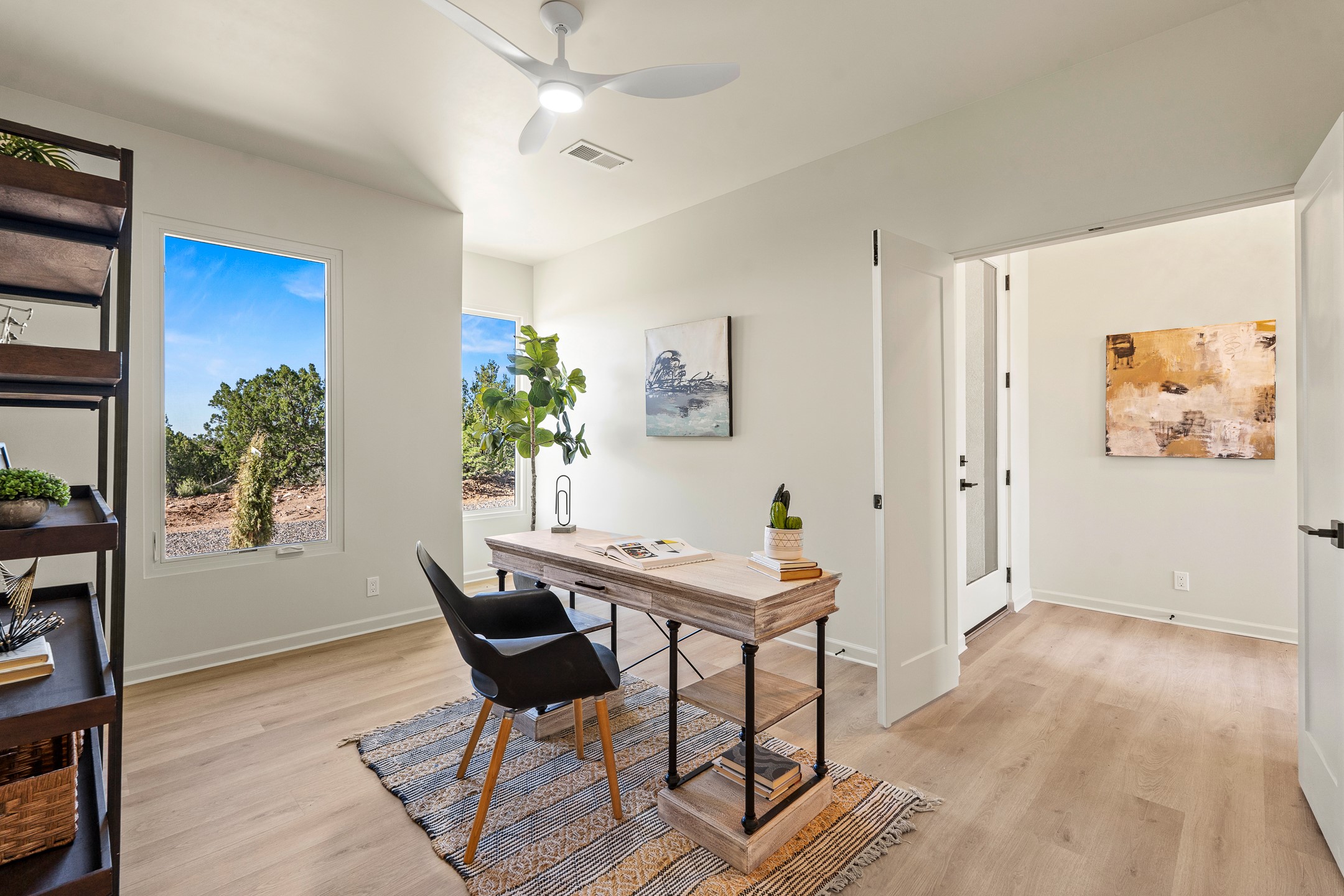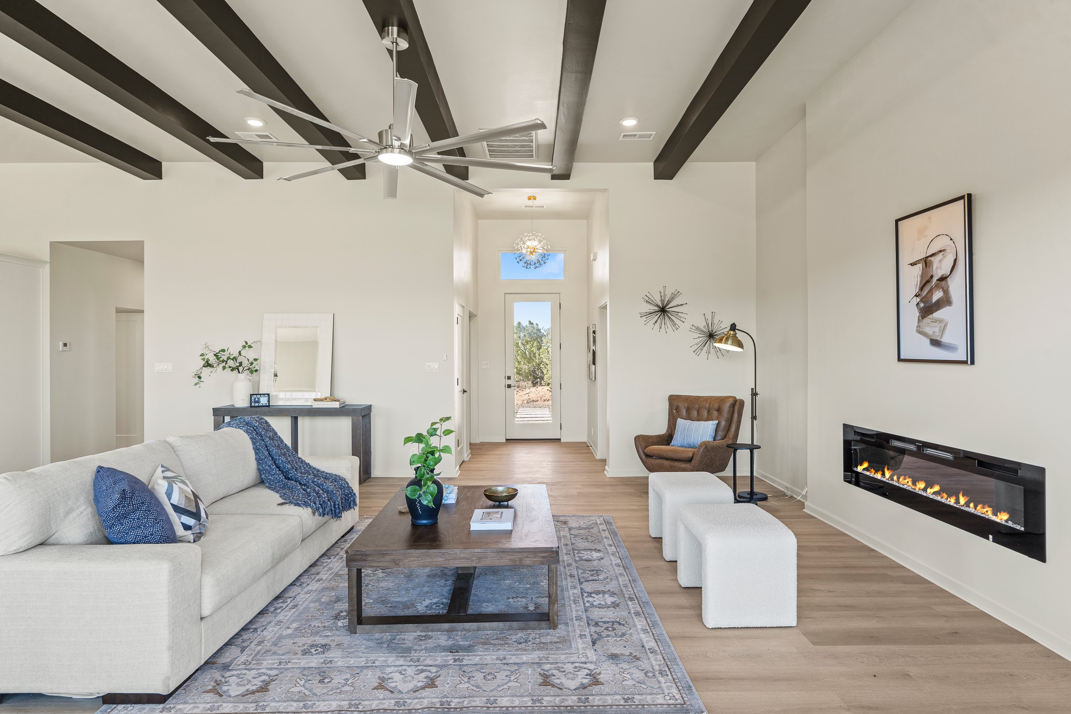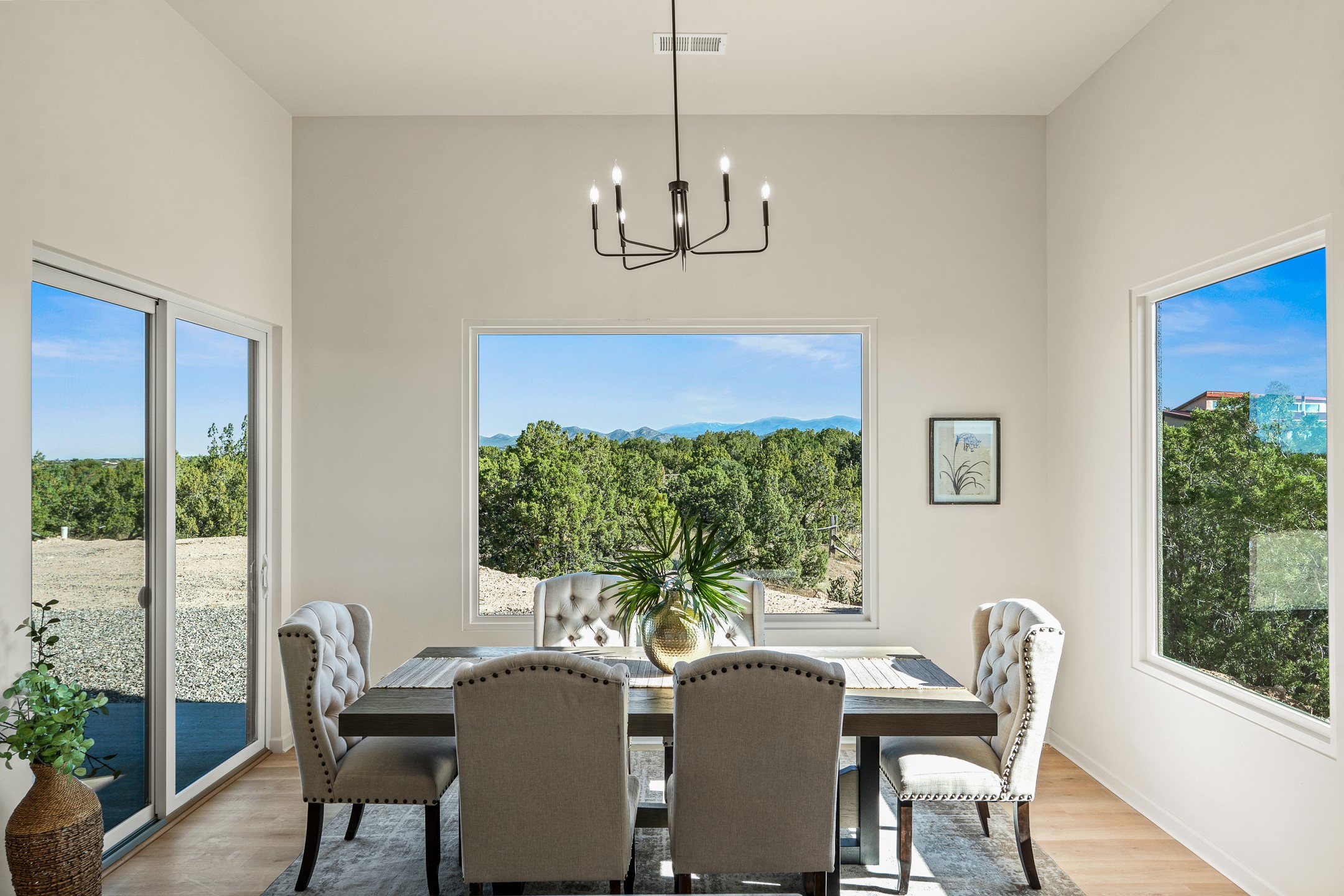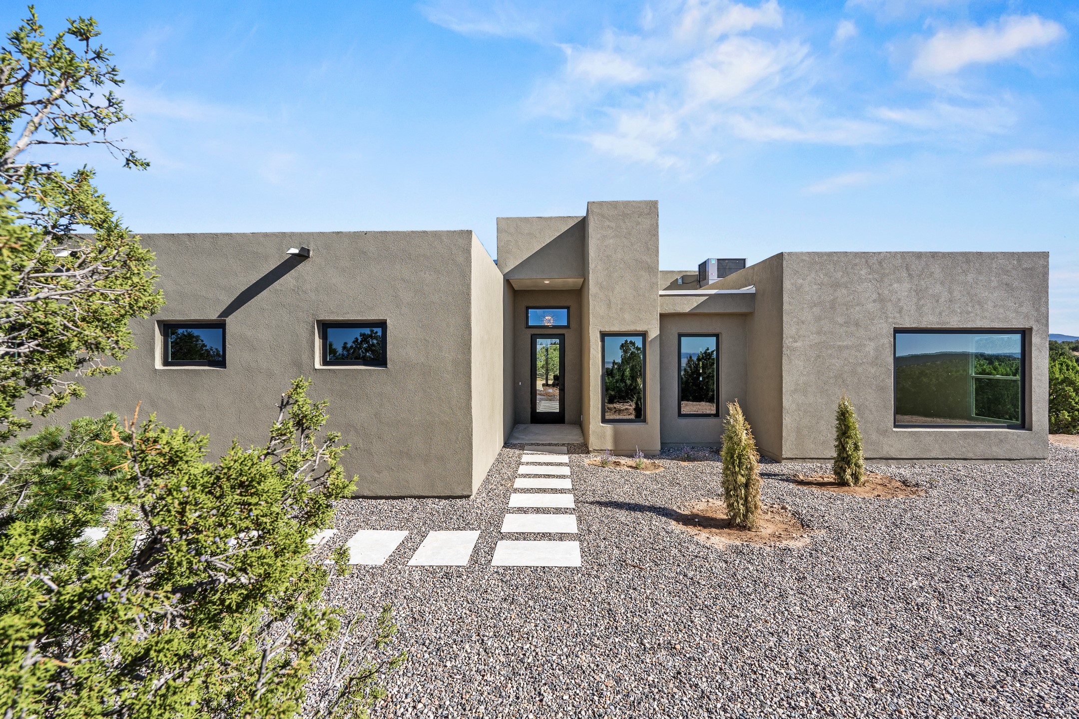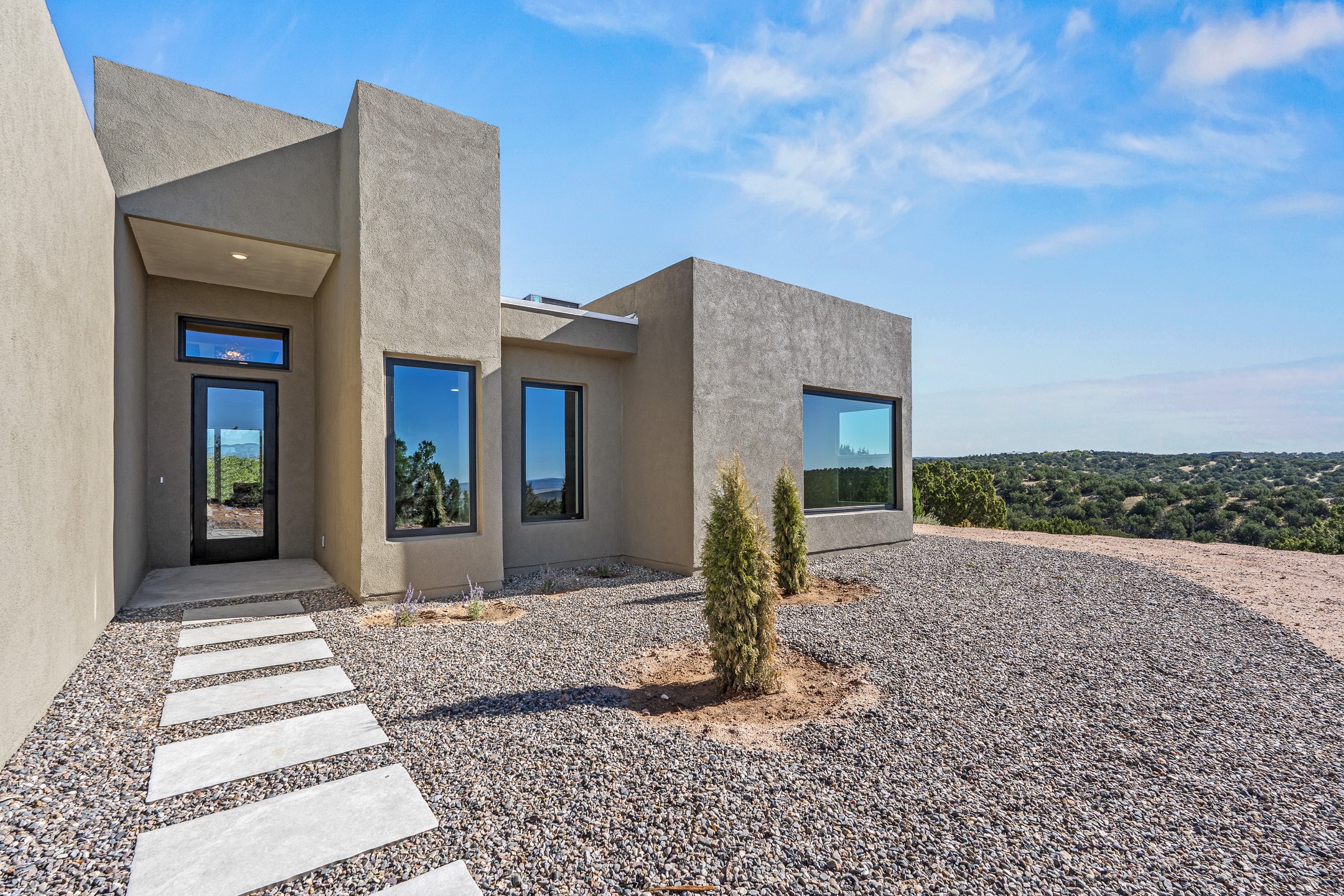 Just completed and ready for occupancy! Mountain views from every window in this new custom built contemporary pueblo style home with open floor plan situated on a huge 10.0 +/- ac. private lot in Lamy. Convenient access to US-285, the Agora shopping center, bank and restaurants. Perfect for indoor and outdoor entertaining. Open kitchen/family/dining room has floor to ceiling windows and double sliding glass doors to take in the fabulous views and access to the portal. The contemporary kitchen has a huge island bar and large walk in pantry. Every room has large picture windows with fabulous mountain views. Owner's bath has double sinks, soaking tub and large walk in shower room with double shower heads and rain showers and a large walk in closet. Home features contemporary style vigas in living areas. Three bedrooms with good separation and 2 baths. A guest house and equestrian structures are allowed, as well as 10 horses or cattle. (1 large animal per acre.) No HOA, recreational vehicles are allowed if parked inconspicuously. Connected to the Eldorado community water system. Located only 20 minutes from Downtown Santa Fe this home offers gorgeous views, rural living and easy access to everything Santa Fe has to offer. This home has it all; new home, fabulous views, great outdoor spaces, contemporary open floor plan, large private lot. Buyer to verify all information and Covenants. Seller gives $4000 credit to the buyer at closing for Range, dishwasher and microwave. Open House Sunday, Nov 23. 1:00 - 4:00 PM.