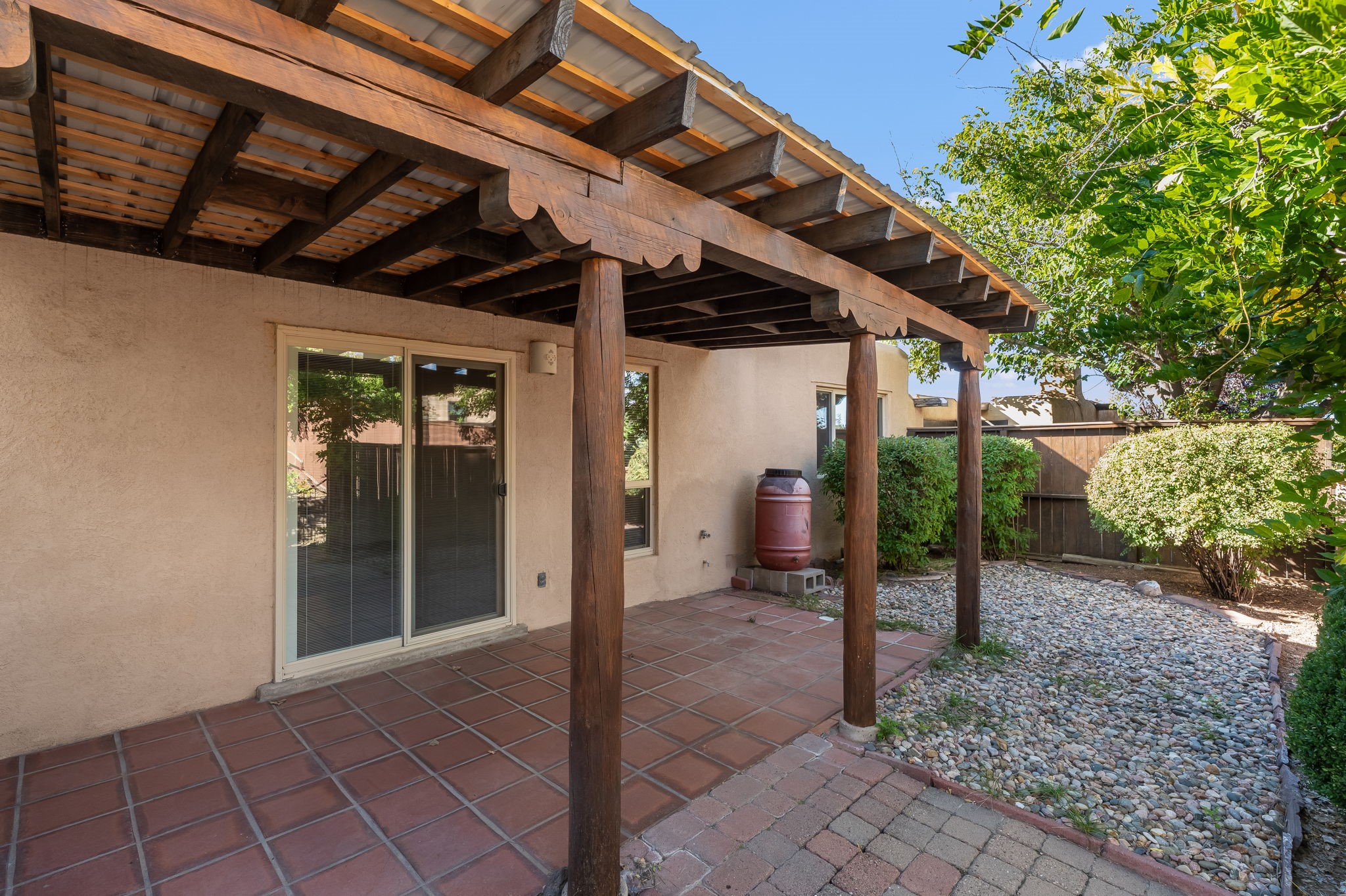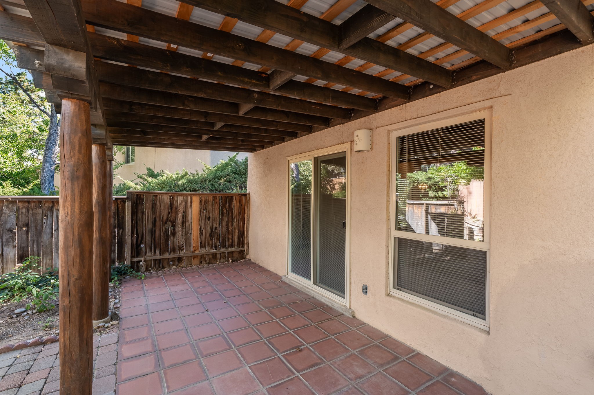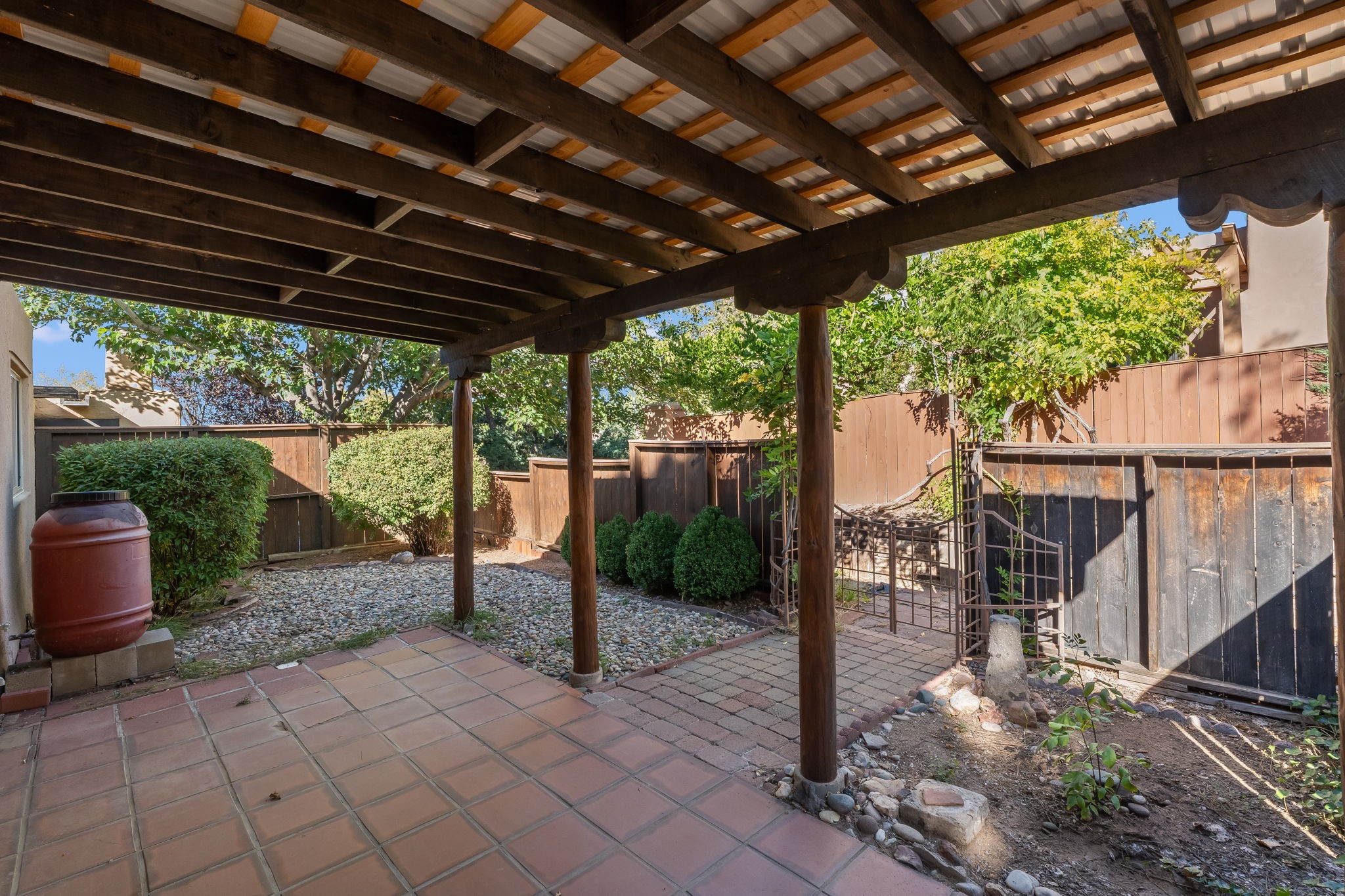 Welcome home to this beautifully refreshed single-story townhouse offering 2 bedrooms, an office, and timeless Santa Fe charm. Step through the inviting blue gate into a brick courtyard, where a sense of warmth and tranquility sets the tone for what's inside.Freshly painted throughout and featuring new laminate flooring, this home is move-in ready and thoughtfully designed for both comfort and style. Just off the entry hall, you'll find a versatile office--perfect for working from home or creative pursuits.The living room is a true highlight, showcasing a beamed ceiling, corner Kiva fireplace, and sliding doors that open to a spacious covered portal overlooking the backyard. A charming little gate leads directly to a neighborhood walking path, ideal for morning strolls or evening walks.The galley kitchen features tile floors, newer appliances, and a cozy breakfast area filled with natural light. The second bedroom includes a walk-in closet, while the generous primary suite offers a large picture window, walk-in closet, and a private bath.Outside, a detached two-car garage provides convenience and extra storage.Located in Park Plazas, one of Santa Fe's most beloved communities, residents enjoy miles of walking trails, tennis courts, an off-leash dog park, and a community garden--all just minutes from shopping, restaurants, and the Santa Fe Plaza.This home beautifully combines authentic Santa Fe character with modern updates and an unbeatable location. Come see why Park Plazas living is so special!
