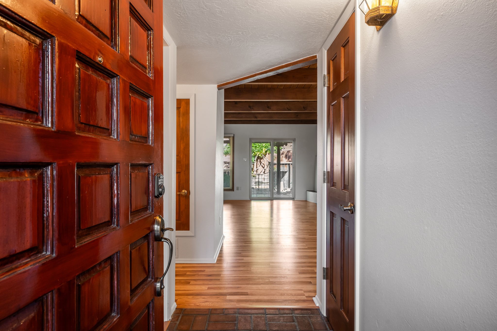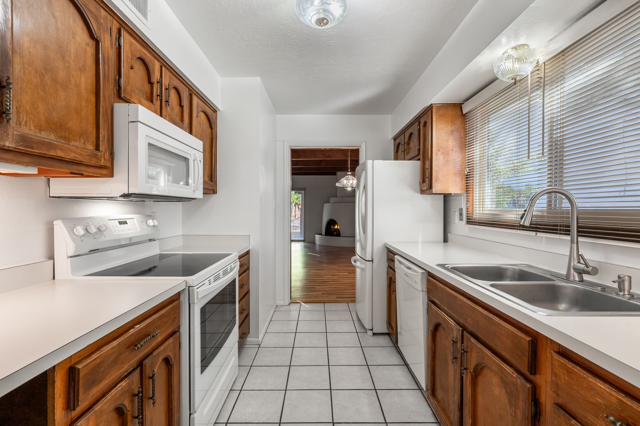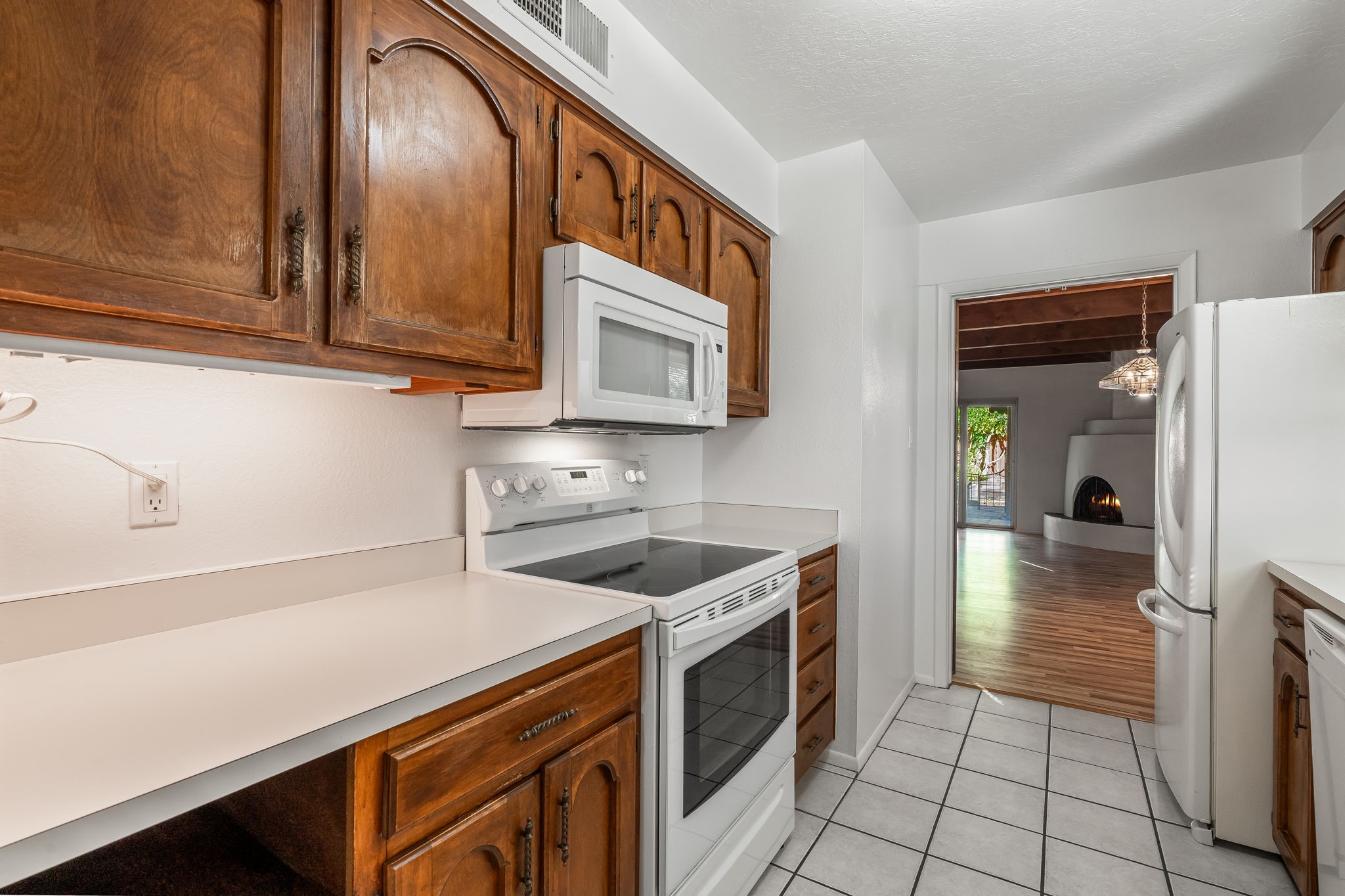 Welcome home to this beautifully refreshed single-story townhouse offering 2 bedrooms, an office, and timeless Santa Fe charm. Step through the inviting blue gate into a brick courtyard, where a sense of warmth and tranquility sets the tone for what's inside.Freshly painted throughout and featuring new laminate flooring, this home is move-in ready and thoughtfully designed for both comfort and style. Just off the entry hall, you'll find a versatile office--perfect for working from home or creative pursuits.The living room is a true highlight, showcasing a beamed ceiling, corner Kiva fireplace, and sliding doors that open to a spacious covered portal overlooking the backyard. A charming little gate leads directly to a neighborhood walking path, ideal for morning strolls or evening walks.The galley kitchen features tile floors, newer appliances, and a cozy breakfast area filled with natural light. The second bedroom includes a walk-in closet, while the generous primary suite offers a large picture window, walk-in closet, and a private bath.Outside, a detached two-car garage provides convenience and extra storage.Located in Park Plazas, one of Santa Fe's most beloved communities, residents enjoy miles of walking trails, tennis courts, an off-leash dog park, and a community garden--all just minutes from shopping, restaurants, and the Santa Fe Plaza.This home beautifully combines authentic Santa Fe character with modern updates and an unbeatable location. Come see why Park Plazas living is so special!