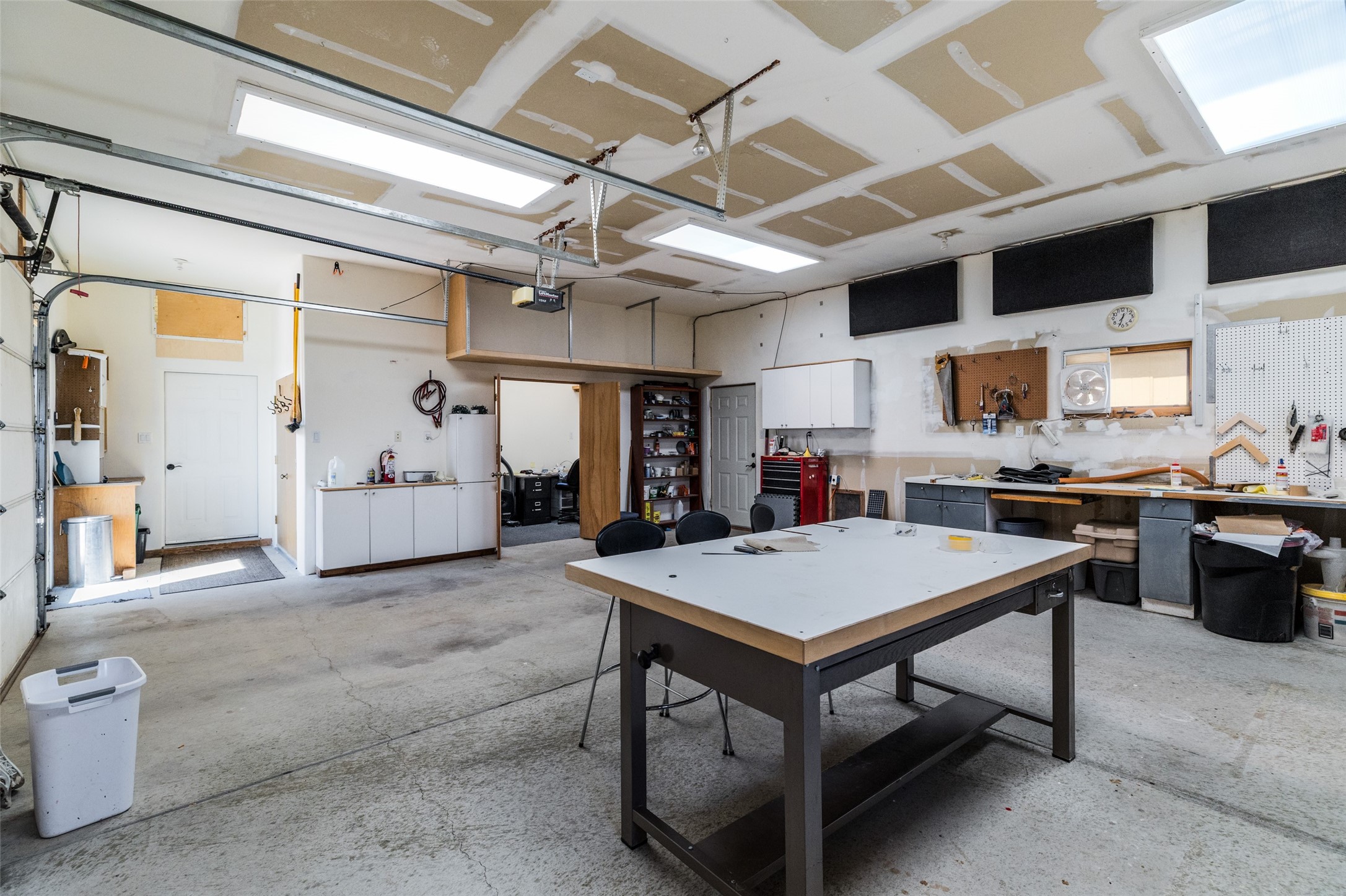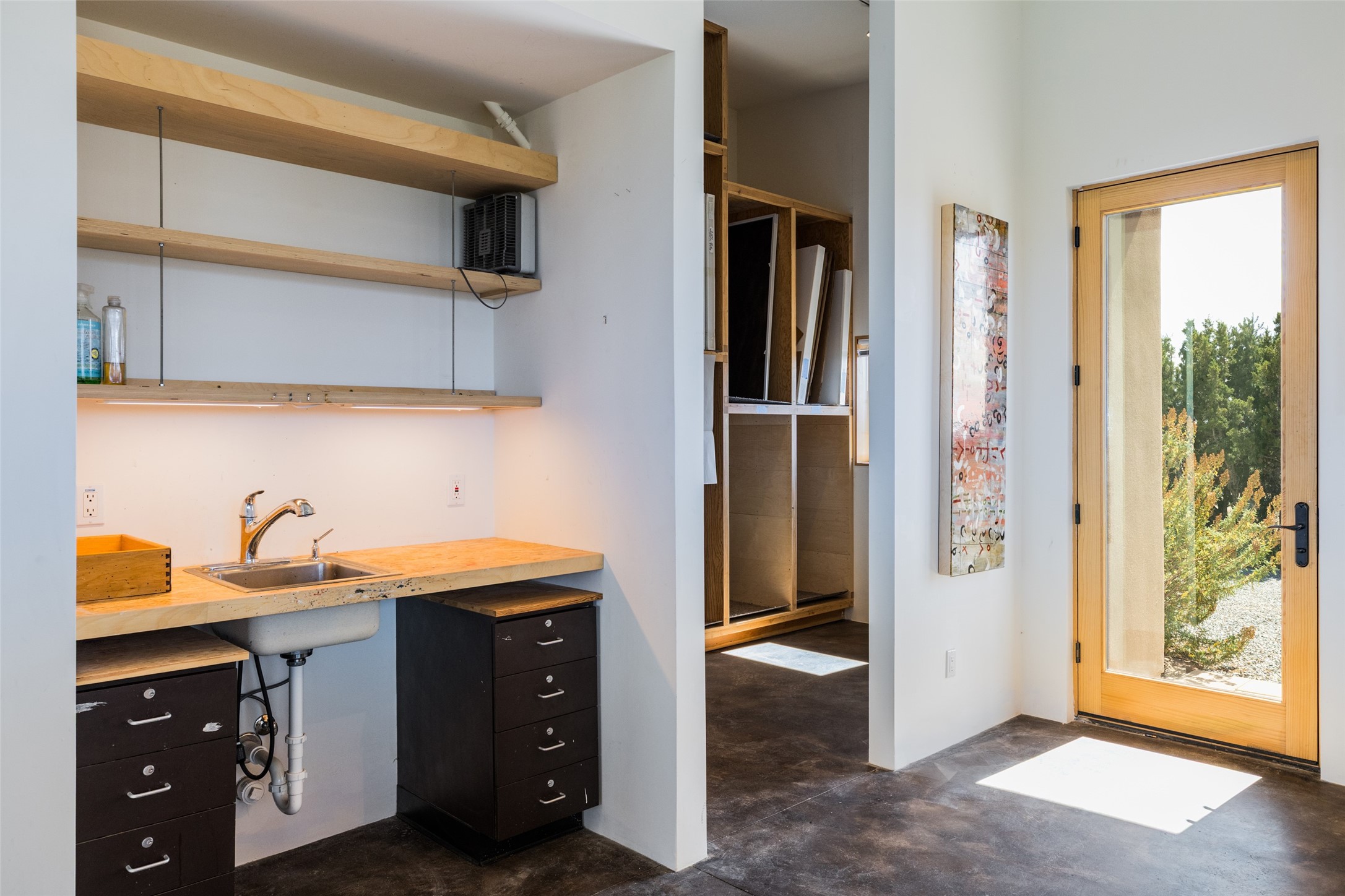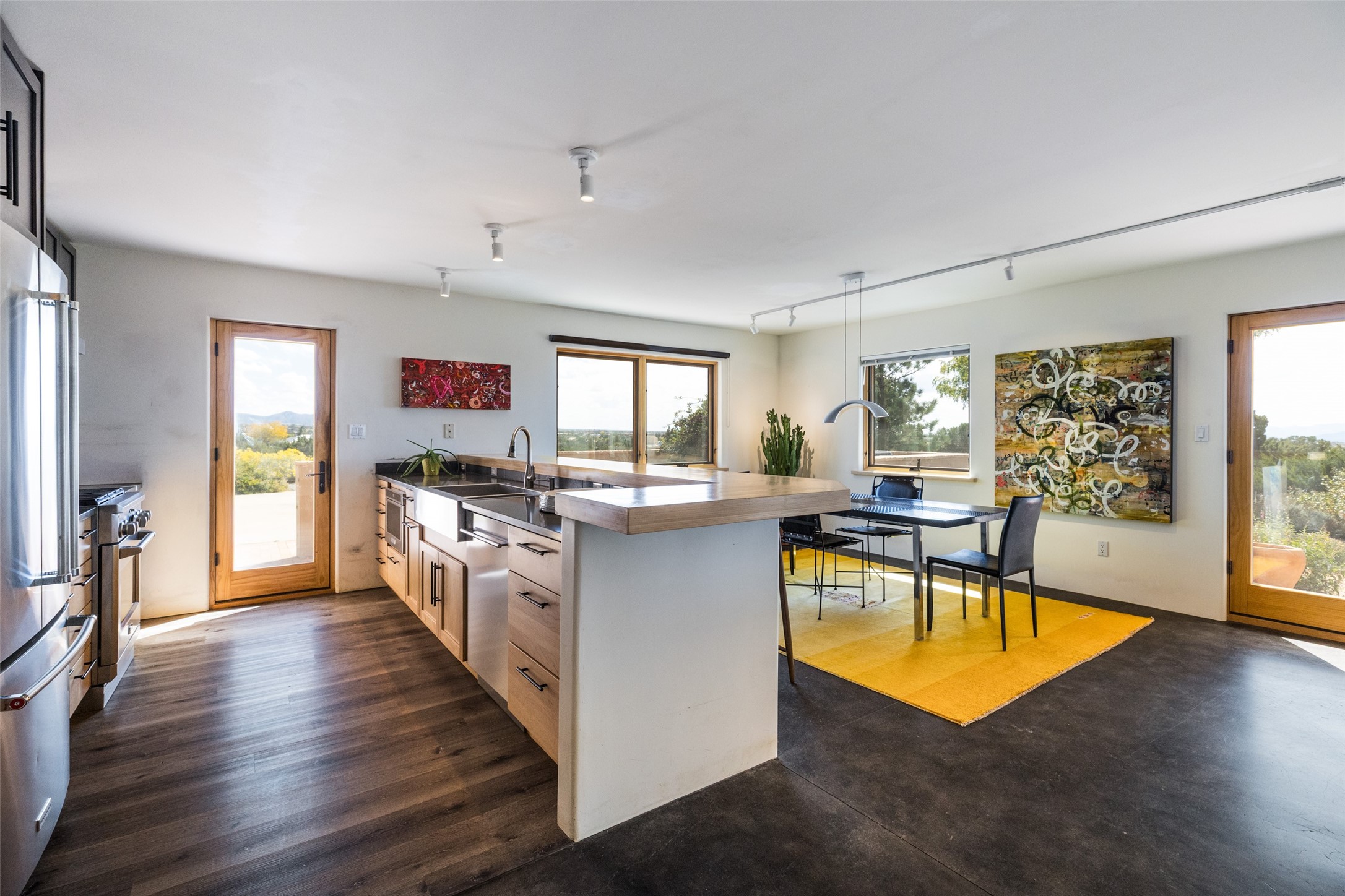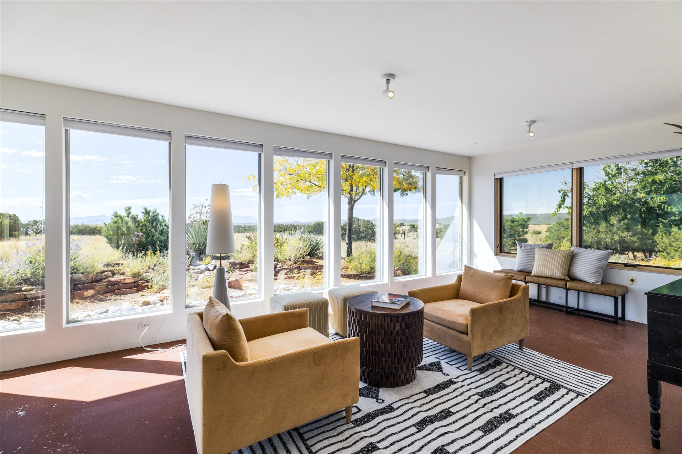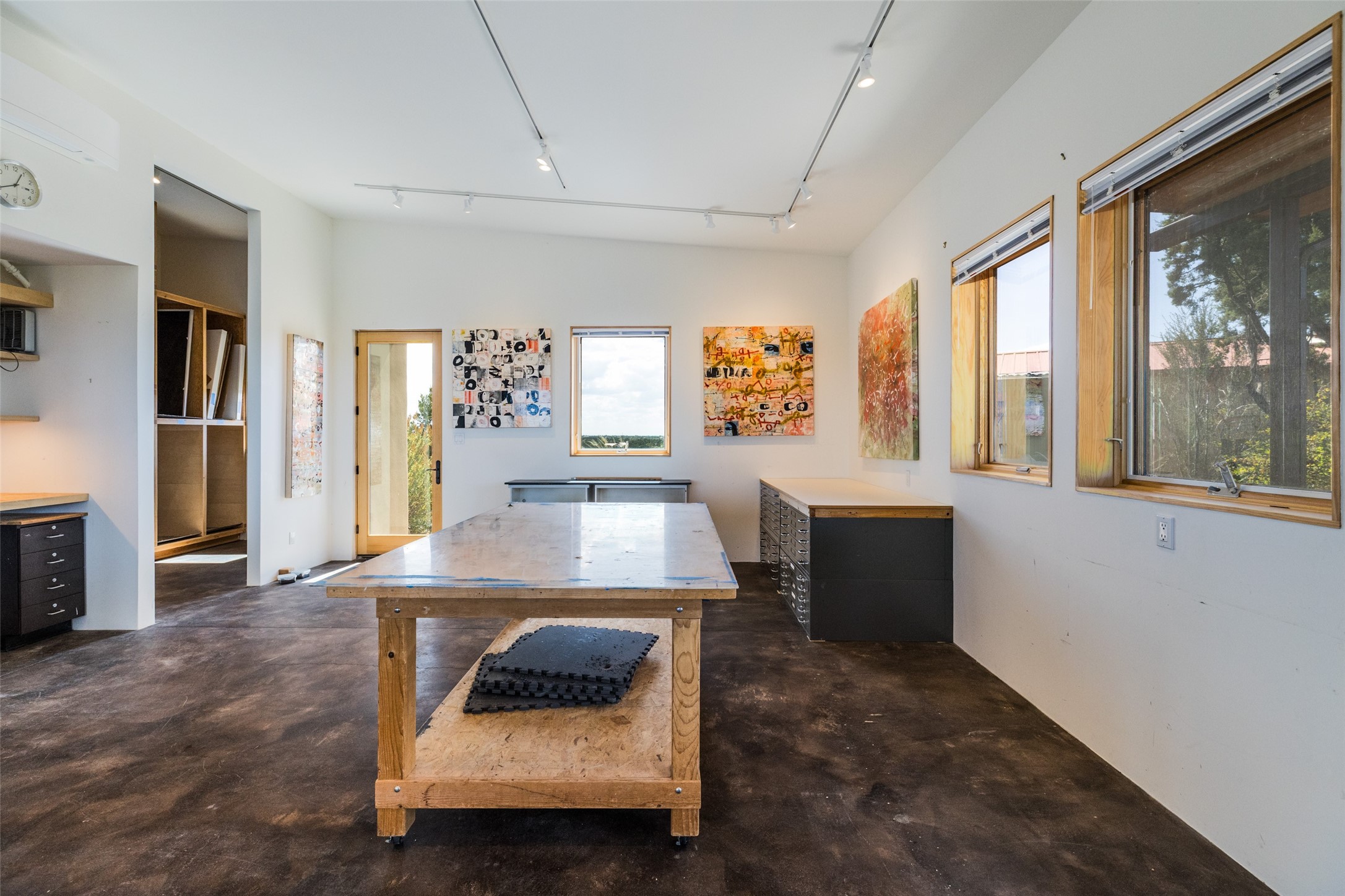 Set on 3 private acres with sweeping views of the Jemez and Sangre de Cristo Mountains, this contemporary home blends style, efficiency, and versatility. The 2-bedroom, 2-bath main house features an updated primary suite, newer kitchen, windows, and cork flooring. Owned solar panels help offset electric bills, adding to the home's sustainability. Creative and functional spaces expand the possibilities: a detached, 1050 sq ft, artist studio with its own bathroom, a 600 sq. ft. heated and cooled garage with office, a potting shed, and an additional storage shed. Established gardens and cisterns for water catchment support irrigation and year-round enjoyment of the land. With no HOA restrictions and a setting designed for privacy, this property offers freedom, modern comfort, and inspiring Northern New Mexico views -- all in one remarkable package.