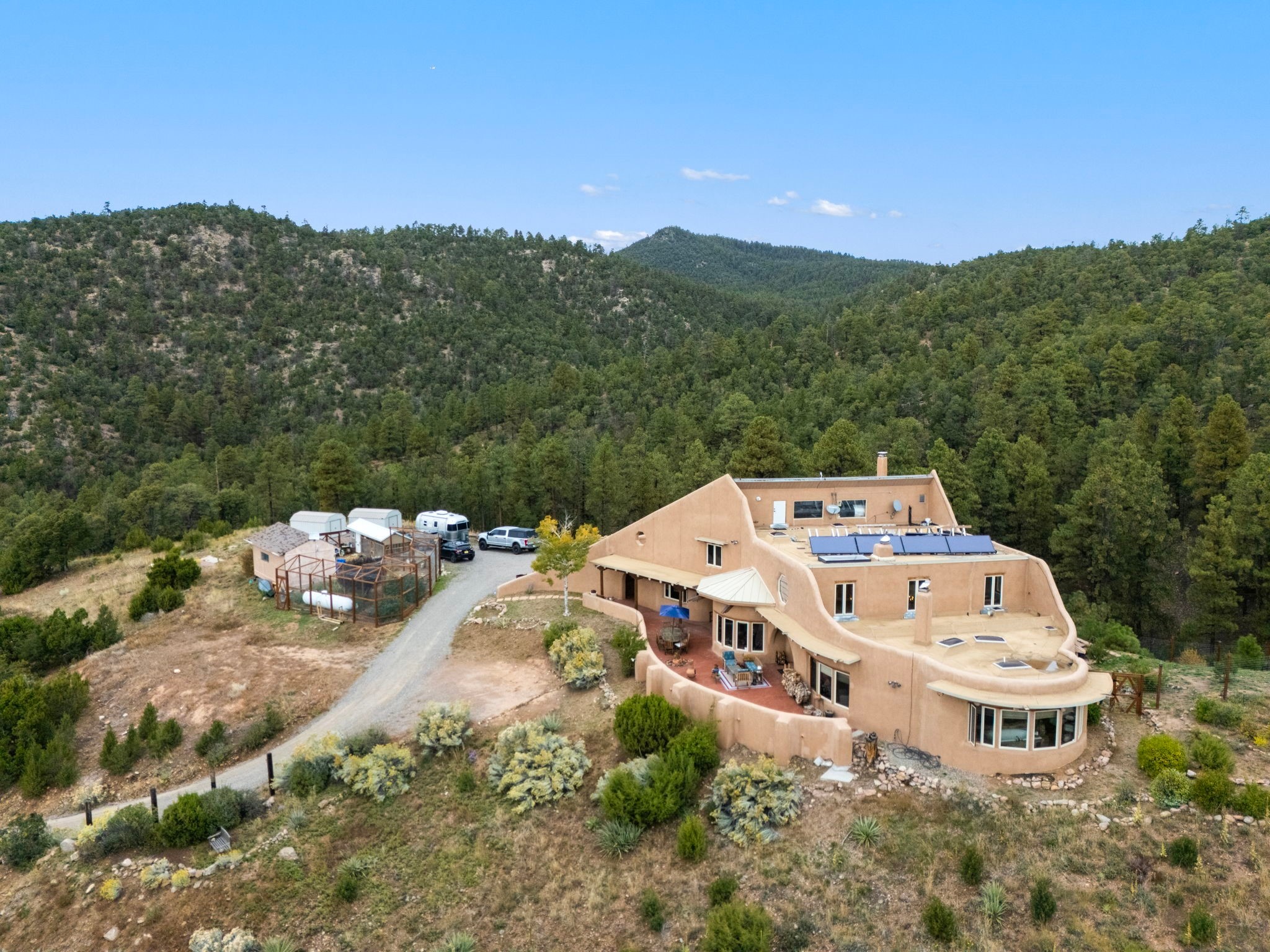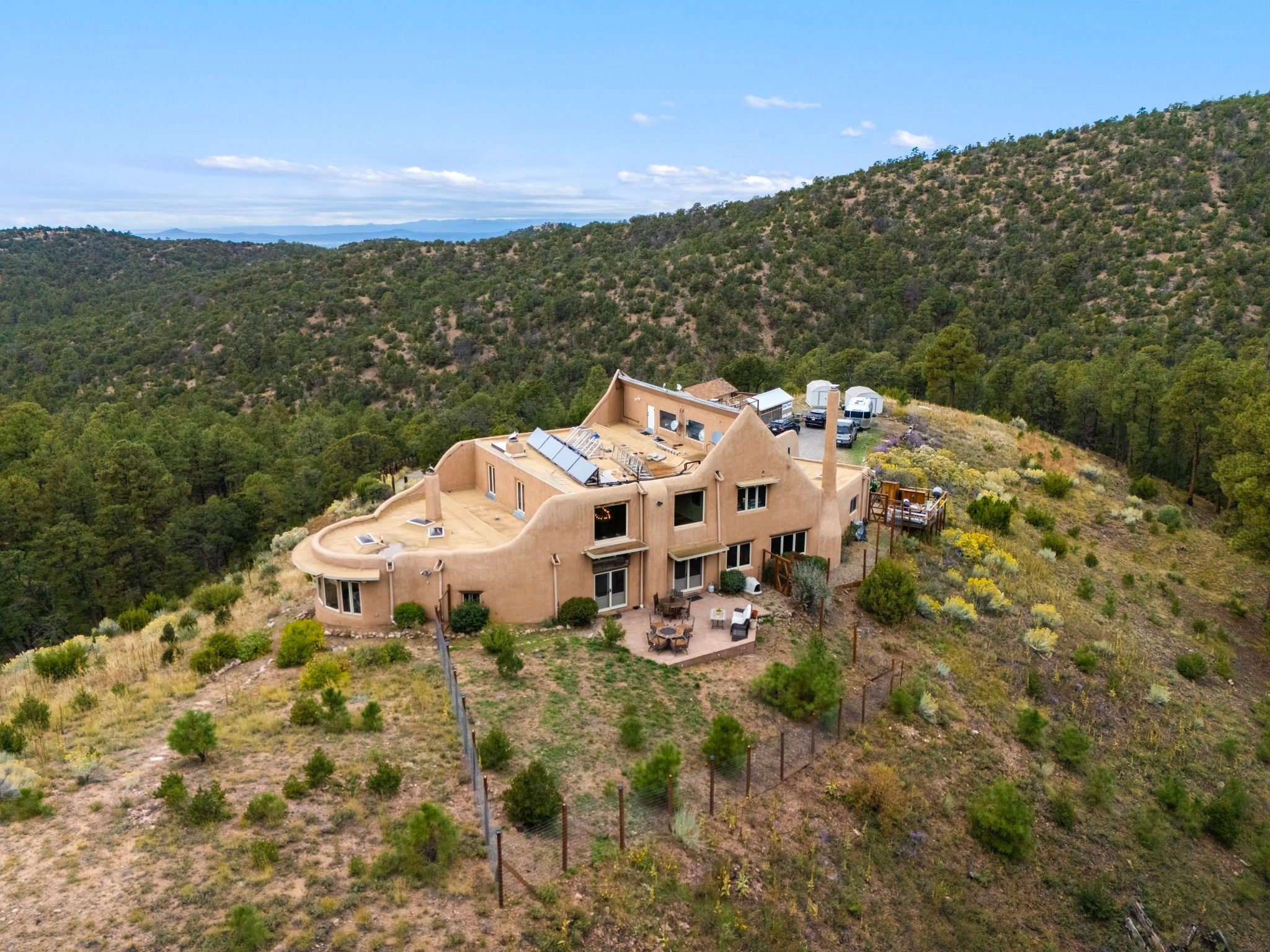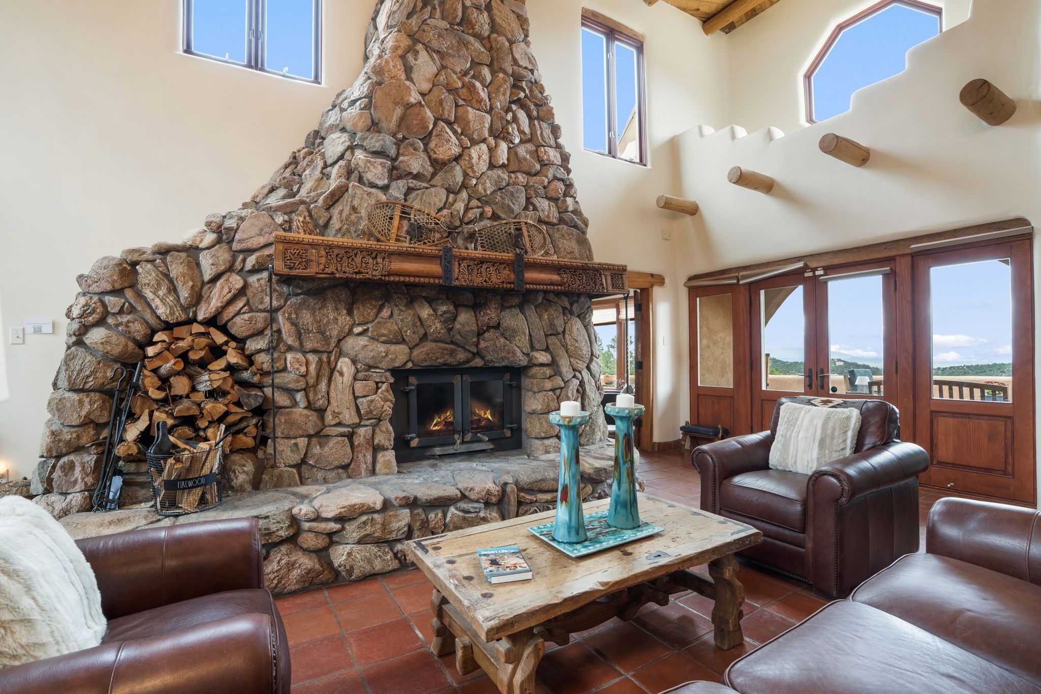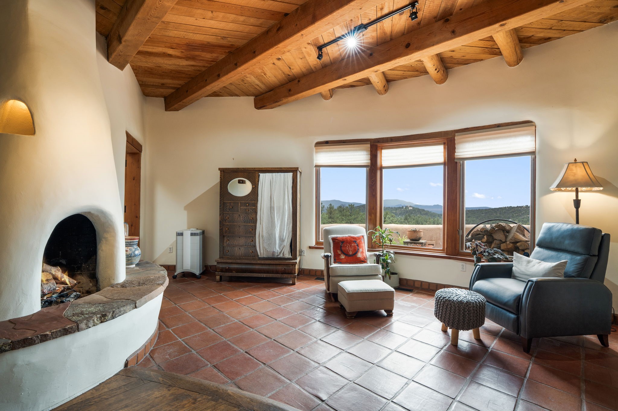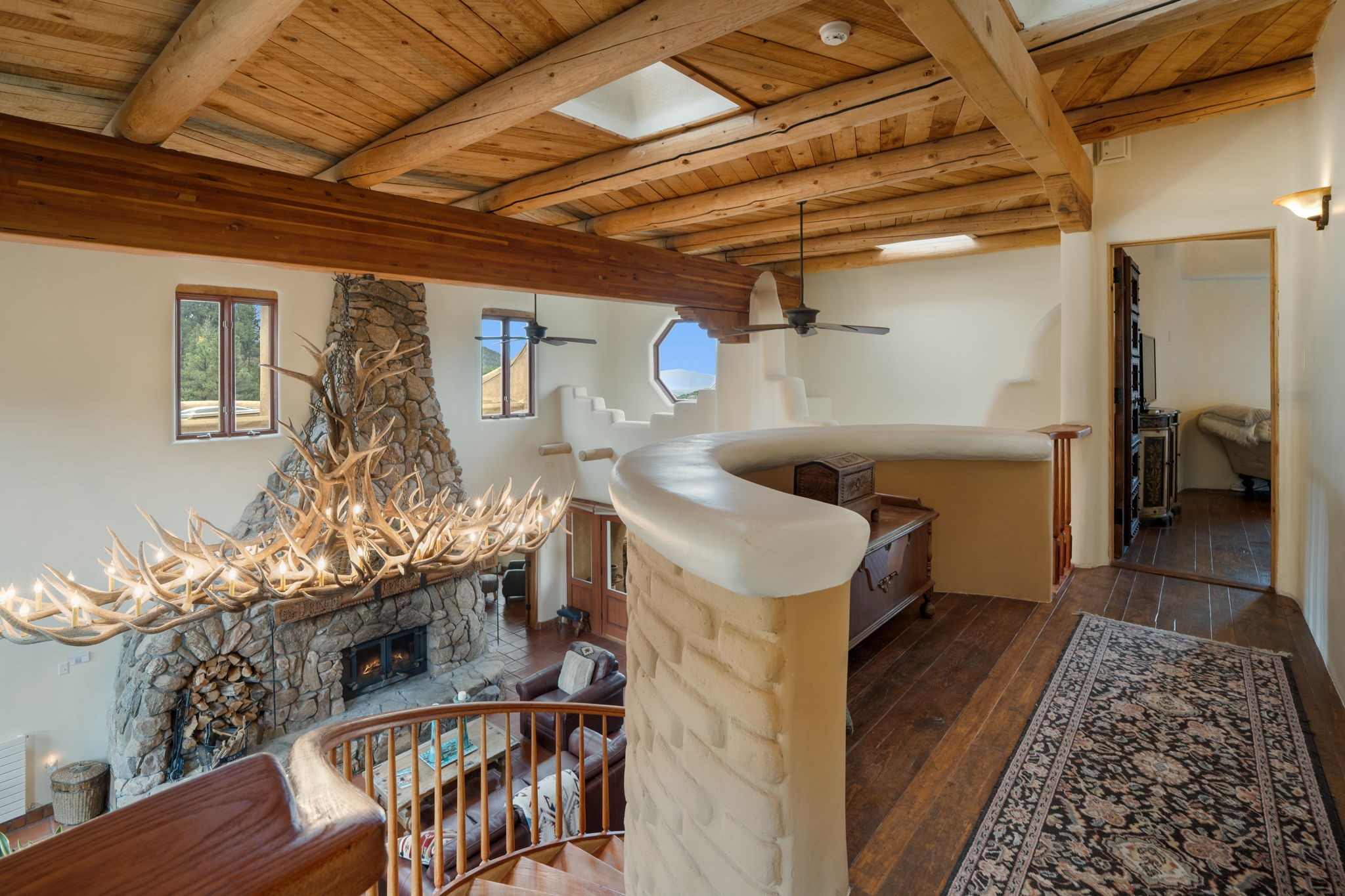 Nestled on 78 pristine acres spread across four deeded lots, this extraordinary estate blends seclusion, artistry, and timeless Southwestern charm--all just 25 minutes from downtown Santa Fe.The 4,400-square-foot adobe home is a masterpiece of craftsmanship and comfort. Solid adobe construction provides natural insulation, keeping interiors warm in winter and cool in summer. Inside, four ensuite bedrooms and 4.5 baths offer comfort and privacy, while 30 hand-carved doors and accents from Seret & Sons lend a one-of-a-kind artistic touch throughout.The great room is the heart of this residence--anchored by a dramatic stone fireplace, high viga ceilings, and a custom antler chandelier that radiates rustic elegance. French doors open to a spacious front portal, framing sweeping Sangre de Cristo Mountain views.A graceful curved staircase leads to the upper level, where two ensuite bedrooms and a balcony overlooking the great room create an inviting sense of openness and connection. The kitchen is both functional and charming, featuring granite counters, abundant cabinetry, and a cozy breakfast nook warmed by its own fireplace. Saltillo tile floors flow throughout the main level, while hardwood floors add warmth upstairs.The primary suite is a private retreat with panoramic views, a luxurious bath with jetted tub, tiled shower, and granite counters--a true spa experience at home.Step outside to a fenced backyard and patio, perfect for savoring dramatic weather shifts, peaceful wildlife, and star-filled nights. Additional features include solar hot water, four fireplaces, a two-car garage, two sheds, and a delightful chicken coop with eight hens providing fresh eggs daily.This property is more than a home--it's a work of art nestled in nature, offering tranquility, authenticity, and soul. Experience the best of Santa Fe living, where art, architecture, and landscape unite in harmony.