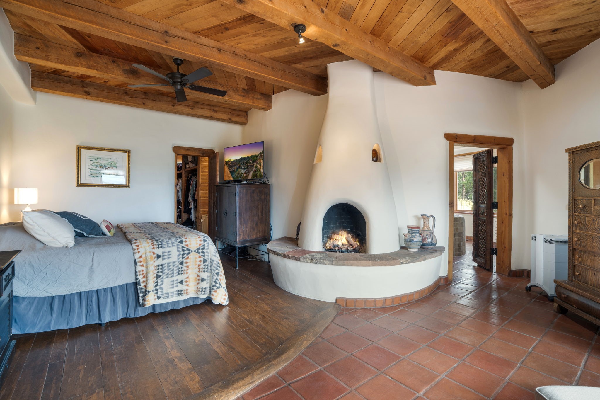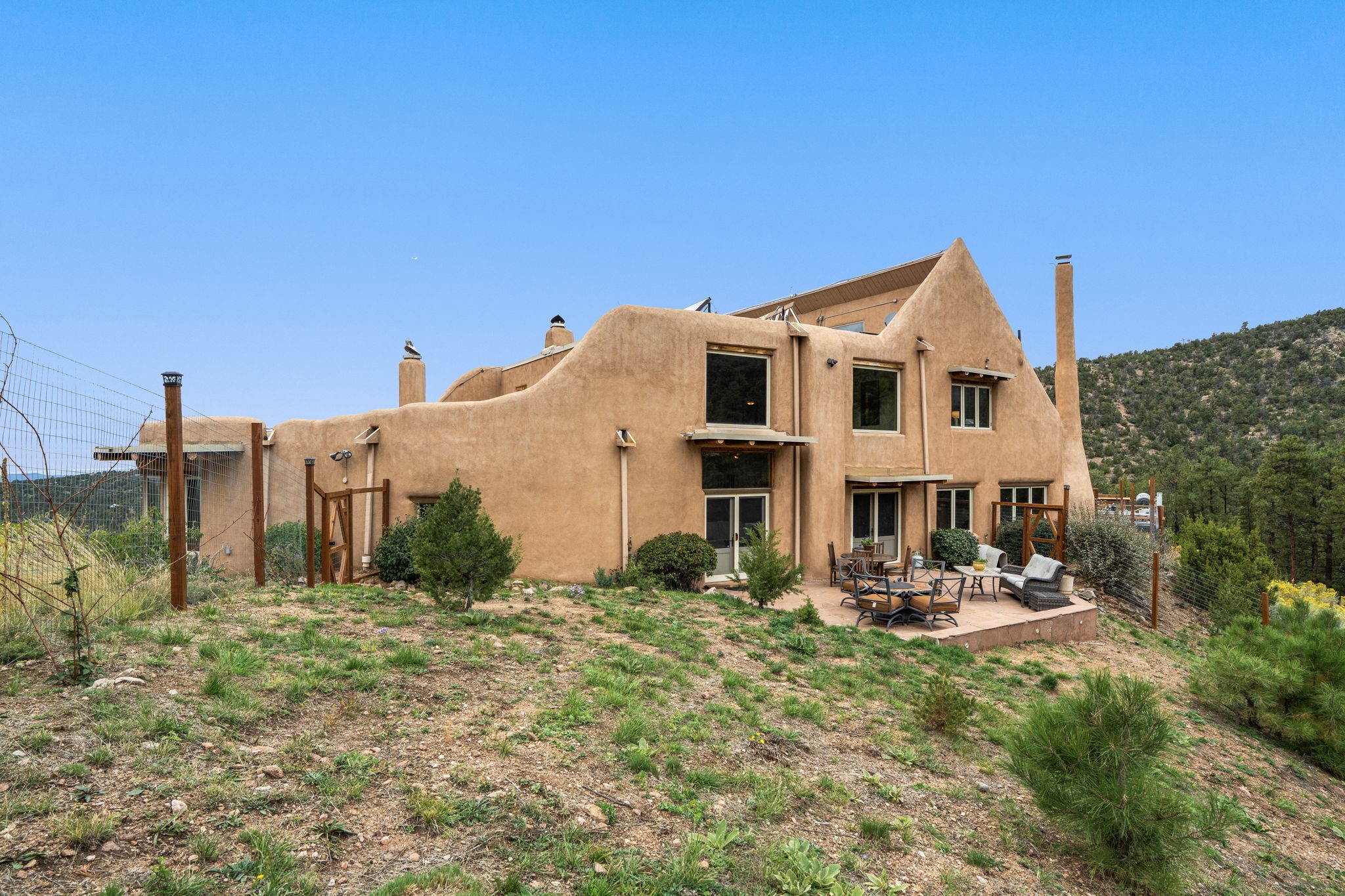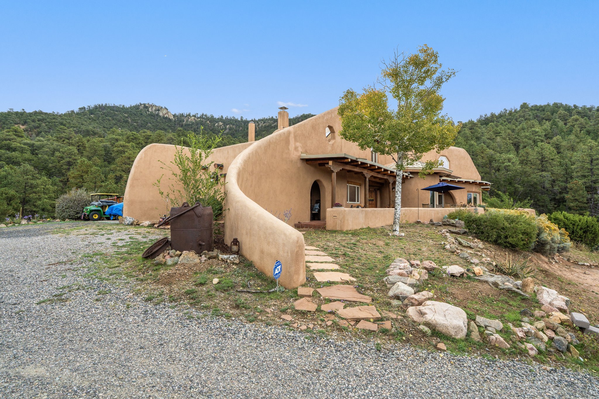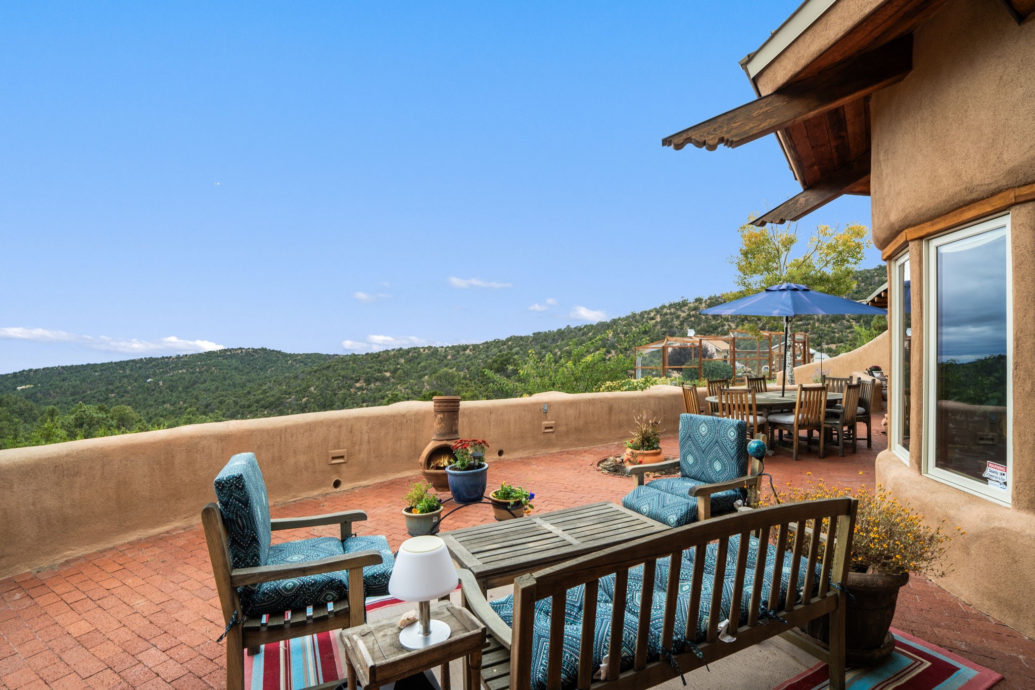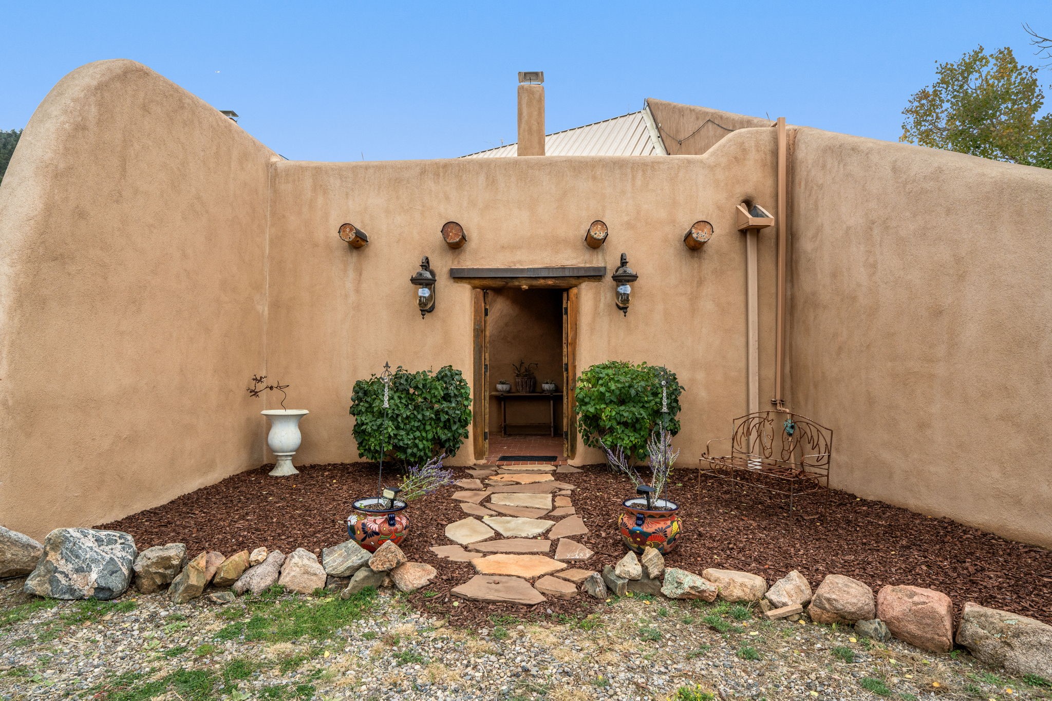Nestled on 78 pristine acres spread across four deeded lots, this extraordinary estate blends seclusion, artistry, and timeless Southwestern charm--all just 25 minutes from downtown Santa Fe.The 4,400-square-foot adobe home is a masterpiece of craftsmanship and comfort. Solid adobe construction provides natural insulation, keeping interiors warm in winter and cool in summer. Inside, four ensuite bedrooms and 4.5 baths offer comfort and privacy, while 30 hand-carved doors and accents from Seret & Sons lend a one-of-a-kind artistic touch throughout.The great room is the heart of this residence--anchored by a dramatic stone fireplace, high viga ceilings, and a custom antler chandelier that radiates rustic elegance. French doors open to a spacious front portal, framing sweeping Sangre de Cristo Mountain views.A graceful curved staircase leads to the upper level, where two ensuite bedrooms and a balcony overlooking the great room create an inviting sense of openness and connection. The kitchen is both functional and charming, featuring granite counters, abundant cabinetry, and a cozy breakfast nook warmed by its own fireplace. Saltillo tile floors flow throughout the main level, while hardwood floors add warmth upstairs.The primary suite is a private retreat with panoramic views, a luxurious bath with jetted tub, tiled shower, and granite counters--a true spa experience at home.Step outside to a fenced backyard and patio, perfect for savoring dramatic weather shifts, peaceful wildlife, and star-filled nights. Additional features include solar hot water, four fireplaces, a two-car garage, two sheds, and a delightful chicken coop with eight hens providing fresh eggs daily.This property is more than a home--it's a work of art nestled in nature, offering tranquility, authenticity, and soul. Experience the best of Santa Fe living, where art, architecture, and landscape unite in harmony.