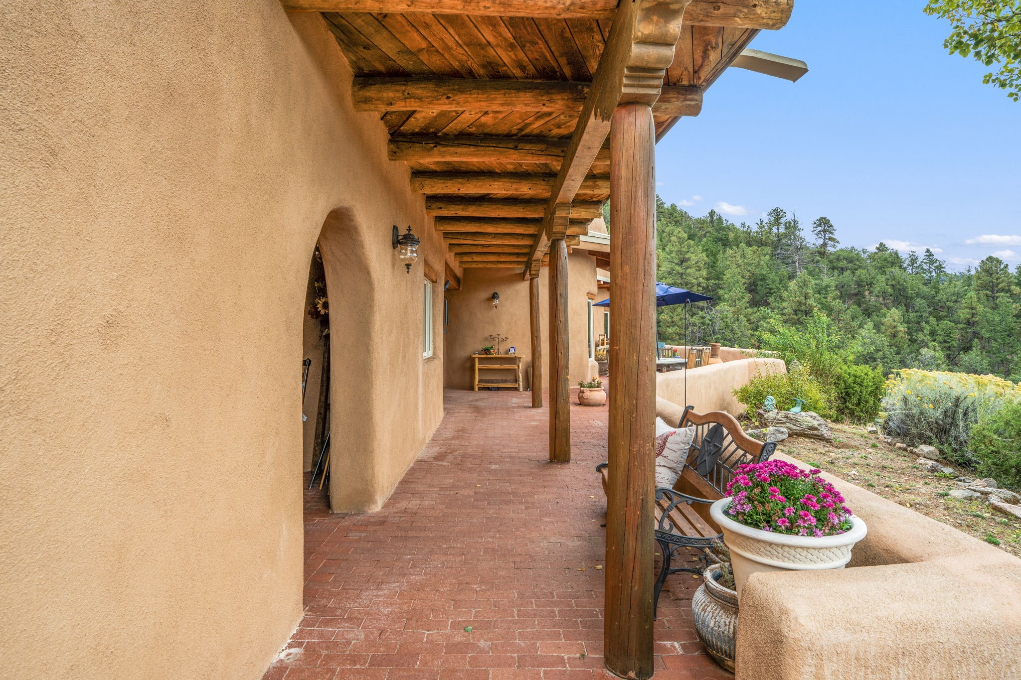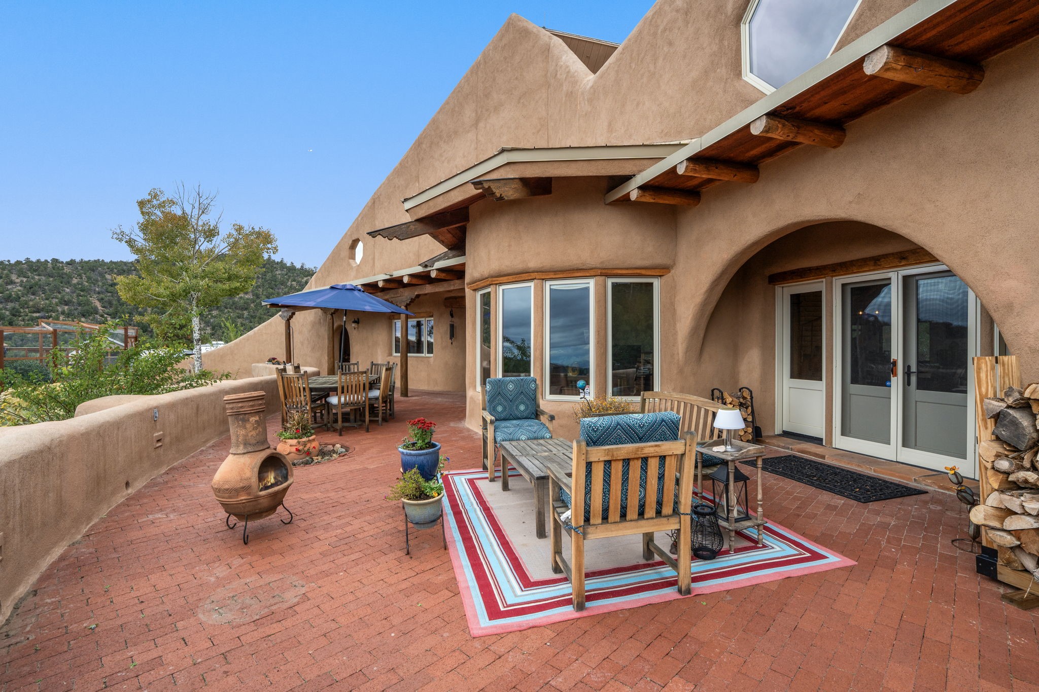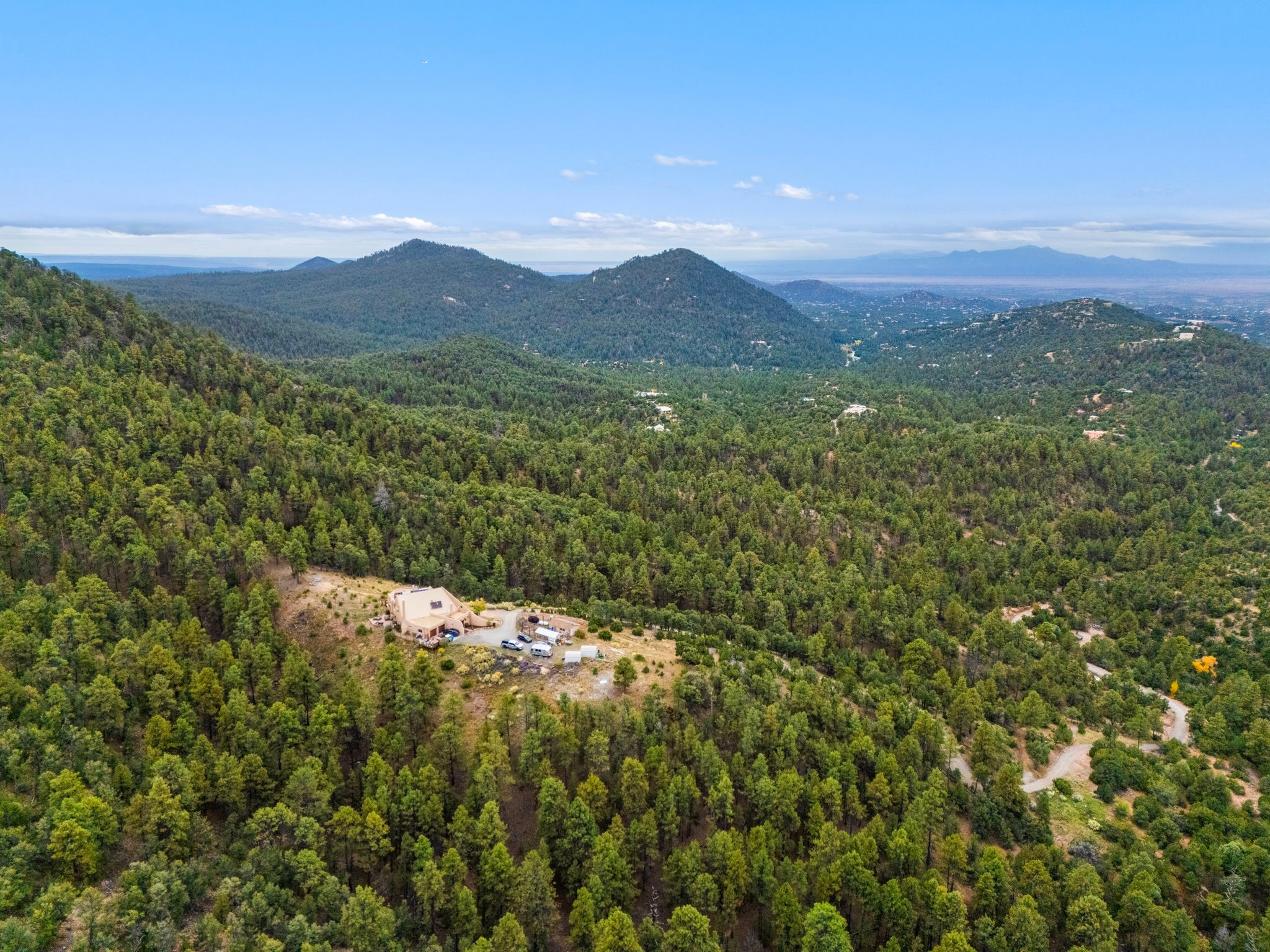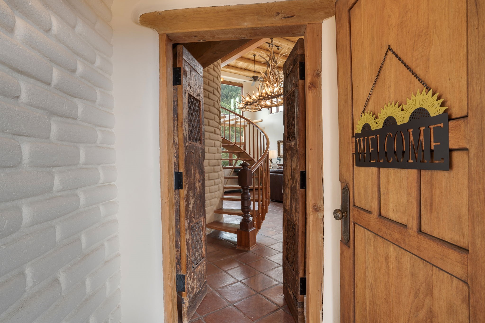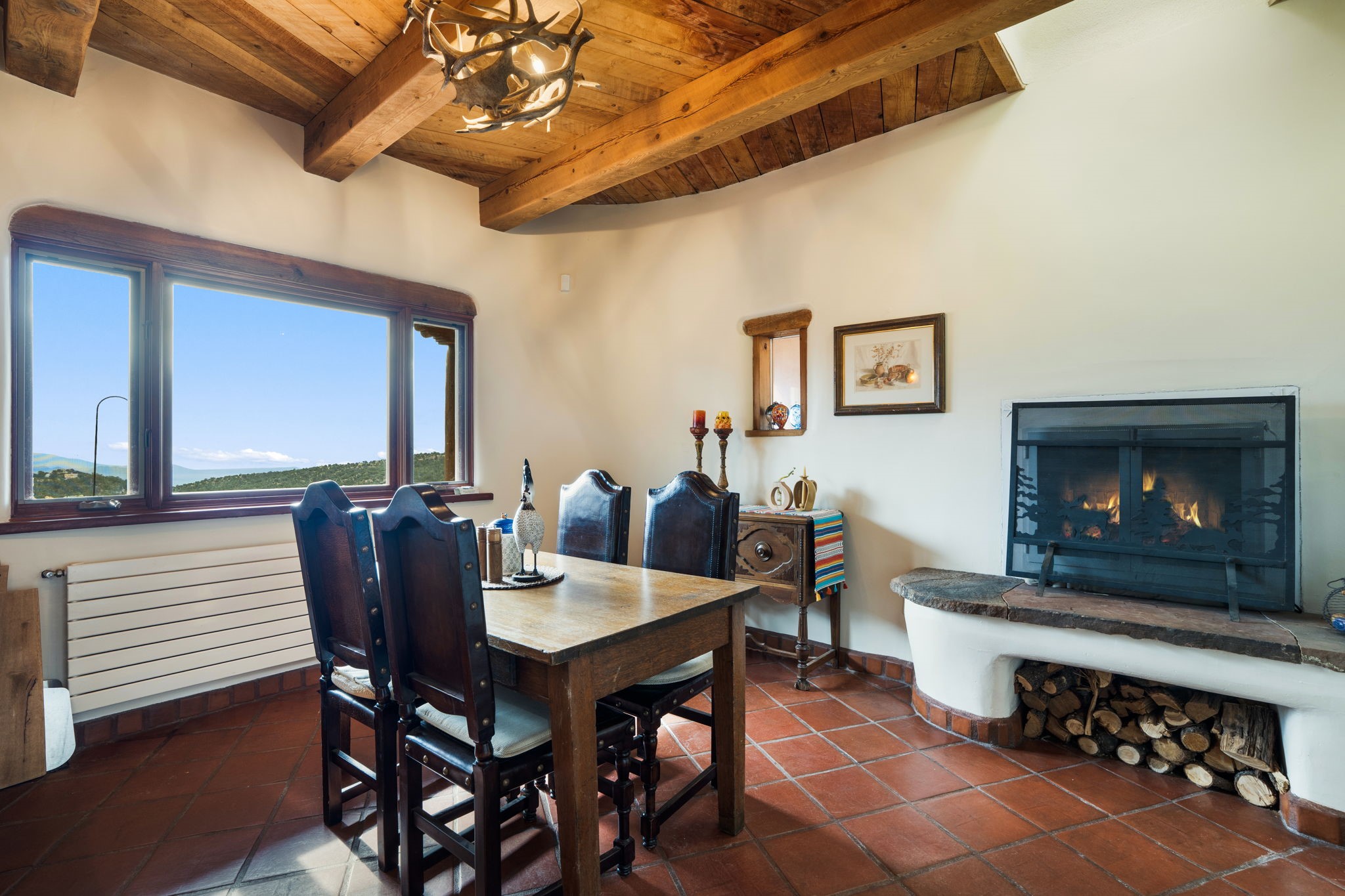 Nestled on 78 pristine acres spread across four deeded lots, this extraordinary estate blends seclusion, artistry, and timeless Southwestern charm--all just 25 minutes from downtown Santa Fe.The 4,400-square-foot adobe home is a masterpiece of craftsmanship and comfort. Solid adobe construction provides natural insulation, keeping interiors warm in winter and cool in summer. Inside, four ensuite bedrooms and 4.5 baths offer comfort and privacy, while 30 hand-carved doors and accents from Seret & Sons lend a one-of-a-kind artistic touch throughout.The great room is the heart of this residence--anchored by a dramatic stone fireplace, high viga ceilings, and a custom antler chandelier that radiates rustic elegance. French doors open to a spacious front portal, framing sweeping Sangre de Cristo Mountain views.A graceful curved staircase leads to the upper level, where two ensuite bedrooms and a balcony overlooking the great room create an inviting sense of openness and connection. The kitchen is both functional and charming, featuring granite counters, abundant cabinetry, and a cozy breakfast nook warmed by its own fireplace. Saltillo tile floors flow throughout the main level, while hardwood floors add warmth upstairs.The primary suite is a private retreat with panoramic views, a luxurious bath with jetted tub, tiled shower, and granite counters--a true spa experience at home.Step outside to a fenced backyard and patio, perfect for savoring dramatic weather shifts, peaceful wildlife, and star-filled nights. Additional features include solar hot water, four fireplaces, a two-car garage, two sheds, and a delightful chicken coop with eight hens providing fresh eggs daily.This property is more than a home--it's a work of art nestled in nature, offering tranquility, authenticity, and soul. Experience the best of Santa Fe living, where art, architecture, and landscape unite in harmony.