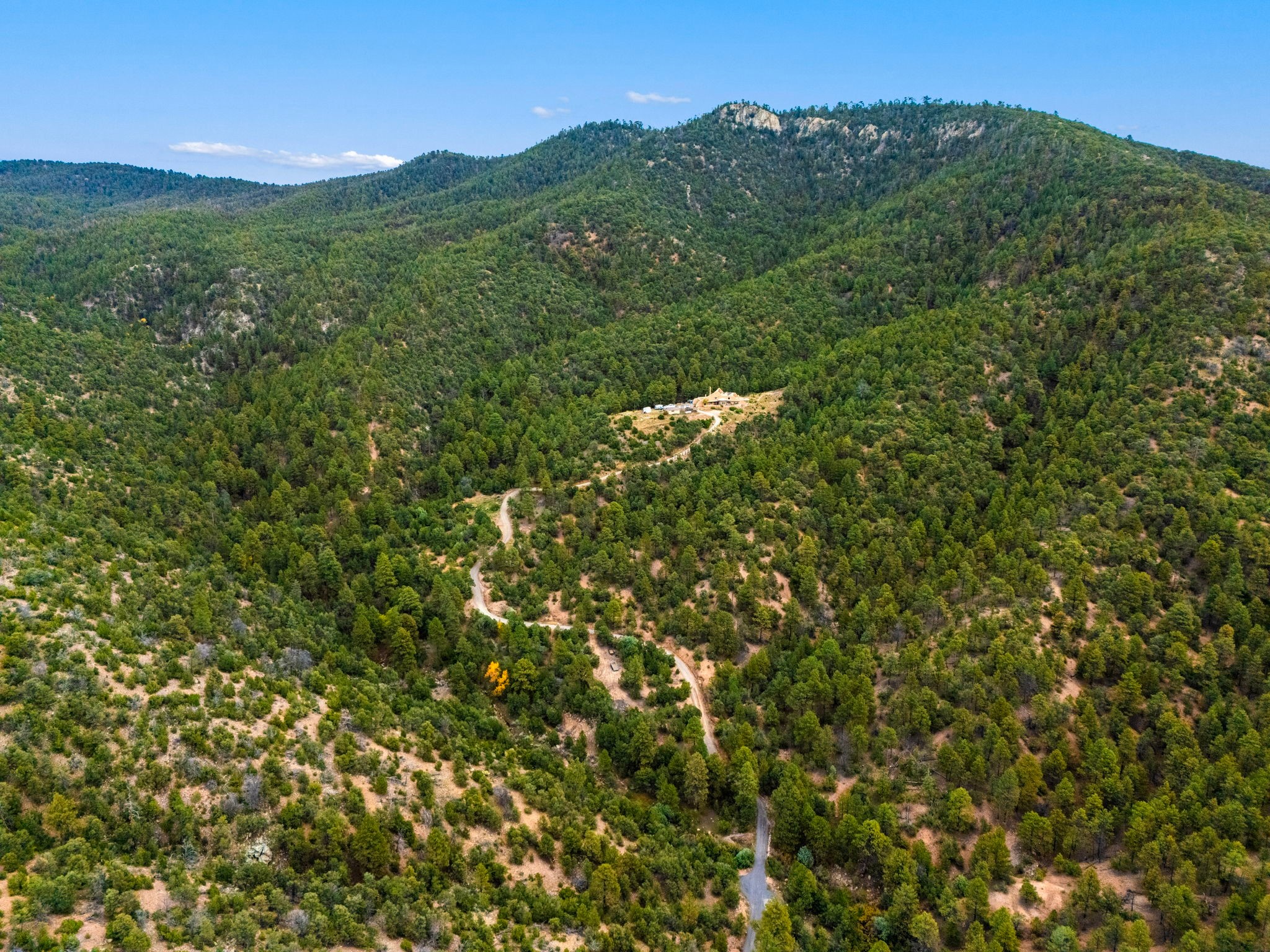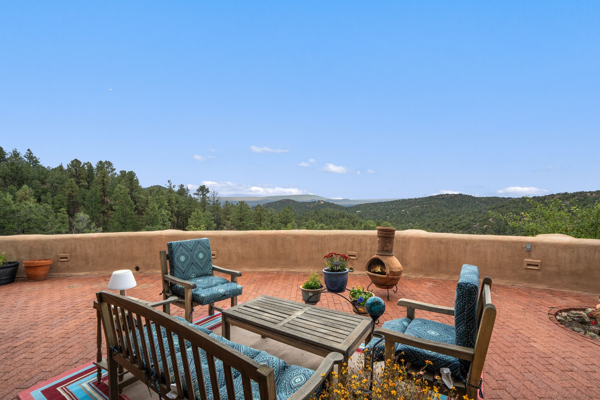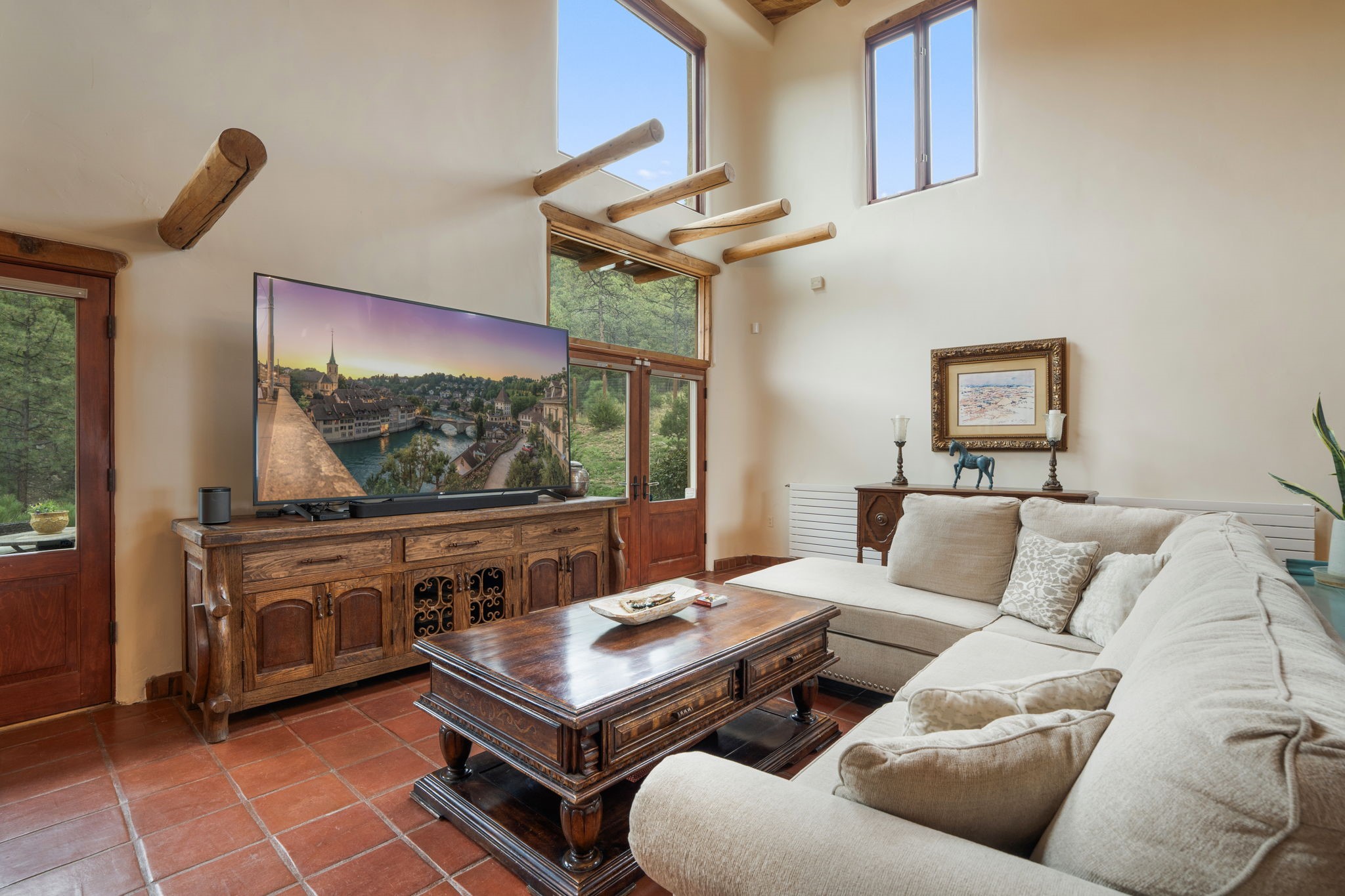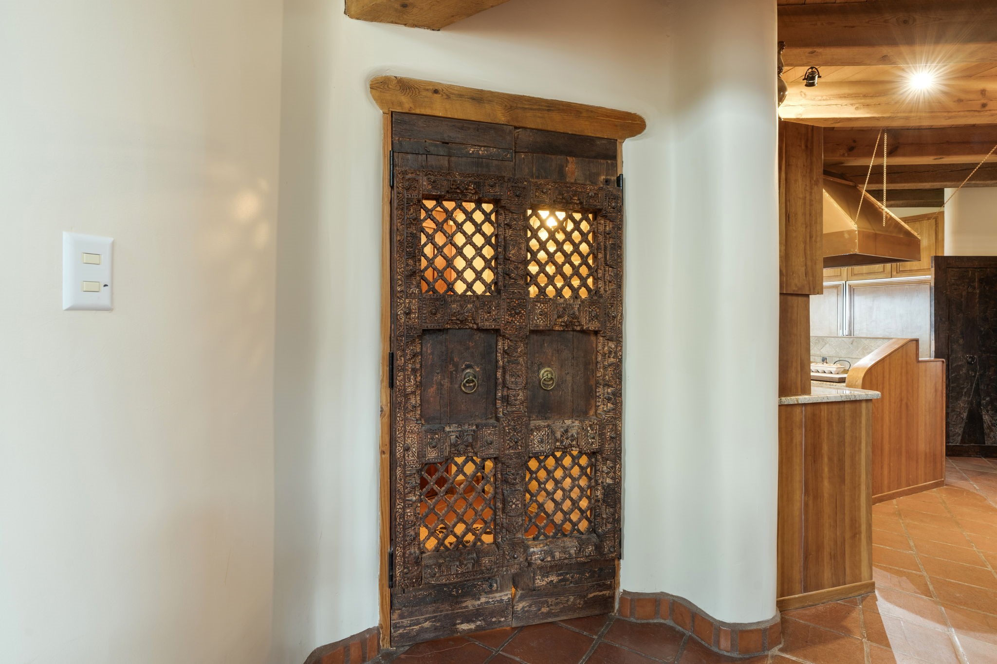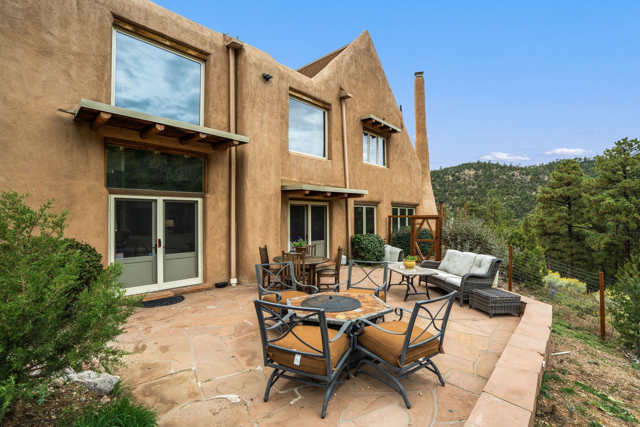 Nestled on 78 pristine acres spread across four deeded lots, this extraordinary estate blends seclusion, artistry, and timeless Southwestern charm--all just 25 minutes from downtown Santa Fe.The 4,400-square-foot adobe home is a masterpiece of craftsmanship and comfort. Solid adobe construction provides natural insulation, keeping interiors warm in winter and cool in summer. Inside, four ensuite bedrooms and 4.5 baths offer comfort and privacy, while 30 hand-carved doors and accents from Seret & Sons lend a one-of-a-kind artistic touch throughout.The great room is the heart of this residence--anchored by a dramatic stone fireplace, high viga ceilings, and a custom antler chandelier that radiates rustic elegance. French doors open to a spacious front portal, framing sweeping Sangre de Cristo Mountain views.A graceful curved staircase leads to the upper level, where two ensuite bedrooms and a balcony overlooking the great room create an inviting sense of openness and connection. The kitchen is both functional and charming, featuring granite counters, abundant cabinetry, and a cozy breakfast nook warmed by its own fireplace. Saltillo tile floors flow throughout the main level, while hardwood floors add warmth upstairs.The primary suite is a private retreat with panoramic views, a luxurious bath with jetted tub, tiled shower, and granite counters--a true spa experience at home.Step outside to a fenced backyard and patio, perfect for savoring dramatic weather shifts, peaceful wildlife, and star-filled nights. Additional features include solar hot water, four fireplaces, a two-car garage, two sheds, and a delightful chicken coop with eight hens providing fresh eggs daily.This property is more than a home--it's a work of art nestled in nature, offering tranquility, authenticity, and soul. Experience the best of Santa Fe living, where art, architecture, and landscape unite in harmony.