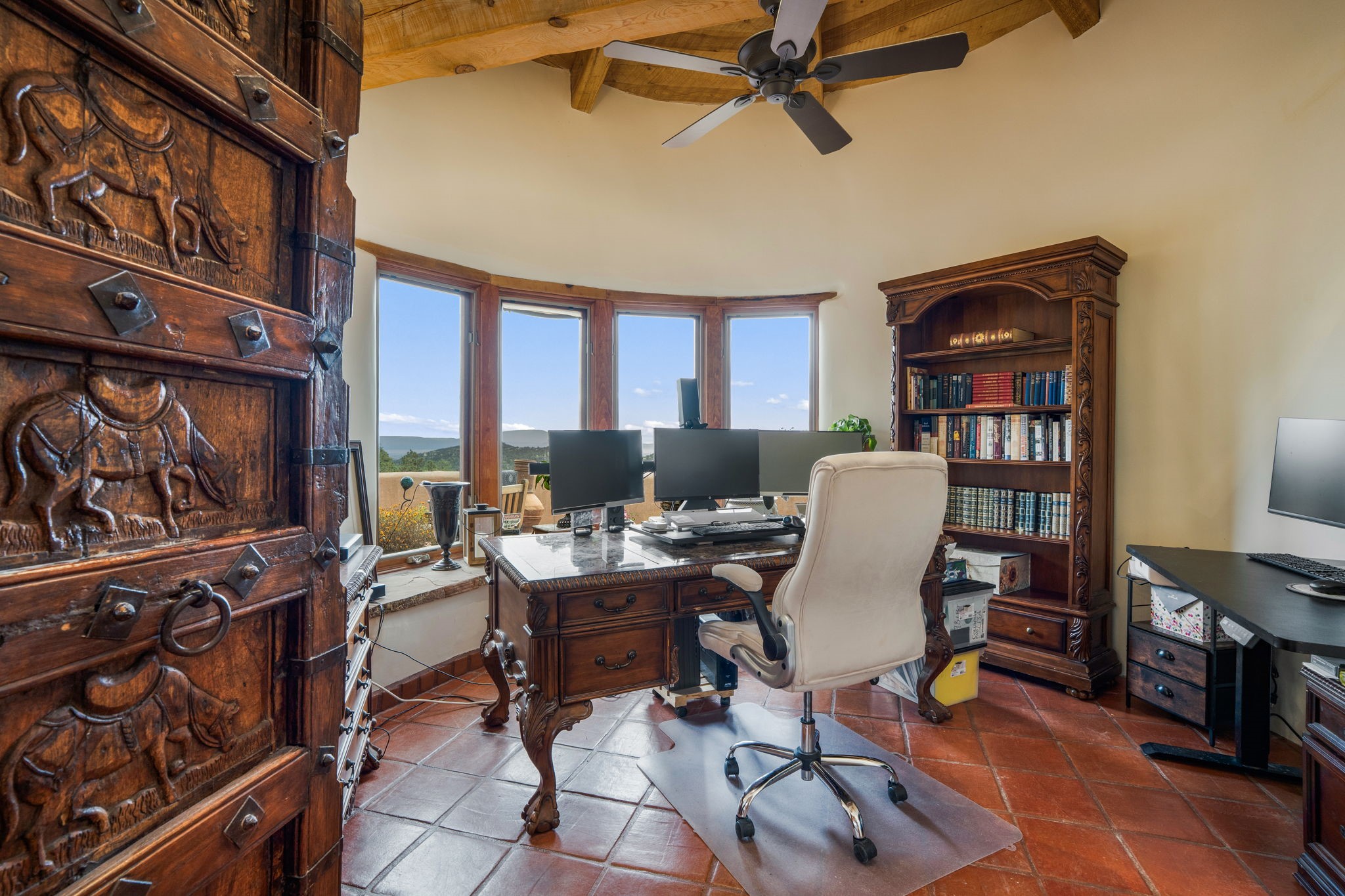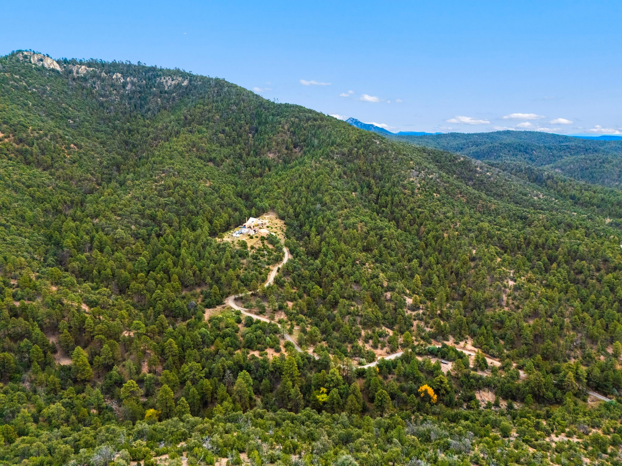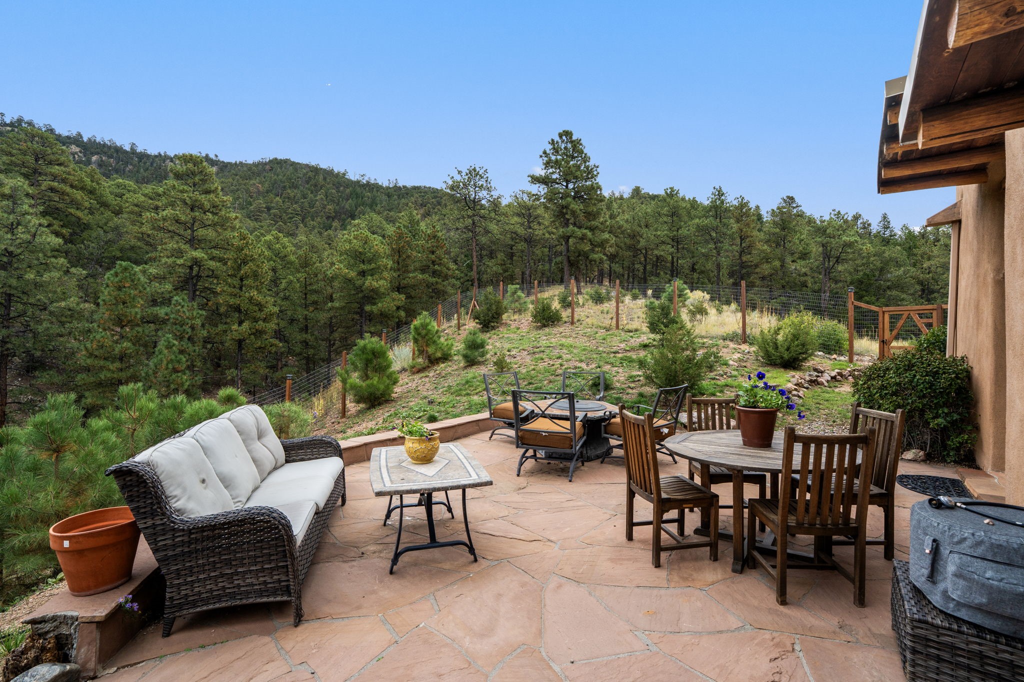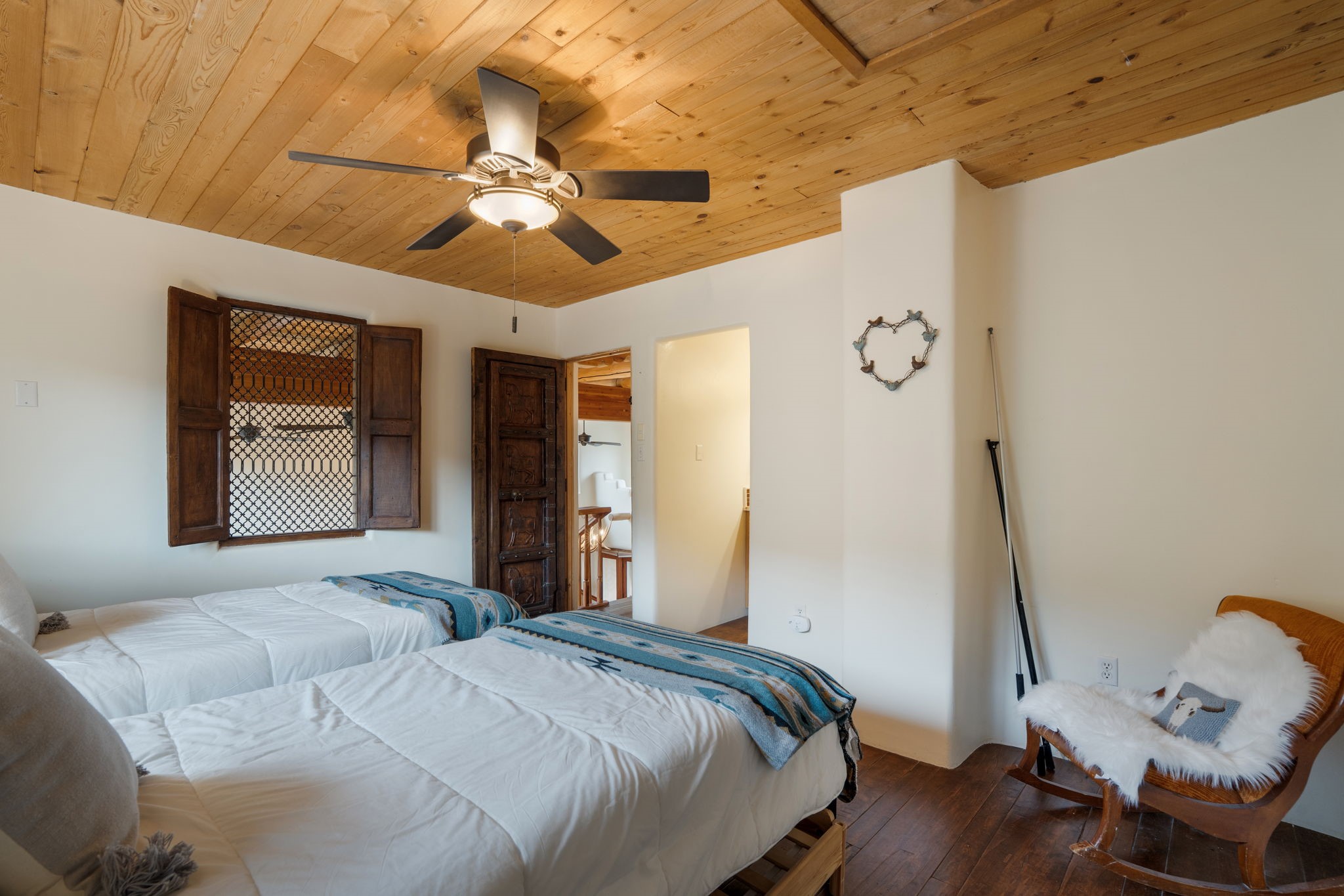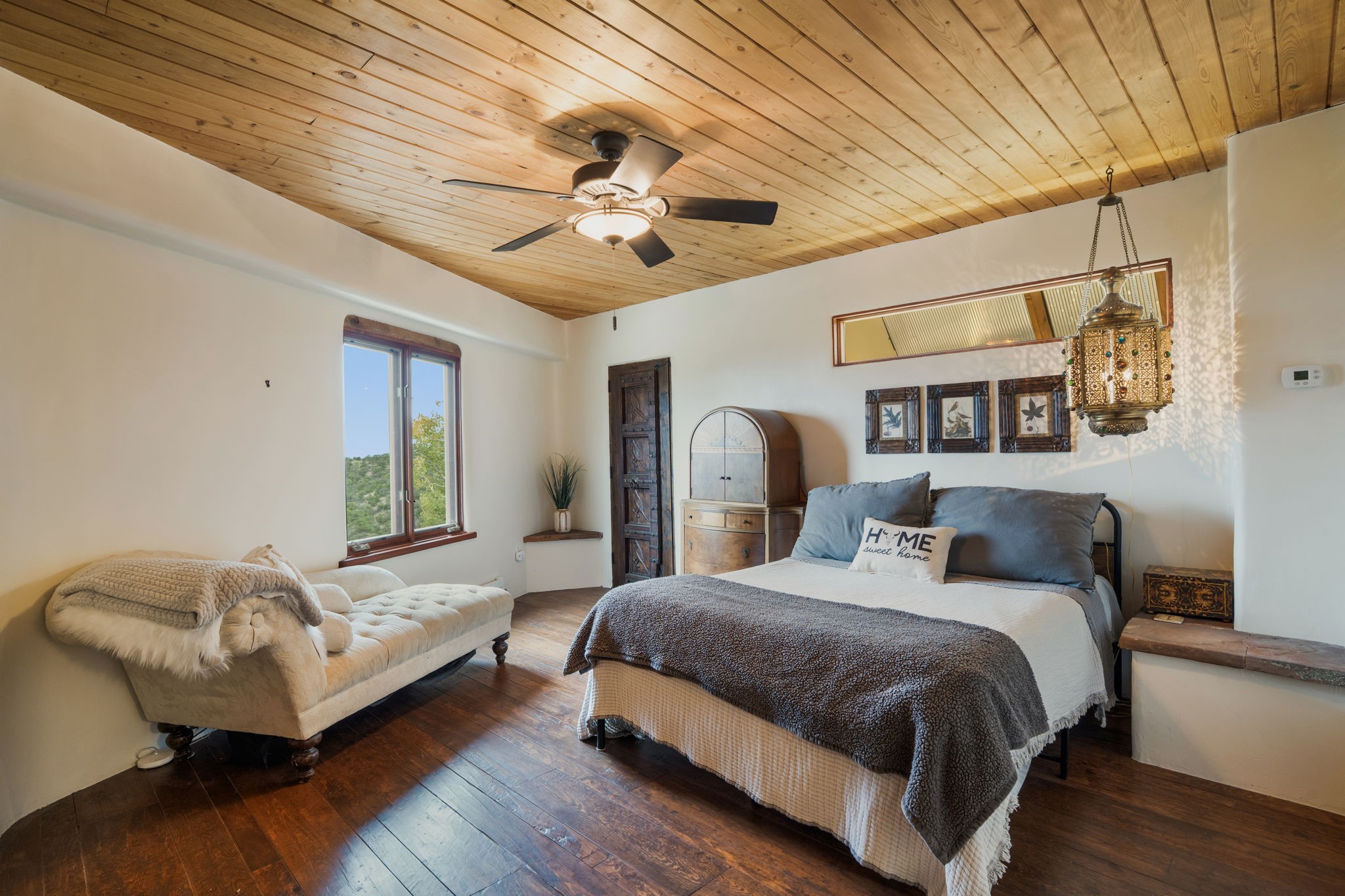 Nestled on 78 pristine acres spread across four deeded lots, this extraordinary estate blends seclusion, artistry, and timeless Southwestern charm--all just 25 minutes from downtown Santa Fe.The 4,400-square-foot adobe home is a masterpiece of craftsmanship and comfort. Solid adobe construction provides natural insulation, keeping interiors warm in winter and cool in summer. Inside, four ensuite bedrooms and 4.5 baths offer comfort and privacy, while 30 hand-carved doors and accents from Seret & Sons lend a one-of-a-kind artistic touch throughout.The great room is the heart of this residence--anchored by a dramatic stone fireplace, high viga ceilings, and a custom antler chandelier that radiates rustic elegance. French doors open to a spacious front portal, framing sweeping Sangre de Cristo Mountain views.A graceful curved staircase leads to the upper level, where two ensuite bedrooms and a balcony overlooking the great room create an inviting sense of openness and connection. The kitchen is both functional and charming, featuring granite counters, abundant cabinetry, and a cozy breakfast nook warmed by its own fireplace. Saltillo tile floors flow throughout the main level, while hardwood floors add warmth upstairs.The primary suite is a private retreat with panoramic views, a luxurious bath with jetted tub, tiled shower, and granite counters--a true spa experience at home.Step outside to a fenced backyard and patio, perfect for savoring dramatic weather shifts, peaceful wildlife, and star-filled nights. Additional features include solar hot water, four fireplaces, a two-car garage, two sheds, and a delightful chicken coop with eight hens providing fresh eggs daily.This property is more than a home--it's a work of art nestled in nature, offering tranquility, authenticity, and soul. Experience the best of Santa Fe living, where art, architecture, and landscape unite in harmony.