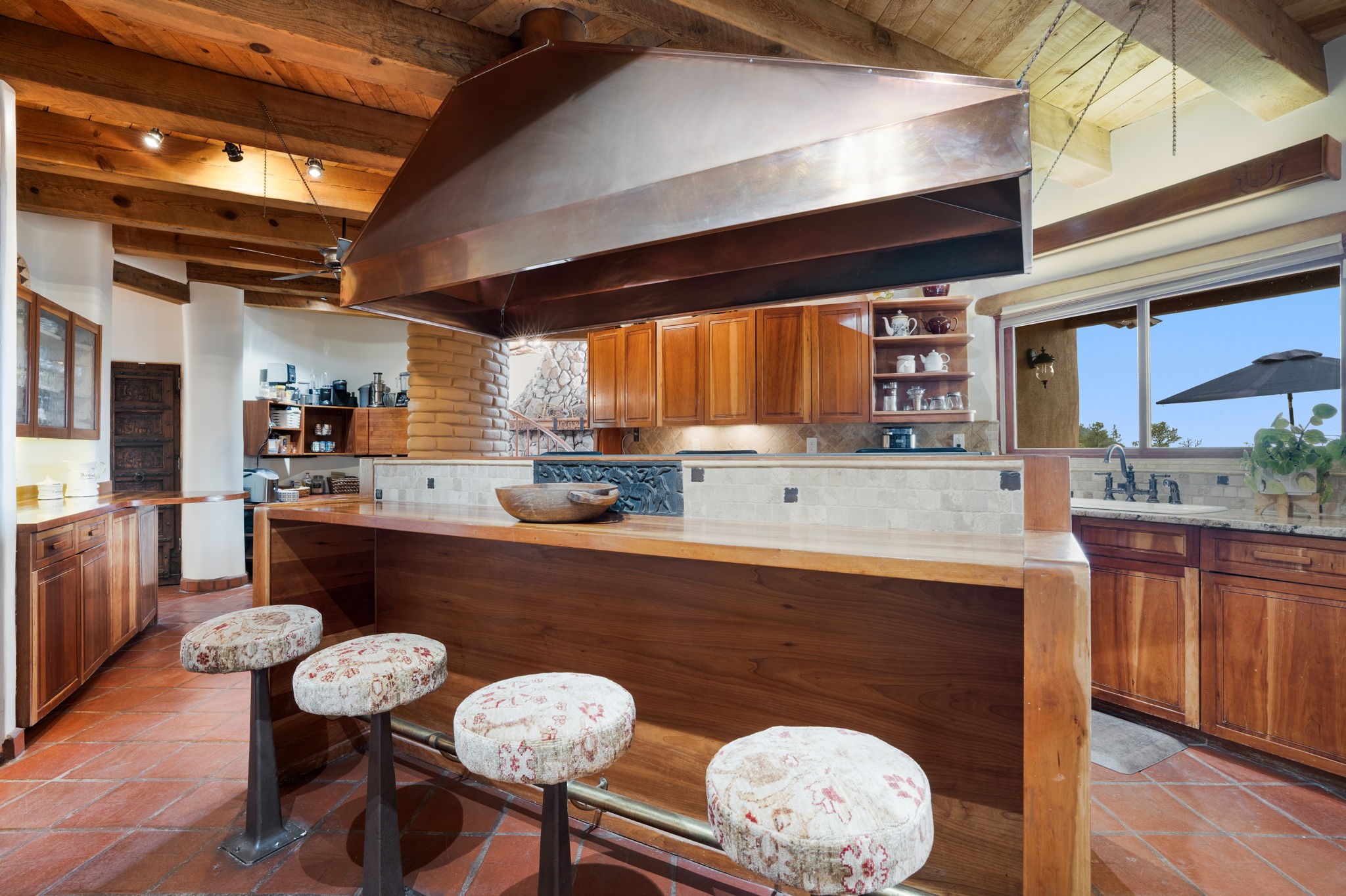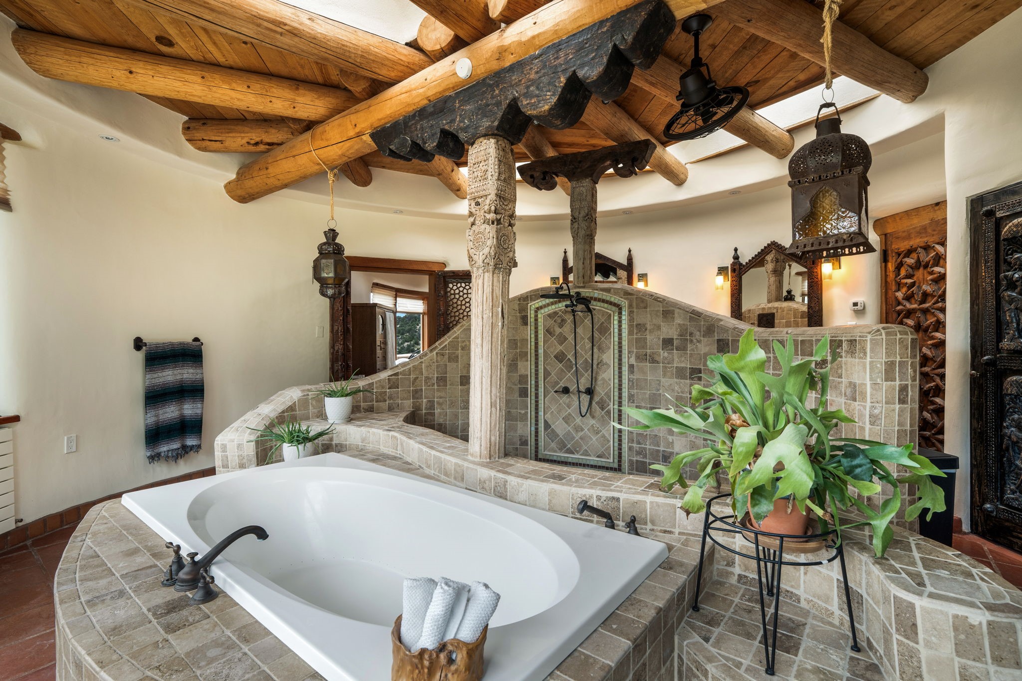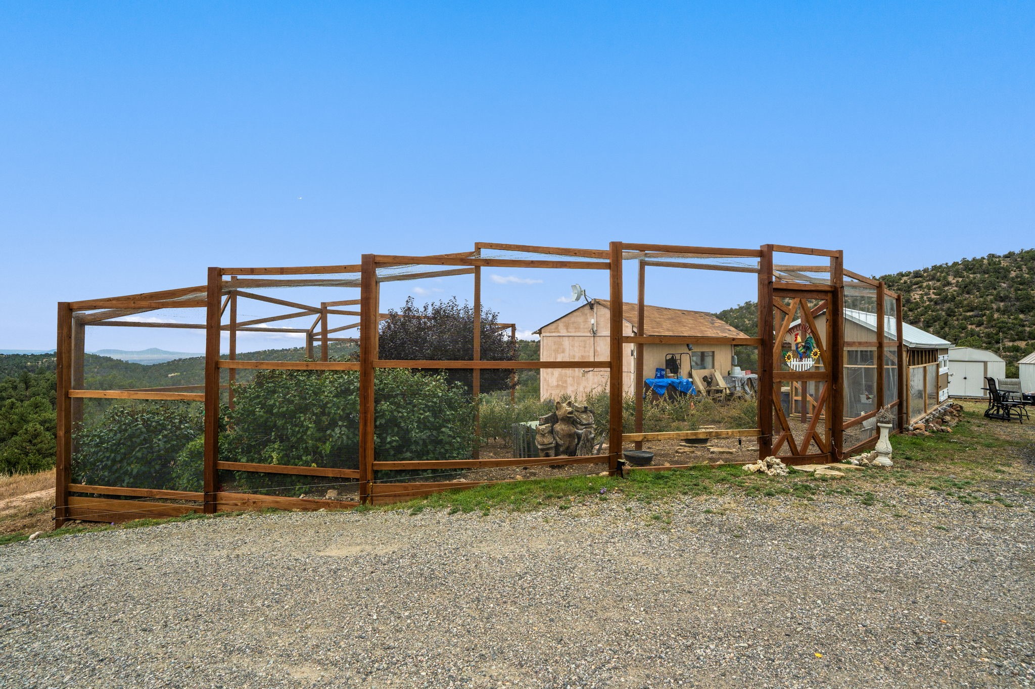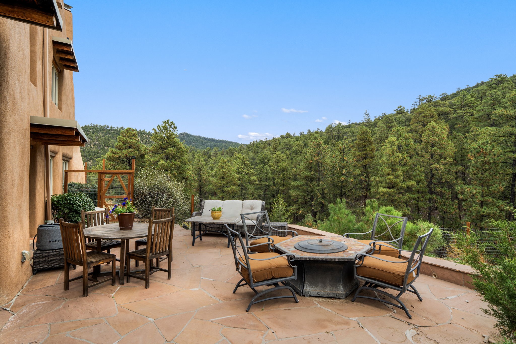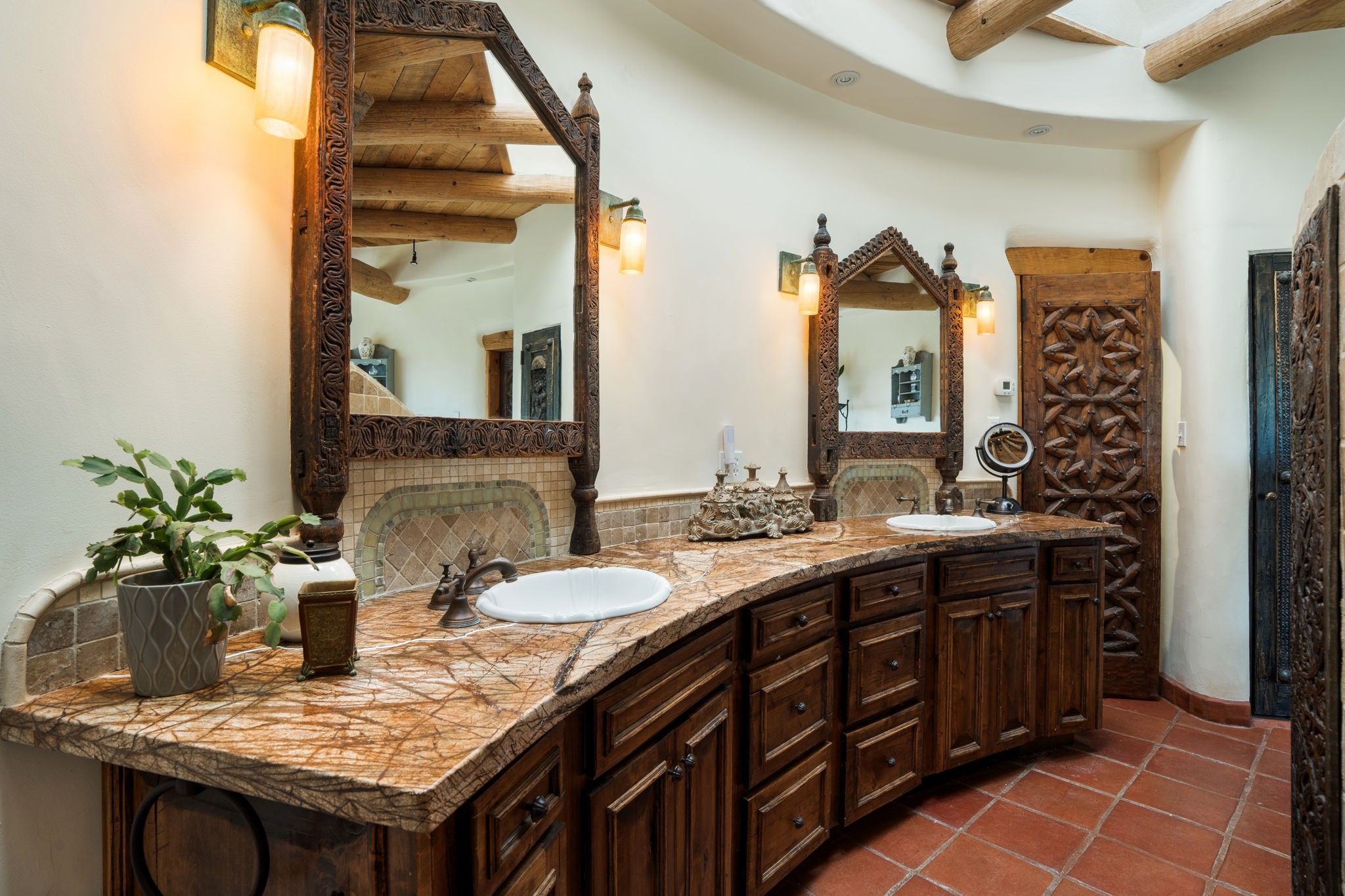 Nestled on 78 pristine acres spread across four deeded lots, this extraordinary estate blends seclusion, artistry, and timeless Southwestern charm--all just 25 minutes from downtown Santa Fe.The 4,400-square-foot adobe home is a masterpiece of craftsmanship and comfort. Solid adobe construction provides natural insulation, keeping interiors warm in winter and cool in summer. Inside, four ensuite bedrooms and 4.5 baths offer comfort and privacy, while 30 hand-carved doors and accents from Seret & Sons lend a one-of-a-kind artistic touch throughout.The great room is the heart of this residence--anchored by a dramatic stone fireplace, high viga ceilings, and a custom antler chandelier that radiates rustic elegance. French doors open to a spacious front portal, framing sweeping Sangre de Cristo Mountain views.A graceful curved staircase leads to the upper level, where two ensuite bedrooms and a balcony overlooking the great room create an inviting sense of openness and connection. The kitchen is both functional and charming, featuring granite counters, abundant cabinetry, and a cozy breakfast nook warmed by its own fireplace. Saltillo tile floors flow throughout the main level, while hardwood floors add warmth upstairs.The primary suite is a private retreat with panoramic views, a luxurious bath with jetted tub, tiled shower, and granite counters--a true spa experience at home.Step outside to a fenced backyard and patio, perfect for savoring dramatic weather shifts, peaceful wildlife, and star-filled nights. Additional features include solar hot water, four fireplaces, a two-car garage, two sheds, and a delightful chicken coop with eight hens providing fresh eggs daily.This property is more than a home--it's a work of art nestled in nature, offering tranquility, authenticity, and soul. Experience the best of Santa Fe living, where art, architecture, and landscape unite in harmony.